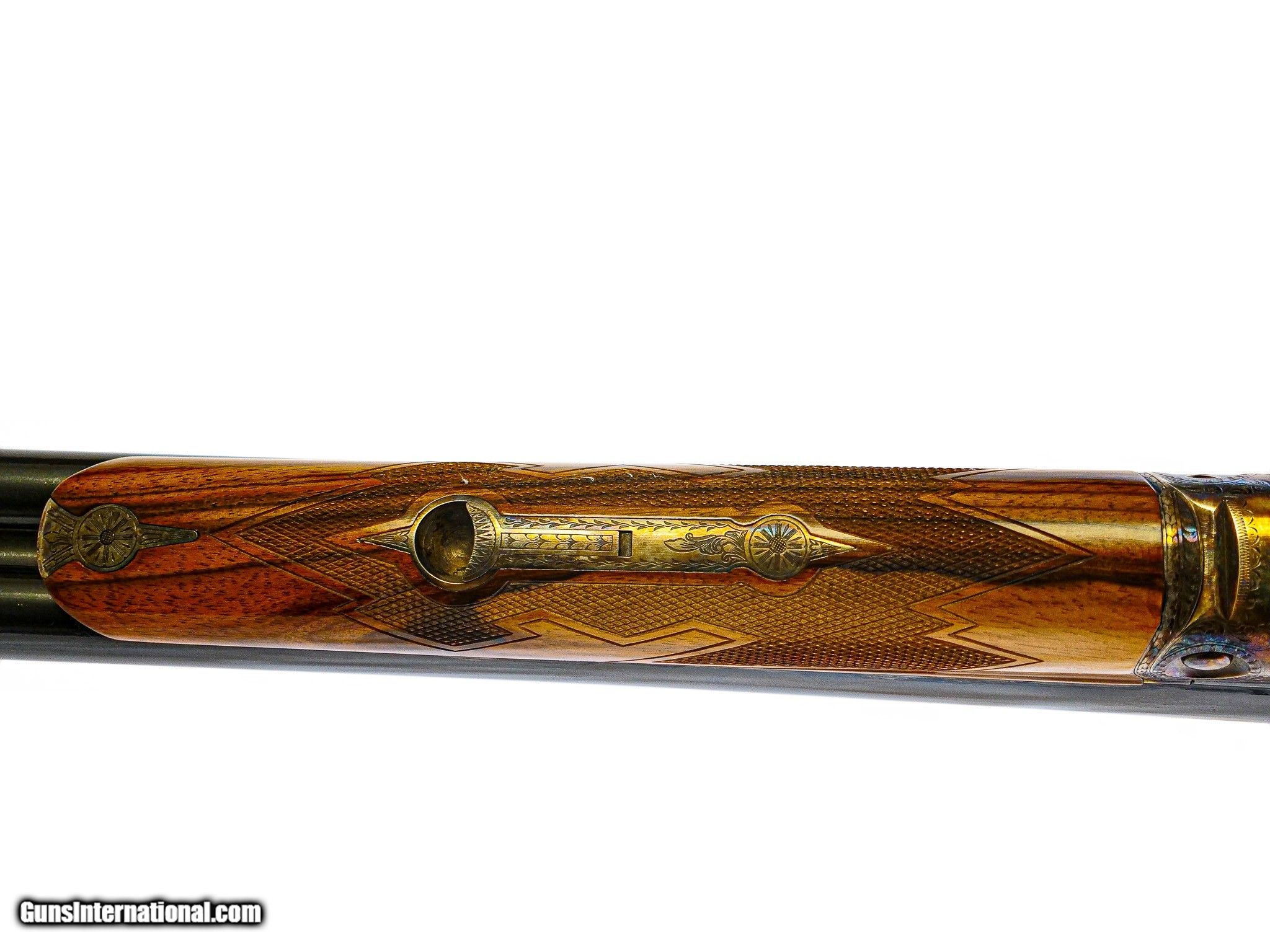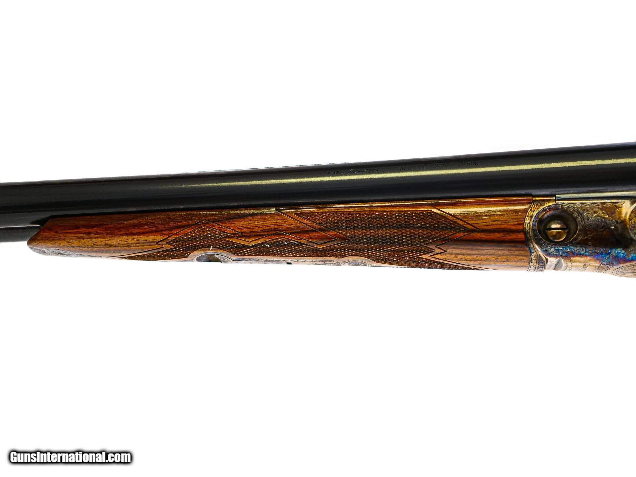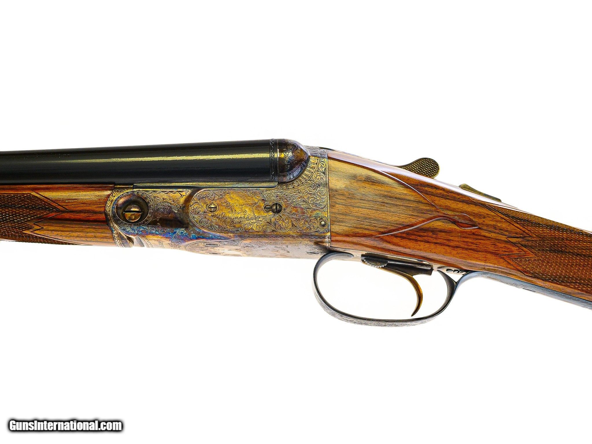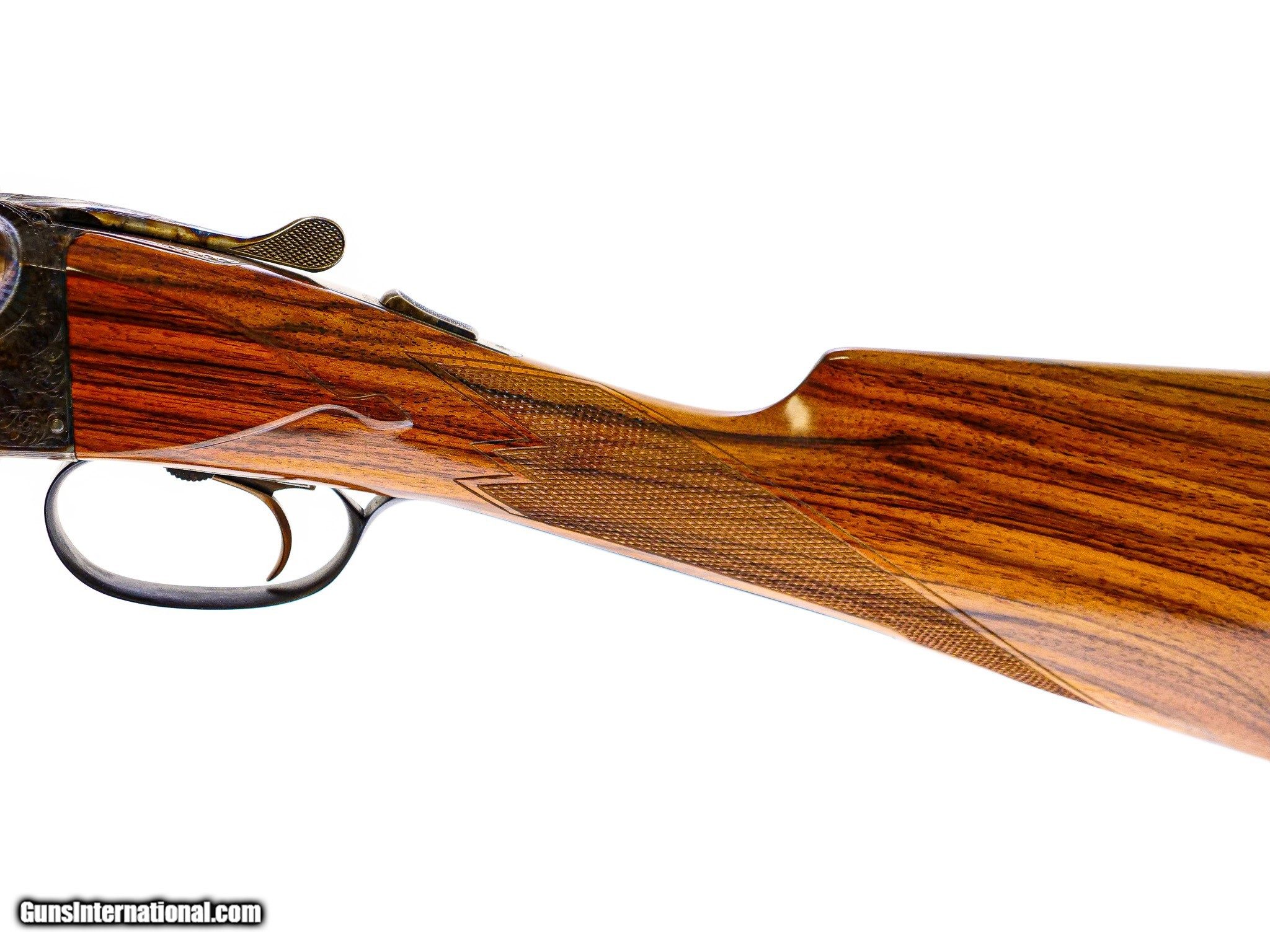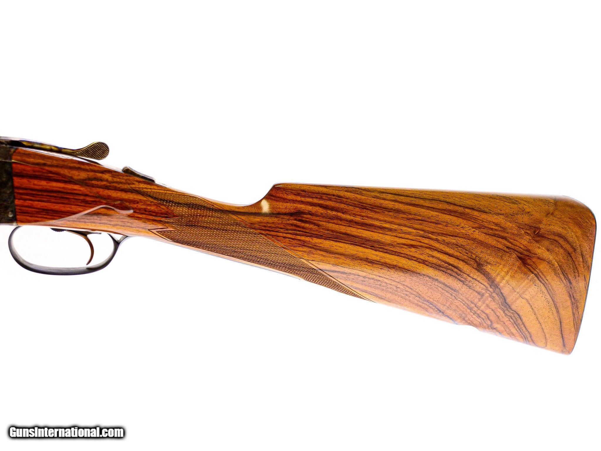 Description: Parker Reproduction - DHE Grade, SxS, Two Barrel Set, 16ga/20ga. 28" IC/M & 26" Q1/Q2. 16ga was manufactured by Kriughoff as per the original specifications, skeleton butt, brand new unfired gun. 16ga has 28” barrels, 2 3/4” chambers, choked IC/M. 20ga has 26” barrels, choked Q1/Q2. Magnificent blonde English walnut stock with dark mineral lines, splinter forend, single selective trigger, auto ejector, never been assembled out of its original box. If you want a new version of this gun, this is it. In original leather case, correct accessories including snap caps, keys, oil bottle and canvas cover. If you want a truly brand new, unused example, this would be it. Inv: 80342 14 1/8" x 1 3/8" x 2" $11,250.00 SOLD |