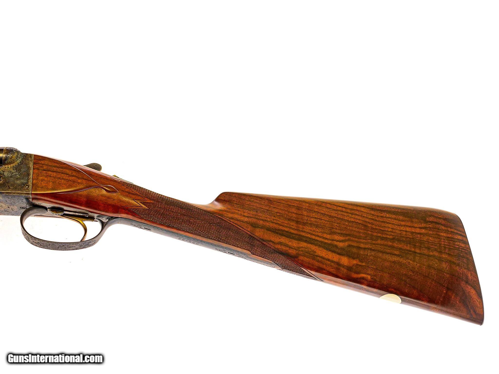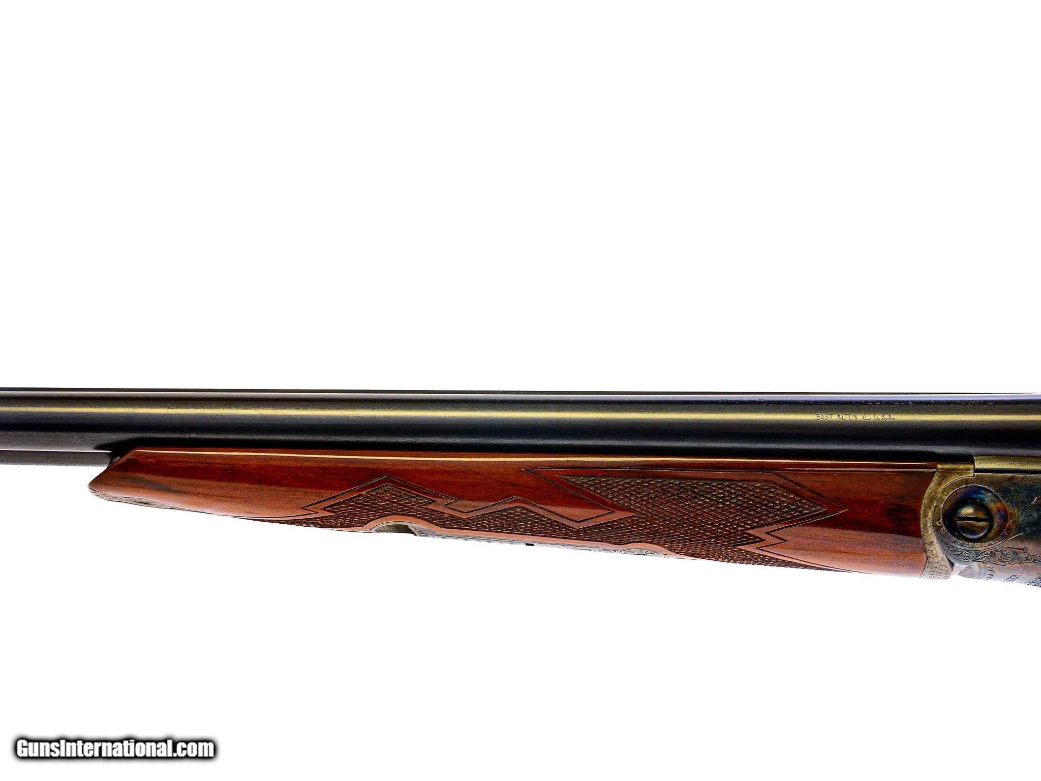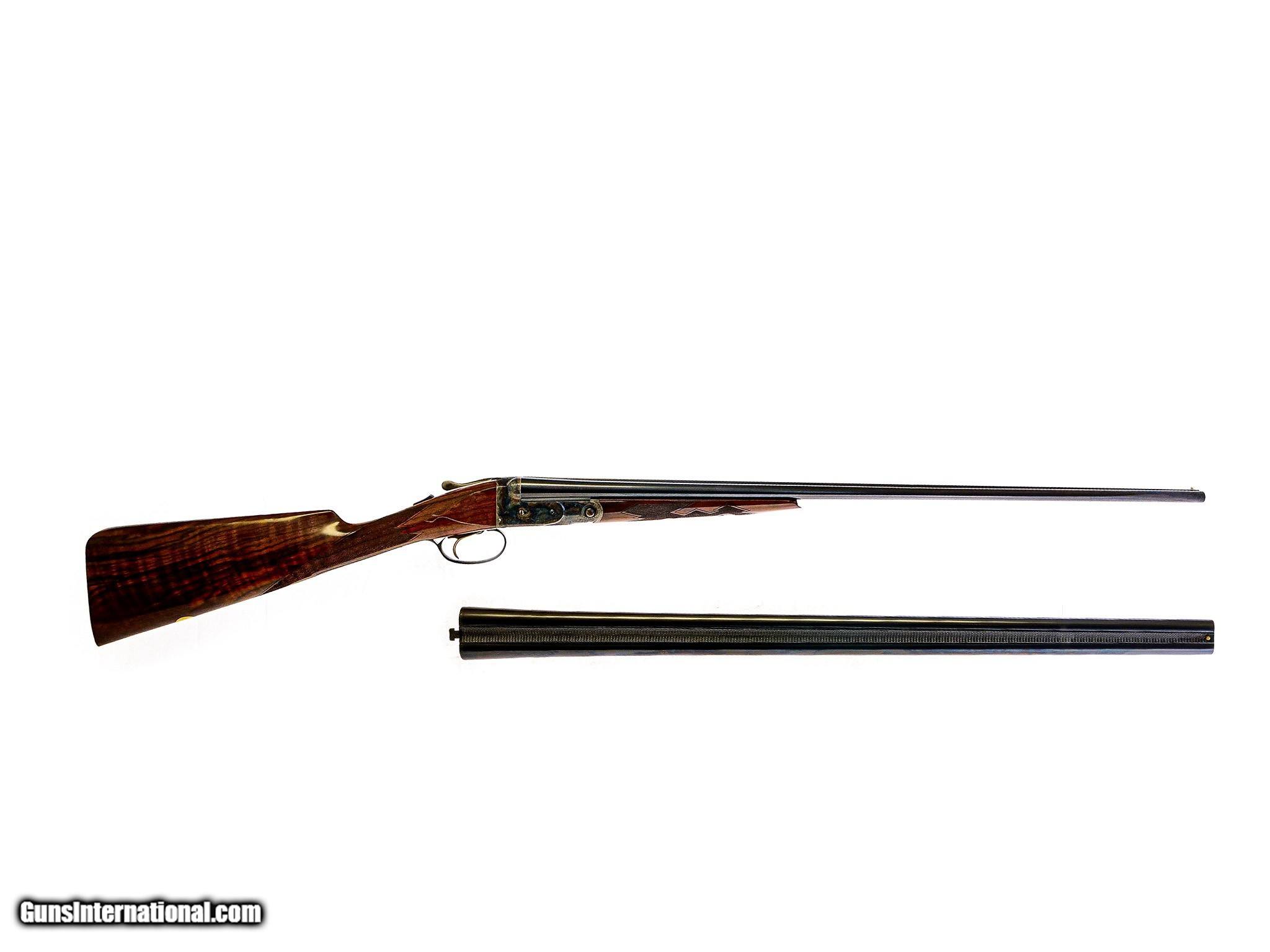Description: Parker Reproduction - DHE Grade, SxS, Two Barrel Set, .410/28ga. 28" F/M & 26" IC/M. The 28ga is choked IC/M with 26" barrels and 2 3/4" chambers. The .410 is choked F/M with 28" barrels and 3" chambers. Both barrels marked Parker Reproduction, matte rib, single selective trigger, straight grip, skeleton butt, splinter forend, English walnut stock, 100% as new with perfect screws, very rare .410 barrel. Weight with .410 barrel is 6 lbs. 2 oz. Inv: 67846 6 lbs. 2 oz. 14 1/4" x 1 1/2" x 2 1/2" $13,995.00 SOLD |