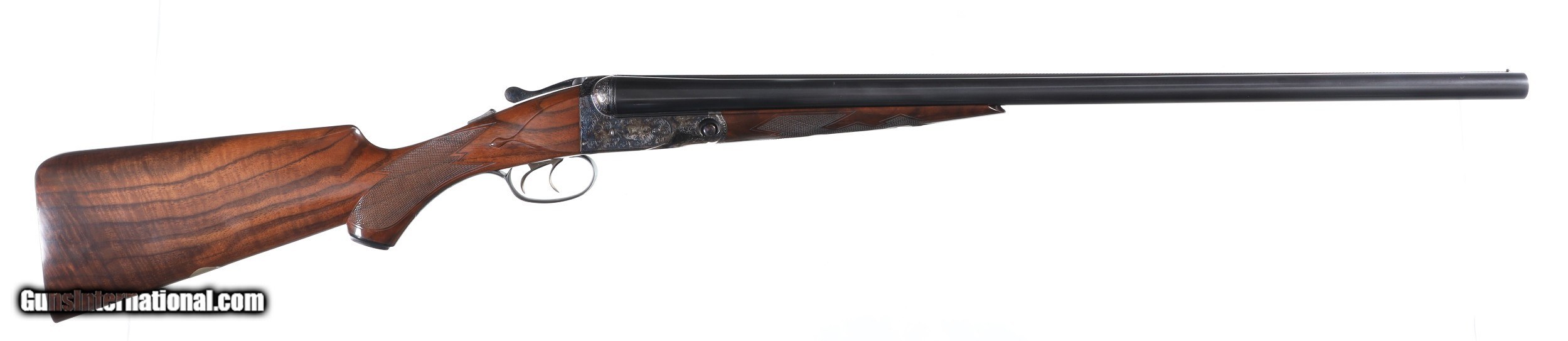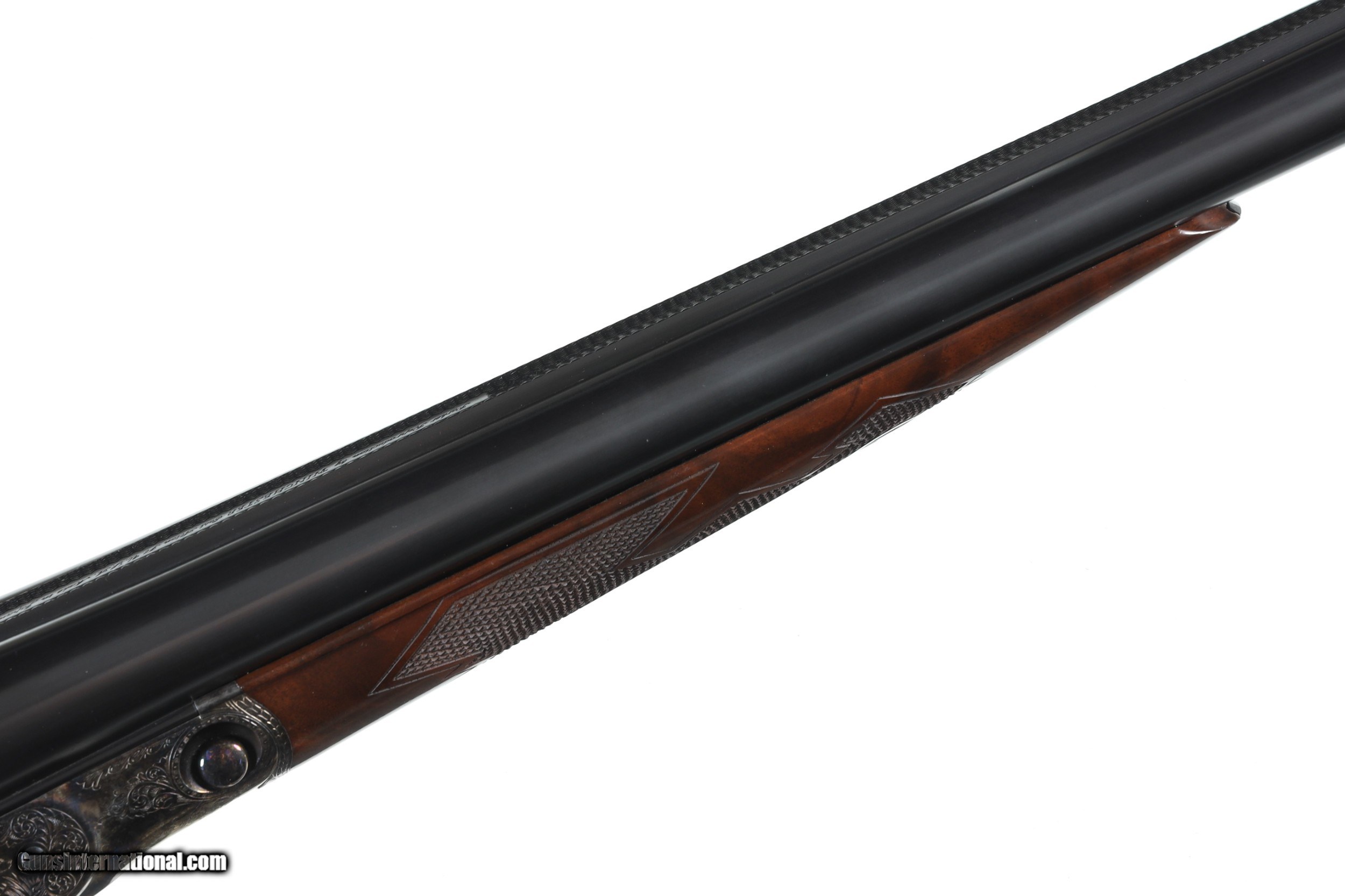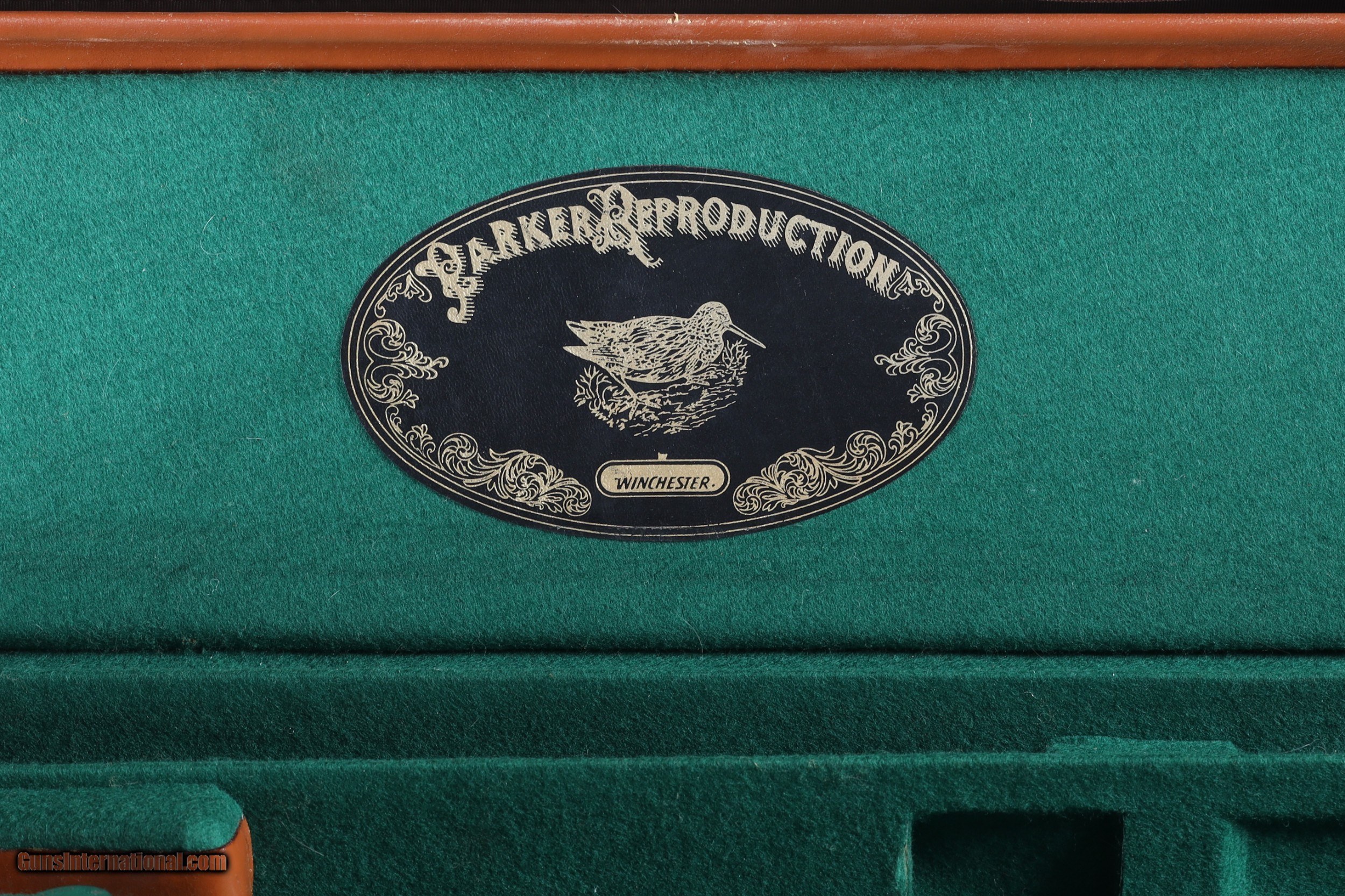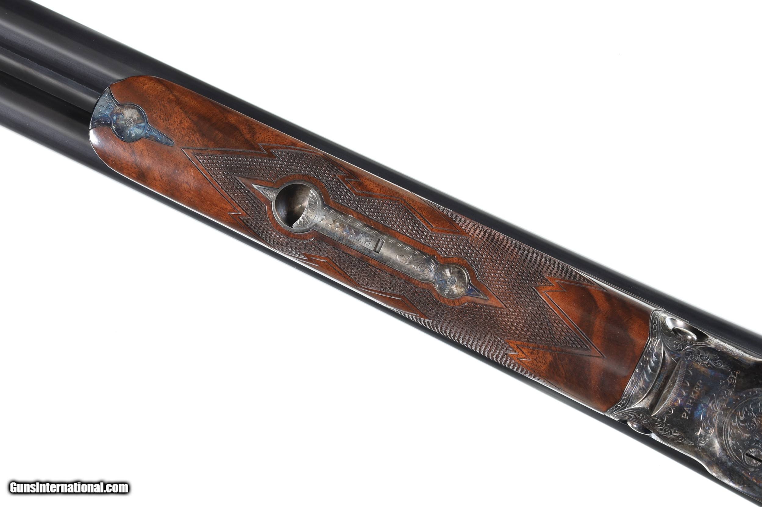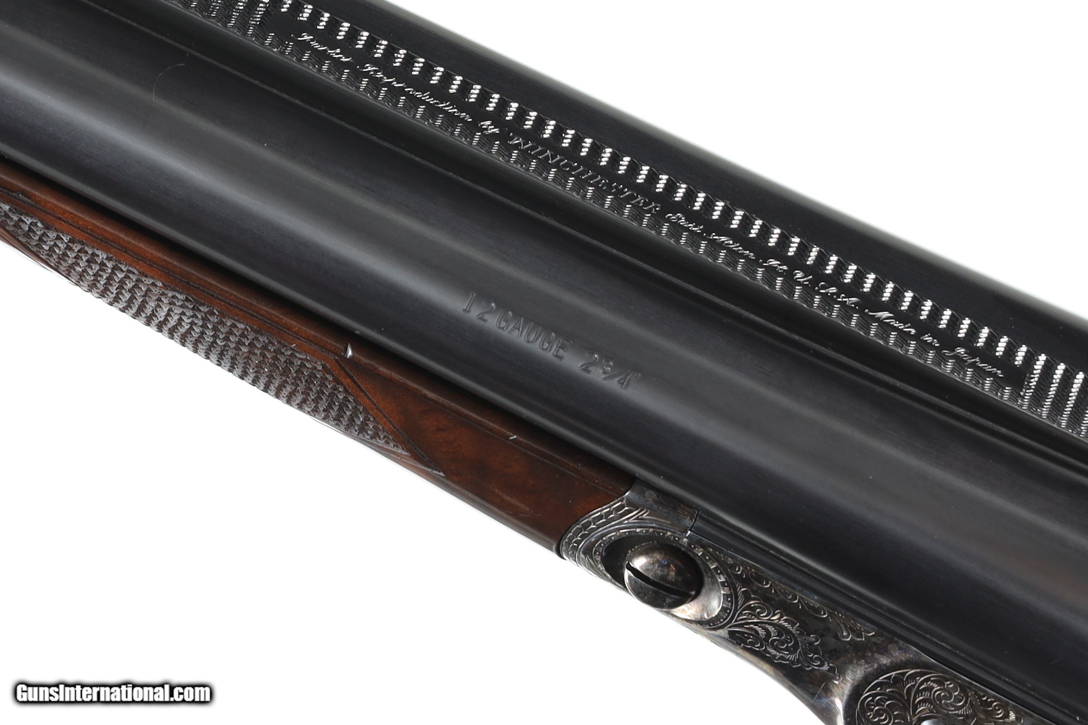 Description: Factory Engraved Winchester Parker Reproduction DHE Grade, Manufactured between 1983 and 1989 as a faithful reproduction of the beloved Parker shotgun, this is one of only 1,500 built in 12 gauge according to page 180 of "The Parker Story" by Gunther, Mullins, Parker, Price, and Cote. Single brass bead sight on the solid matte rib, 2 3/4 inch chambers with ejectors, and chokes marked "IMP.CYL"/"MOD". The casehardened receiver shows the standard DHE grade engraving of hunting dogs on either side and a covey of pheasants on the underside along with "PARKER". The gun features double triggers and automatic tang mounted safety switch. Beautifully figured, multi-point checkered walnut splinter forearm with engraved fittings including the Deeley latch release and pistol grip stock with carved flats, blank inscription oval, and engraved skeletonized buttplate around checkered bare butt. Includes leather takedown case with canvas cover and nickel snap caps. Barrel and stock measurements (R/L): bore diameters measured nine inches from the breech .735/.735 inches; choke constriction .007/.011 inches; minimum wall thickness .026/.027 inches; 1 5/16 inch drop at comb; 2 1/16 inch drop at heel; 14 13/16 inch length of pull; weight 6 lbs 9 oz. Excellent Plus conditon. • Free Shipping, No Credit Card Fees. • Lay-a-way available for this firearm. • 1/3 Down, a 1/3 in 30 Days 1/3 in 60 Days. SOLD Manufacturer: Parker Reproduction Model: DHE Serial Number: 12-00391 Barrel Length: 26 |