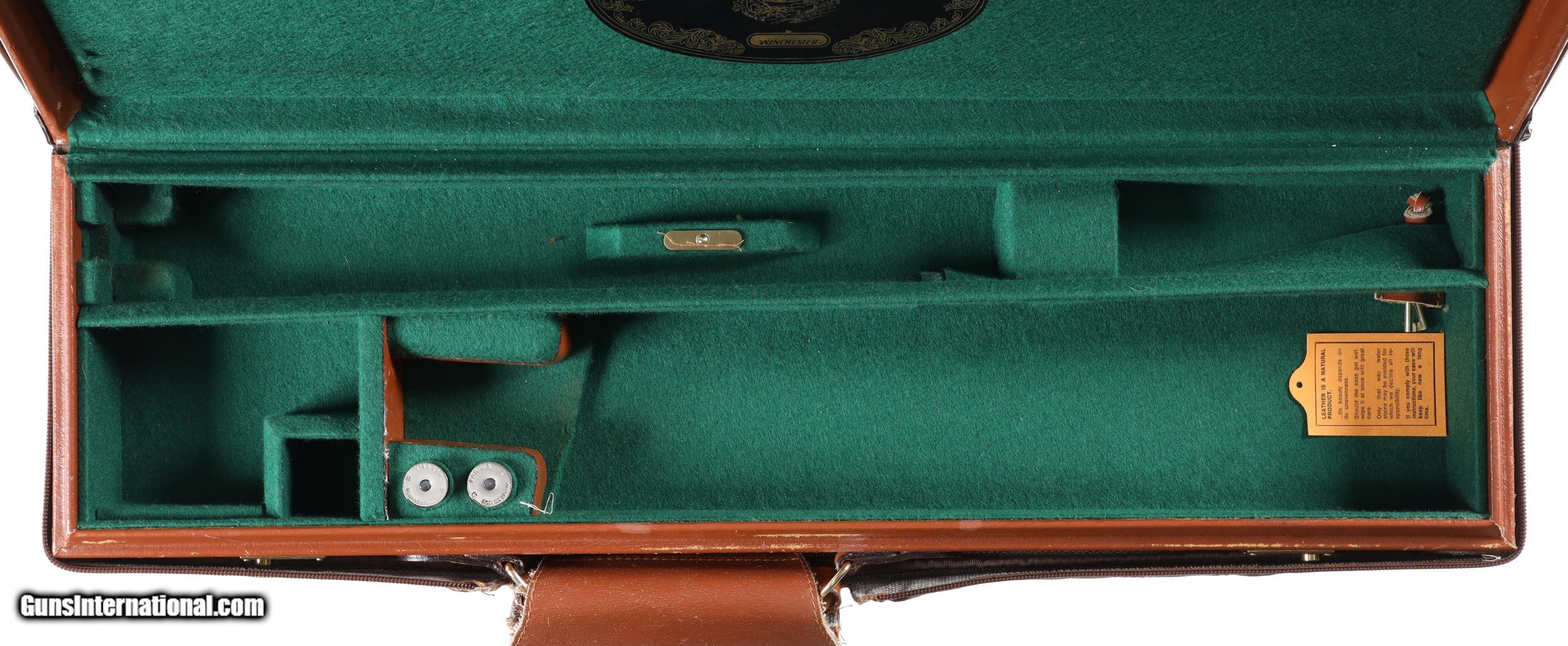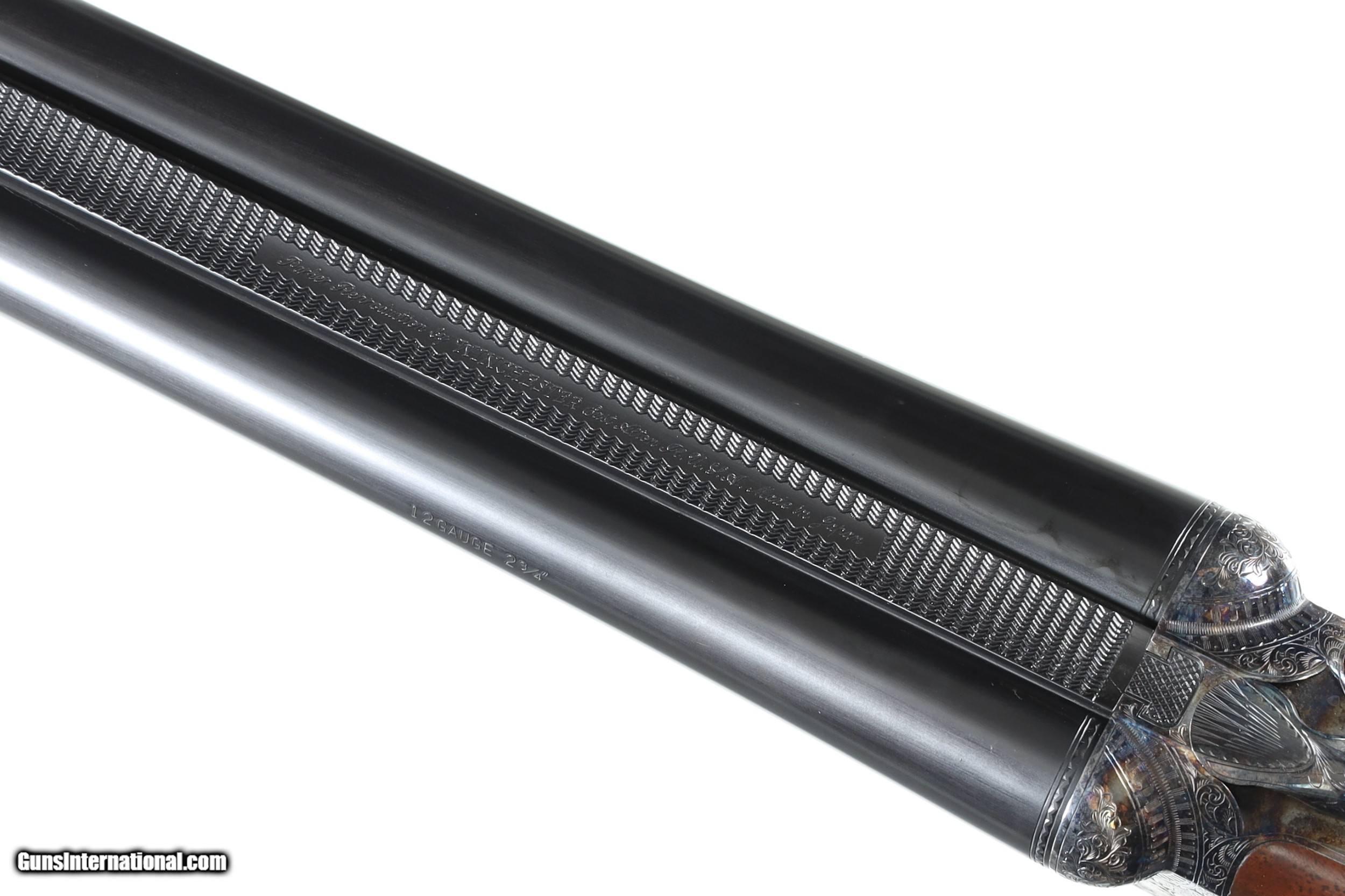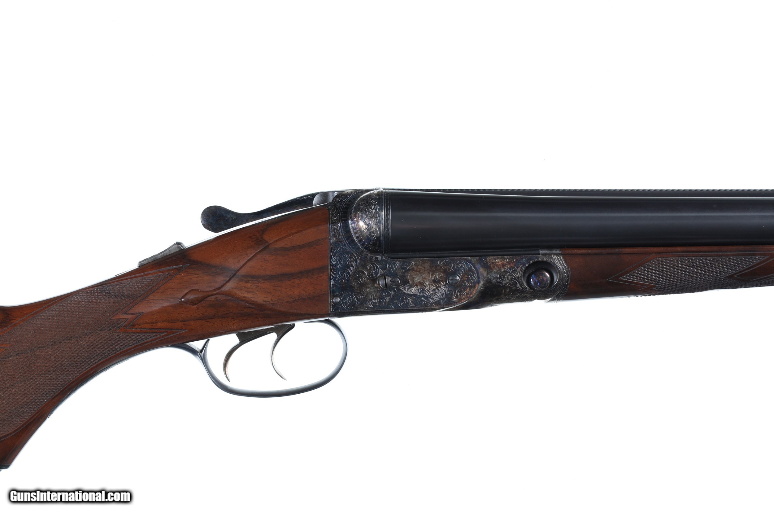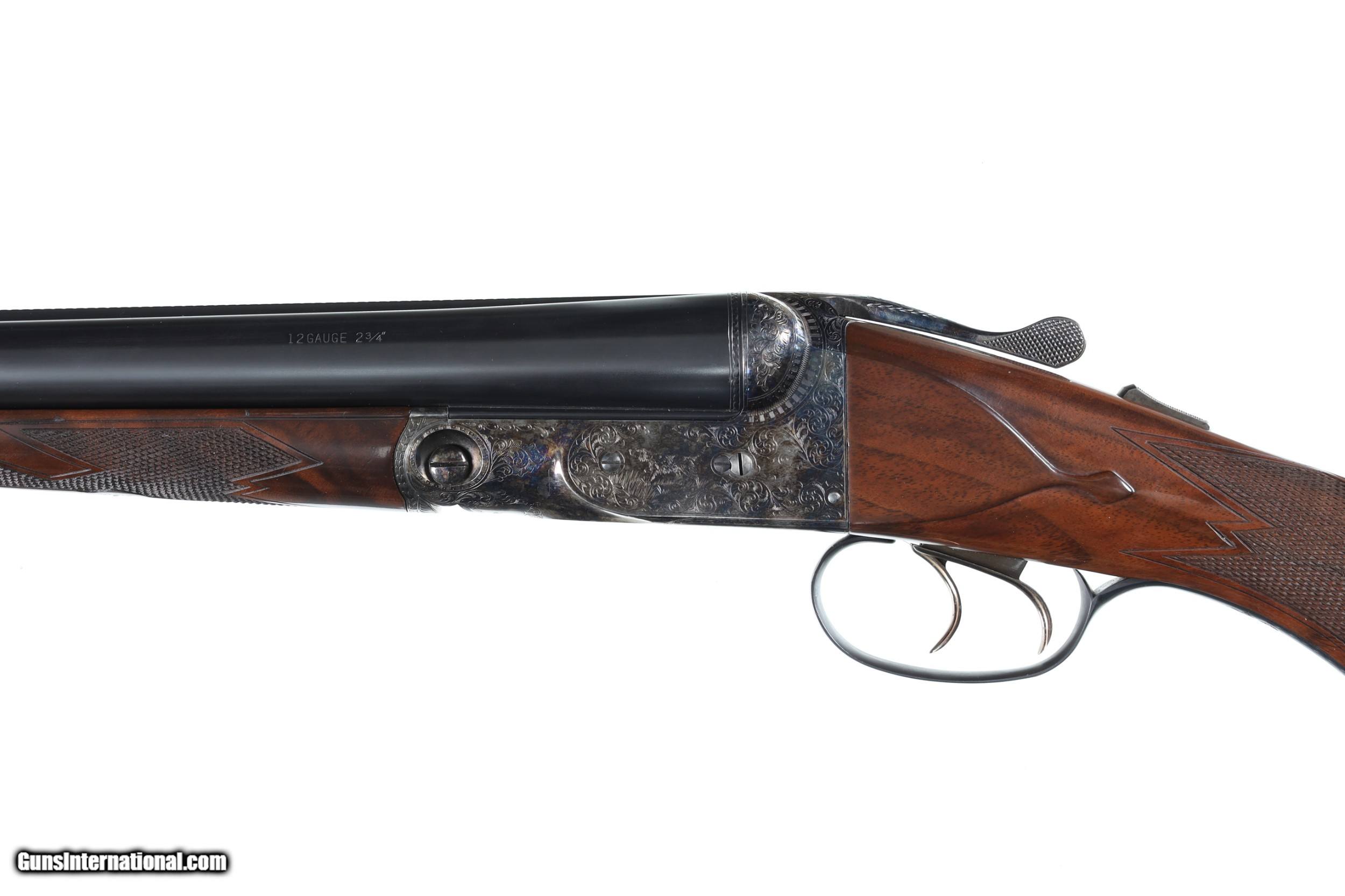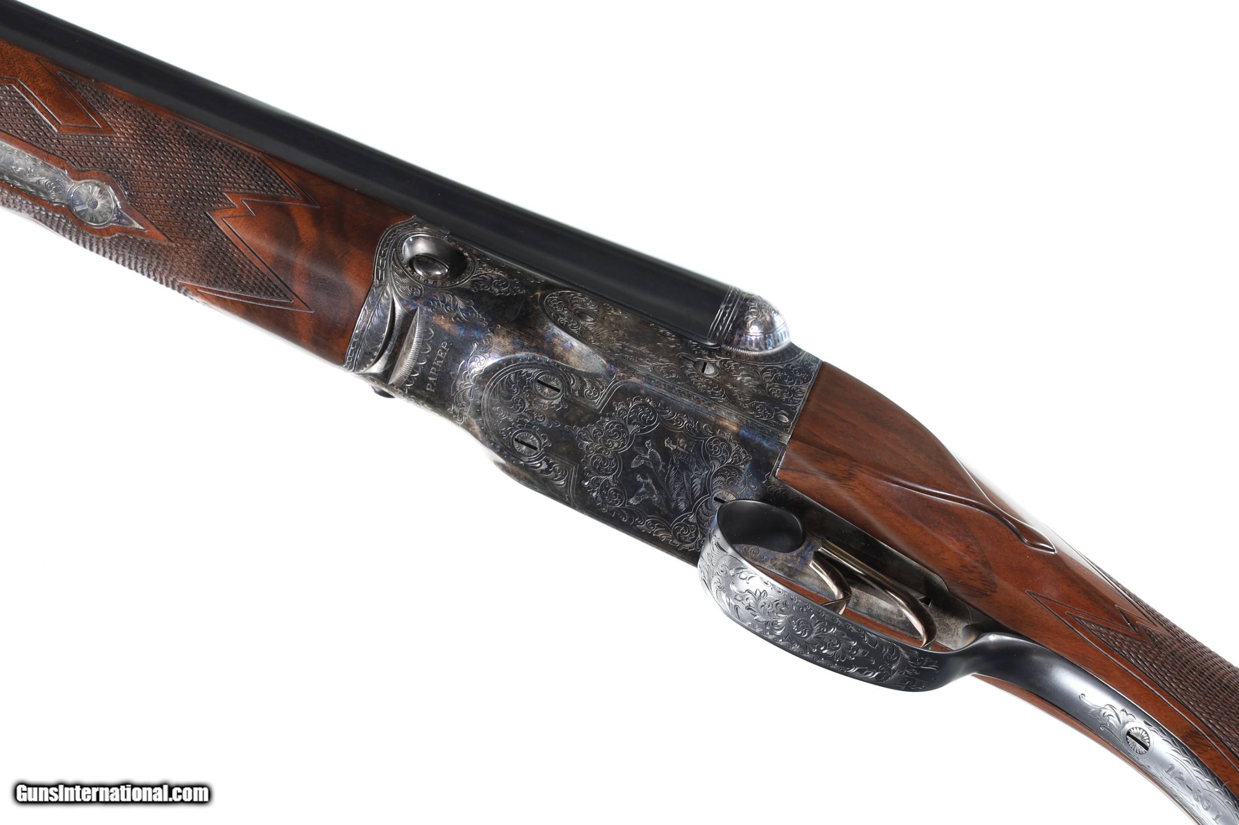Description: Factory Engraved Winchester Parker Reproduction DHE Grade, Manufactured between 1983 and 1989 as a faithful reproduction of the beloved Parker shotgun, this is one of only 1,500 built in 12 gauge according to page 180 of "The Parker Story" by Gunther, Mullins, Parker, Price, and Cote. Single brass bead sight on the solid matte rib, 2 3/4 inch chambers with ejectors, and chokes marked "IMP.CYL"/"MOD". The casehardened receiver shows the standard DHE grade engraving of hunting dogs on either side and a covey of pheasants on the underside along with "PARKER". The gun features double triggers and automatic tang mounted safety switch. Beautifully figured, multi-point checkered walnut splinter forearm with engraved fittings including the Deeley latch release and pistol grip stock with carved flats, blank inscription oval, and engraved skeletonized buttplate around checkered bare butt. Includes leather takedown case with canvas cover and nickel snap caps. Barrel and stock measurements (R/L): bore diameters measured nine inches from the breech .735/.735 inches; choke constriction .007/.011 inches; minimum wall thickness .026/.027 inches; 1 5/16 inch drop at comb; 2 1/16 inch drop at heel; 14 13/16 inch length of pull; weight 6 lbs 9 oz. Excellent Plus conditon. • Free Shipping, No Credit Card Fees. • Lay-a-way available for this firearm. • 1/3 Down, a 1/3 in 30 Days 1/3 in 60 Days. SOLD Manufacturer: Parker Reproduction Model: DHE Serial Number: 12-00391 Barrel Length: 26 |