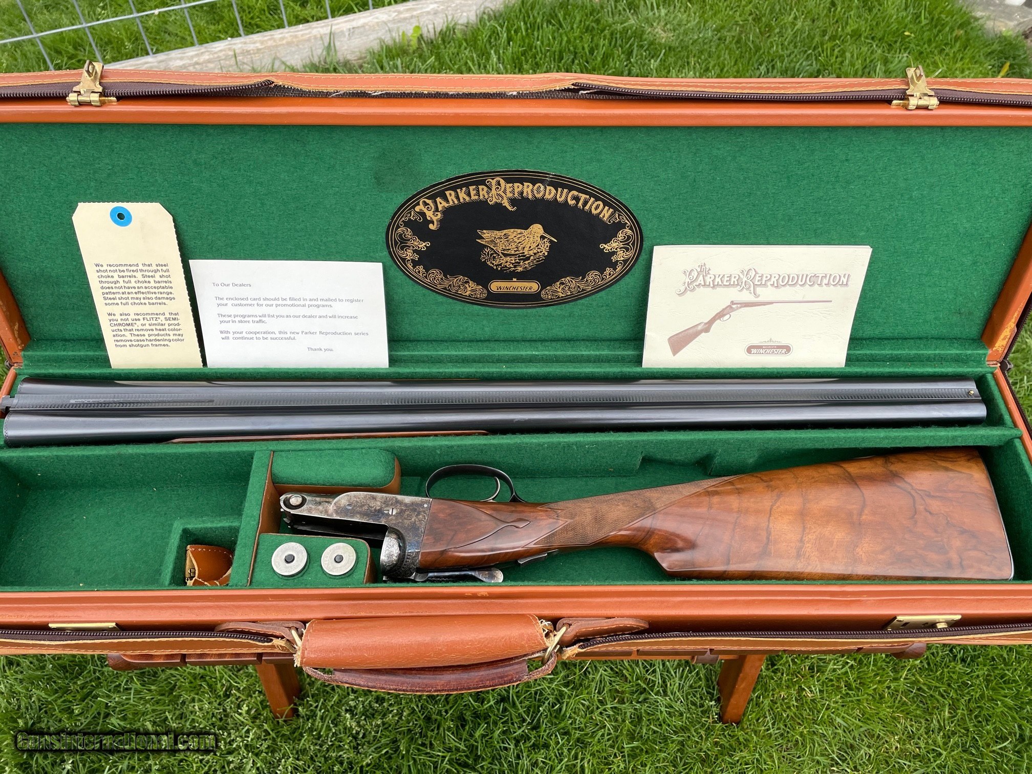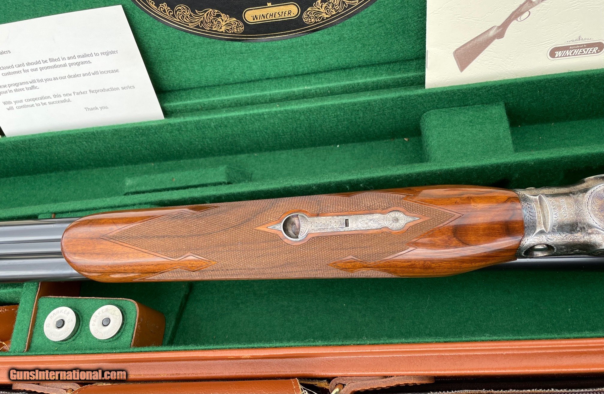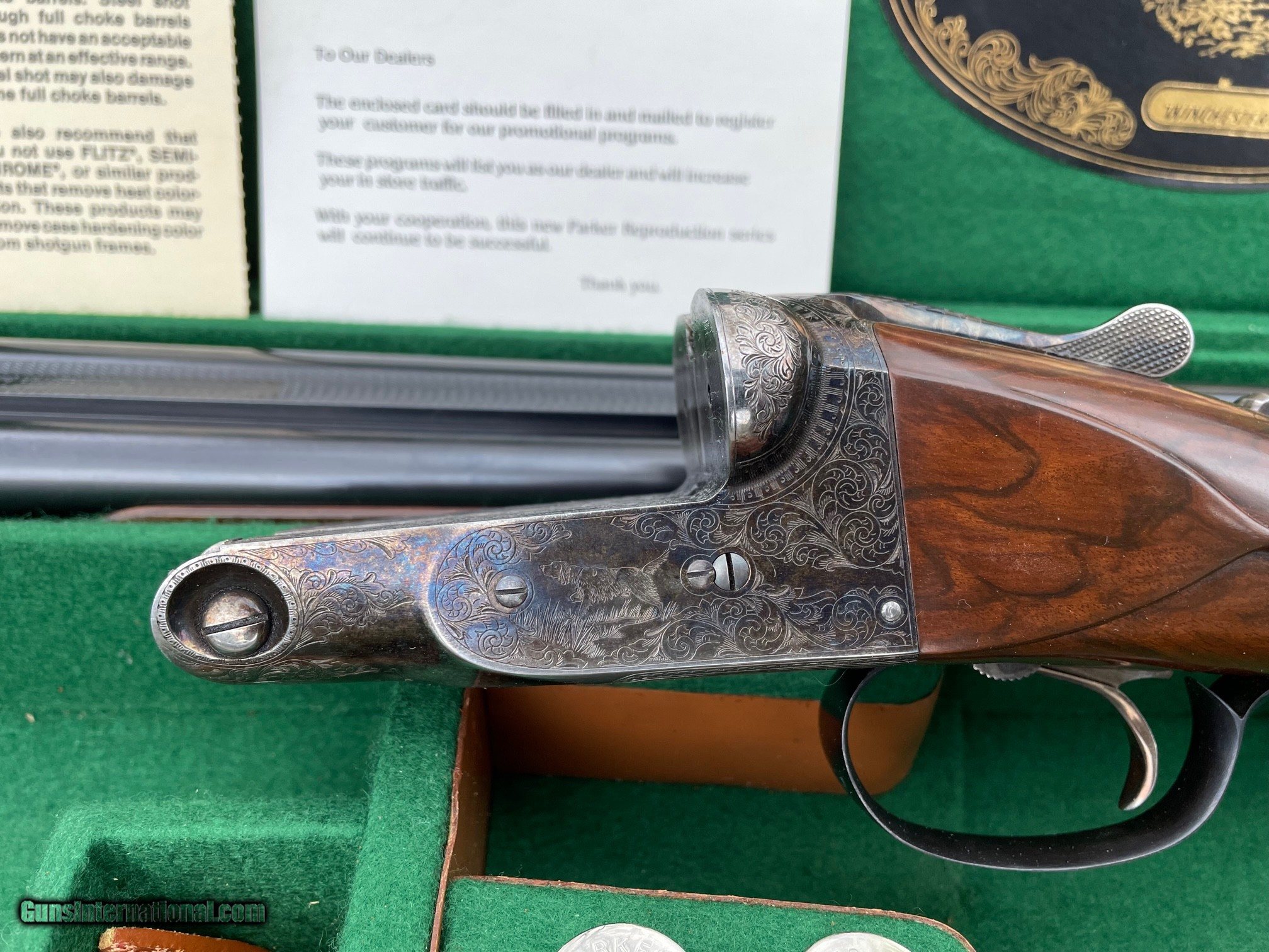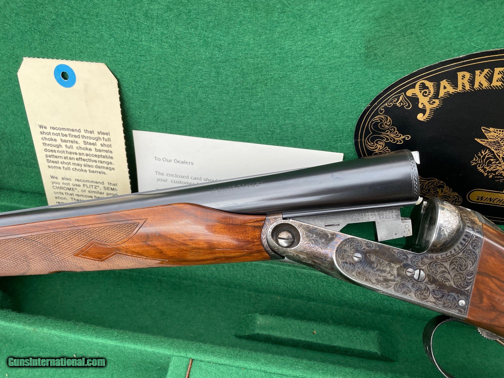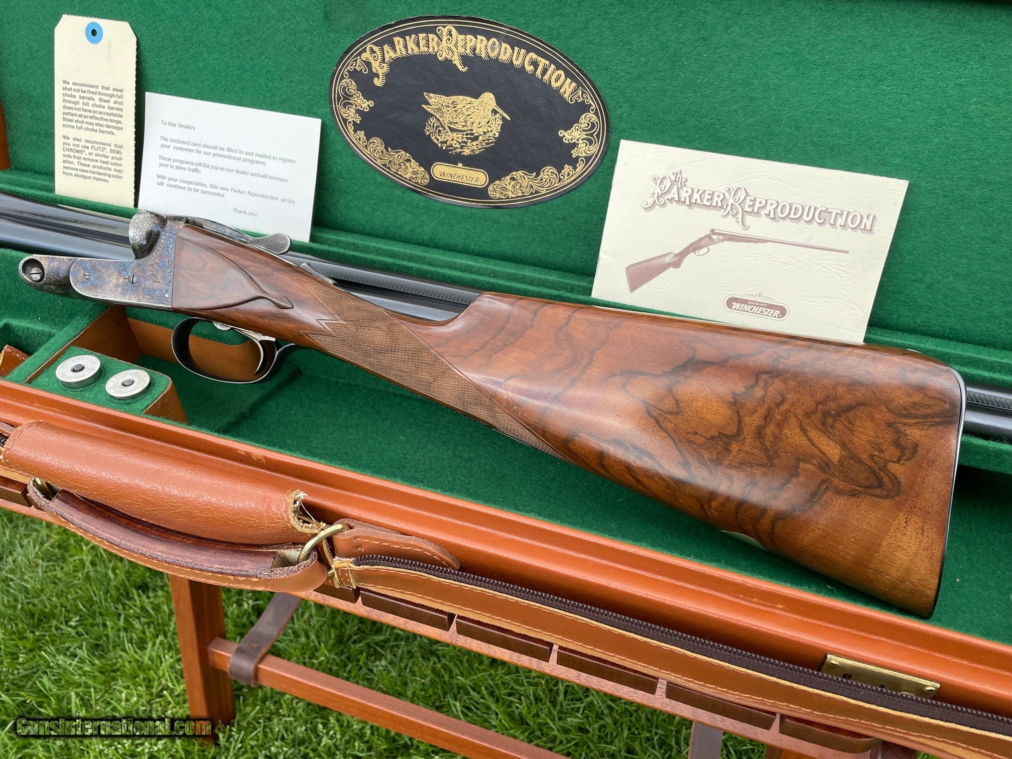 Description: Parker Reproduction Steel Shot Special SxS 12 gauge DHE 28" shotgun. English straight grip. Single selective trigger. Skeleton butt plate. 14 3/16" LOP, 1 3/8" drop at comb, 2 1/8" drop at heel. Very slight cast off. MOD and IMP CYL. 3" chamber. Very good condition with light handling marks. Original tags. Gun comes with leather case and canvas cover. This will make a nice piece to a collection! Ships to your FFL $50. in Continetal US. Insurance available. SOLD SOLD |