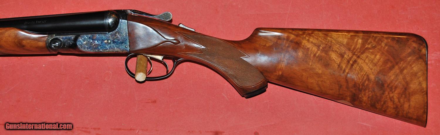 Description: Parker Reproduction "Steel Shot Special".28" barrels with 3" chambers choked improved cylinder and modified.This gun has a pistol grip stock with highly figured wood.Other features include double triggers,a beavertail forend and ejectors.This gun is new and unfired in the makers case.This gun is serial number 12SS-00282 of only 350 true steel shot specials made.A great all around gun for upland game,waterfowl,or clays. SOLD Manufacturer: Parker Reproduction Model: DHE Steel Shot Special Serial Number: 12SS-00282 Chambers: 3 Ejectors: yes Wood Condition: new Bore Condition: new Triggers: double Stock Comb: 11/2 Stock Heel: 23/8 LOP: 143/8 Choke Left: modified Choke Right: improved Case: leather with canvass cover |