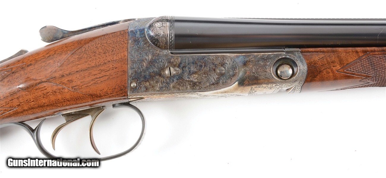 Description: Parker / Winchester Reproduction DHE Grade Shotgun. 28ga. 26" and 28" Barrels with broad, matted game ribs are marked with Parker Reproduction Winchester information, gauge, chamber, and address on sides of left barrels. Barrel flats are stamped with all correct markings. 26" barrels are stamped IC and mod, and 28" barrels, mod and full. Case hardened 00 frame with lightening cuts in water table, features automatic safety and double triggers. Action is engraved in DHE style with dogs on sides and "PARKER" on bottom. Trigger plate is engraved with pheasants. Serial number is on trigger guard tang. Nicely stump figured American walnut Parker/ Winchester capped buttstock measures 14 1/4" over solid red pad. Stock is classically styled with lozenge drop points, point pattern checkering, and silver oval. Matching splinter ejector forend services both barrel sets. Tan leather case with leather corners and leather trimmed outer cover is lined in green cloth. Parker Repro oval label is in lid. Case contains a pair of snap caps. CONDITION: Very fine as partially refinished. Barrels retain nearly all of their original blue. Action retains 70% original metallic hued case hardening color, silvered on fences, and considerably on bottom, as it is not unusual these colors fade very easily. Stocks retain most of their original finish, butt with added oil with addition of pad. Bores are excellent. Mechanically very fine. Case is excellent inside and out. Gentlemen, this is a fantastic gun and well suited for all upland game. Two barrel sets are hard to find and this gun will please for sure. Priced to sell so please call now! Valid FFL required. Buyer to pay flat $50 S/H/I. +$30 to CA SOLD Manufacturer: Parker Winchester Model: DHE Gauge Info: 28GA LOP: 14 1/4 |