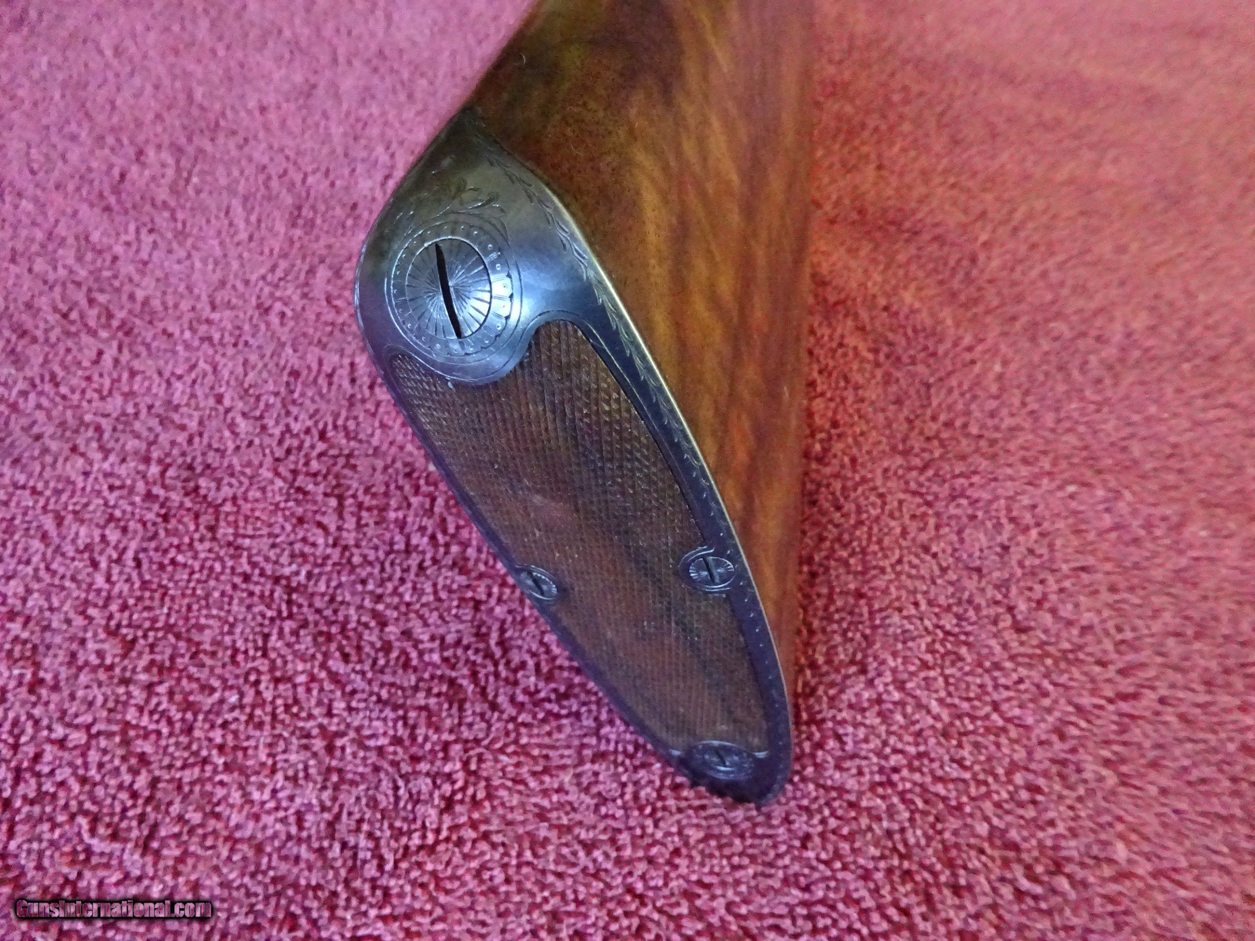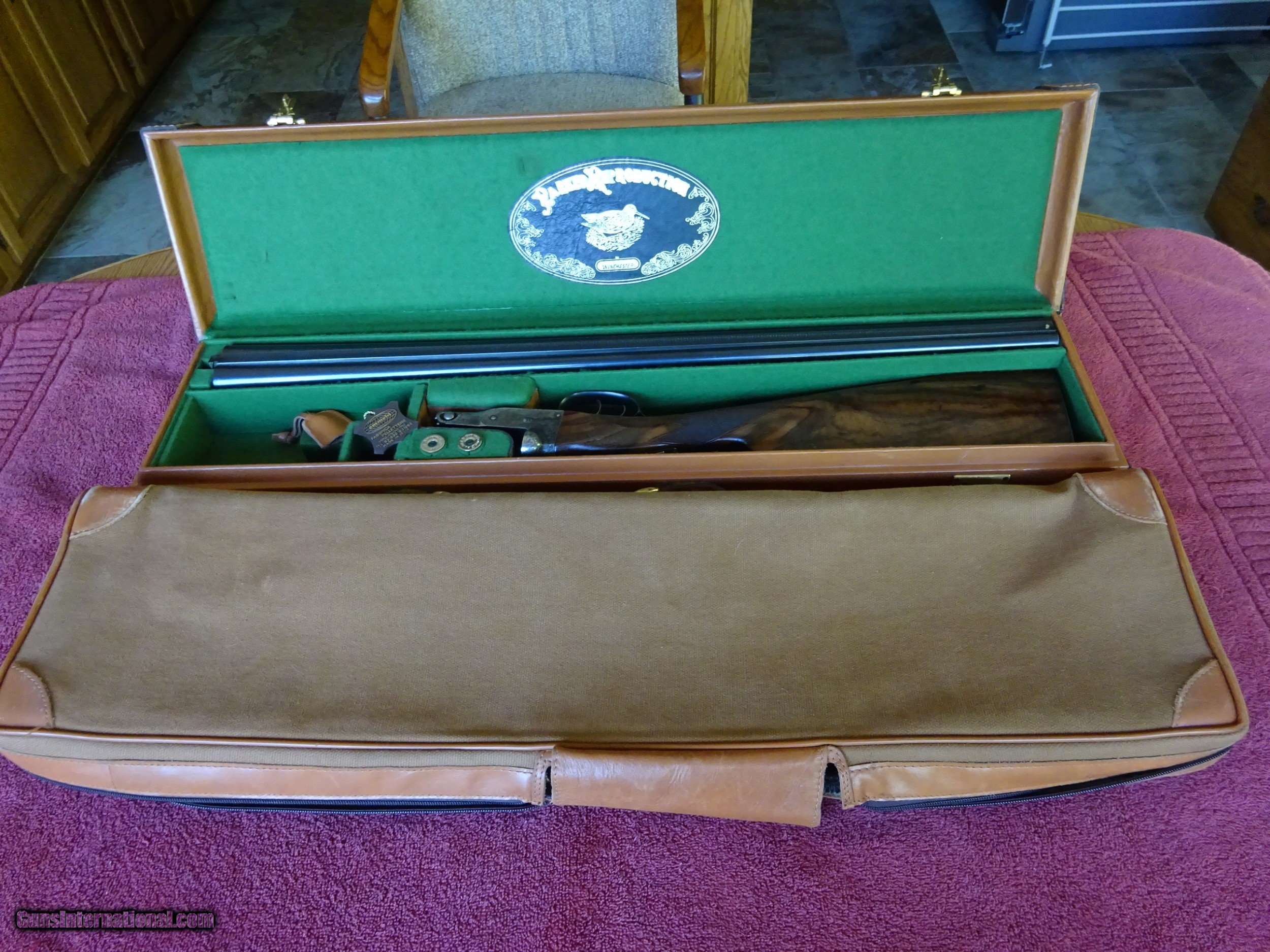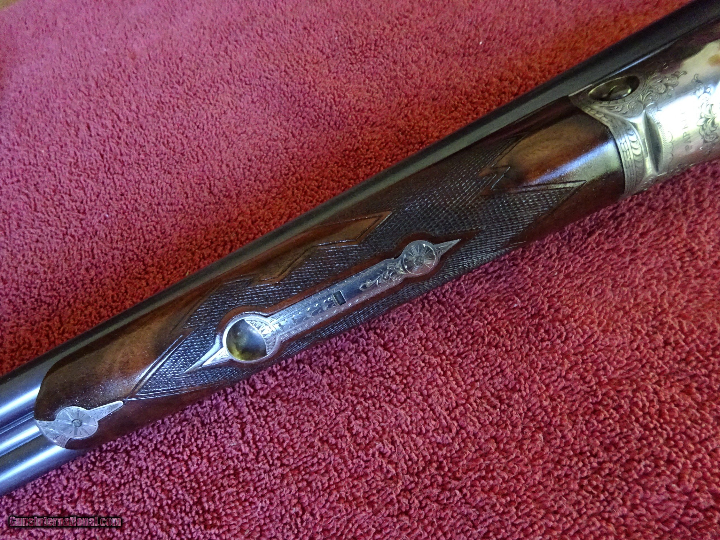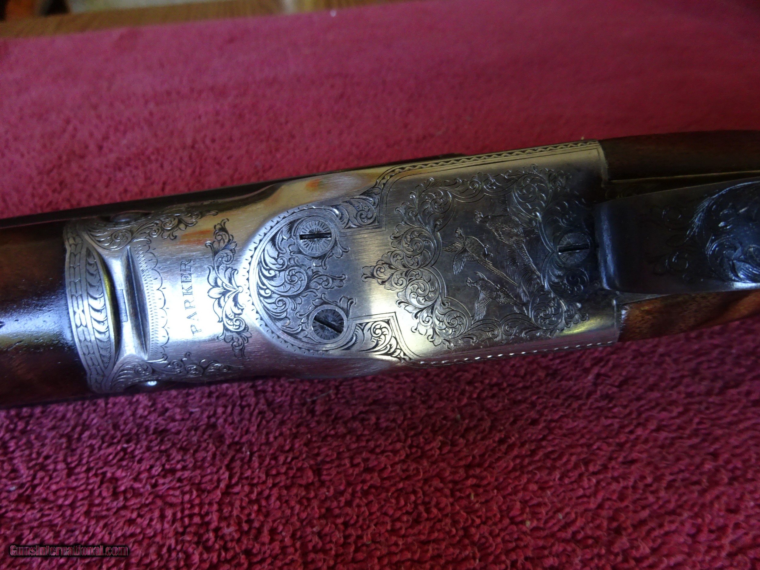 Description: SALE PENDING PARKER REPRODUCTION DHE 20 GAUGE, 28" BARRELS. IMPCYL. AND MODIFIED, MIRROR BRIGHT BORES, EXCELLENT BLUE, SINGLE BEAD SIGHT, 3" CHAMBERS, AUTOMATIC EJECTORS. VERY ATTRACTIVE ENGRAVING - ENGLISH POINTER ON RIGHT SIDE, ENGLISH SETTER ON LEFT SIDE, 3 PHEASANTS ON THE FLOOR PLATE, PLUS ACANTHUS SCROLLWORK AND BORDERS. VIVID CASE COLOR IN THE PROTECTED AREAS, ENGRAVING SHARP WITH NO WEAR. DOUBLE TRIGGERS. STRAIGHT GRIP STOCK, SPLINTER FOREARM, FINE CHECKERING. UNUSUAL VERY HIGHLY FIGURED WOOD AND SKELETON BUTTPLATE. WOOD HAS BEEN REFINISHED, METAL IS ALL ORIGINAL. UNUSUAL SERIAL NUMBER - P-311. THE MEANING OF THE "P" PREFIX IS POSSIBLY PROTOTYPE OR PERSONAL - THE JURY IS STILL OUT. INCLUDES ORIGINAL LEATHER TRUNK CASE WITH CANVAS COVER, PARKER LABEL UNDER THE LID, "MADE IN ITALY" LABEL ON OUTSIDE PLUS ITALIAN MARKED PLASTIC HANG TAG, (PROBABLY THE CASE MANUFACTURERS). AN INTERESTING FIRST YEAR PRODUCTION GUN WITH EXCEPTIONALLY FIGURED WOOD AND UNUSUAL SERIAL NUMBER. $5500.00 + $60.00 insured shipping to an FFL address. Layaway is available. See all Pats gun listings on this site! We also have hundreds of pieces of ORIGINAL gun company advertising & memorabilia available for sale on our site SPORTINGCOLLECTIBLES. we have no reprints for reproductions. Email for more information. SOLD |