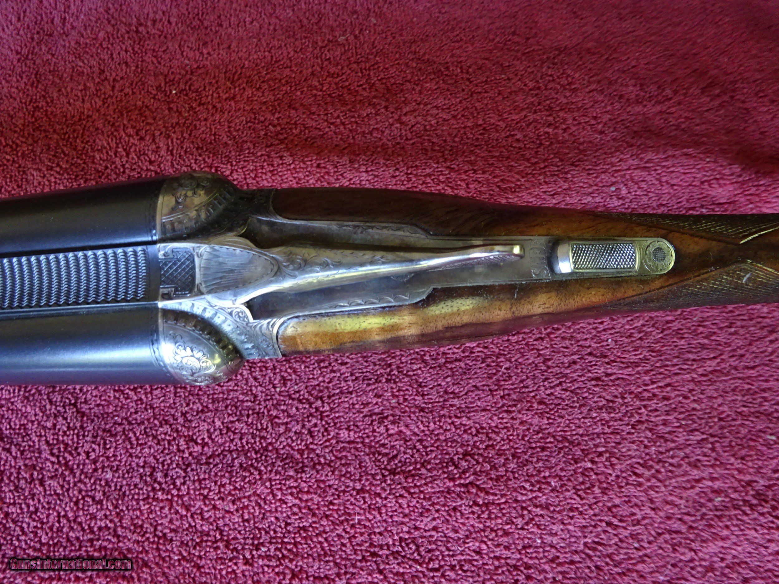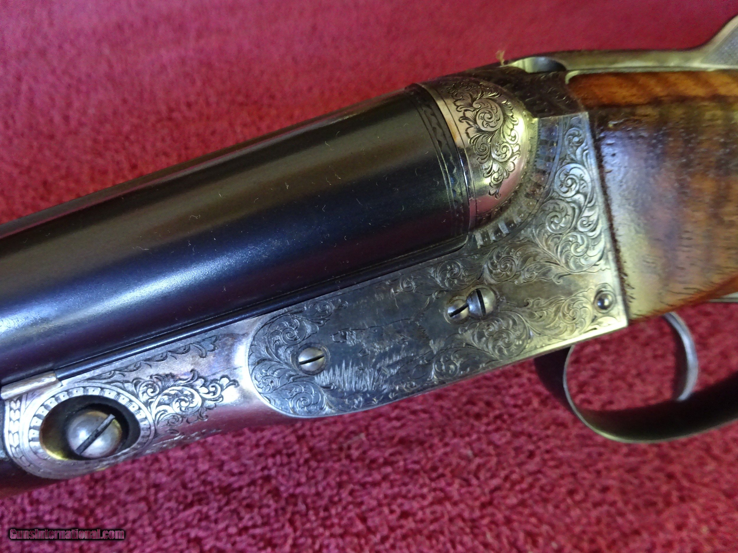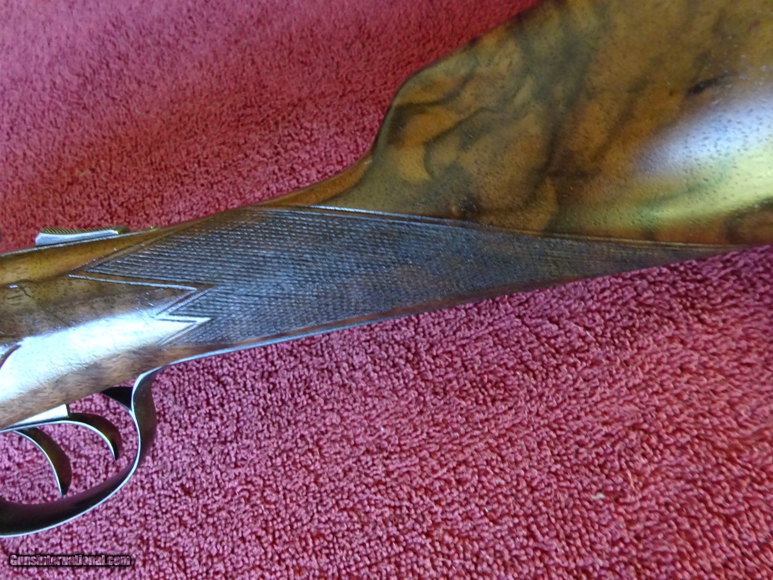 Description: SALE PENDING PARKER REPRODUCTION DHE 20 GAUGE, 28" BARRELS. IMPCYL. AND MODIFIED, MIRROR BRIGHT BORES, EXCELLENT BLUE, SINGLE BEAD SIGHT, 3" CHAMBERS, AUTOMATIC EJECTORS. VERY ATTRACTIVE ENGRAVING - ENGLISH POINTER ON RIGHT SIDE, ENGLISH SETTER ON LEFT SIDE, 3 PHEASANTS ON THE FLOOR PLATE, PLUS ACANTHUS SCROLLWORK AND BORDERS. VIVID CASE COLOR IN THE PROTECTED AREAS, ENGRAVING SHARP WITH NO WEAR. DOUBLE TRIGGERS. STRAIGHT GRIP STOCK, SPLINTER FOREARM, FINE CHECKERING. UNUSUAL VERY HIGHLY FIGURED WOOD AND SKELETON BUTTPLATE. WOOD HAS BEEN REFINISHED, METAL IS ALL ORIGINAL. UNUSUAL SERIAL NUMBER - P-311. THE MEANING OF THE "P" PREFIX IS POSSIBLY PROTOTYPE OR PERSONAL - THE JURY IS STILL OUT. INCLUDES ORIGINAL LEATHER TRUNK CASE WITH CANVAS COVER, PARKER LABEL UNDER THE LID, "MADE IN ITALY" LABEL ON OUTSIDE PLUS ITALIAN MARKED PLASTIC HANG TAG, (PROBABLY THE CASE MANUFACTURERS). AN INTERESTING FIRST YEAR PRODUCTION GUN WITH EXCEPTIONALLY FIGURED WOOD AND UNUSUAL SERIAL NUMBER. $5500.00 + $60.00 insured shipping to an FFL address. Layaway is available. See all Pats gun listings on this site! We also have hundreds of pieces of ORIGINAL gun company advertising & memorabilia available for sale on our site SPORTINGCOLLECTIBLES. we have no reprints for reproductions. Email for more information. SOLD |