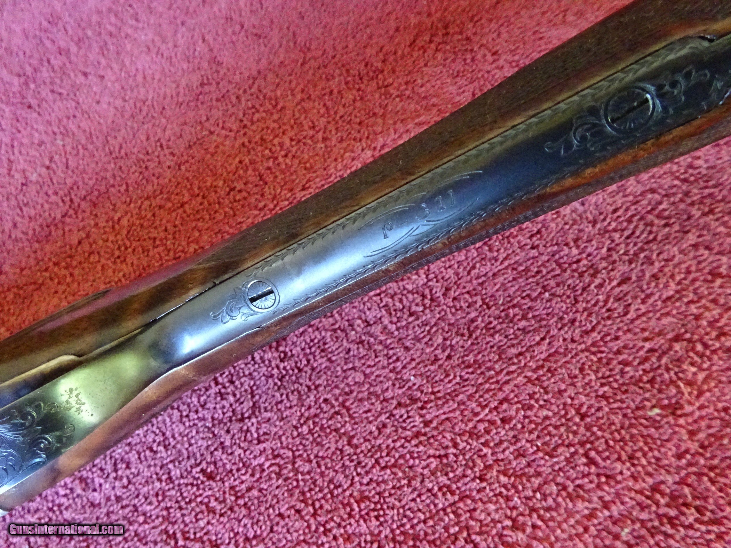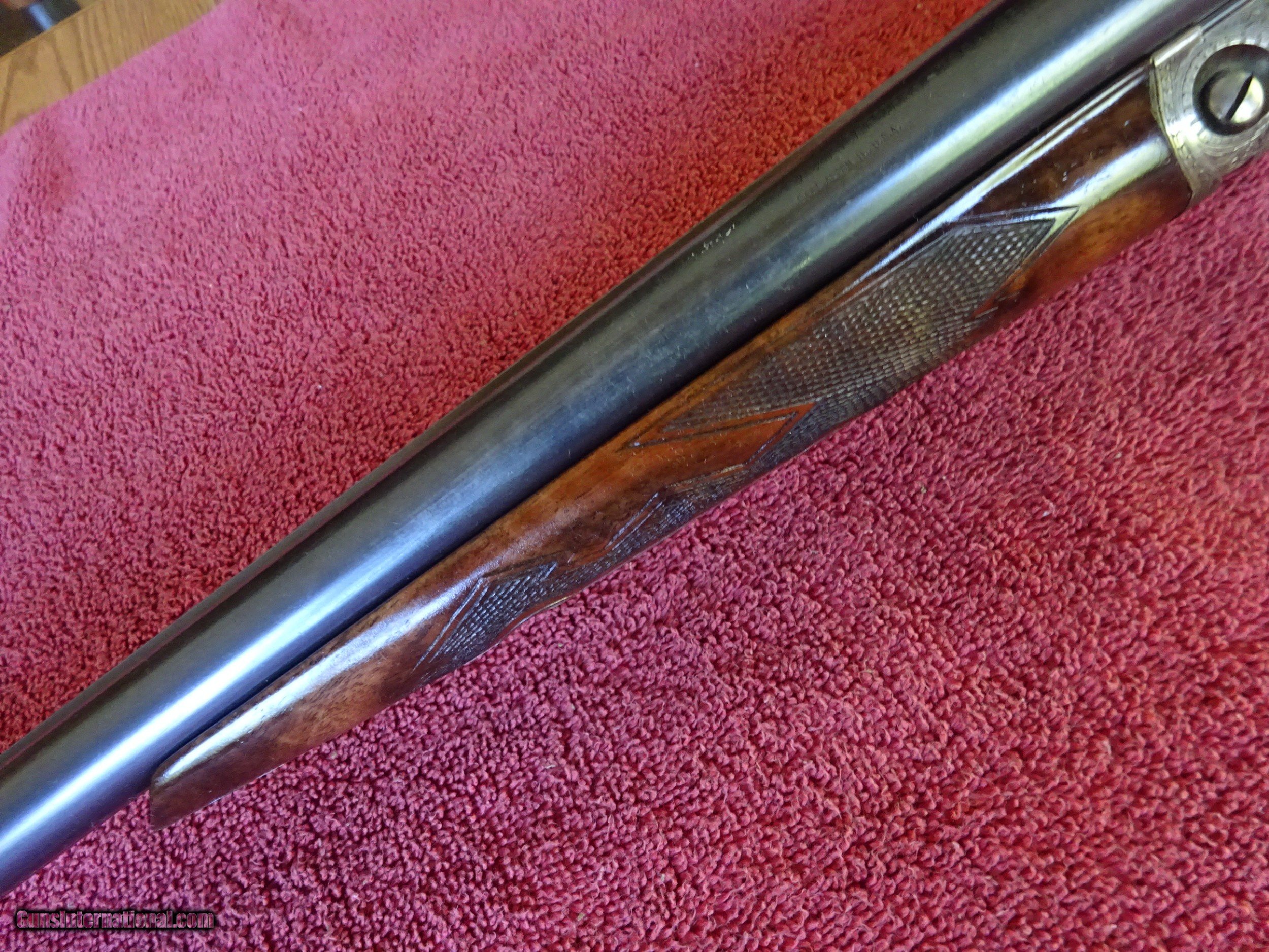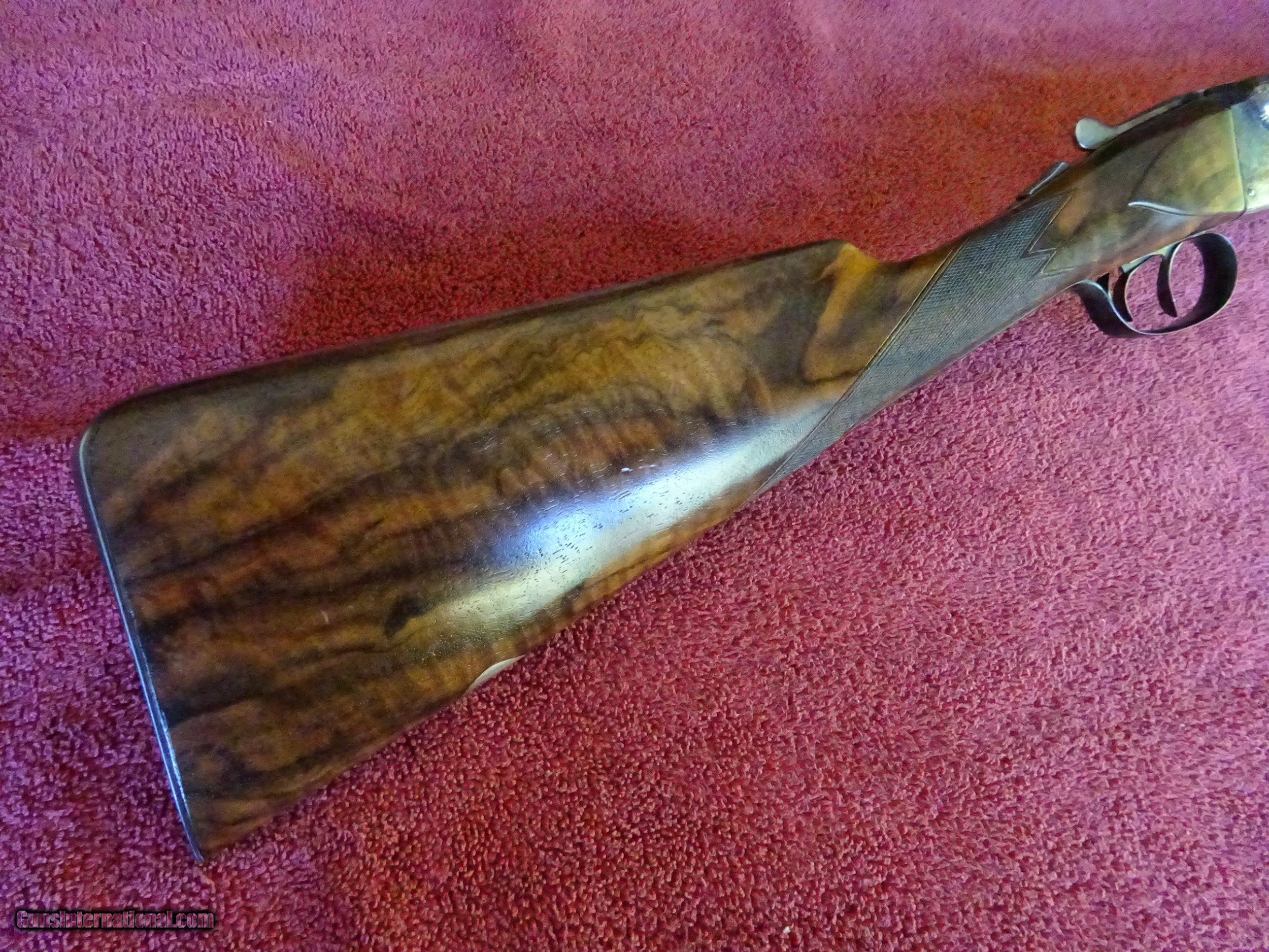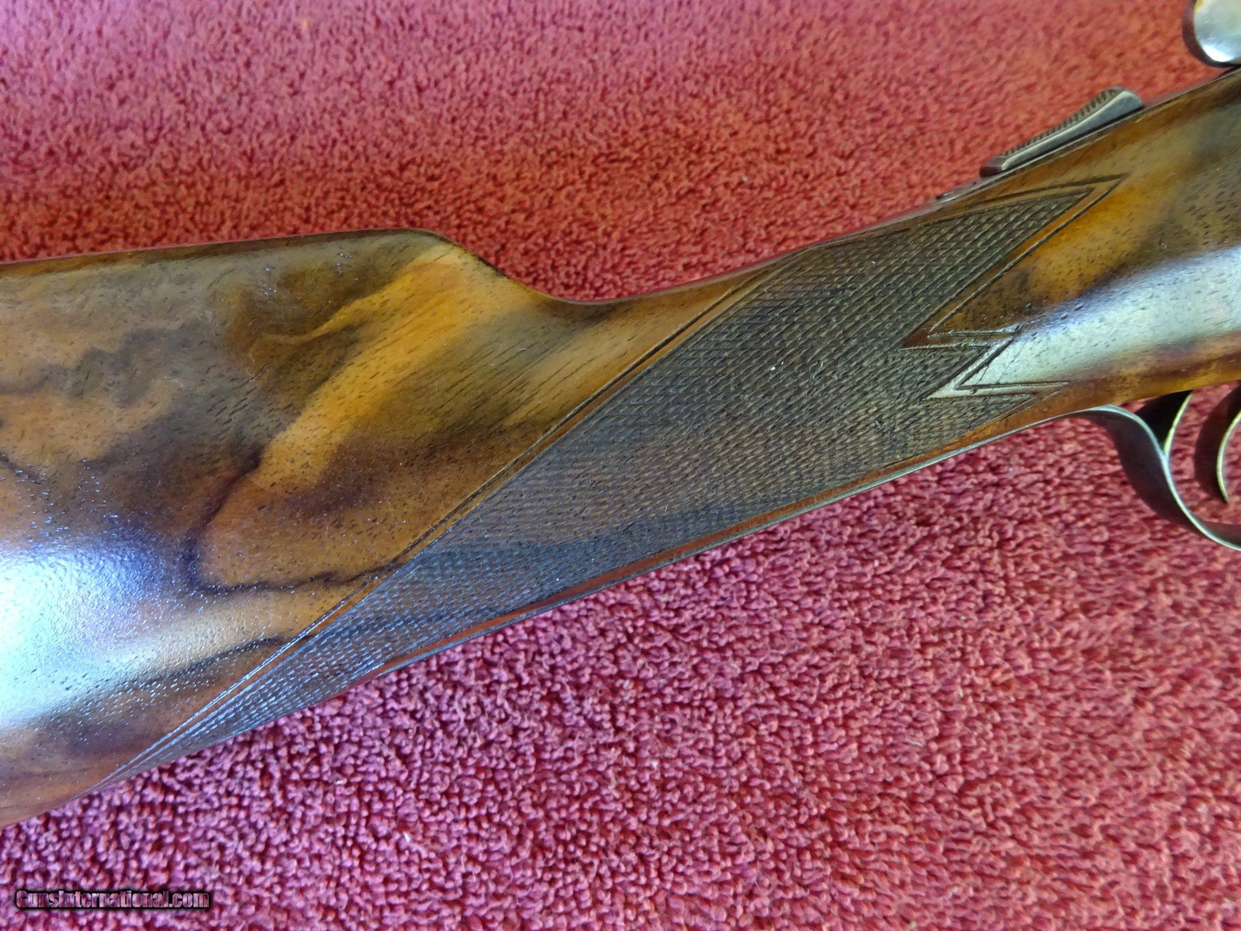 Description: SALE PENDING PARKER REPRODUCTION DHE 20 GAUGE, 28" BARRELS. IMPCYL. AND MODIFIED, MIRROR BRIGHT BORES, EXCELLENT BLUE, SINGLE BEAD SIGHT, 3" CHAMBERS, AUTOMATIC EJECTORS. VERY ATTRACTIVE ENGRAVING - ENGLISH POINTER ON RIGHT SIDE, ENGLISH SETTER ON LEFT SIDE, 3 PHEASANTS ON THE FLOOR PLATE, PLUS ACANTHUS SCROLLWORK AND BORDERS. VIVID CASE COLOR IN THE PROTECTED AREAS, ENGRAVING SHARP WITH NO WEAR. DOUBLE TRIGGERS. STRAIGHT GRIP STOCK, SPLINTER FOREARM, FINE CHECKERING. UNUSUAL VERY HIGHLY FIGURED WOOD AND SKELETON BUTTPLATE. WOOD HAS BEEN REFINISHED, METAL IS ALL ORIGINAL. UNUSUAL SERIAL NUMBER - P-311. THE MEANING OF THE "P" PREFIX IS POSSIBLY PROTOTYPE OR PERSONAL - THE JURY IS STILL OUT. INCLUDES ORIGINAL LEATHER TRUNK CASE WITH CANVAS COVER, PARKER LABEL UNDER THE LID, "MADE IN ITALY" LABEL ON OUTSIDE PLUS ITALIAN MARKED PLASTIC HANG TAG, (PROBABLY THE CASE MANUFACTURERS). AN INTERESTING FIRST YEAR PRODUCTION GUN WITH EXCEPTIONALLY FIGURED WOOD AND UNUSUAL SERIAL NUMBER. $5500.00 + $60.00 insured shipping to an FFL address. Layaway is available. See all Pats gun listings on this site! We also have hundreds of pieces of ORIGINAL gun company advertising & memorabilia available for sale on our site SPORTINGCOLLECTIBLES. we have no reprints for reproductions. Email for more information. SOLD |