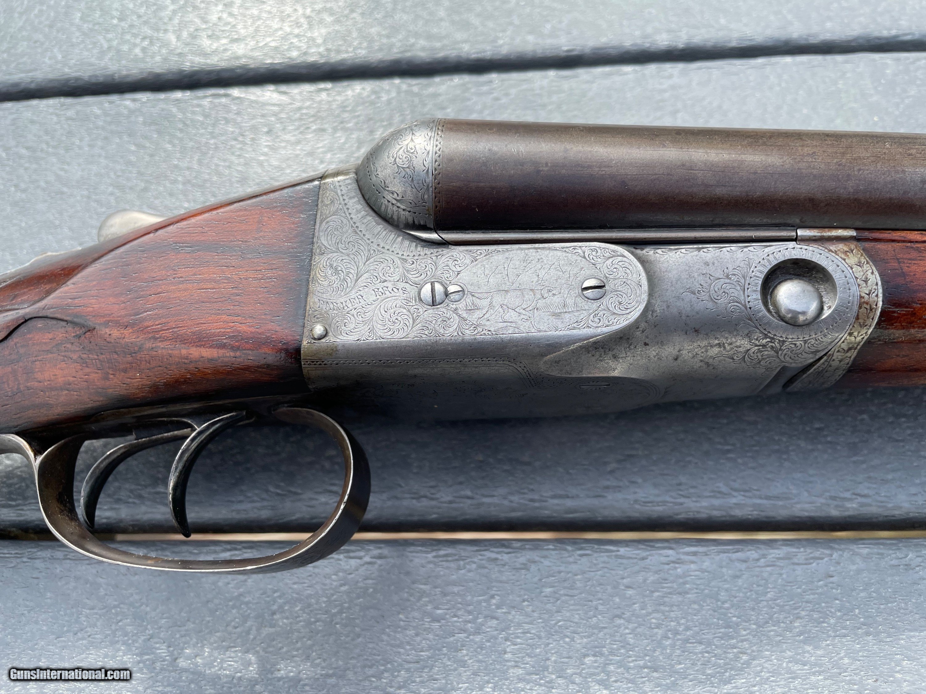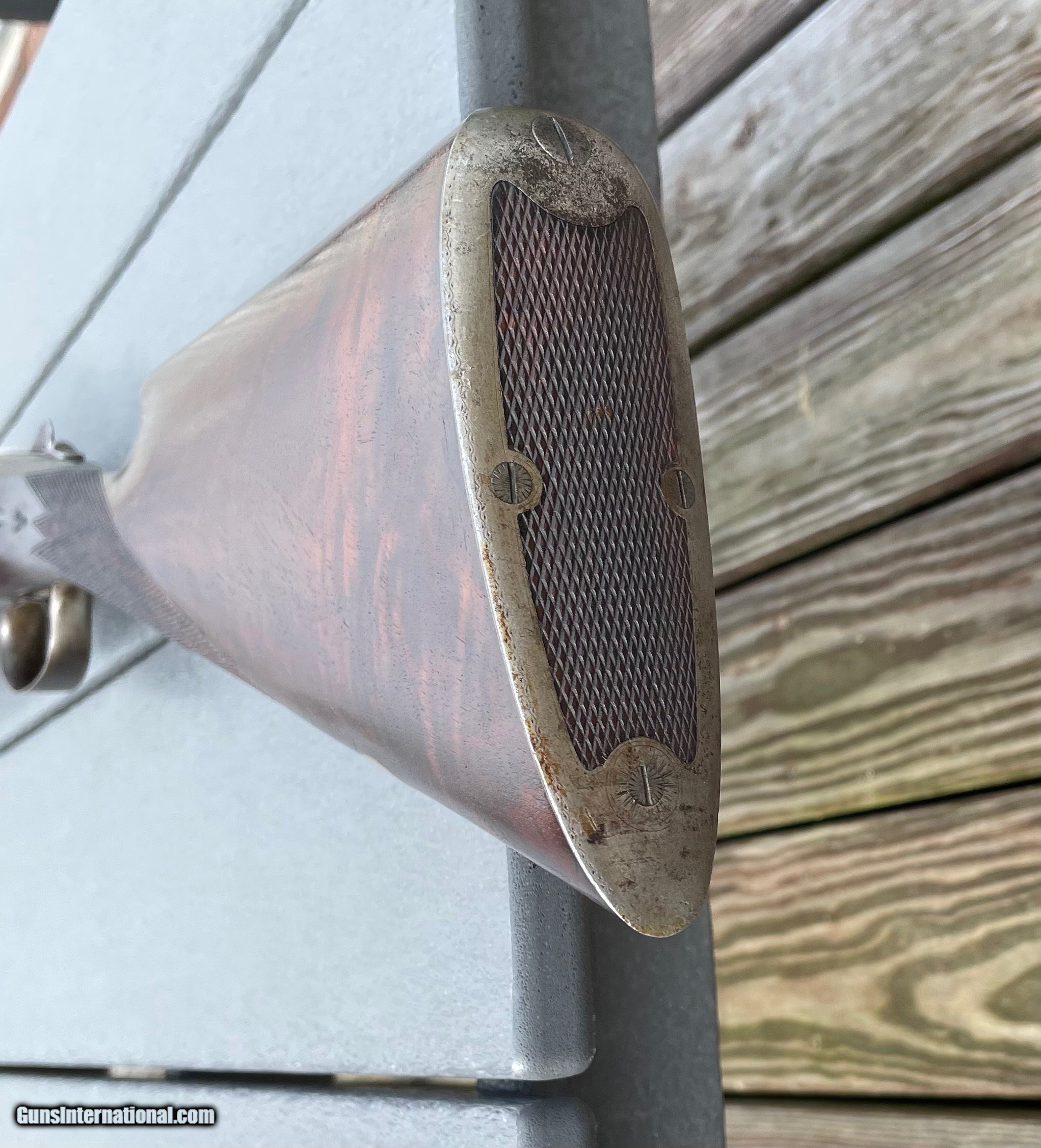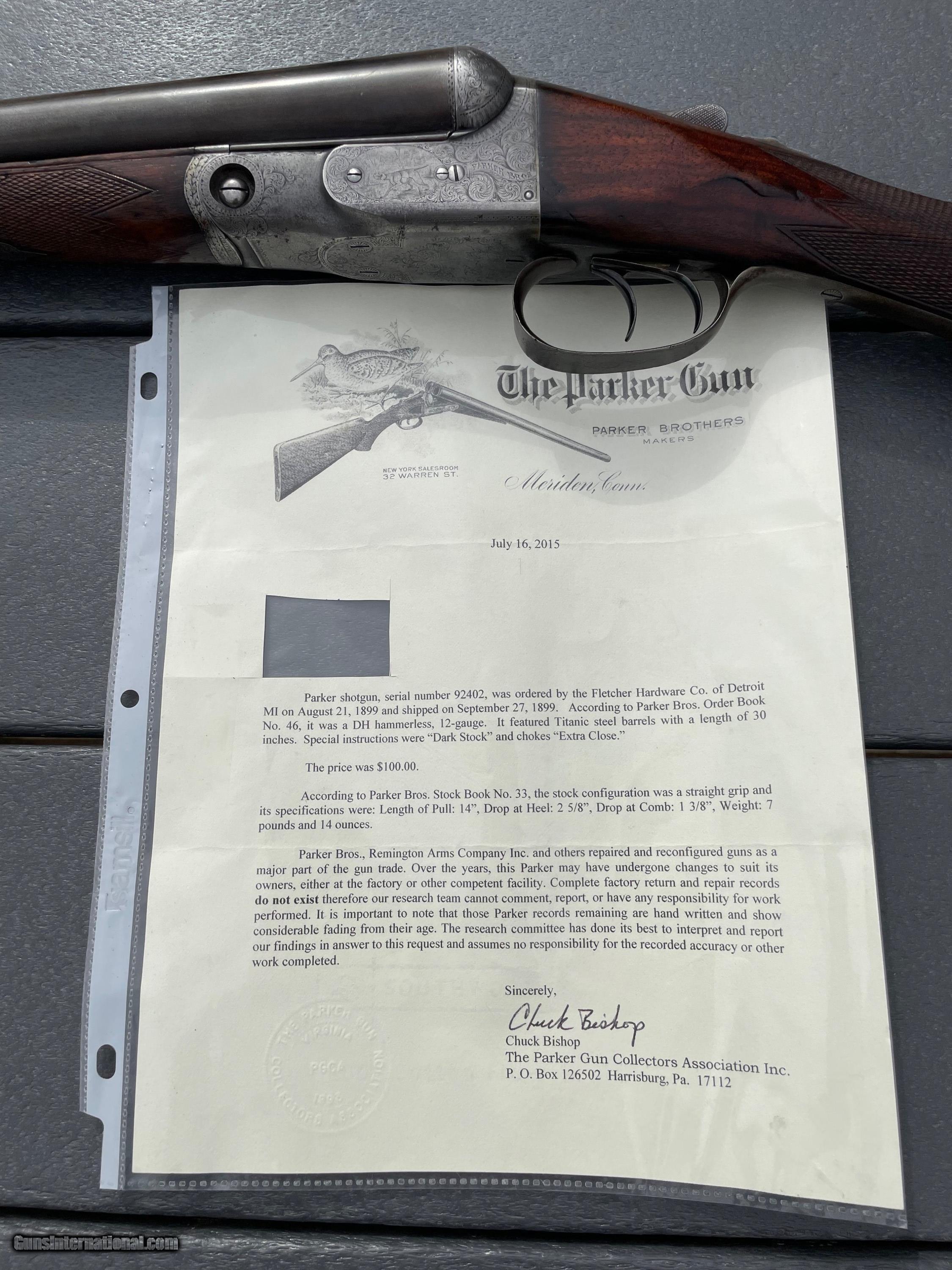 Description: *SOLD PENDING FUNDS* Here we have a great condition Parker DH 12ga with 30in Titanic Steel barrels built in 1899. This shotgun has been lettered and matches such. The wood is in excellent condition with only minor handling marks. The barrel bluing is thinning and there is a small bulge in the right barrel 6-8inches from the muzzle, which is visable in pictures. The chokes of the uncut barrels measure Full/Full on my guage. The engraving on the 2 frame size action is crisp with traces of case hardening visible in protected areas. This is a classic, shootable, original condition side by side from one of America's top manufacturers and eras. $3500 - plus shipping Offers entertained. SOLD Curio/Relic: Yes Shotgun Gauge: 12 Gauge Manufacturer: Parker Model: DH Serial Number: 92402 Ejectors: No Condition: Excellent Metal Condition: Good Wood Condition: Excellent Barrel Type: Titanic Steel Choke Left: Full Choke Right: Full |