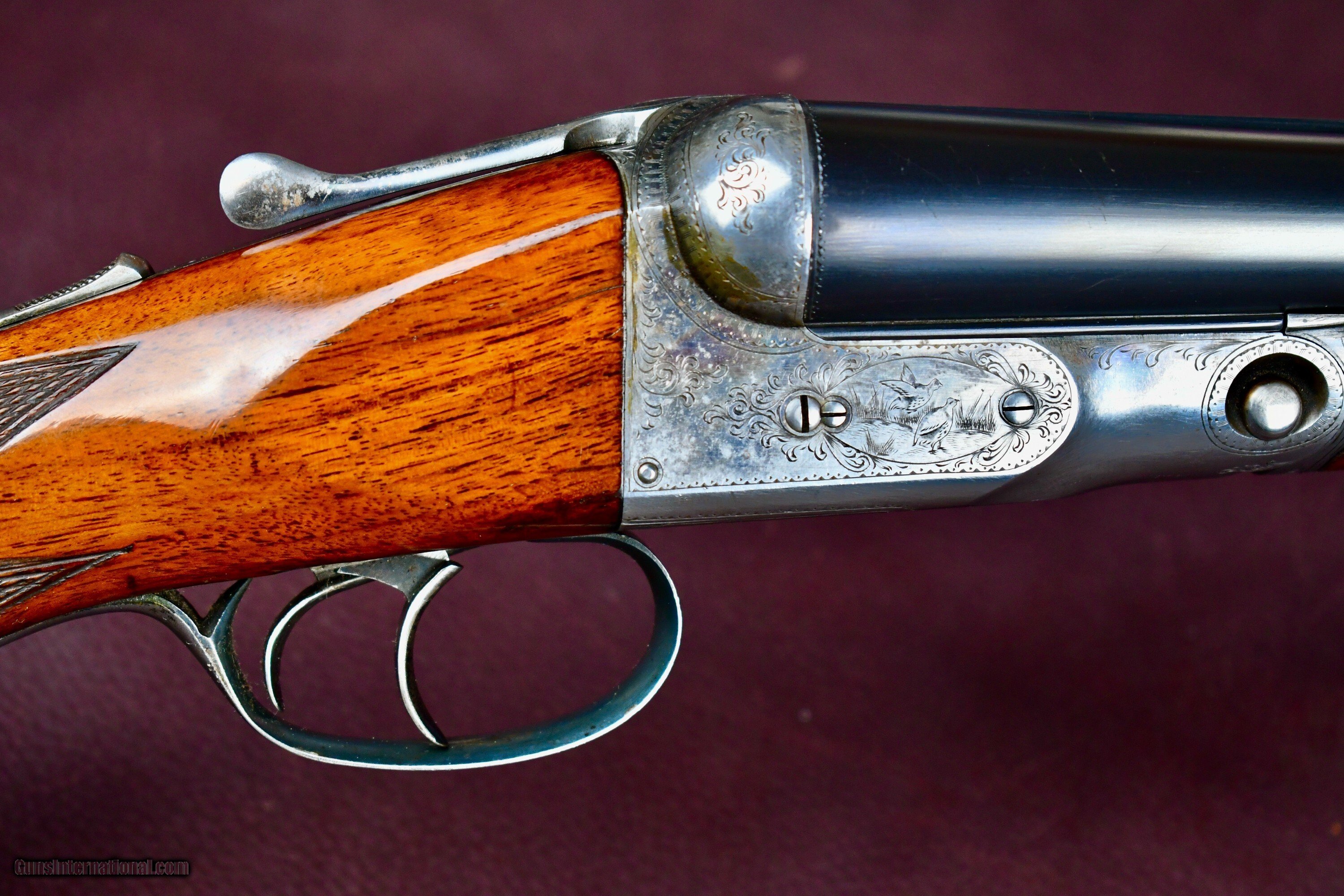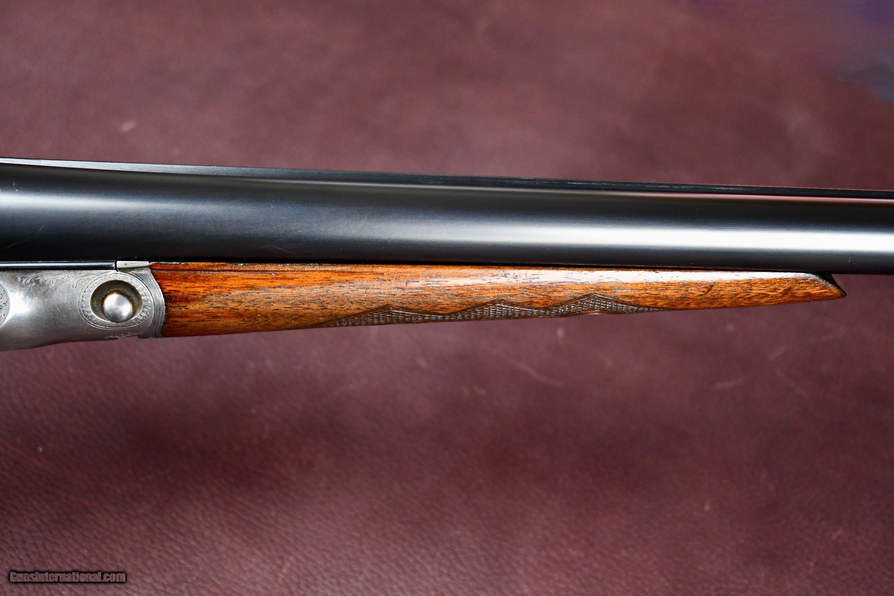Description: THIS IS AN EXTREMELY RARE PARKER BROTHERS GHE 10GA WITH FACTORY 3 1/2" CHAMBERS AND PARKER SPECIAL STEEL BARRELS -- UNTOUCHED ORIGINAL GUN WITH A PARKER FACTORY LETTER-- ORIGINAL BLACK HAWKINS PAD -- BARREL FLATS STAMPED 3 1/2" -- NUMBER 3 FRAME -- FULL PISTOL GRIP WITH CAP -- SPLINTER FOREND -- STANDARD FRONT AND MID BEAD -- DOUBLE TRIGGERS -- EJECTORS -- PERFECT ORIGINAL UNTOUCHED BORES WITH ALL POINTS OF CHOKE -- ONLY 63 STEEL BARRELED GHE 10GA GUNS BUILT WITH THE MAJORITY OF THEM IN STANDARD 3" (2 7/8 ) CHAMBERS -- THIS GUN IS NEARLY IMPOSSIBLE TO FIND IN UNTOUCHED CONDITION WITH THIS OLD GIRL REMAINING IN BEAUTIFUL SHAPE -- CASE COLOR REMAINS VIBRANT AT 60% -- BLUING IS EXCELLENT UNTOUCHED WITH NO SIGNS OF FADING -- STAMPINGS CRISP AND UNTOUCHED -- EXCELLENT SCREWS -- TOP LEVER RIGHT OF CENTER AND ON FACE -- VARNISH IS IN EXCELLENT ORIGINAL CONDITION WITH SLIGHT LOSS ON FOREND FROM USE -- WOOD HAS BEAUTIFUL FIGURE WITH THE UNDER TONES A RICH ORANGE BURGANDY -- A VERY RARE SHOTGUN THAT WOULD STAND TALL IN THE BEST OF COLLECTIONS. MAYBE 2-3 GUNS TOTAL WITH 3 1/2" CHAMBERS. Shotgun Gauge: 10 Gauge Manufacturer: PARKER BROTHERS Model: GHE 10GA MAGNUM Barrel Length: 32 Chambers: 3 1/2 Ejectors: YES Condition: EXCELLENT ORIGINAL Metal Condition: EXCELLENT ORIGINAL Wood Condition: EXCELLENT ORIGINAL Bore Condition: EXCELLENT Barrels: PARKER SPECIAL STEEL Action: SXS Triggers: 2 Stock: FULL PISTOL Stock Comb: 1 1/2 Stock Heel: 2 1/2 LOP: 13 3/4 Weight: 9lbs 8oz Sights: 2 Manufacture Date: 1933 Choke Left: FULL Choke Right: FULL Engraving: YES FACTORY "G Extras: FACTORY RESEARCH LETTER Proof:Nitro: Yes Price: $21,500.00 Contact Seller |