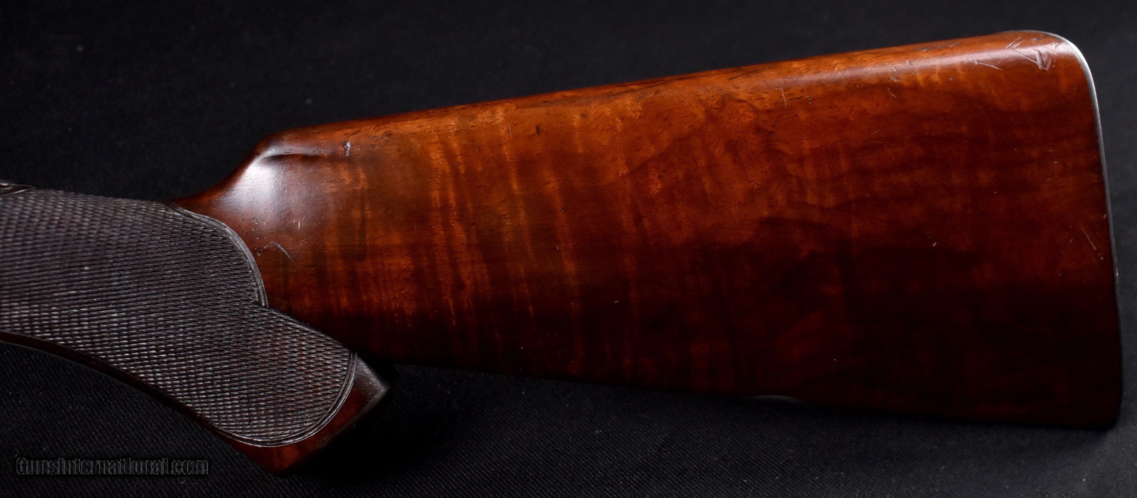 Description: Beautiful all original Parker CHE 12ga game gun made with 28" Acme barrels on a 1-1/2 Frame with splinter forend, double triggers, capped pistol grip and original skeleton buttplate. The gun is nicely engraved with large flying goose on trigger plate and in typical CHE grade pattern throughout. Gorgeous original well fiddleback figured French Walnut stock is checkered in fine CHE grade pattern. Overall the gun remains in pleasing untouched original condition with about 35% original case color on the sides and vivid in protected areas. The barrels retain about 95% original blue with some light handling marks and are dent free and excellent overall. The stocks are sound and retain more than 95% original finish with only minor handling marks. Skeleton buttplate is excellent with more than 1/3 of the original blue remaining and the trigger guard has some original blue on the bow. This is an excellent all original CHE that is field ready and gun room worthy. It's truly a sweetspot gun that is all original and not so minty that it cant be used. This gun is priced at $6995 plus shipping to your FFL. Please dont hesitate to contact me at (704) 280-2382 or via PM on this site with any questions or reasonable offers. SOLD Curio/Relic: Yes Shotgun Gauge: 12 Gauge Manufacturer: Parker Bros Model: CHE Serial Number: 221299 Barrel Length: 28 Chambers: 2-3/4 Ejectors: yes Condition: Excellent and original Metal Condition: Excellent and Original Wood Condition: Excellent and original Bore Condition: brilliant and shiny Barrels: Acme Triggers: Double Triggers Stock Comb: 1-9/16 Stock Heel: 2-1/4 Fore End: Splinter Butt Pad: Original skeleton BP LOP: 14-1/2" over orig Skeleton BP Weight: 7lbs 1oz Choke Left: .730 with .006 (I/C) Choke Right: .730 with .028 (Mod) Minimum Wall Thickness Left: .026 Minimum Wall Thickness Right: .026 |