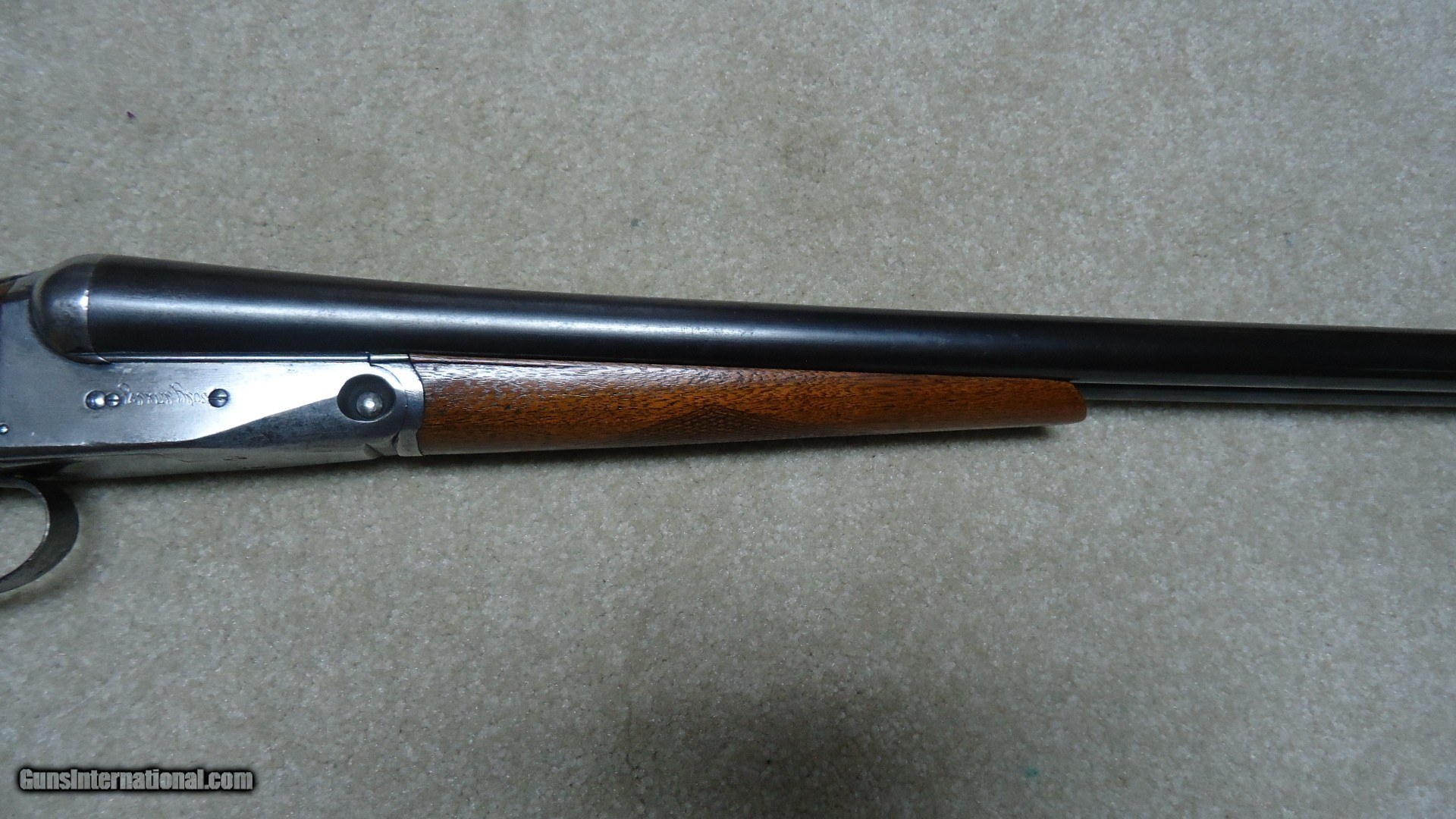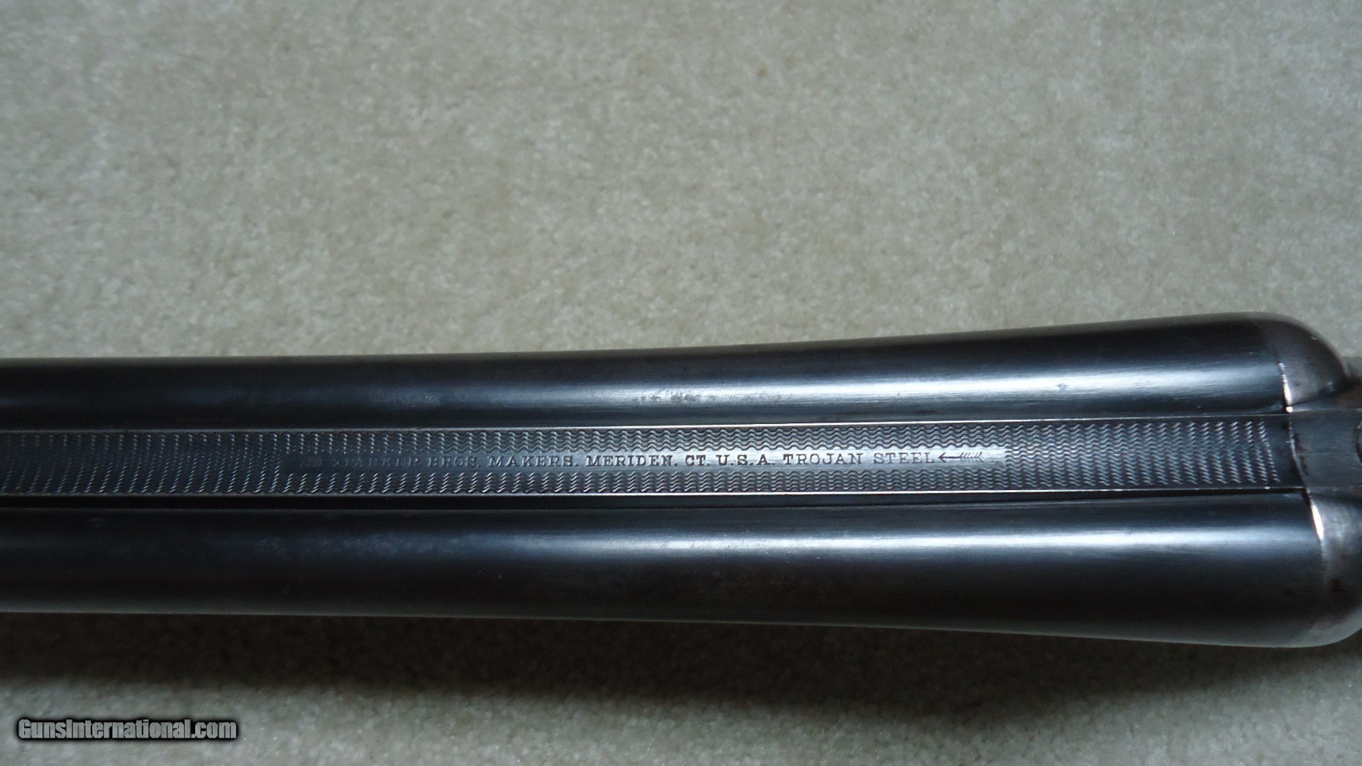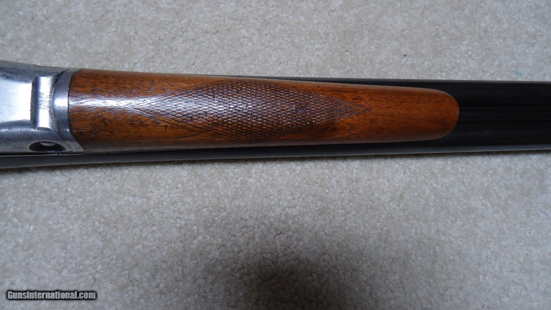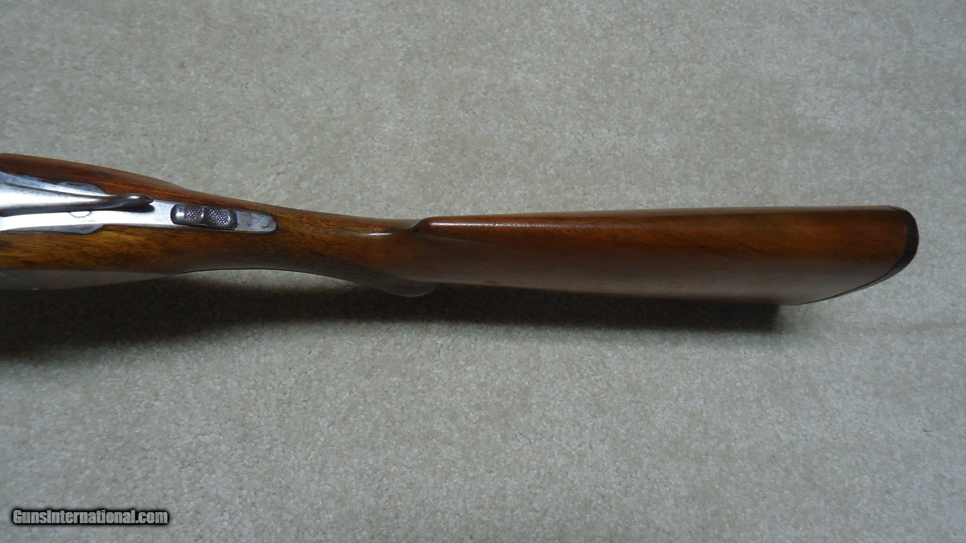 Description: CLASSIC PARKER TROJAN 12 GAUGE SIDE BY SIDE DOUBLE SHOTGUN, #195XXX, MADE 1921. This shotgun with 30" barrels (marked "TROJAN STEEL"), double triggers and choked Modified and Full is listed by serial number in the book PARKER GUN IDENTIFICATION AND SERIALIZATION and confirms the model and barrel length etc. The barrels retain nice even blue with only minor thinning and age. The receiver is mostly a smooth silvery patina. All markings are sharp and clear and all parts have matching numbers. The bores are minty bright. Very tight lock up. The excellent butt stock and forend show some wear to the checkering patterns, but there is no oil soaking to the wood or chips/cracks around the receiver etc. and retains the original plain black butt plate typical of this field grade model (most have had recoil pads added at a later date). Everyone who enjoys shotgunning in its many forms should have a classic American double gun to shoot! This would be a good one for that! SOLD Curio/Relic: Yes Manufacturer: PARKER Model: TROJAN Serial Number: 195XXX Barrel Length: 30 Condition: FINE Bore Condition: EXCELLENT Chokes: MOD./FULL |