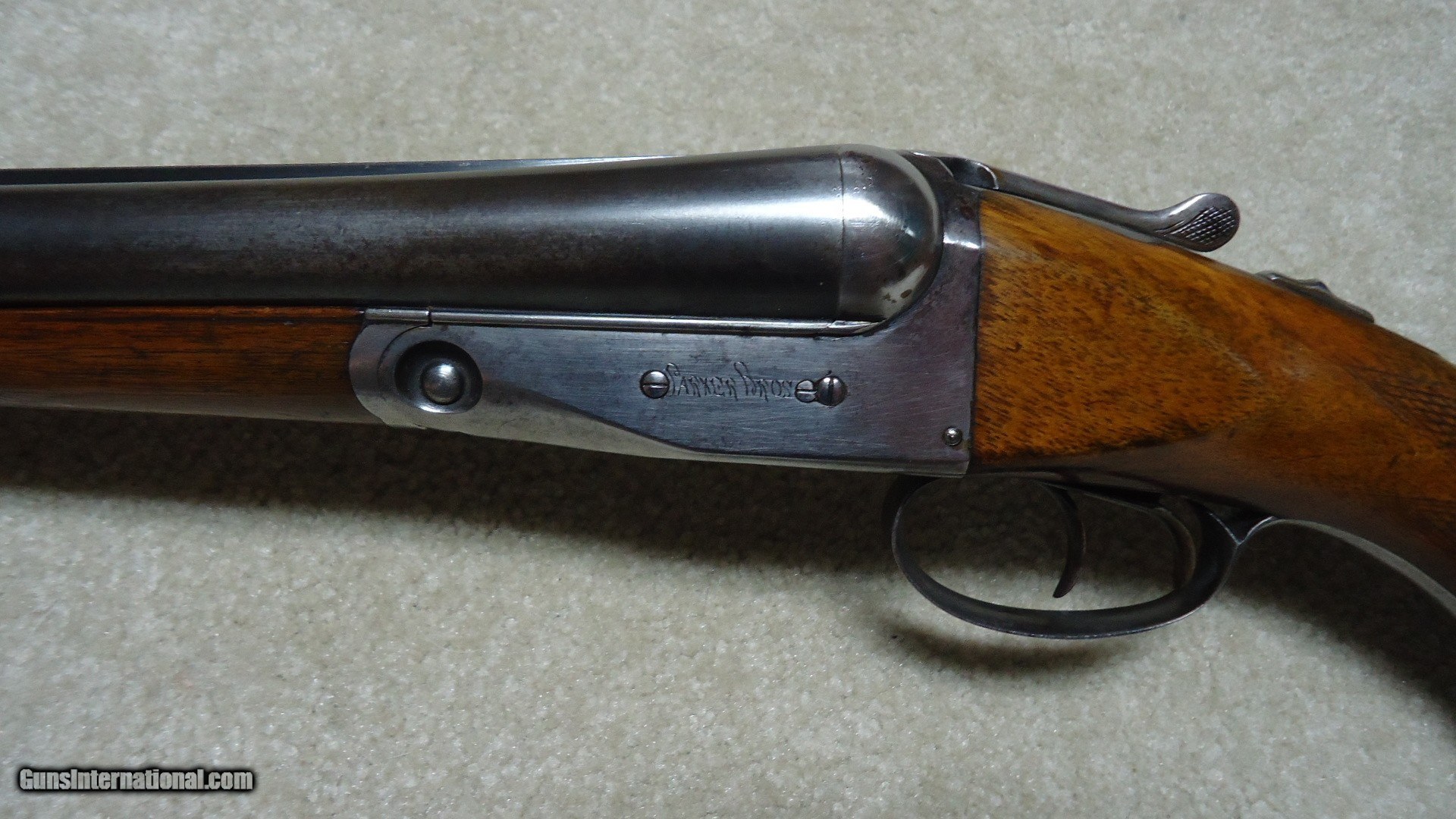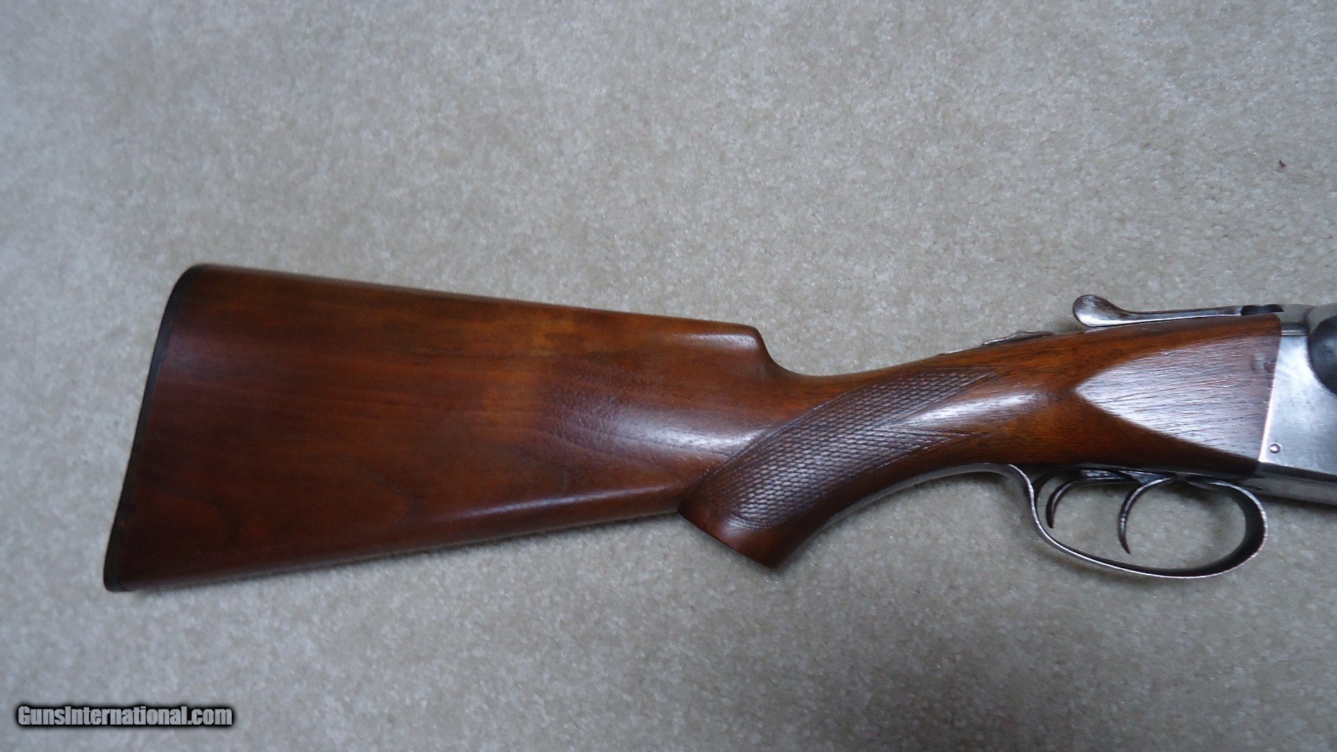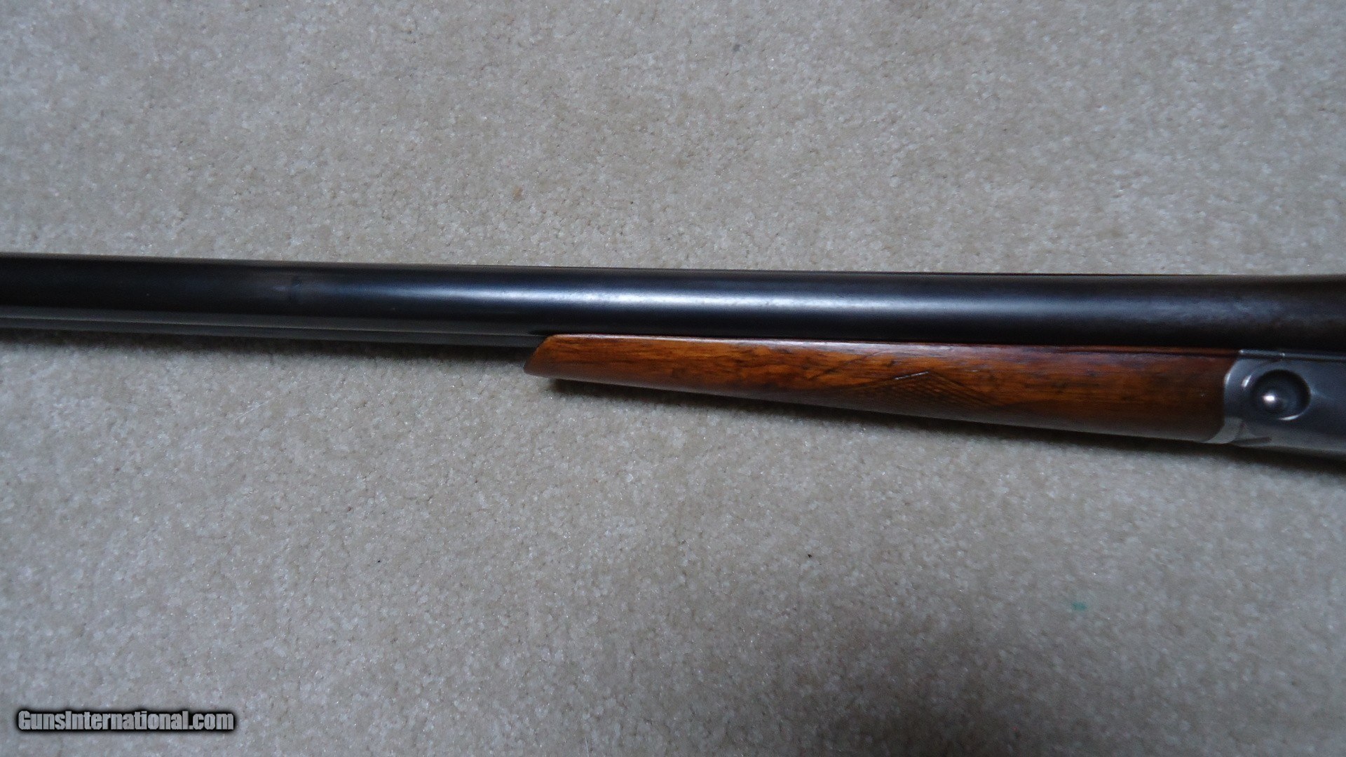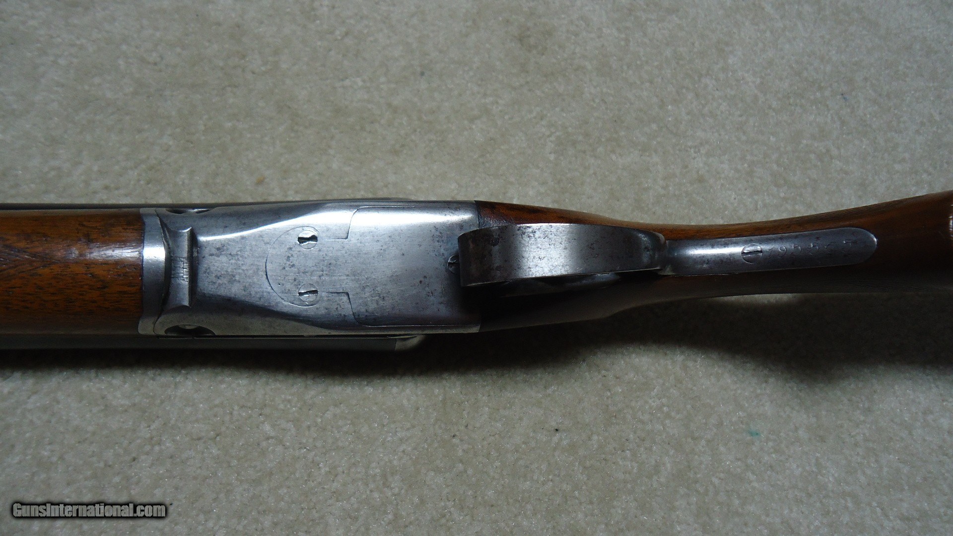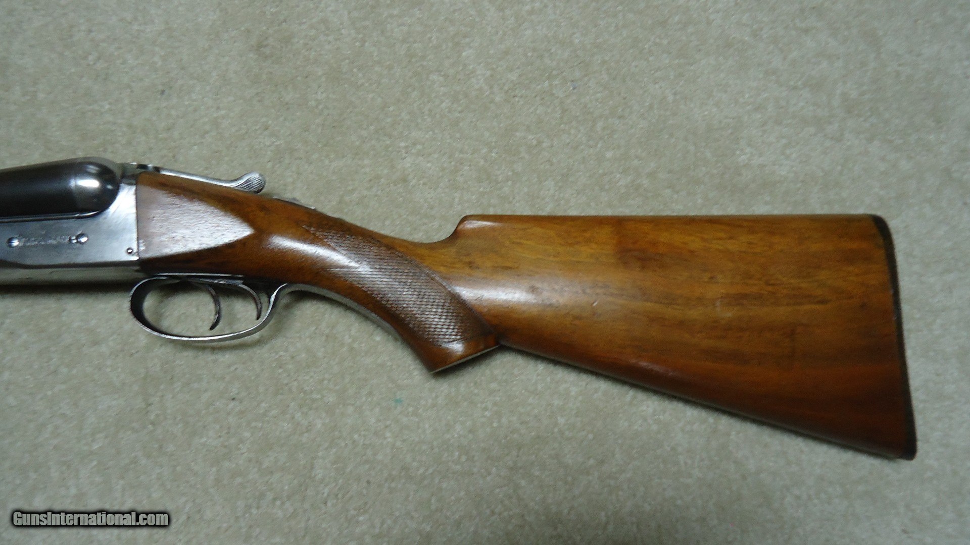 Description: CLASSIC PARKER TROJAN 12 GAUGE SIDE BY SIDE DOUBLE SHOTGUN, #195XXX, MADE 1921. This shotgun with 30" barrels (marked "TROJAN STEEL"), double triggers and choked Modified and Full is listed by serial number in the book PARKER GUN IDENTIFICATION AND SERIALIZATION and confirms the model and barrel length etc. The barrels retain nice even blue with only minor thinning and age. The receiver is mostly a smooth silvery patina. All markings are sharp and clear and all parts have matching numbers. The bores are minty bright. Very tight lock up. The excellent butt stock and forend show some wear to the checkering patterns, but there is no oil soaking to the wood or chips/cracks around the receiver etc. and retains the original plain black butt plate typical of this field grade model (most have had recoil pads added at a later date). Everyone who enjoys shotgunning in its many forms should have a classic American double gun to shoot! This would be a good one for that! SOLD Curio/Relic: Yes Manufacturer: PARKER Model: TROJAN Serial Number: 195XXX Barrel Length: 30 Condition: FINE Bore Condition: EXCELLENT Chokes: MOD./FULL |