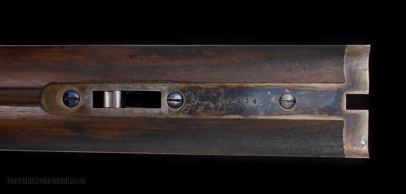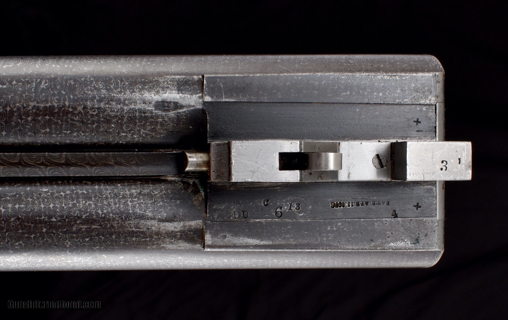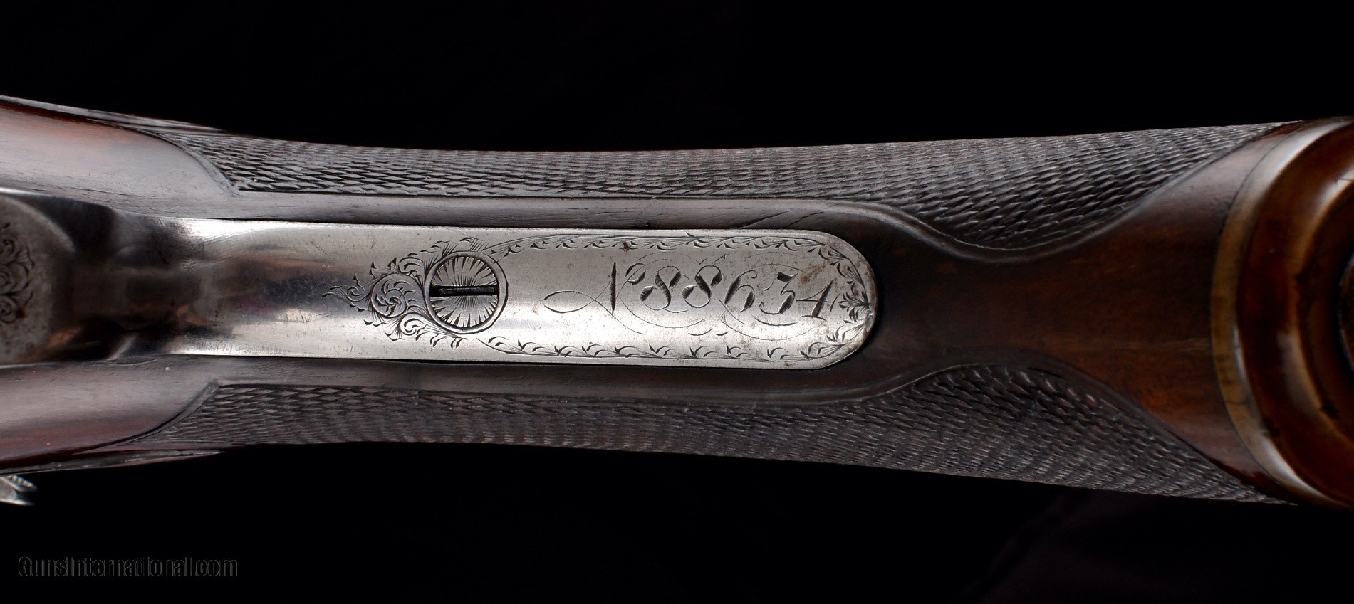 Description: ****SOLD An extreme rarity in Parker Collecting- made in 1897 on a #3 frame this CH Grade 10ga gun made with factory original 34" Damascus barrels and one of only 2 made like this! The gun has 34" damascus barrels, splinter forend, double triggers, extractors, and auto safety. It is stocked with nicely figured European Walnut with capped pistol grip and an aging leather faced Silvers type pad. The case hardened action is beautifully engraved with dogs on sides surrounded by scroll and deer on bottom of trigger plate as seen in the photos. Overall, the gun remains in excellent all original condition (exception being the pad). Barrels retain about 90% original pattern. The action retains about 35%+ original case color with engraving still nice and crisp. Stocks are sound and retain most of their original finish. Bores are bright and shiny. The gun is nice and tight and mechanics are excellent. Screws are all excellent and this is really a very rare and collectible Parker that is just the way we like to find them - used but well taken care of! This fine and rare Parker big bore is priced at $SOLD plus shipping to your door as an antique. Please dont hesitate to contact me at (704) 280-2382 or via PM on this site with any questions or reasonable offers. SOLD Antique: Yes Shotgun Gauge: 10 Gauge Manufacturer: Parker Bros Model: CH Serial Number: 88634 Barrel Length: 34" (Extremely rare) Chambers: 3" (Original) Ejectors: Extractors Condition: Excellent Metal Condition: Excellent Wood Condition: Excellent Bore Condition: Bright and shiny Barrel Type: Damascus Triggers: Double Triggers Stock Comb: 1-3/4 Stock Heel: 2-5/8 Fore End: Splinter Butt Pad: Leather faced silvers LOP: 14-1/2 Weight: 10lbs 12oz Choke Left: .041 (Full) Choke Right: .044(Full) Minimum Wall Thickness Left: Over .030 Minimum Wall Thickness Right: Over .030 |