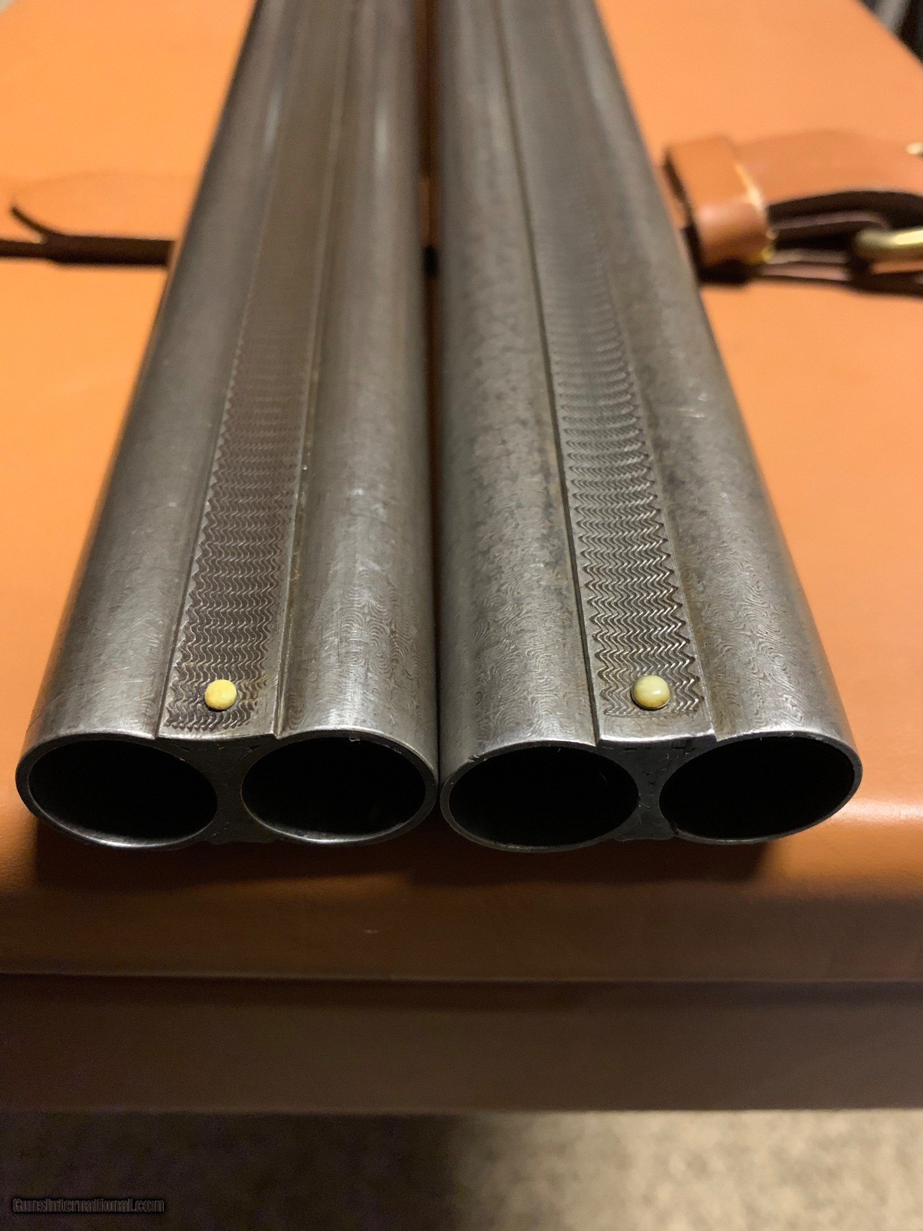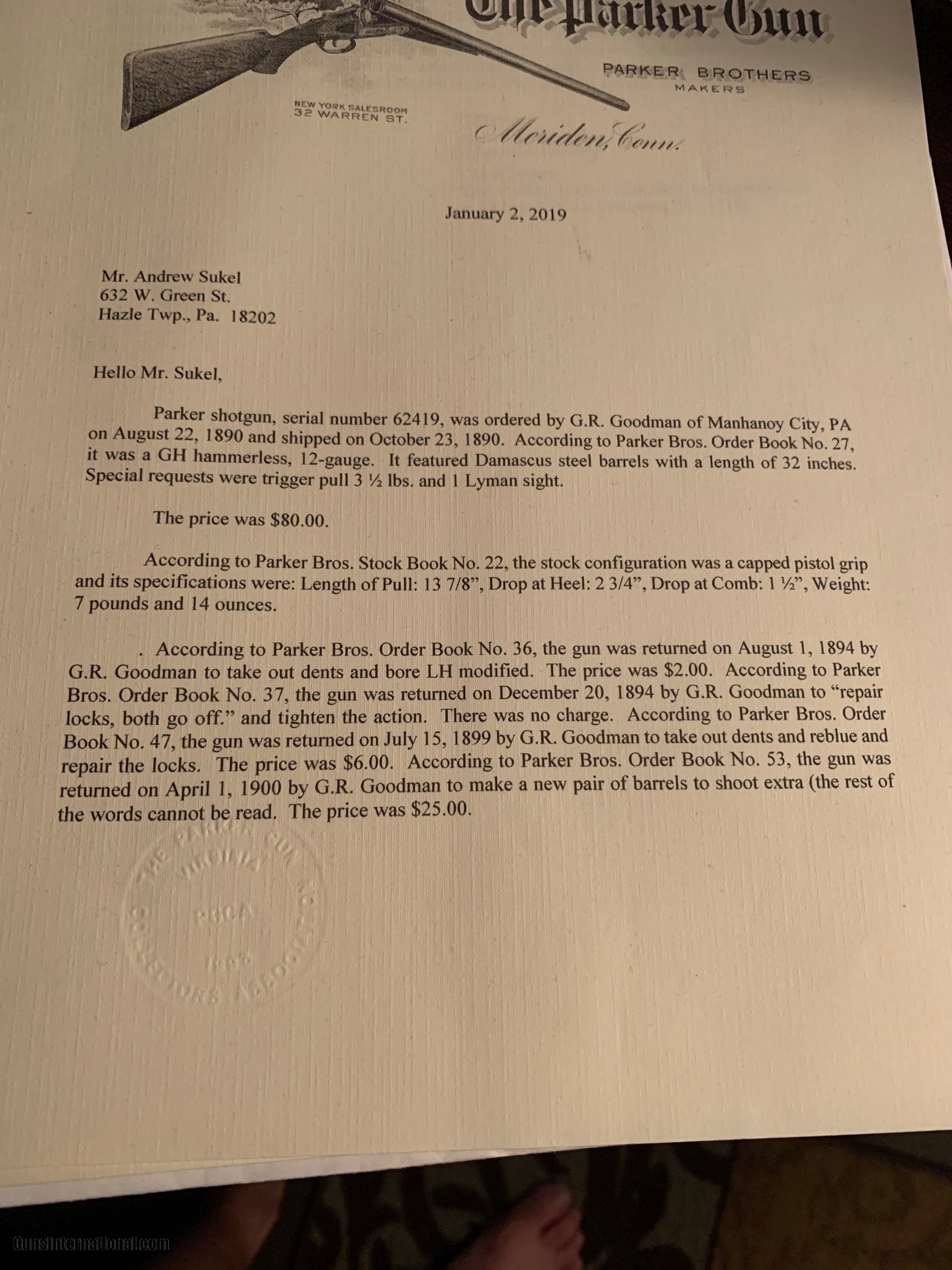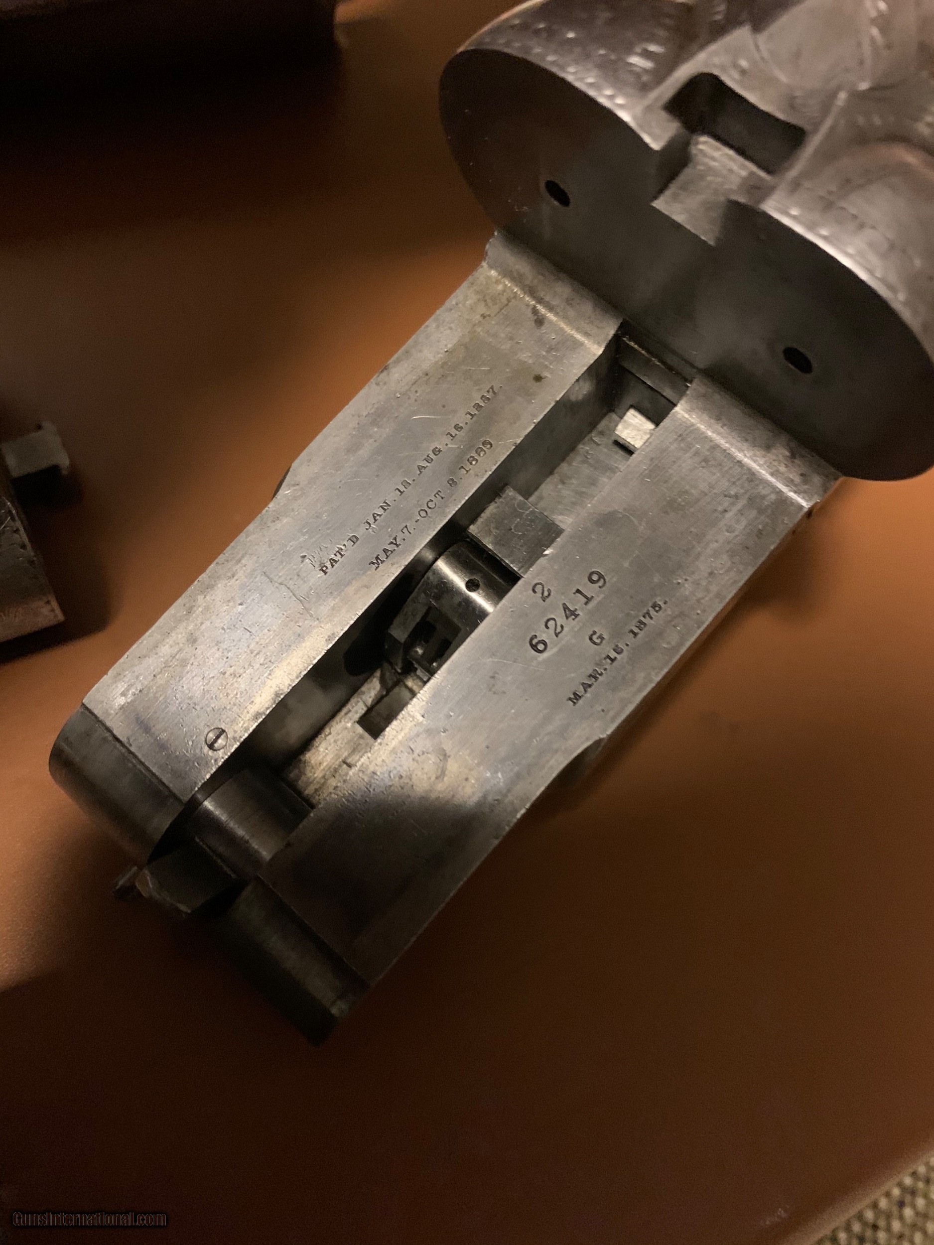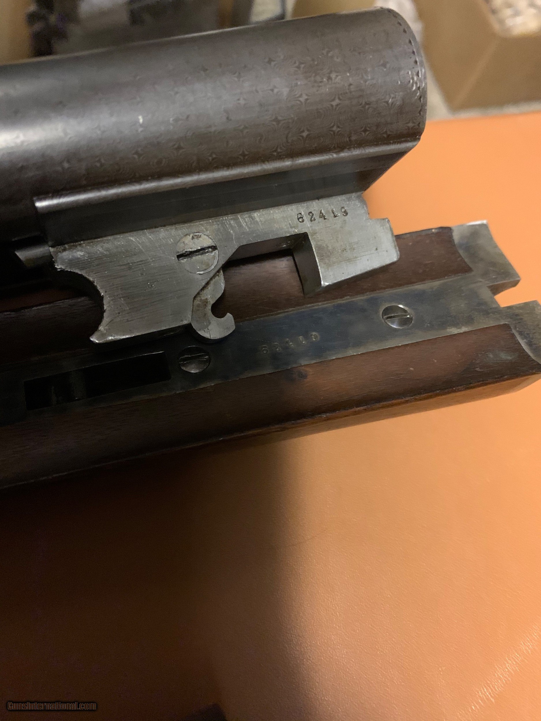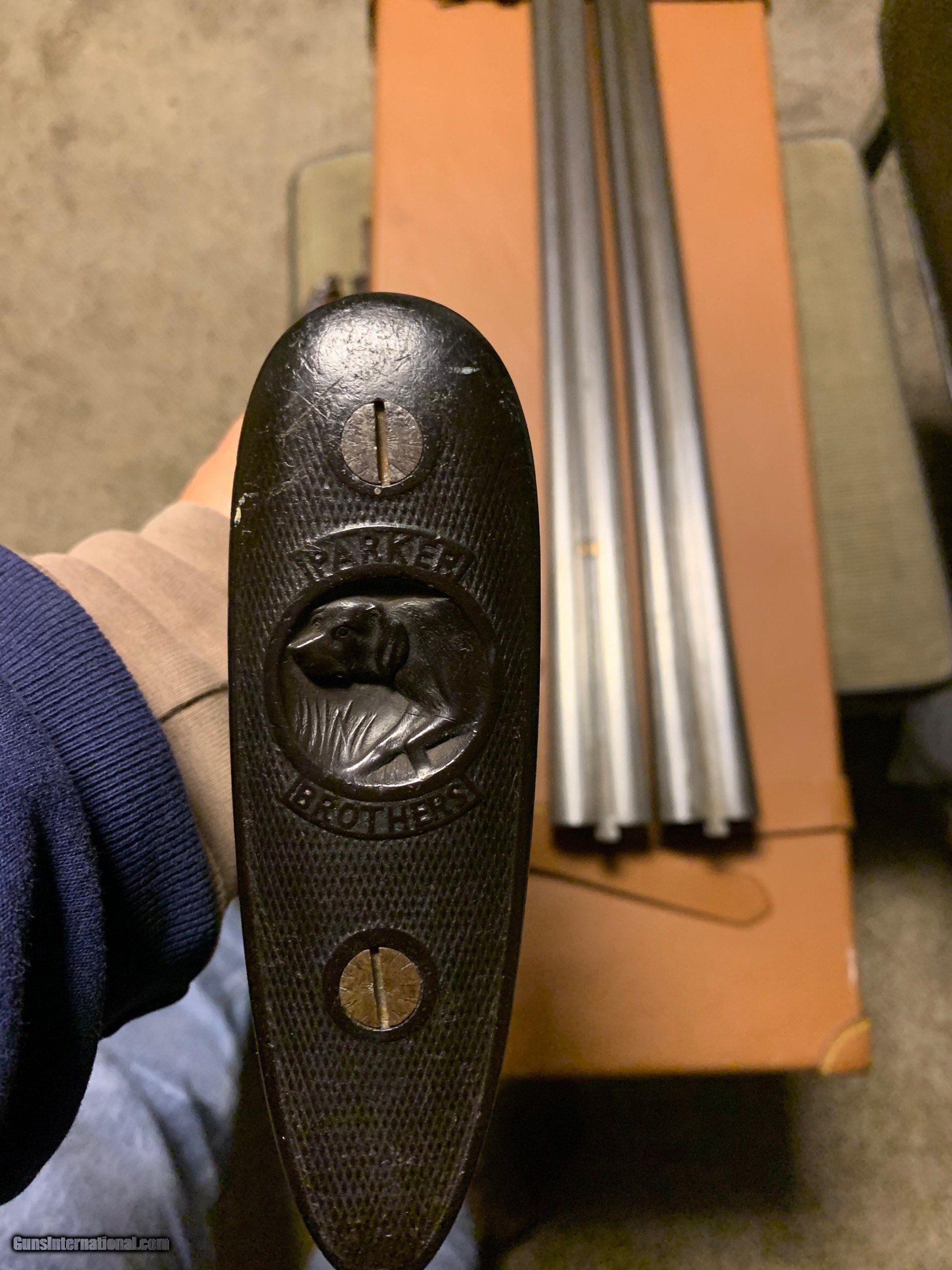 Description: GH Parker with 2 sets of barrels, both original to gun. Original set was 32 but is now 30", still has over .30 thousands choke in each barrel. Second set was added about 10 years later as shown in the letter. They are 30" uncut and have full and full, .35 thousands in each barrel. Set 1 Is slightly lose without the forearm but lock up tight with no movement when the forearm is on. No dents in this set set 2 is slightly loose without the forearm and with the forearm on is still very slightly lose. This set as seen in the picture has a brass piece dovetailed into the rib, and slightly to the left of there is a profound dent in the left barrel and is also visible on the inside of the barrel Good wall thickness is both sets I have shoot both sets of barrels with low pressure loads, still they should be checked out by a confident gunsmith. Very little if any pitting in the barrels 14 1/4" Lop drops are 1 7/8" and 3 3/8" Buyer will pay actual shipping charges SOLD Curio/Relic: Yes |