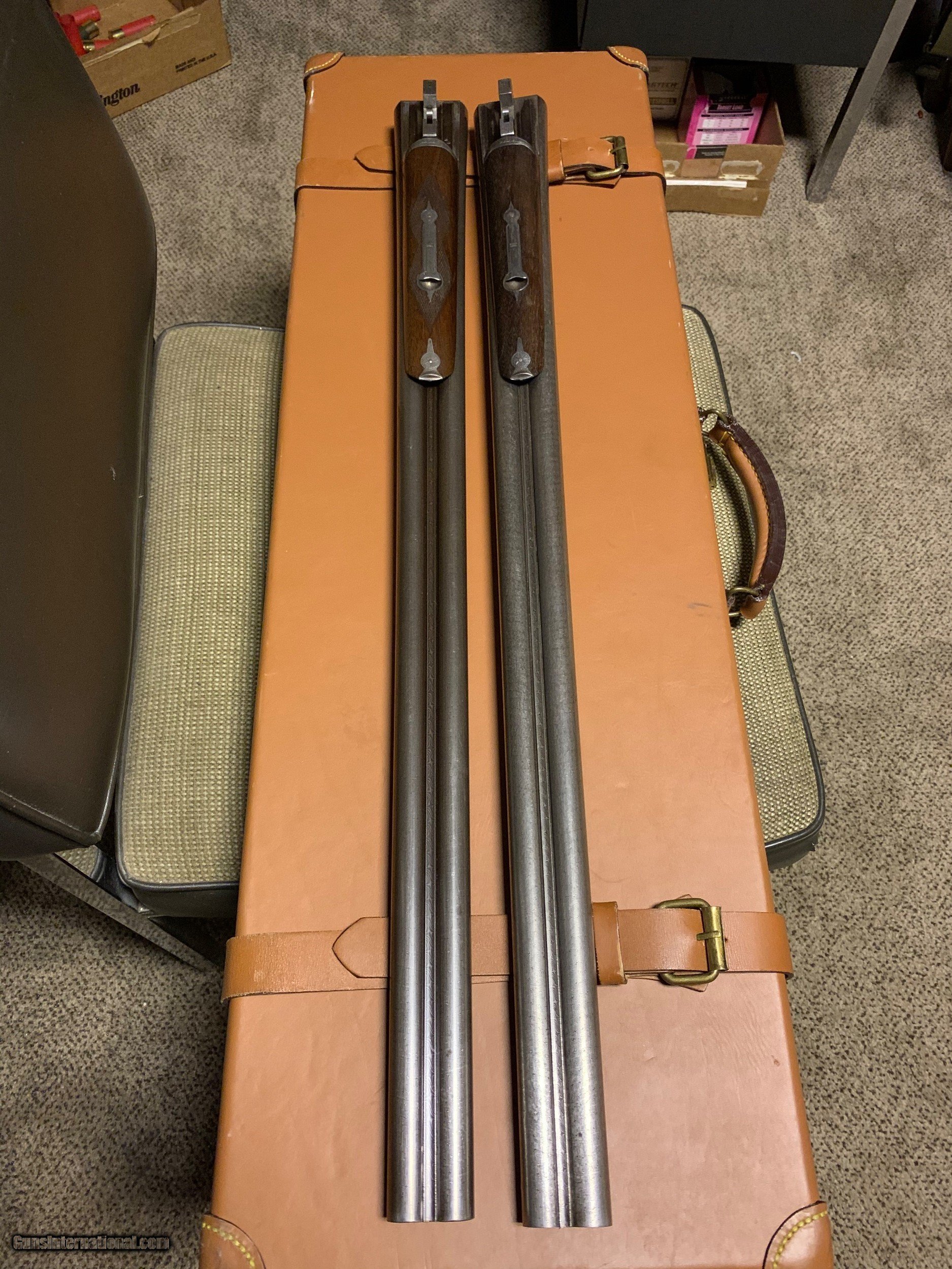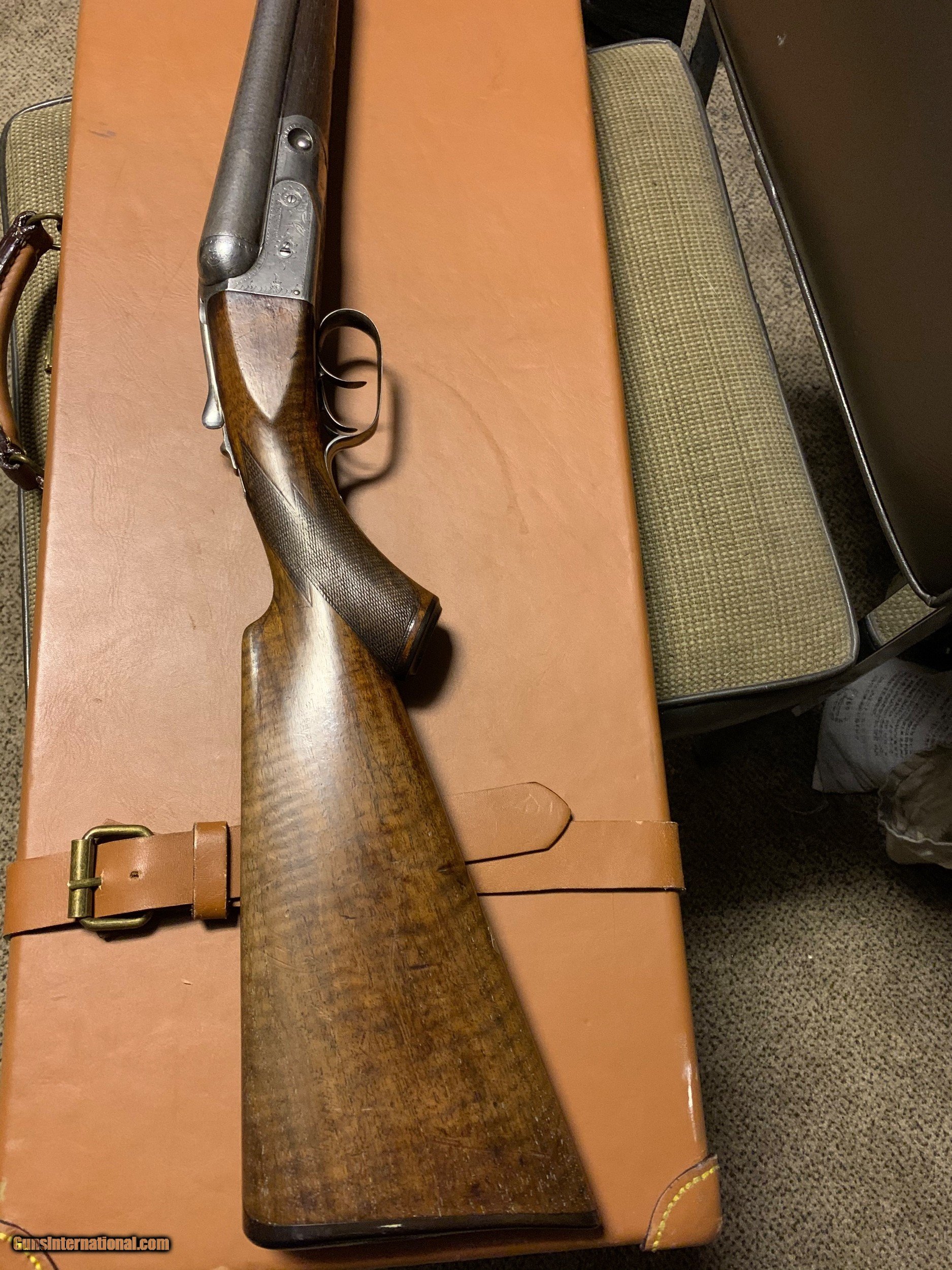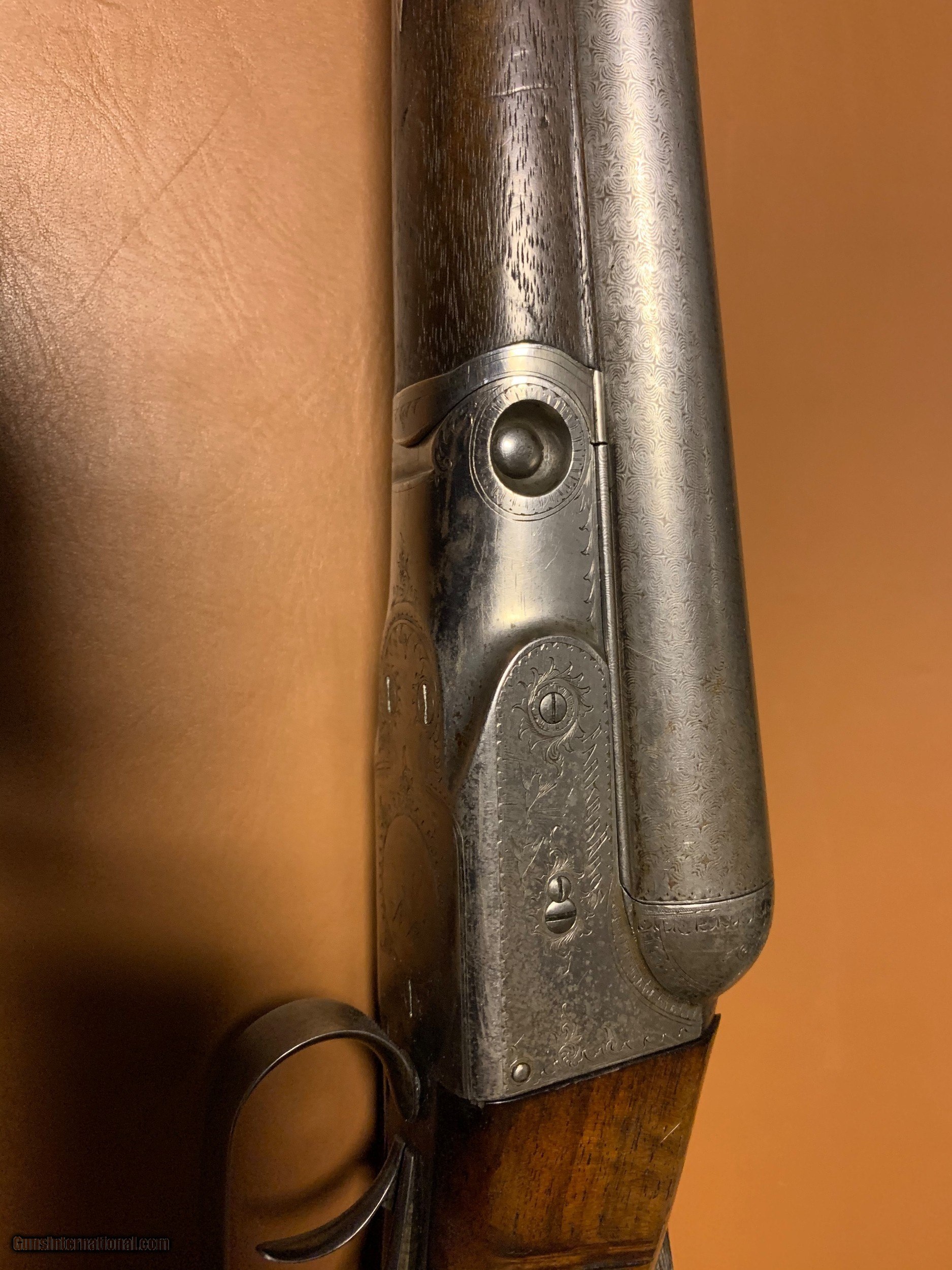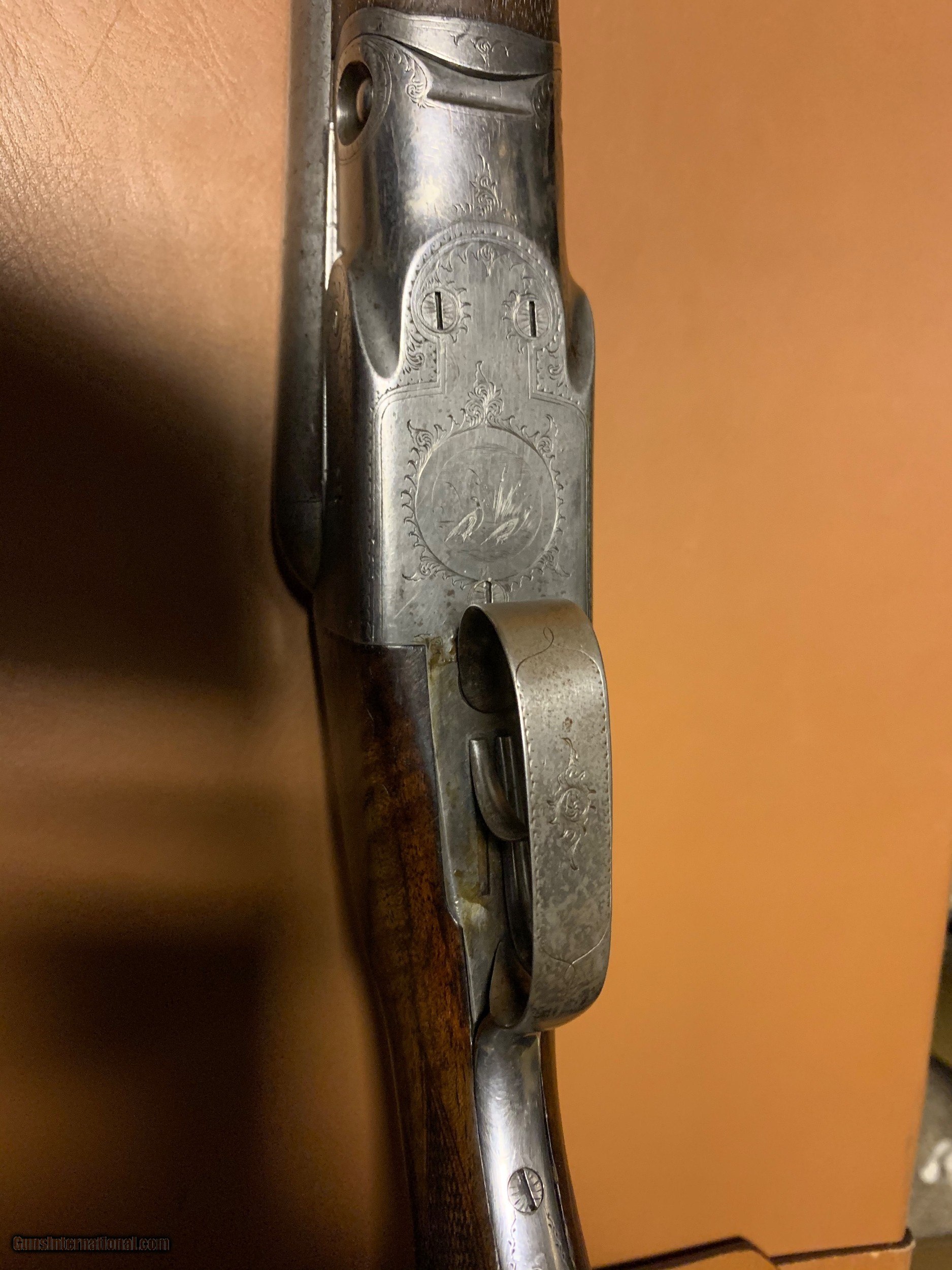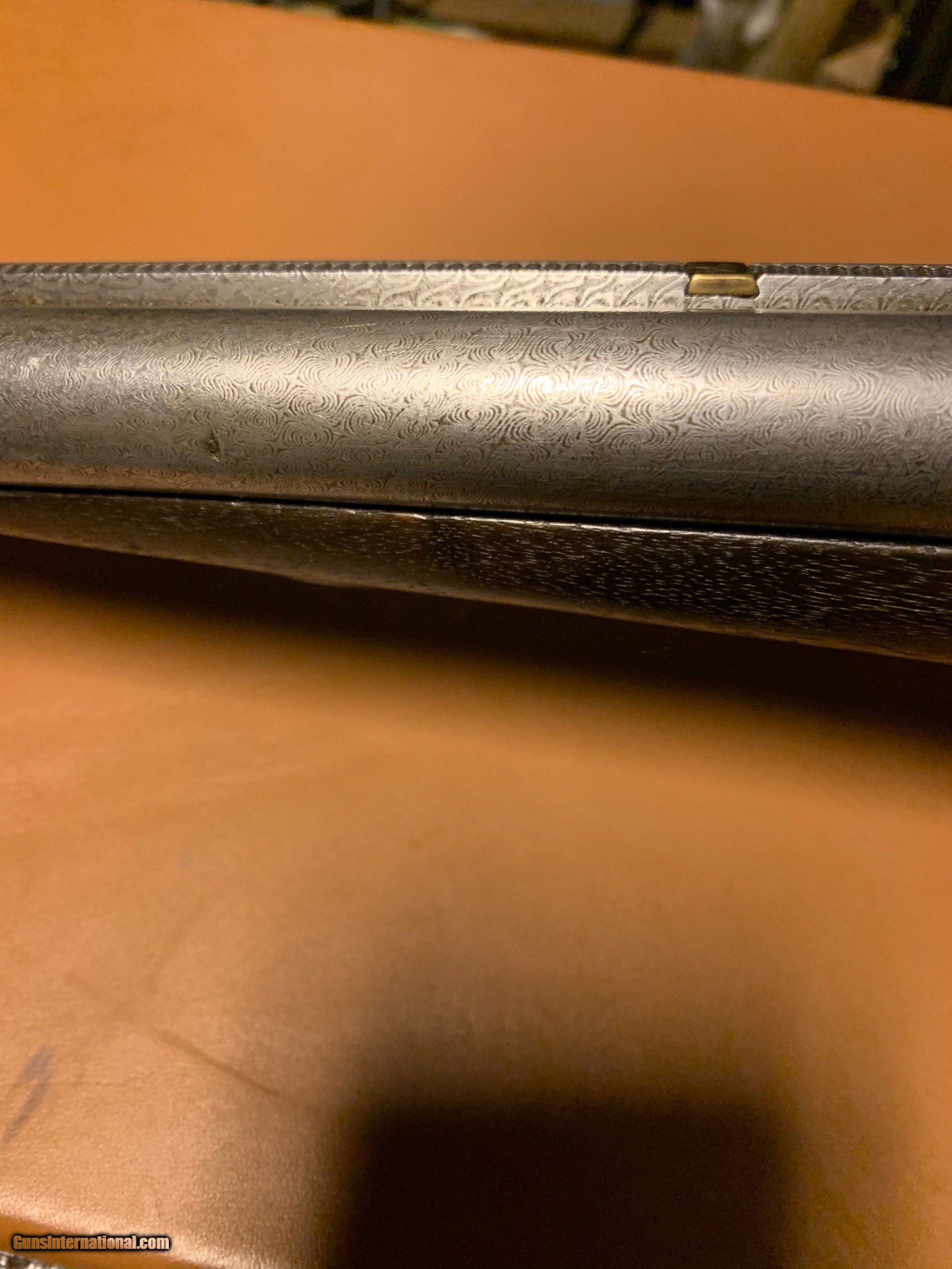 Description: GH Parker with 2 sets of barrels, both original to gun. Original set was 32 but is now 30", still has over .30 thousands choke in each barrel. Second set was added about 10 years later as shown in the letter. They are 30" uncut and have full and full, .35 thousands in each barrel. Set 1 Is slightly lose without the forearm but lock up tight with no movement when the forearm is on. No dents in this set set 2 is slightly loose without the forearm and with the forearm on is still very slightly lose. This set as seen in the picture has a brass piece dovetailed into the rib, and slightly to the left of there is a profound dent in the left barrel and is also visible on the inside of the barrel Good wall thickness is both sets I have shoot both sets of barrels with low pressure loads, still they should be checked out by a confident gunsmith. Very little if any pitting in the barrels 14 1/4" Lop drops are 1 7/8" and 3 3/8" Buyer will pay actual shipping charges SOLD Curio/Relic: Yes |