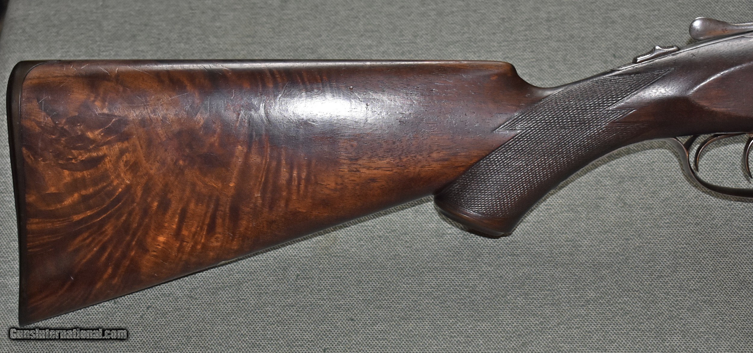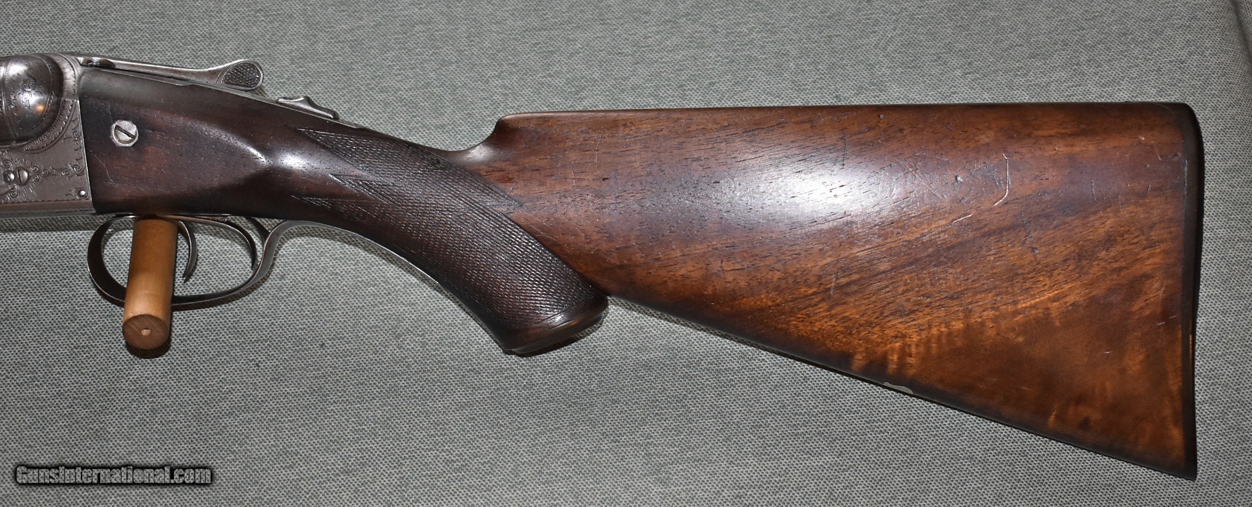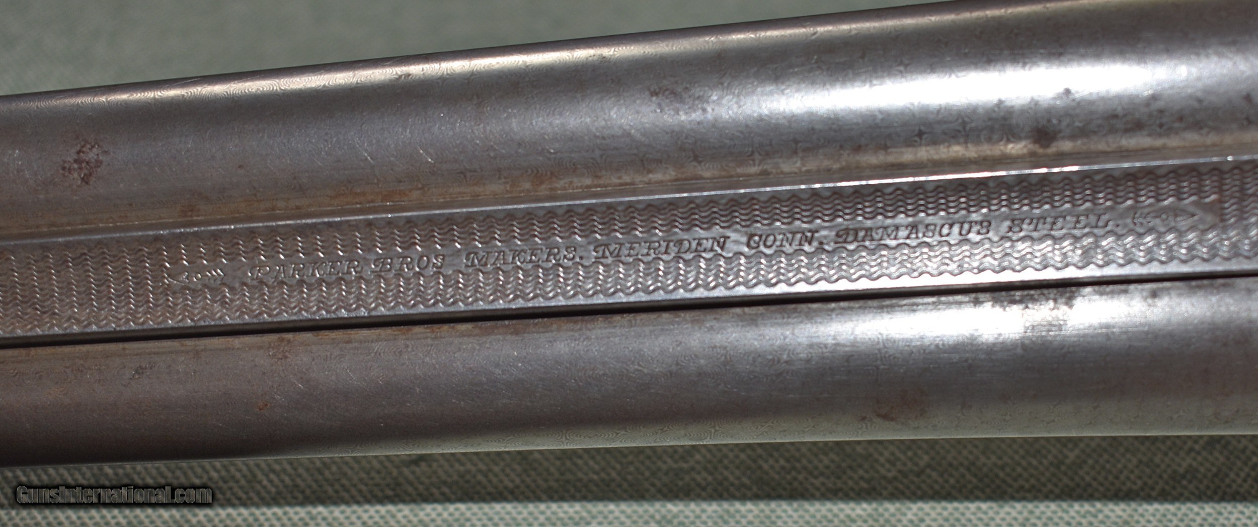Description: Parker Bros. 12 gauge GH grade built in 1903. This gun has 30" damascus barrels with excellent bores and wall thickness. The barrels are choked full and full. The gun retains traces of the case color and 60% of the damascus finish. The barrels are on face. The stock has been professionally repaired. It retains the original dogs head buttplate. Built on a #2 frame. C&R eligible. SOLD Curio/Relic: Yes Shotgun Gauge: 12 Gauge Manufacturer: Parker Bros. Model: GH Serial Number: 122073 Barrel Length: 30 Chambers: 25/8 Ejectors: extractors Condition: very good Metal Condition: very good Wood Condition: very good Bore Condition: excellent Barrel Type: damascus steel Action: double barrel Triggers: double Butt Pad: Factory Dog's Head Buttplate Manufacture Date: 1903 Choke Left: full Choke Right: full |