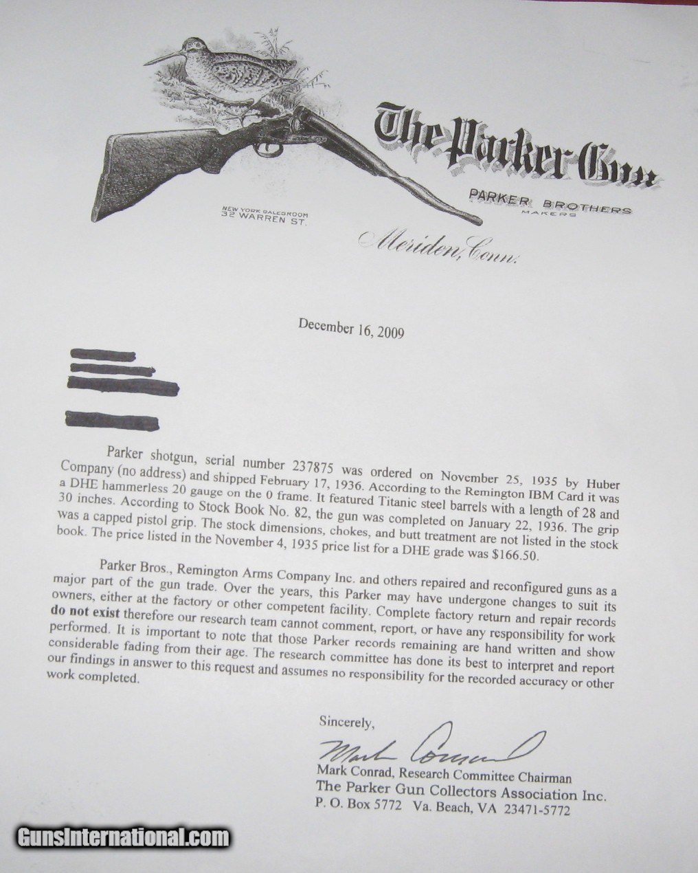 Description: Parker 20 gauge DHE grade factory 2 barrel set.Built in 1936 according to the factory letter.This gun has 28" titanic steel barrels choked improved cylinder .007" and improved cylinder .007" and 30" titanic steel barrels choked skeet .003" and modified .016".The straight grip stock has a 143/4"LOP over a skeleton steel buttplate.The gun is in excellent all original condition retaining 40% of the original case colors,98% of the original wood finish,and 98% of the original blue on each barrel set.The forend is a factory beavertail that fits both barrels.This is a very unusual gun that would make a great upland bird gun or a fine addition to any Parker collection.It comes cased in a 2 barrel leg-0-mutton case.C&R eligible. SOLD Curio/Relic: Yes Manufacturer: Parker Model: DHE Serial Number: 237875 Chambers: 23/4 Ejectors: yes Metal Condition: excellent Wood Condition: excellent Bore Condition: mint Barrel Type: Titanic steel Action: double barrel Triggers: Double Gauge Info: 20ga Stock Dimensions: 143/4"x15/8"x21/2 Butt Pad: skeleton buttplate Manufacture Date: 1936 |