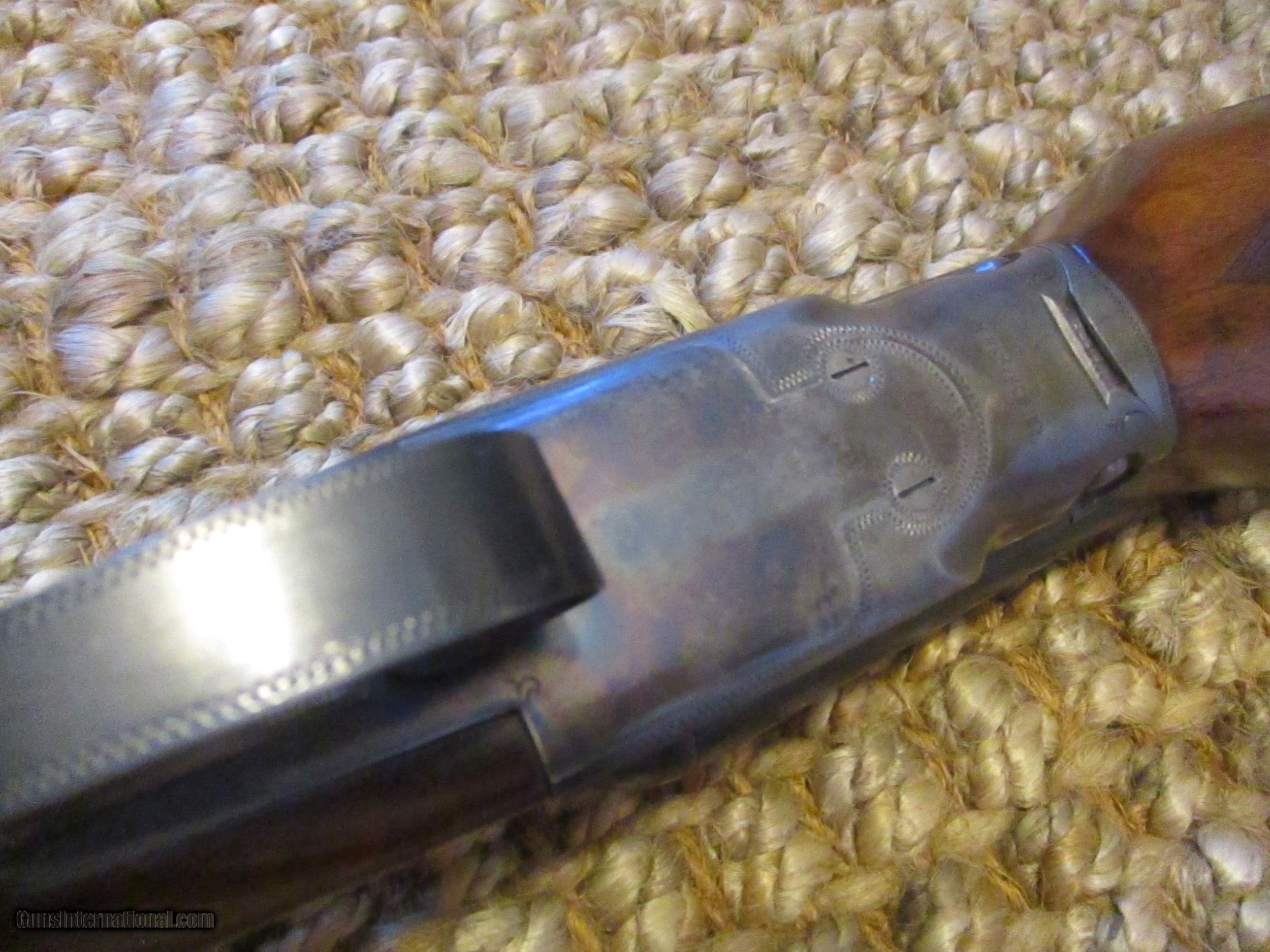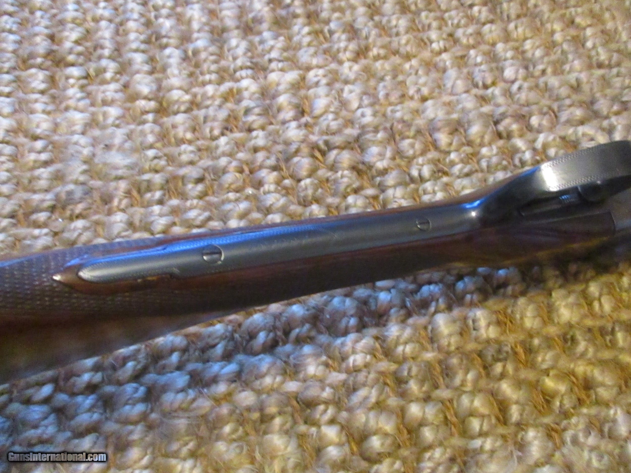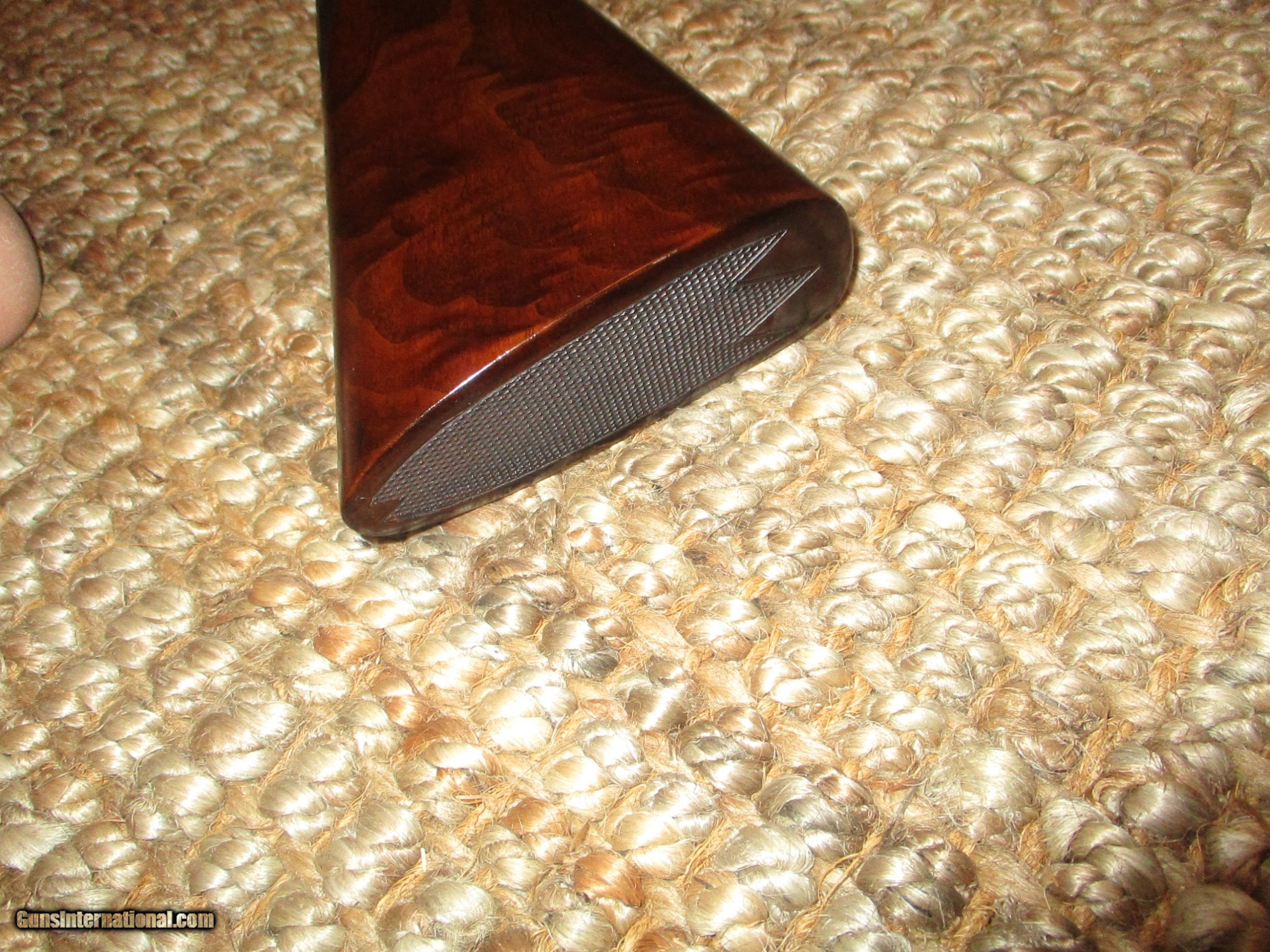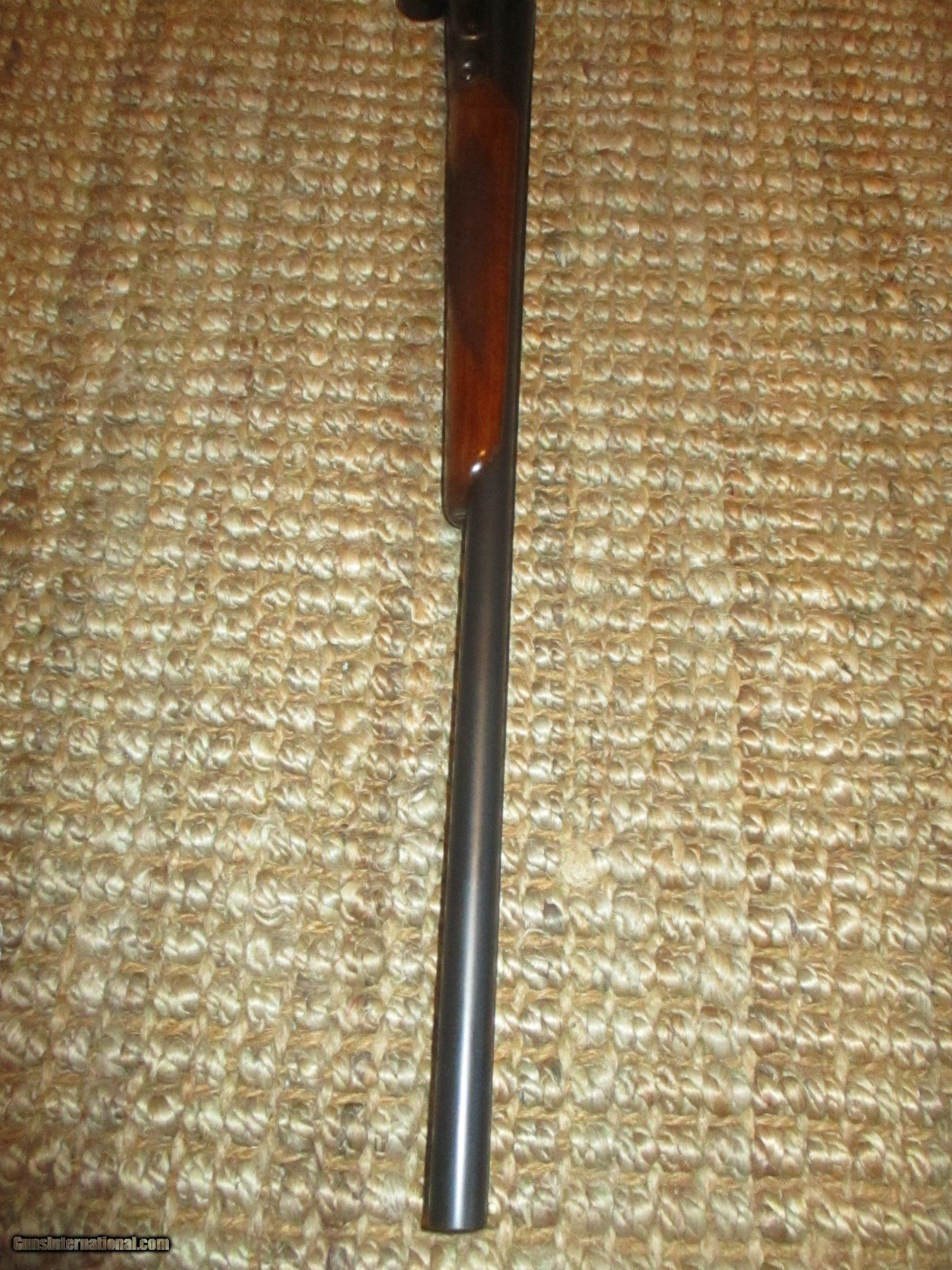 Description: 26" M/IC, Vulcan steel bbls., twin ivories, checkered med. rib, factory single select trigger, ejectors, American select eastern walnut, checkered straight stock, checkered butt, beavertail forearm, 65%-70% solidly covered case color, 14 1/8" LOP over checkered butt, 1 1/2" DAC - 2 3/8" DAH, 7lbs., 95% OA with only minor handling, a very scarce original skeet grade gun ready for use! SOLD |