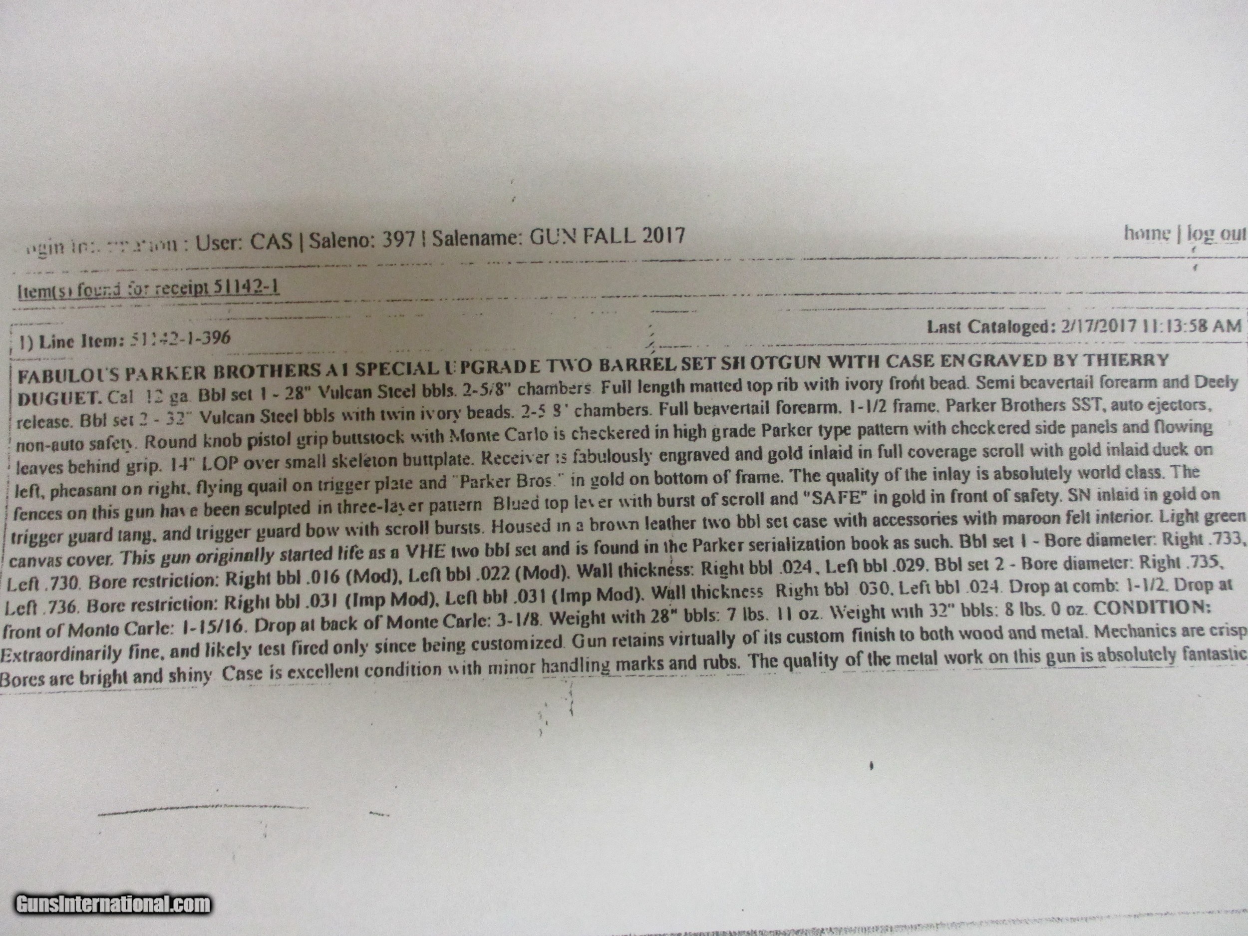 Description: CONSIGNMENT CONDITION IS ABOUT 95% PARKER A1 SPECIAL UPGRADE 2 BARREL SET 12 GAUGE -- 28" BARREL & 32" BARREL -- HIGH GRADE STOCK SEE FULL DESCRIPTION IN PHOTOS BELOW -- MADE IN 1934 WITH HARD CASE PRICE INCLUDES SHIPPING AND INSURANCE ****PLEASE CALL IN THE WITH THE SELLER’S INVENTORY NUMBER IF INQUIRING ABOUT A FIREARM****** WE DO NOT SHIP FIREARMS AND/OR FIREARMS’ PARTS OUT OF THE 50 UNITED STATES, SO DON’T ASK—YOU NEED TO KNOW IF FIREARM IS LEGAL FOR YOUR STATE PRICE REFLECTS PAYMENT BY MONEY ORDER / CASHIERS CHECK. A 3% PREMIUM IS ADDED FOR CREDIT CARDS. WE DO ACCEPT PERSONAL OR BUSINESS CHECKS, BUT THERE IS A GRACE PERIOD OF 10 BUSINESSS DAYS ON THEM. Shipping is $40 for handgun and $30 for long gun. Shipping to Alaska and Hawaii will be more based on weight of firearm. USPS SHIPPING IS HIGHER. WE DO OFFER LAYAWAY PLANS FOR 30,60, OR 90 DAYS. THERE IS A $5.00 CHARGE FOR EVERY 30 DAYS ITEM IS ON LAYAWAY. WE ALSO REQUIRE A 20% DOWN PAYMENT ON TOTAL OF LAYAWAY SALE. LAYAWAYS ARE NON- REFUNDABLE. HERE IS HOW THIS PROCESS WORKS. YOU WOULD CALL US AT 540-337-9218 WITH LISTER # TO PURCHASE THE GUN. THEN ONCE I HAVE RECEIVED PAYMENT AND AN FFL (FEDERAL FIREARMS LICENSE) FROM A LICENSED DEALER IN YOUR AREA OF YOUR CHOICE. WE WILL THEN SHIP THE GUN TO THEM. YOU WOULD THEN PICK UP THE GUN AT YOUR LOCAL DEALER AND DO PAPER WORK THERE. Please have your FFL Dealers contact information when you call. DOMINION OUTDOORS 15 ANGELA COURT FISHERSVILLE, VA 22939 540-337-9218 540-337-2422 fax M – F 9 a.m. to 6 p.m. ETZ Sat 9 a.m. to 4 p.m. ETZ ****PLEASE CALL IN THE WITH THE SELLER’S INVENTORY NUMBER**** ***PLANO SINGLE RIFLE HARD CASES AVAIABLE FOR PURCHASE $25.00 WITH THE PURCHASE OF A FIREARM** *** Online prices compared to in store prices will vary. *** SOLD |
