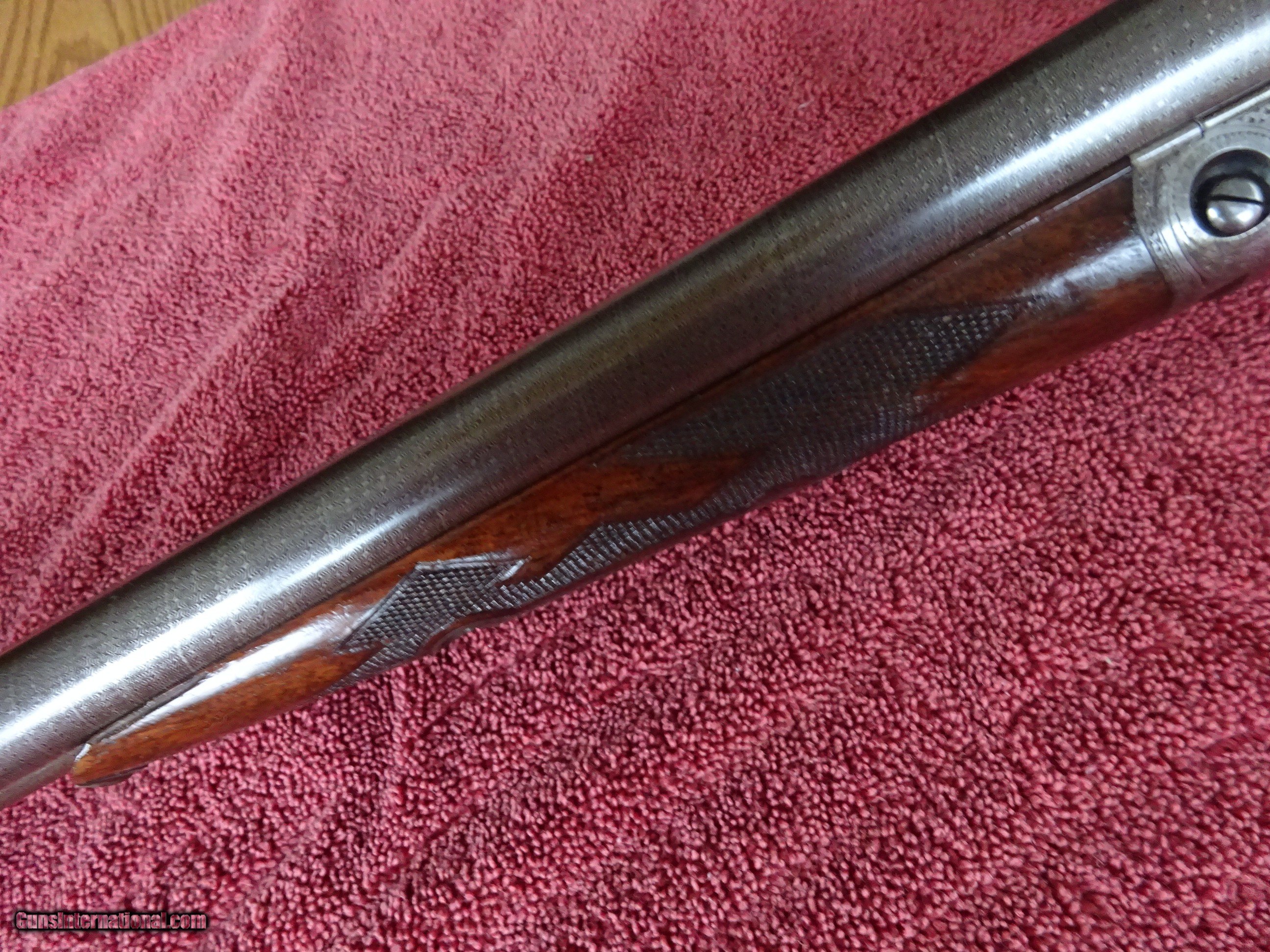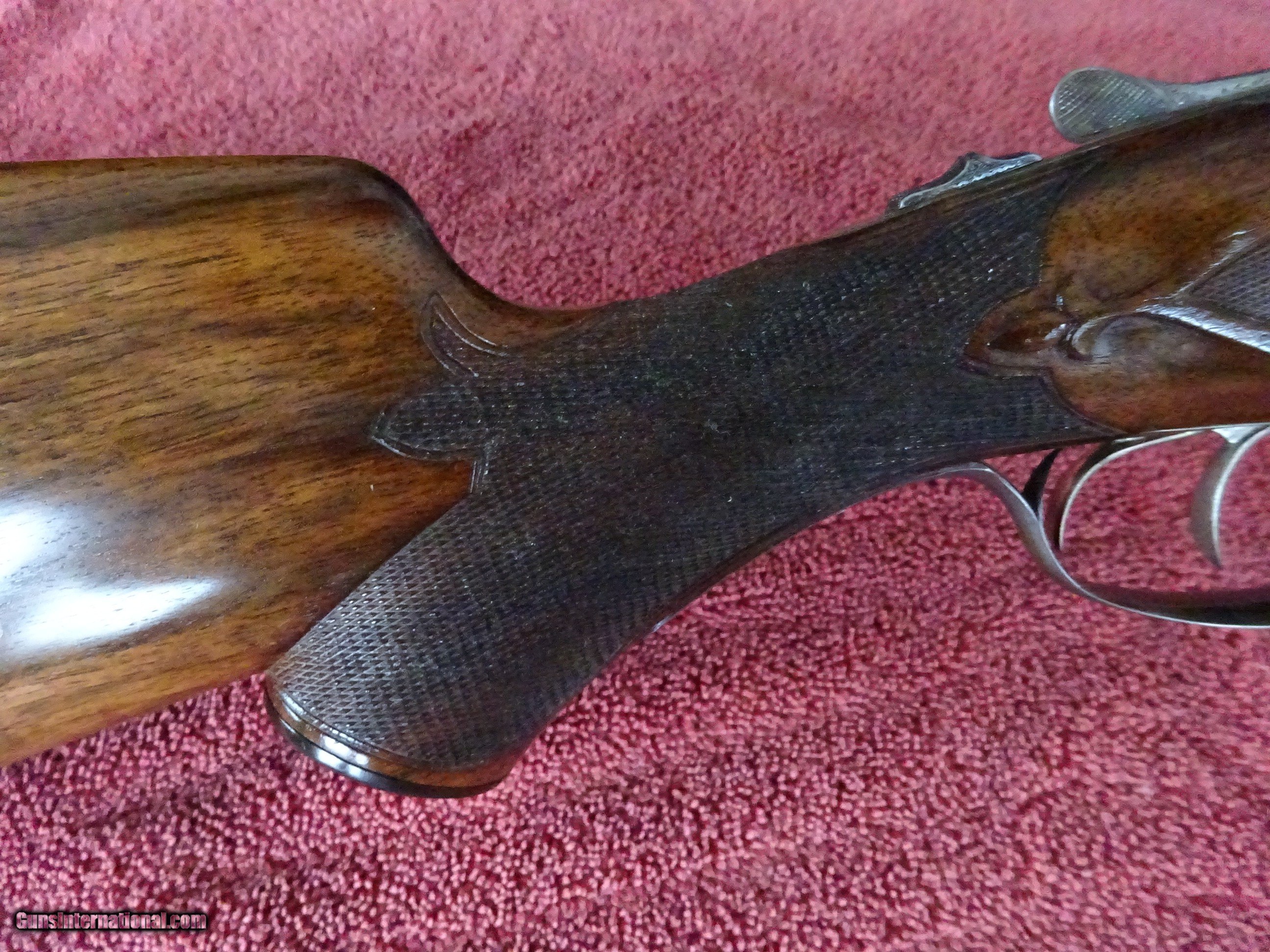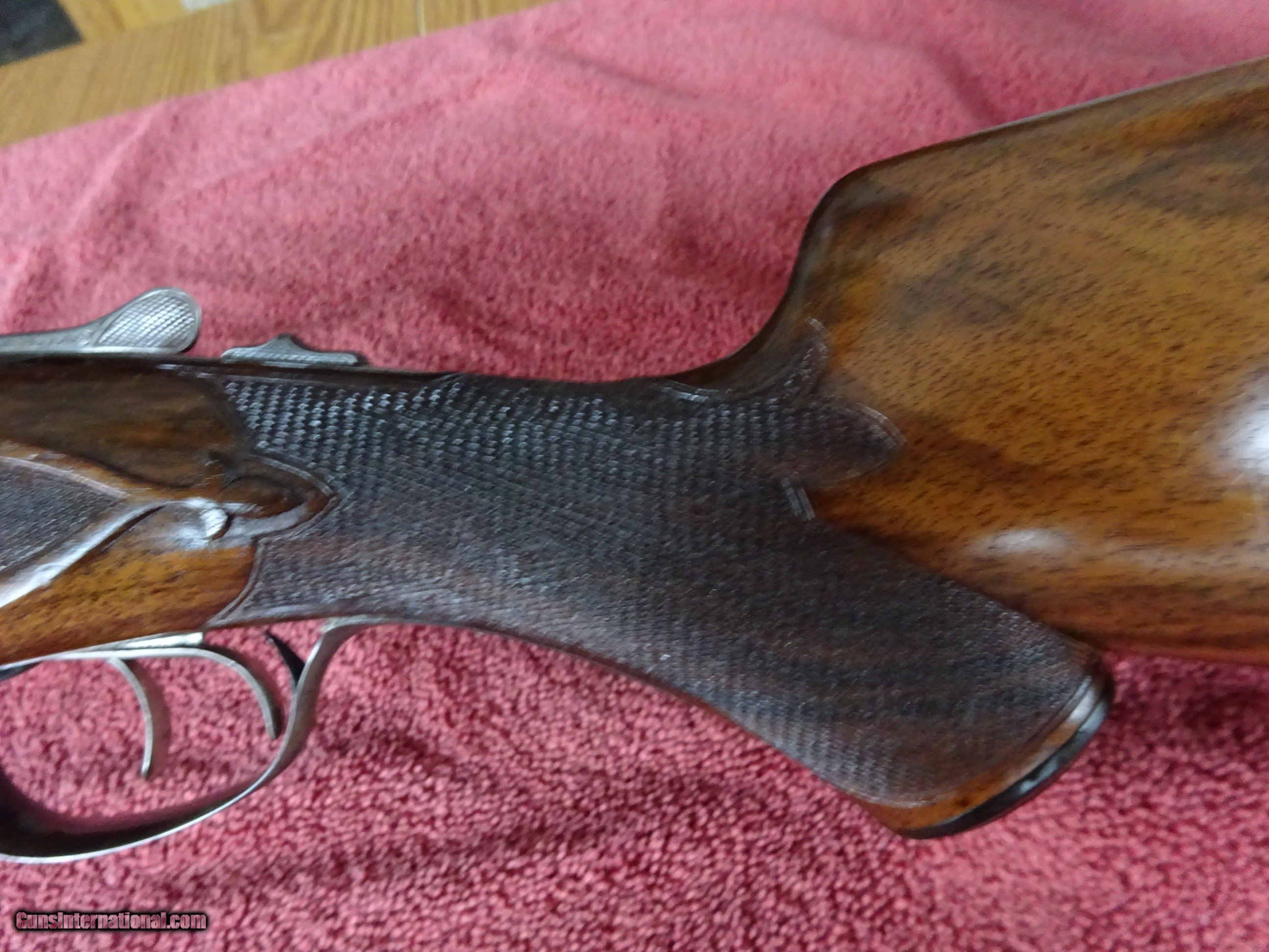 Description: PARKER BH GRADE 12 GAUGE, DAMASCUS STEEL 30" BARRELS, FINE CHAIN LINK PATTERN, 100% COVERAGE, EXTRACTORS, MODIFIED AND FULL, MIRROR BRIGHT BORES, NO DENTS OR DINGS. TWIN IVORY SIGHTS, BARRELS RING LIKE A BELL. NUMBER TWO FRAME, CASE COLOR IN THE PROTECTED AREAS, ATTRACTIVE ENGRAVING, PAIR OF ENGLISH SETTERS IN A NON-TYPICAL POSTURE ON THE RIGHT SIDE, PAIR OF ENGLISH POINTERS IN A NORMAL POSTURE ON THE LEFT SIDE, A FOX FLUSHING THREE GAME BIRDS ON THE FLOOR PLATE. "PARKER BROS" ON A RIBBON ON BOTH SIDES PLUS NICELY CUT ACANTHUS SCROLLWORK AND INTRICATE BORDERS. EXCELLENT ENGRAVED SCREWS, AUTO-SAFETY. TIGHT ON FACE. MONTE CARLO PISTOL GRIP STOCK, ENGLISH WALNUT WITH BLACK STREAKS. FINE FLUER DI LIS PATTERN CHECKERING, SIDE PANELS HAVE EXTREMELY FINE CHECKERING. ENGRAVED GOLD GRIP CAP, SILVERS SOLID PAD. EXCELLENT WOOD AND OIL FINISH, 1 3/8" DROP AT THE COMB, 14 3/8" LENGTH OF PULL, 7 POUNDS 15 OUNCES, VERY SHOOTABLE PARKER. GREAT VINTAGERS SPORTING CLAYS GUN. MADE IN 1903, VERY PLEASING CONDITION. $5500.00 + $70.00 Insured shipping to an FFL address. Layaway is available. See all Pats gun listings on this site! We also have hundreds of ORIGINAL gun company advertising & memorabilia pieces available for sale on our site SPORTINGCOLLECTIBLES. We have no reprints or reproductions. Email for more information. If you need to call, morning or evening is best, and please note the Seller's Inventory number. SOLD Curio/Relic: Yes |
