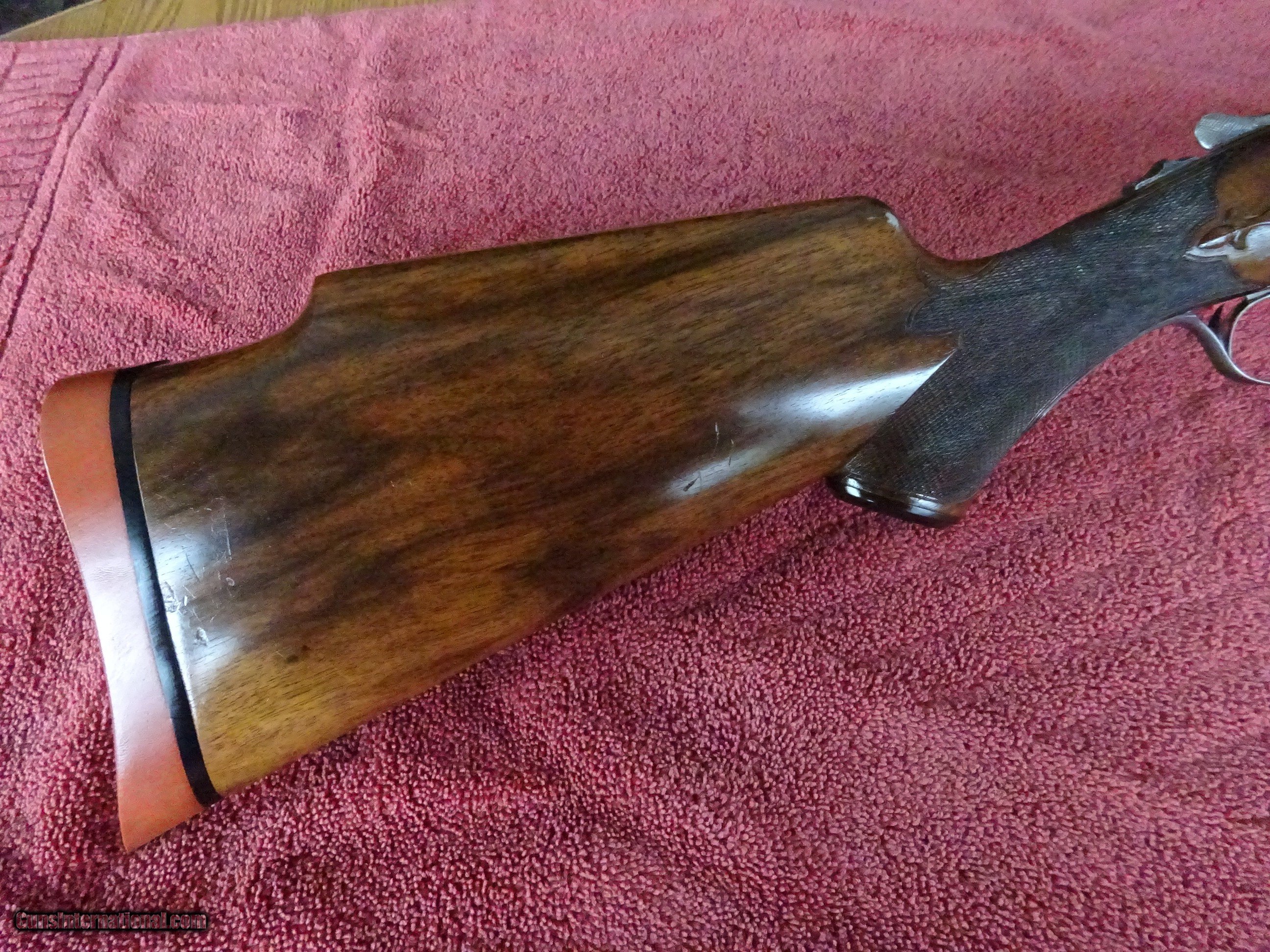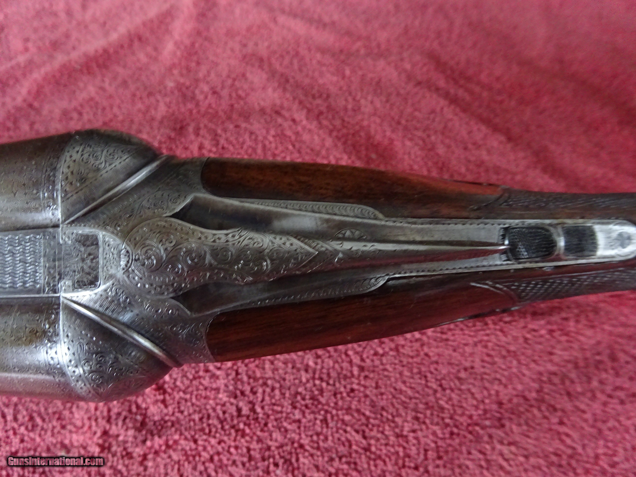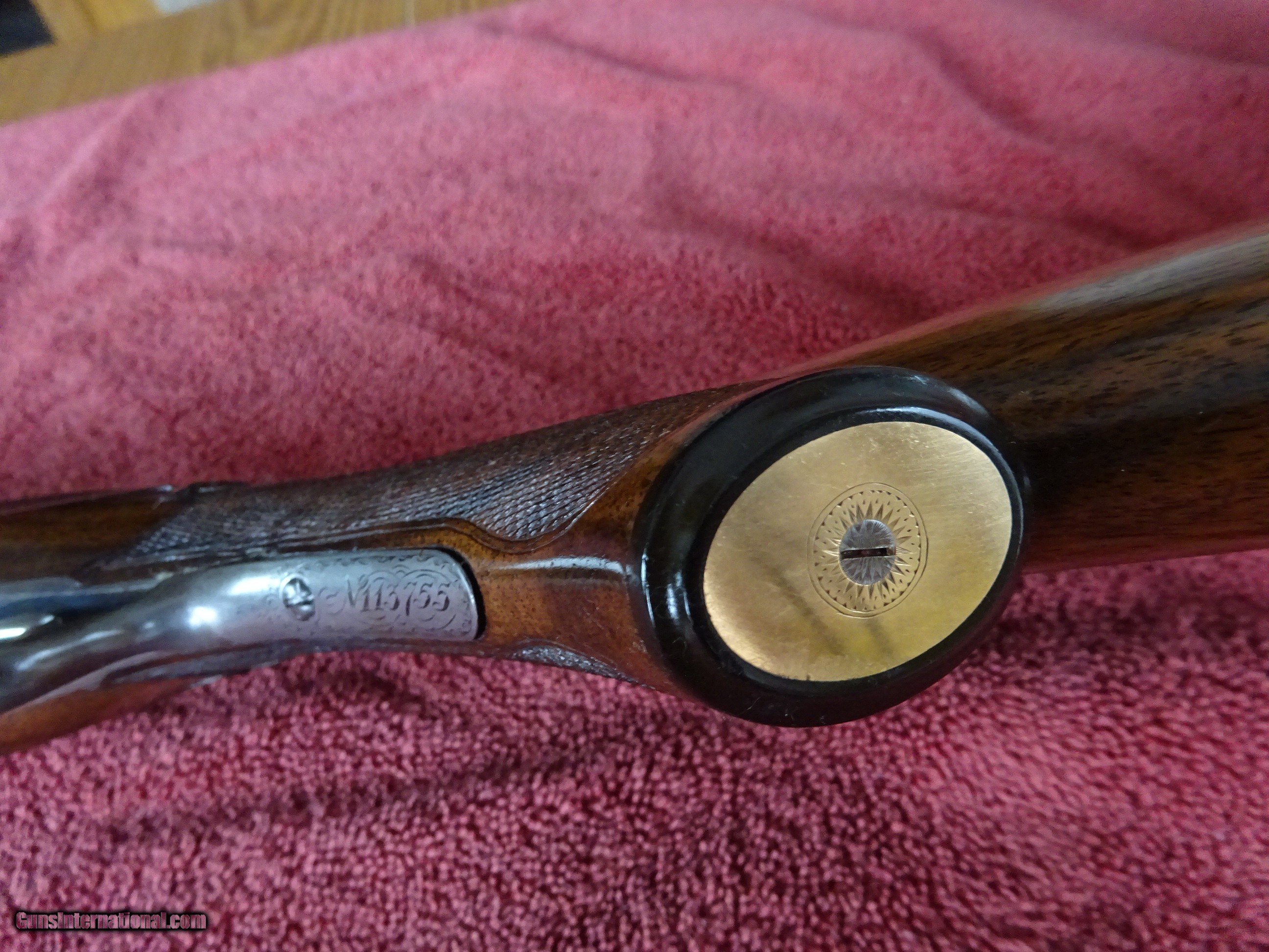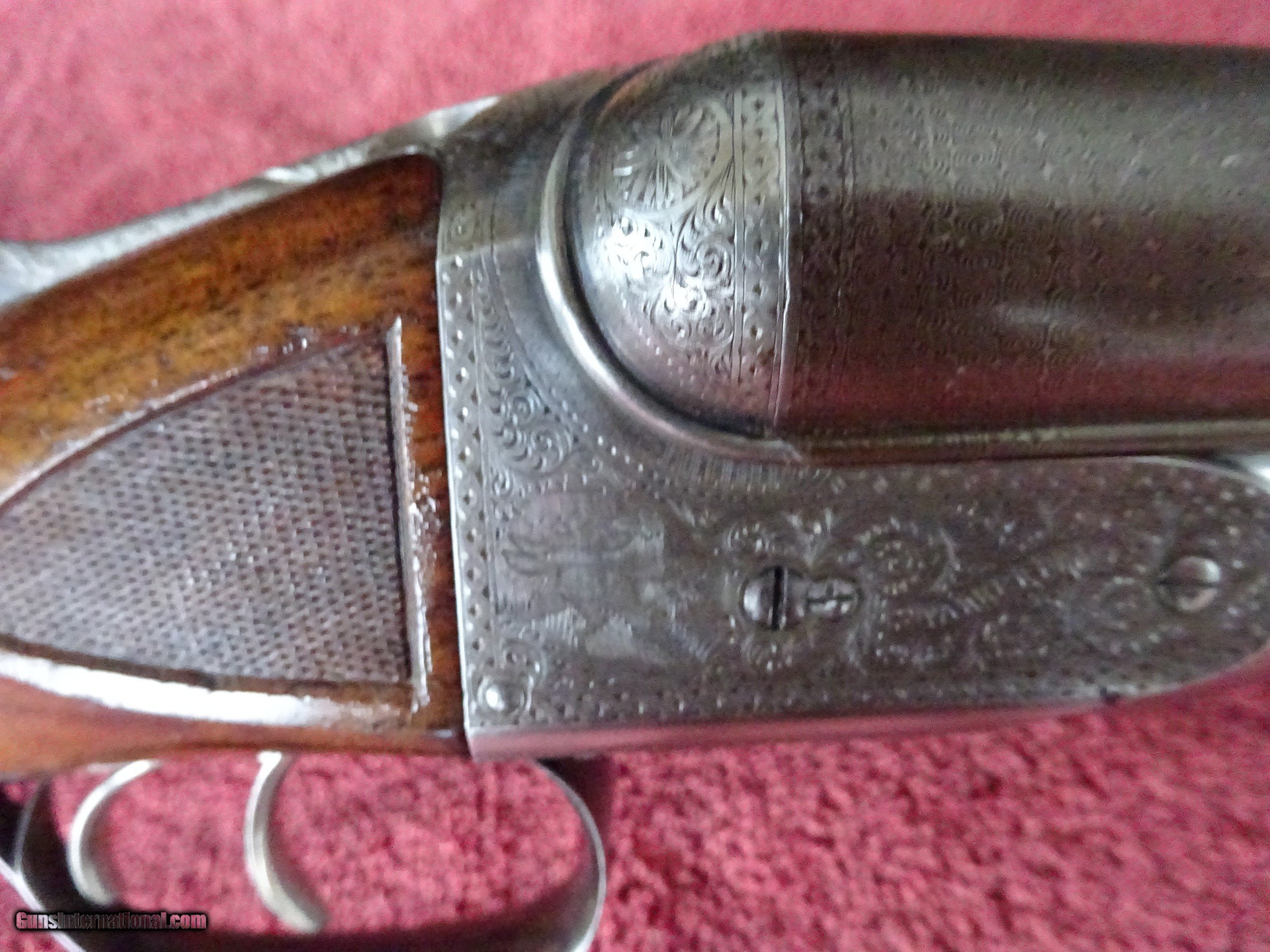 Description: PARKER BH GRADE 12 GAUGE, DAMASCUS STEEL 30" BARRELS, FINE CHAIN LINK PATTERN, 100% COVERAGE, EXTRACTORS, MODIFIED AND FULL, MIRROR BRIGHT BORES, NO DENTS OR DINGS. TWIN IVORY SIGHTS, BARRELS RING LIKE A BELL. NUMBER TWO FRAME, CASE COLOR IN THE PROTECTED AREAS, ATTRACTIVE ENGRAVING, PAIR OF ENGLISH SETTERS IN A NON-TYPICAL POSTURE ON THE RIGHT SIDE, PAIR OF ENGLISH POINTERS IN A NORMAL POSTURE ON THE LEFT SIDE, A FOX FLUSHING THREE GAME BIRDS ON THE FLOOR PLATE. "PARKER BROS" ON A RIBBON ON BOTH SIDES PLUS NICELY CUT ACANTHUS SCROLLWORK AND INTRICATE BORDERS. EXCELLENT ENGRAVED SCREWS, AUTO-SAFETY. TIGHT ON FACE. MONTE CARLO PISTOL GRIP STOCK, ENGLISH WALNUT WITH BLACK STREAKS. FINE FLUER DI LIS PATTERN CHECKERING, SIDE PANELS HAVE EXTREMELY FINE CHECKERING. ENGRAVED GOLD GRIP CAP, SILVERS SOLID PAD. EXCELLENT WOOD AND OIL FINISH, 1 3/8" DROP AT THE COMB, 14 3/8" LENGTH OF PULL, 7 POUNDS 15 OUNCES, VERY SHOOTABLE PARKER. GREAT VINTAGERS SPORTING CLAYS GUN. MADE IN 1903, VERY PLEASING CONDITION. $5500.00 + $70.00 Insured shipping to an FFL address. Layaway is available. See all Pats gun listings on this site! We also have hundreds of ORIGINAL gun company advertising & memorabilia pieces available for sale on our site SPORTINGCOLLECTIBLES. We have no reprints or reproductions. Email for more information. If you need to call, morning or evening is best, and please note the Seller's Inventory number. SOLD Curio/Relic: Yes |