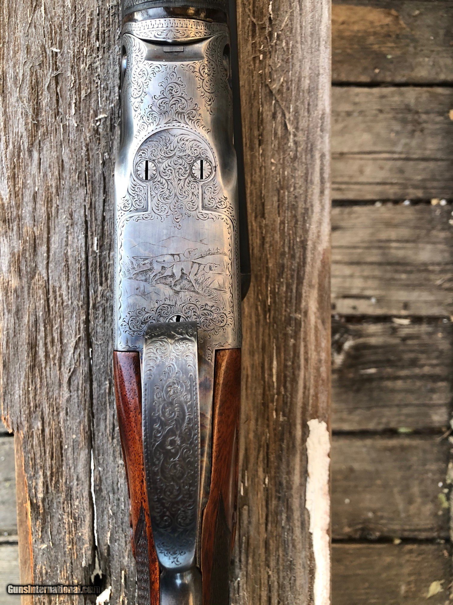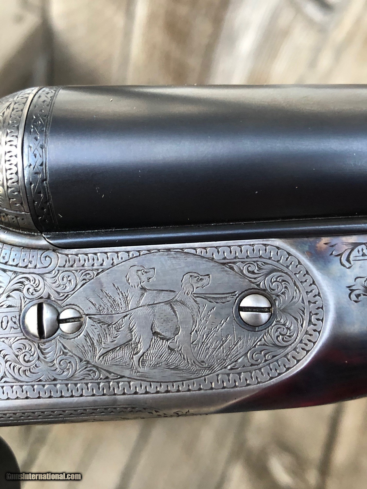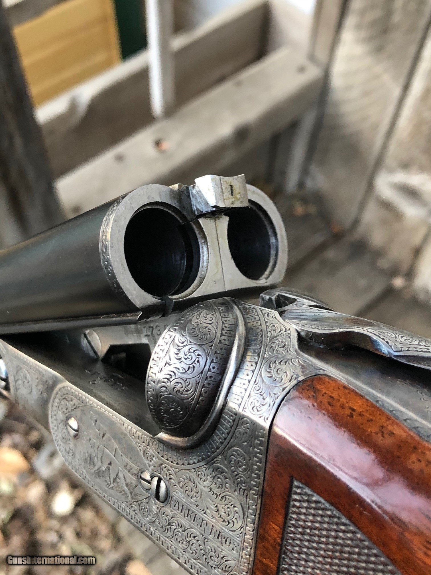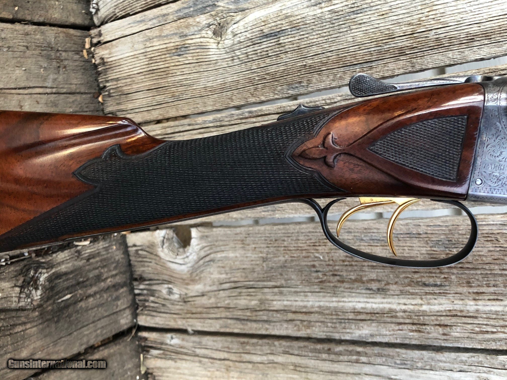 Description: Author Doug Stewart's Parker BHE 20 gauge. This beautiful Parker is featured on pages 158, 159, and 160 of his book "The Traditional Side by Side". This iconic gun is also featured on the front cover of his second book. DESCRIPTION: Parker BHE 20 gauge was made in 1916. The little Parker has 28" bbls, light mod and improved mod (.012/.016) 2 1/2" chambers. Straight stock 1 5/8 x 2 5/8 x 14 1/4 slight cast off. The gun has the most desirable features: straight, highly figured French walnut stock; gold plated triggers, fully checkered splinter forearm; classic dog scenes; light weight (5lbs 11 oz.). The gun is tight as new with 70% case colors and perfect finishes from Turnbull Restorations. Own one of Doug Stewarts classic Parkers! RARE-find another one! Price is FIRM SOLD |