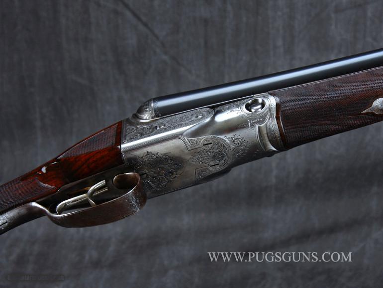 Description: This is a #2 frame gun built in 1904. The barrels are Titanic Steel and show strong, 90%+ bluing along the entire length. The bores are bright and shiny. Scant traces of color remain, with strongest showings on the water table, under the top lever, and in the vignette on the floor plate. The color is also strong in the metal mechanics of the forearm. Trigger guard color has browned to a warm patina. Unique and fine quality engraving is done in a floral theme, and is still crisp and raised to the touch. The wood is in good condition. The stock was apparently refinished at the time that a break at the wrist was repaired. All serial numbers are matching, and the action is nice and tight. The pistol grip is capped and inscribed "J. V. B. S. SOLD Curio/Relic: Yes Manufacturer: Parker Model: BHE Serial Number: 124XXX Ejectors: true Barrels: 30 in Barrel Type: Solid Rib Action: SxS Triggers: Double Triggers Gauge Info: 12 ga Stock: Highly Figured Wood Stock Comb: 1 9/16 in Stock Heel: 2 7/16 in Fore End: Splinter Forend Butt Pad: 7/8 in LOP: 14 1/16 in over a Pa Weight: 7 lbs 6 ozs |