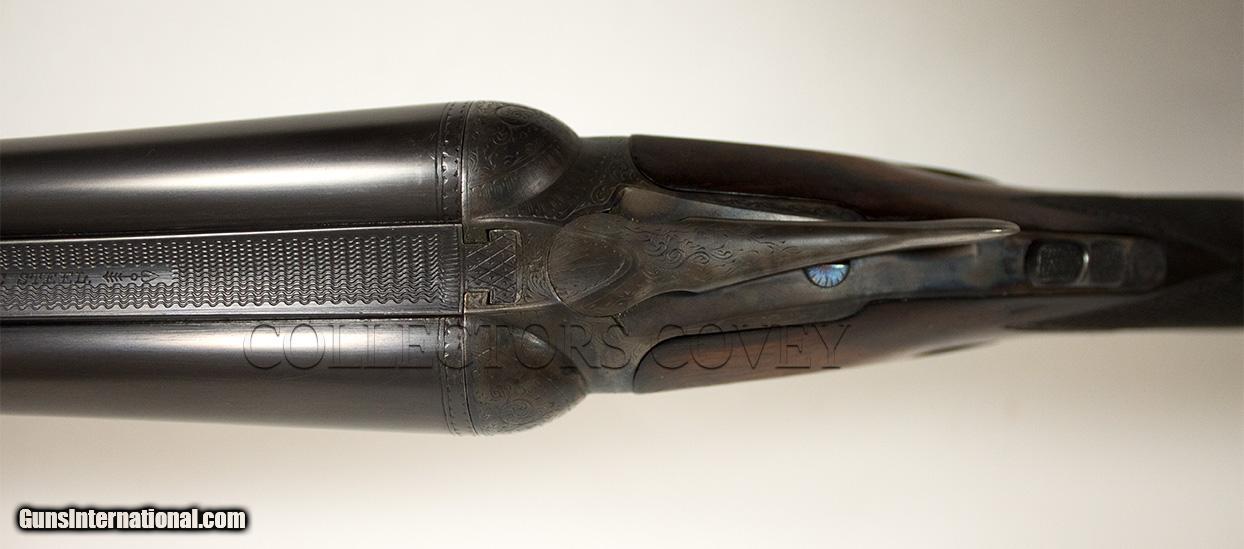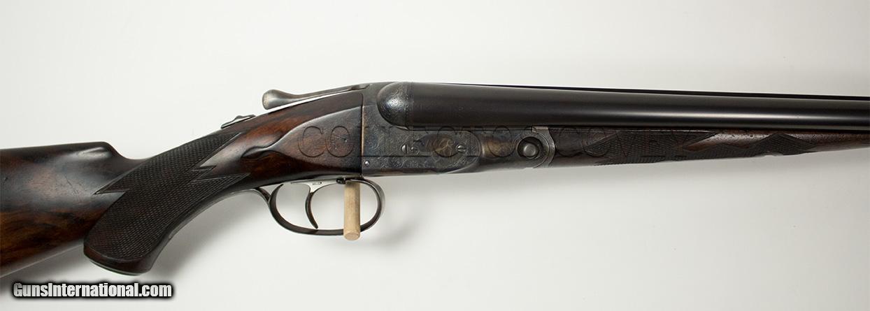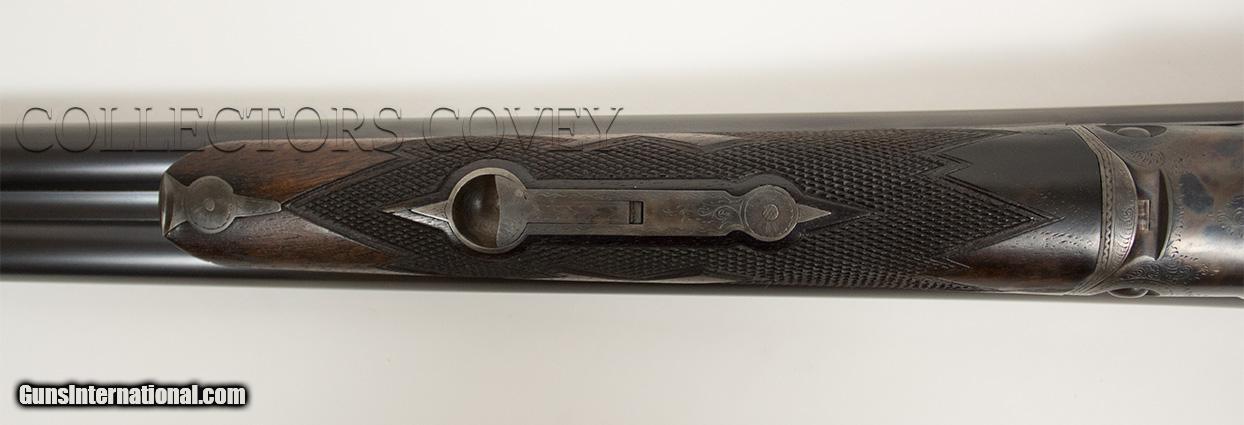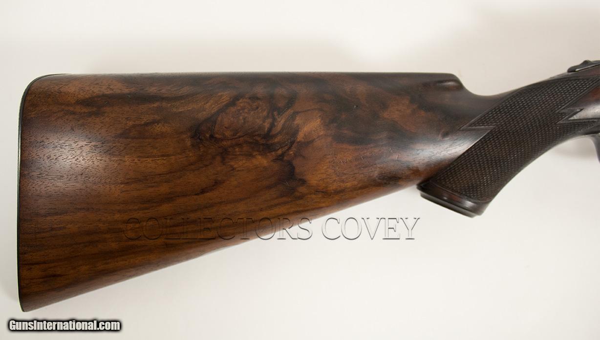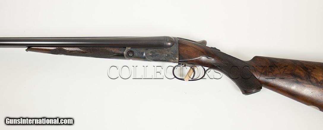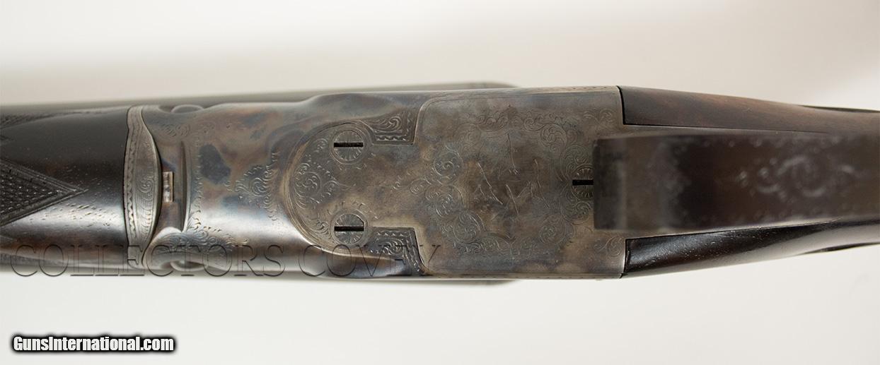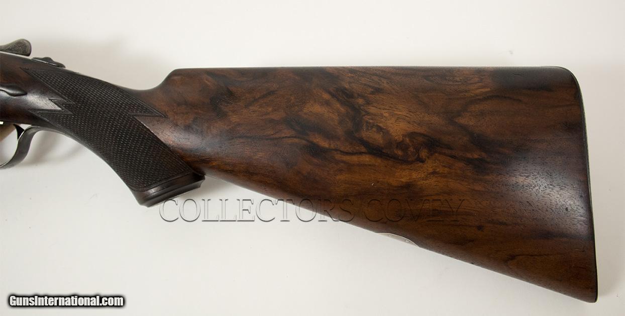 Description: Parker Bros DHE 20 gauge with Miller single trigger, skeleton buttplate, pistol grip, and splinter forearm. Bores are very good. Gun is overall in very good condition. Checkering is sharp and clean. Bluing is present and very clean. Condition: pre-owned Barrel length: 28" Length of pull: 14" Drop at comb: 1 1/2" Drop at heel: 2 1/4" Cast: 1/4" -on Weight: 6lb 8oz Right: .009" (improved cylinder) Left: .021" (improved modified) Wall thickness: .033"/.031" All pre-owned guns at Collectors Covey are subjected to our Ten Point Inspection, as follows: 1. Inspect all mechanical components for proper function 2. Complete dissassembly, strip clean, and lubrication as required 3. Measure chamber length 4. Measure choke constriction 5. Measure barrel wall thickness, verify integrity 6. Measure bore diameter 7. Measure stock dimensions 8. Verify action/barrel tightness 9. Verify integrity of barrel rib(s) 10. Verify mechanical integrity of buttstock and forearm SOLD |