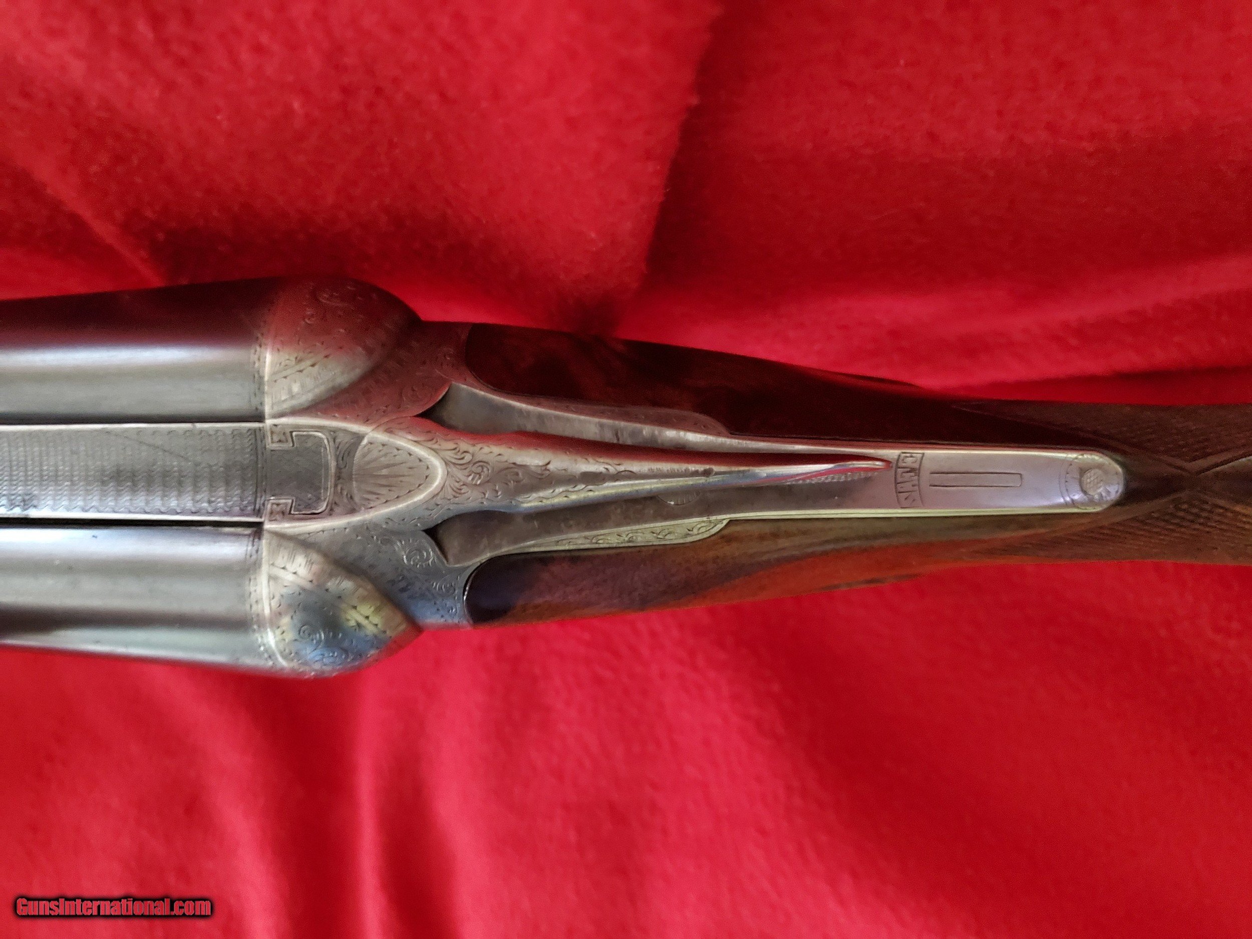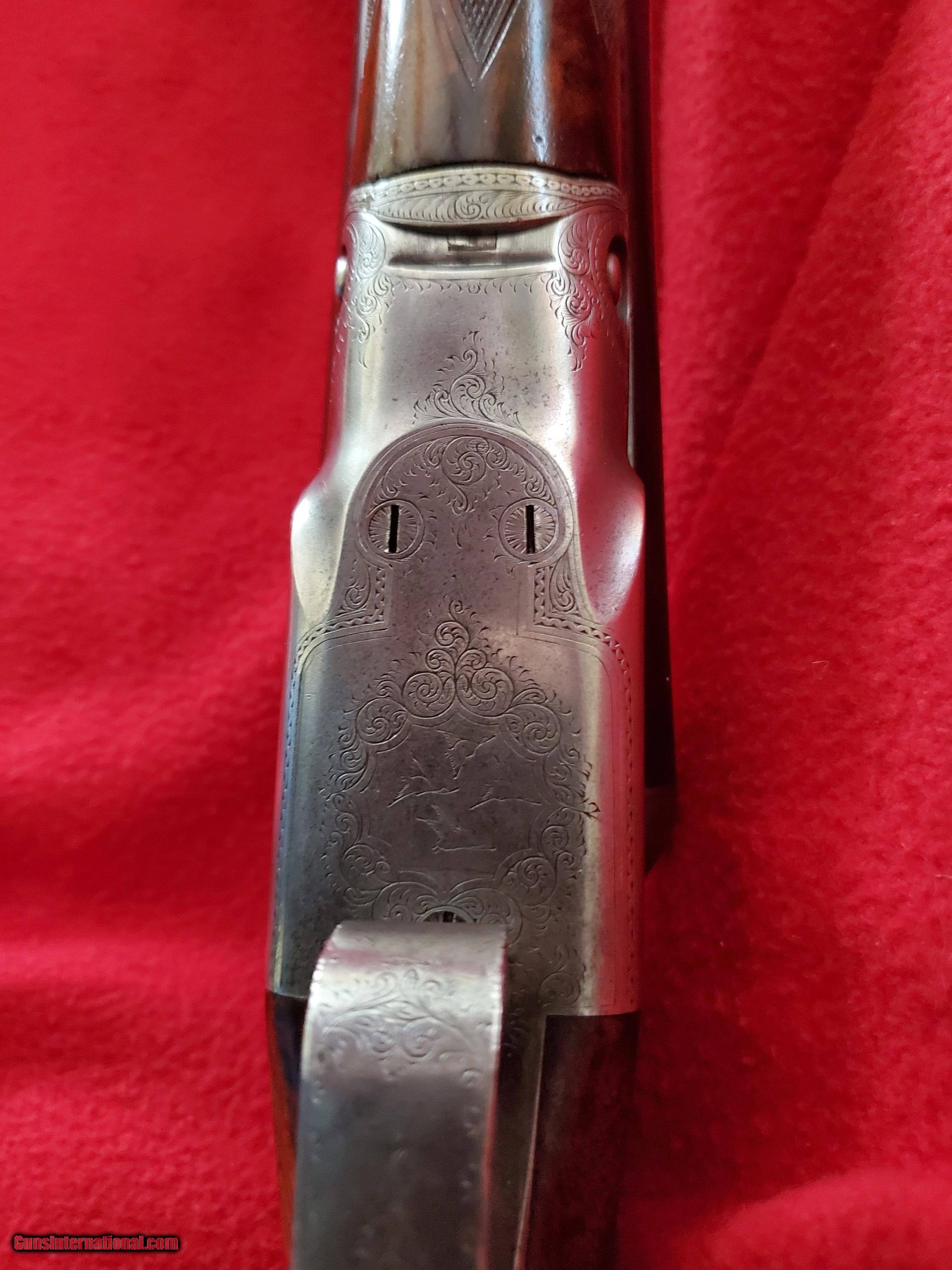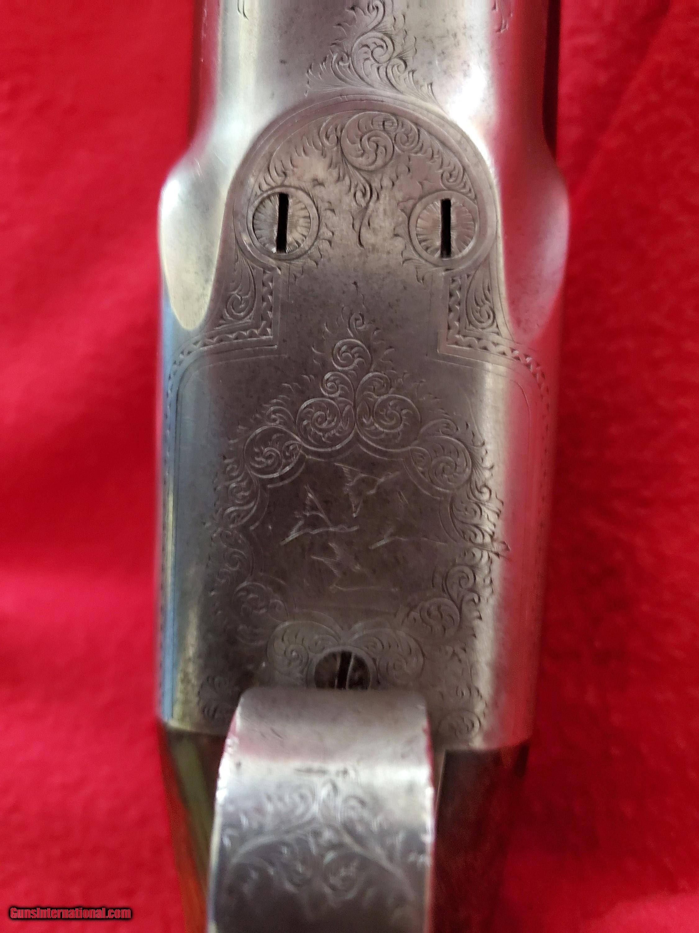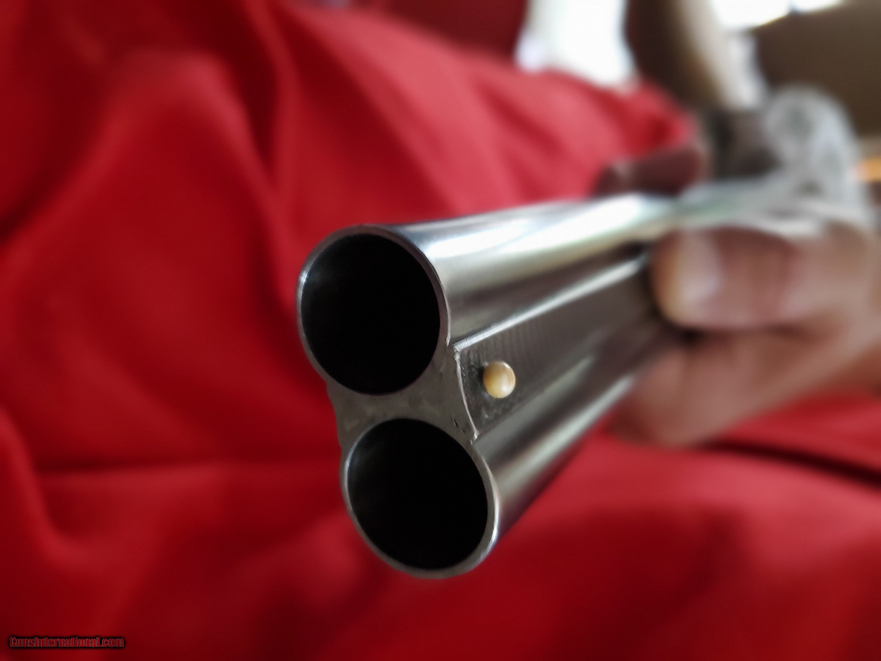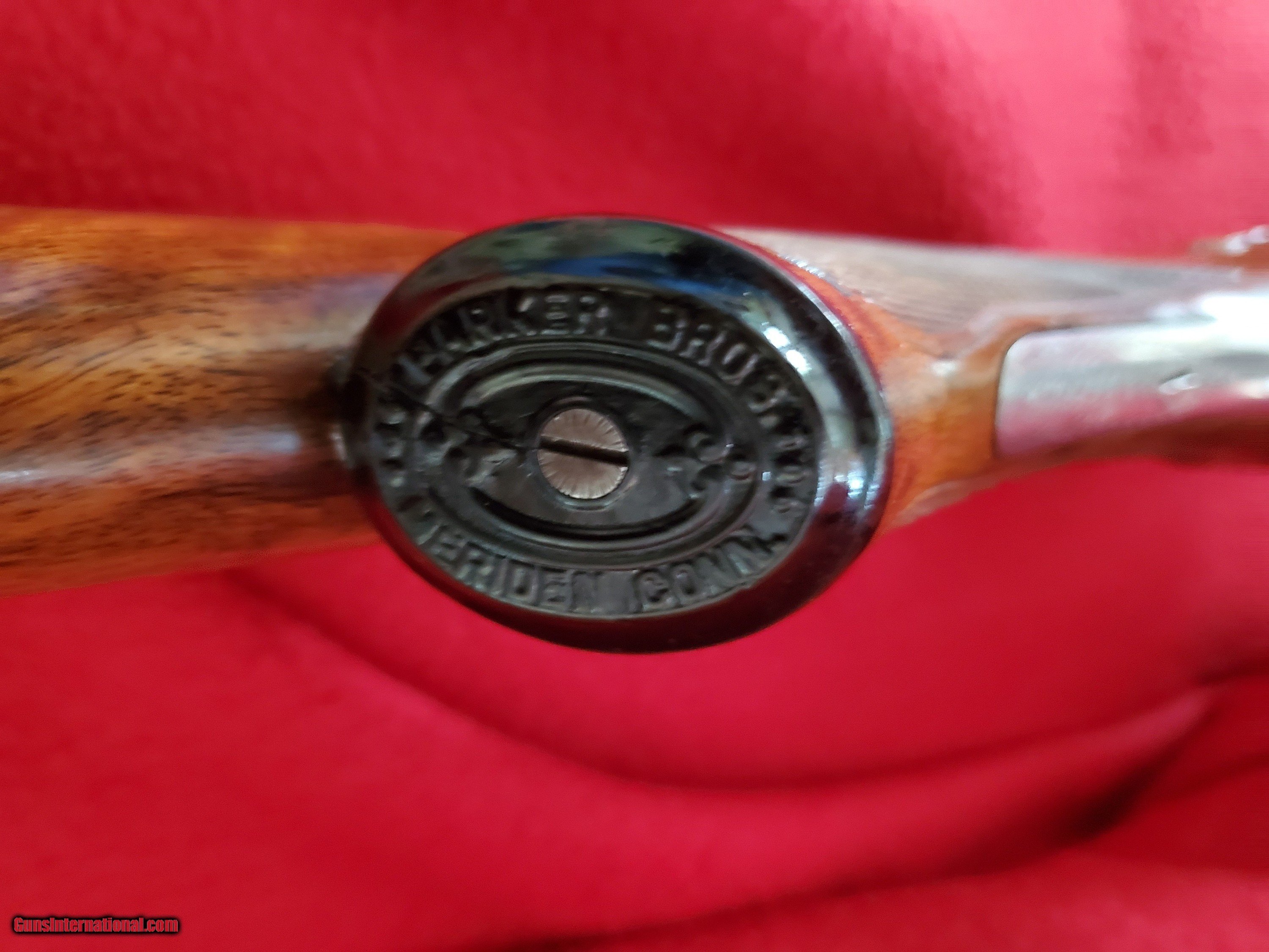 Description: Parker Bros , DHE. 32in Titanic Steel Barrels with mirror bores, no dents or dings - choked r-Mod, l-Full. SN 148,8XX (1908). 1 1/2 Frame size.. No Safety - a Live Pigeon Gun. This is very nice Parker DHE for the money and still has MANY years of life in this "Old Reliable". The Case harden colors are at about 50%. The engraving is still showing very well for its age. Note nearly each screw is still in time. This gun is a beautiful and sound example. The thumb latch is right of center. Very nice wood grain on buttstock has good dimensions: •14-1/4in LOP over a pad. •1-1/2in Drop Comb. •2- 1/4in Drop at Heel. •Cast as Neutral •7lbs. 6oz Gun Weight The checkering is still very nice. There is slight blue thinning at breach as shown in pictures and very faint at muzzle, but overall the barrels are quite nice and ring very true with mirror bores. No pitting or rust on this nice Parker. The Miller SST is very crisp. When fired and breached the ejectors are in time with strong ejectors.