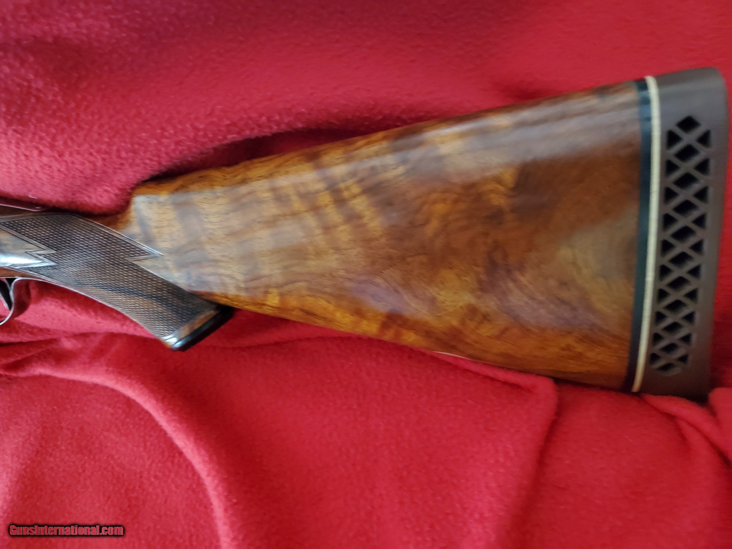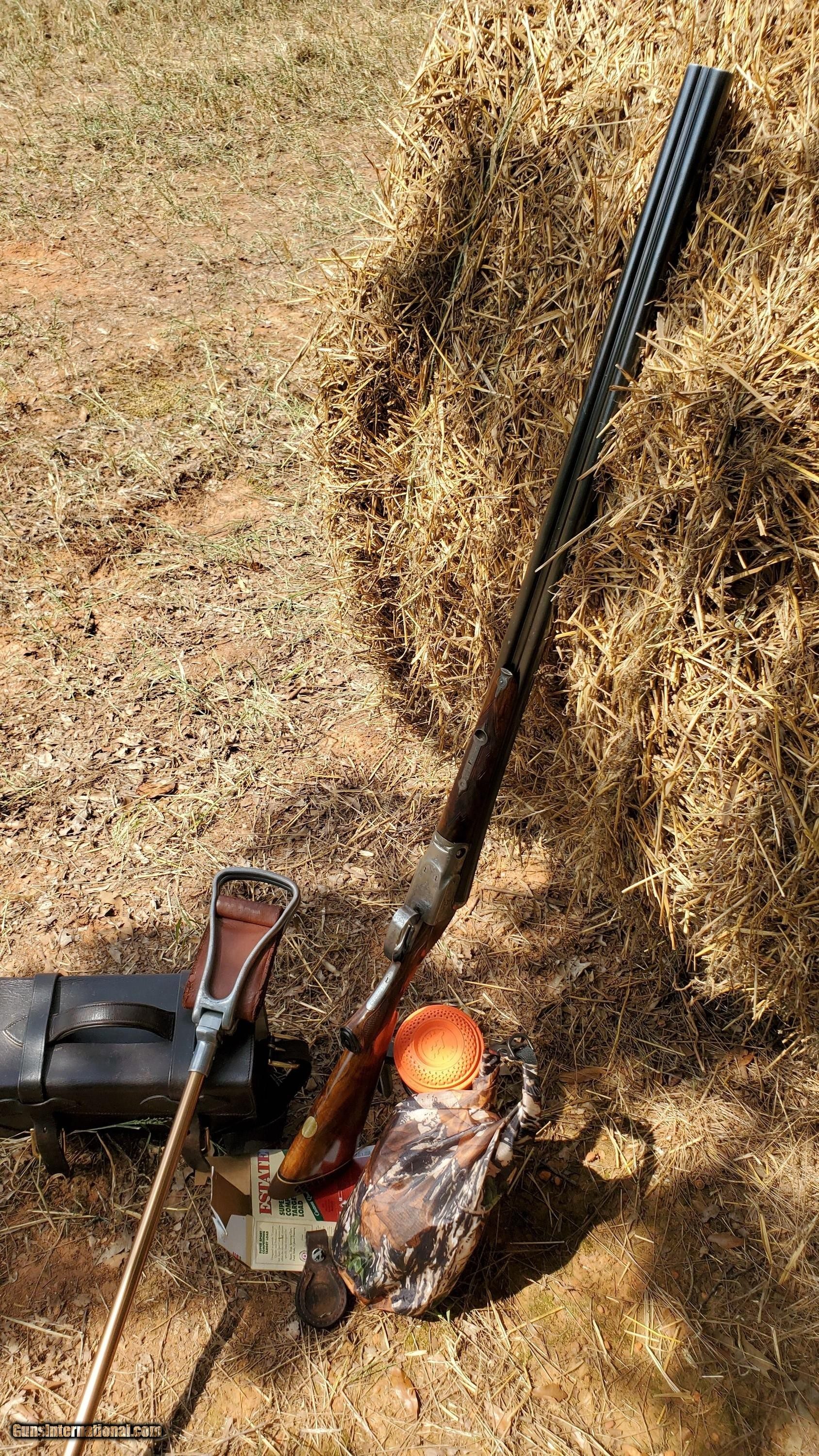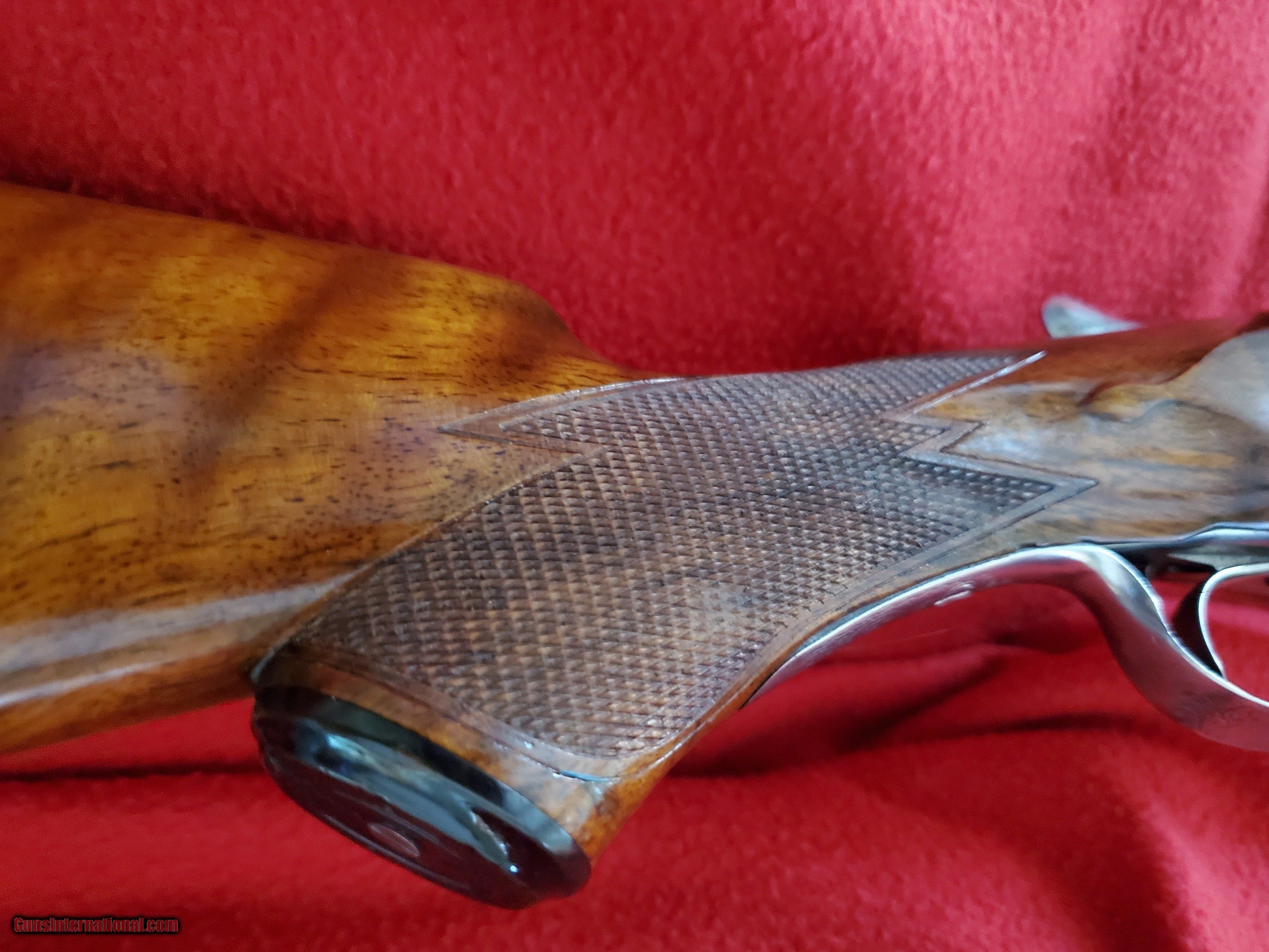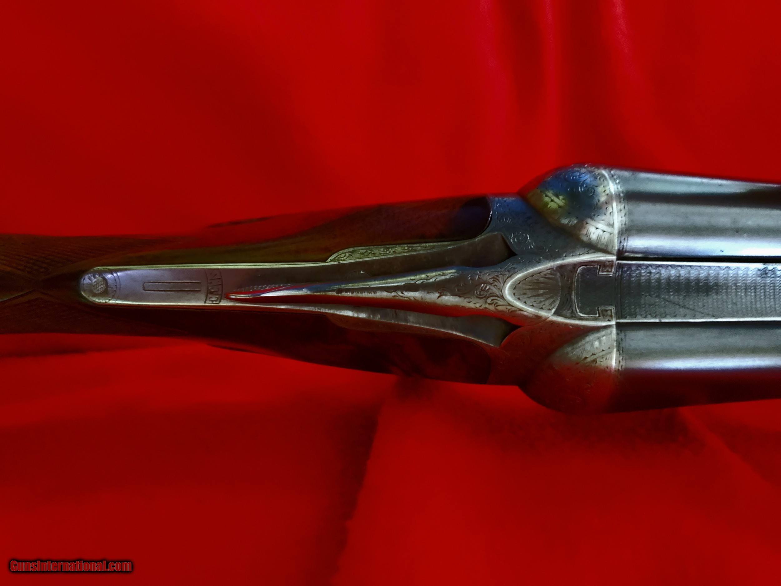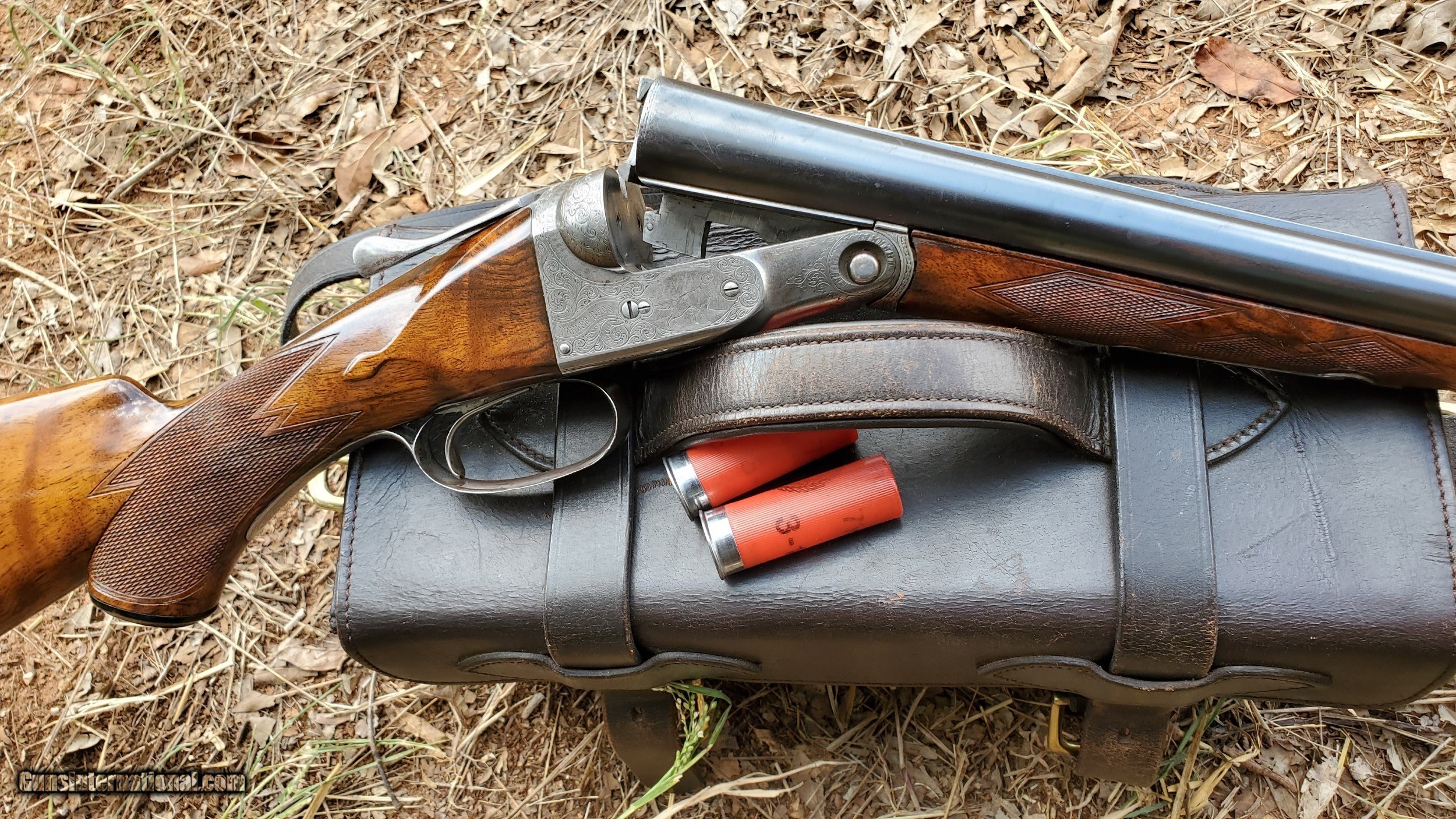 Description: Parker Bros , DHE. 32in Titanic Steel Barrels with mirror bores, no dents or dings - choked r-Mod, l-Full. SN 148,8XX (1908). 1 1/2 Frame size.. No Safety - a Live Pigeon Gun. This is very nice Parker DHE for the money and still has MANY years of life in this "Old Reliable". The Case harden colors are at about 50%. The engraving is still showing very well for its age. Note nearly each screw is still in time. This gun is a beautiful and sound example. The thumb latch is right of center. Very nice wood grain on buttstock has good dimensions: •14-1/4in LOP over a pad. •1-1/2in Drop Comb. •2- 1/4in Drop at Heel. •Cast as Neutral •7lbs. 6oz Gun Weight The checkering is still very nice. There is slight blue thinning at breach as shown in pictures and very faint at muzzle, but overall the barrels are quite nice and ring very true with mirror bores. No pitting or rust on this nice Parker. The Miller SST is very crisp. When fired and breached the ejectors are in time with strong ejectors.