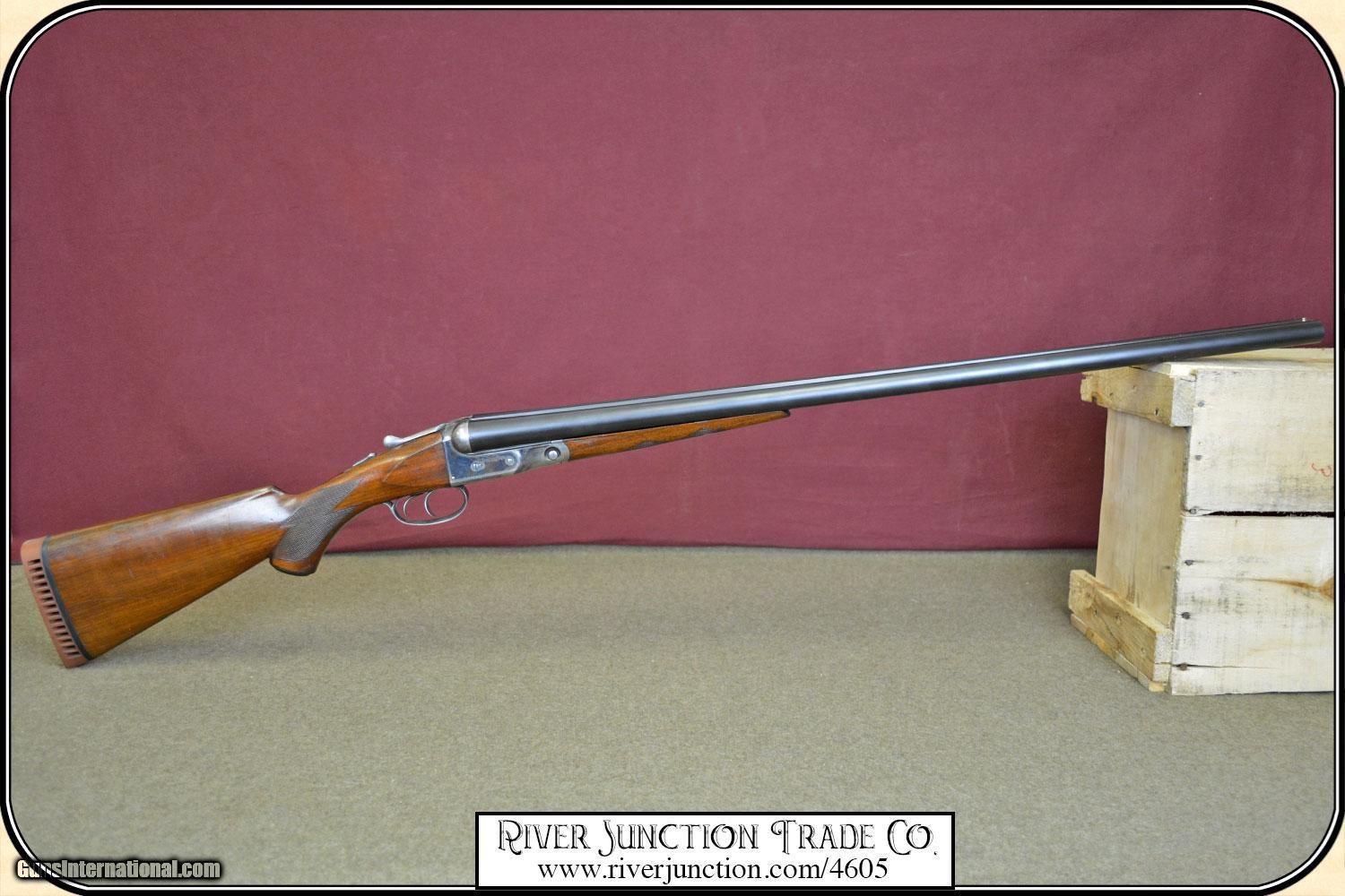 Description: Parker Bros., double barreled shotgun, Model VH, 12 gauge, s/n 207137 (Mfg. 1923), RECEIVER: #1 1/2 frame size, double triggers, top lever slightly off to right as desired, wear on standing breech exhibiting very little use, Original case colored in 90% brilliant colors, locks up tight as a drum on face, BARRELS: desirable original 30” length, 2 ¾” chambers, MINT BORES, choked Modified & Full, hand filed swamped rib, bead front sight, retain professional correct reblue in 100% condition, barrels rings clear like church bells when lightly struck by wooden dowel (no loose soldering issues), STOCK: nicely grained American Walnut, pistol grip with factory grip cap, factory medallion in bottom of buttstock, 14 ” LOP over factory Hawkins recoil pad, comes up nice, splinter forearm with factory Anson & Deeley release, perfect checkering on both buttstock and forearm in 90% original condition, no cracks or chips. Payment Cash, postal money order, cashiers check, personal & business checks. Can be ordered with a credit card or paypal at wxx.riverjunction,cxx just type in the number 4605 in the search box. SOLD |