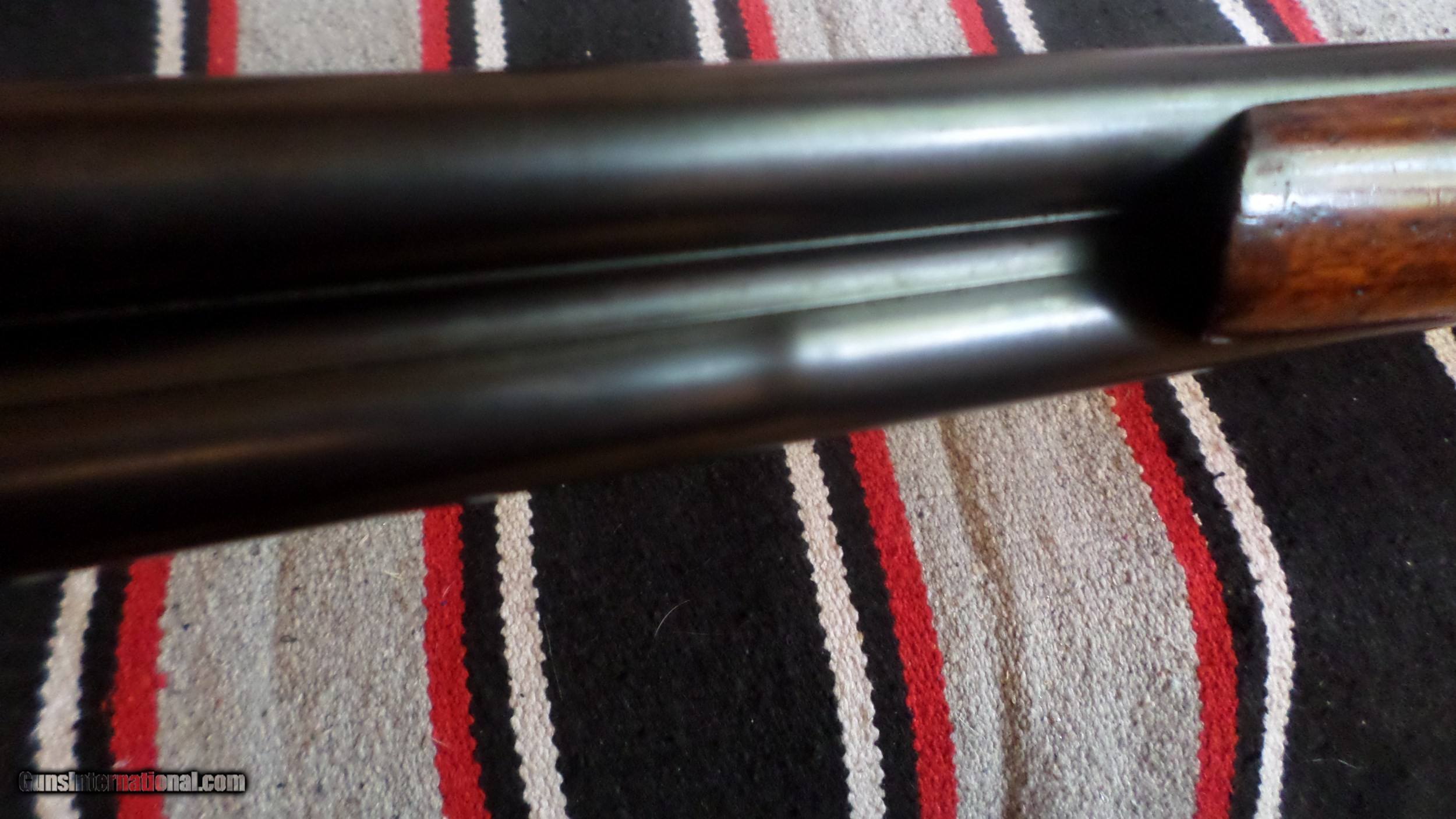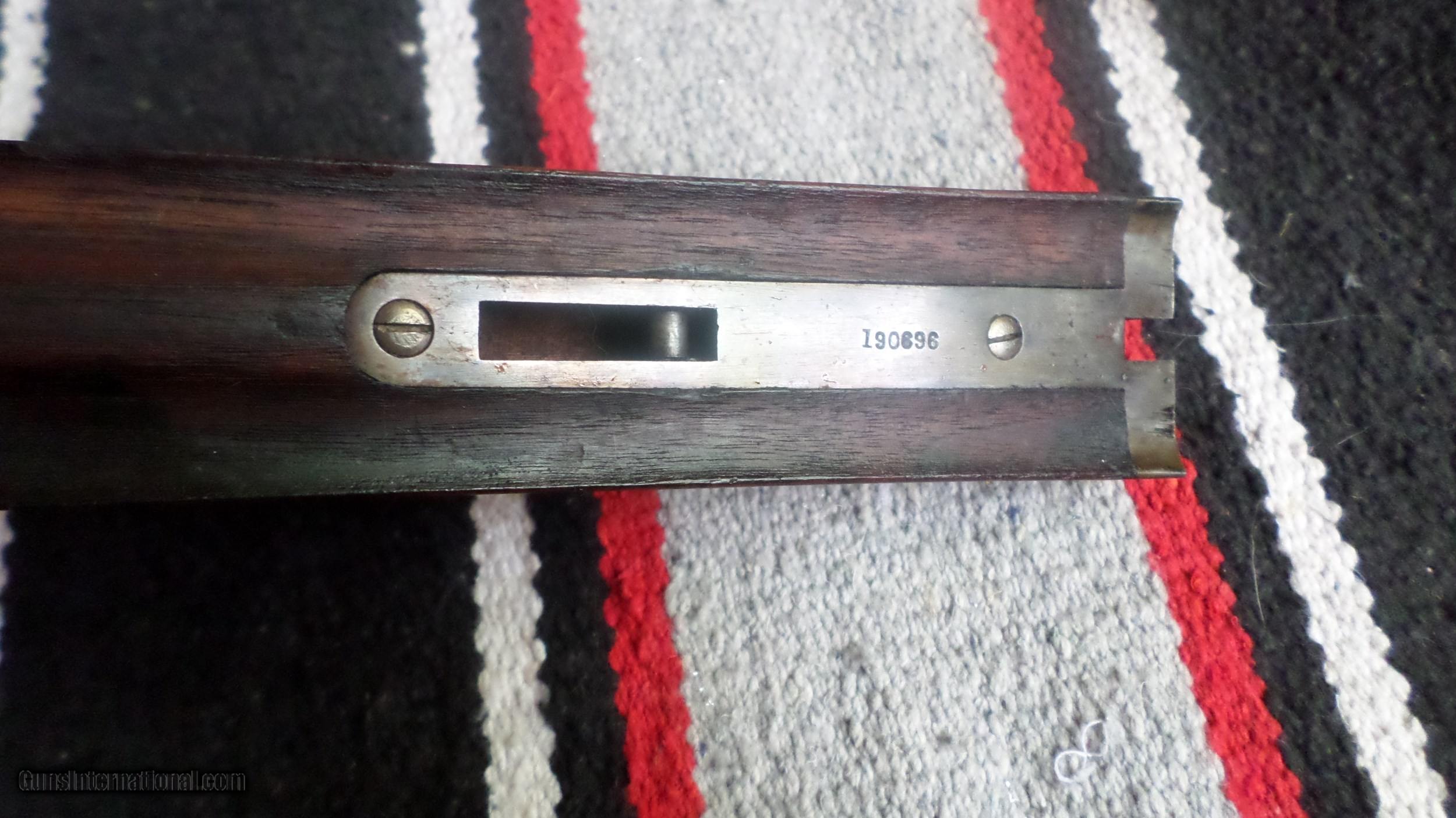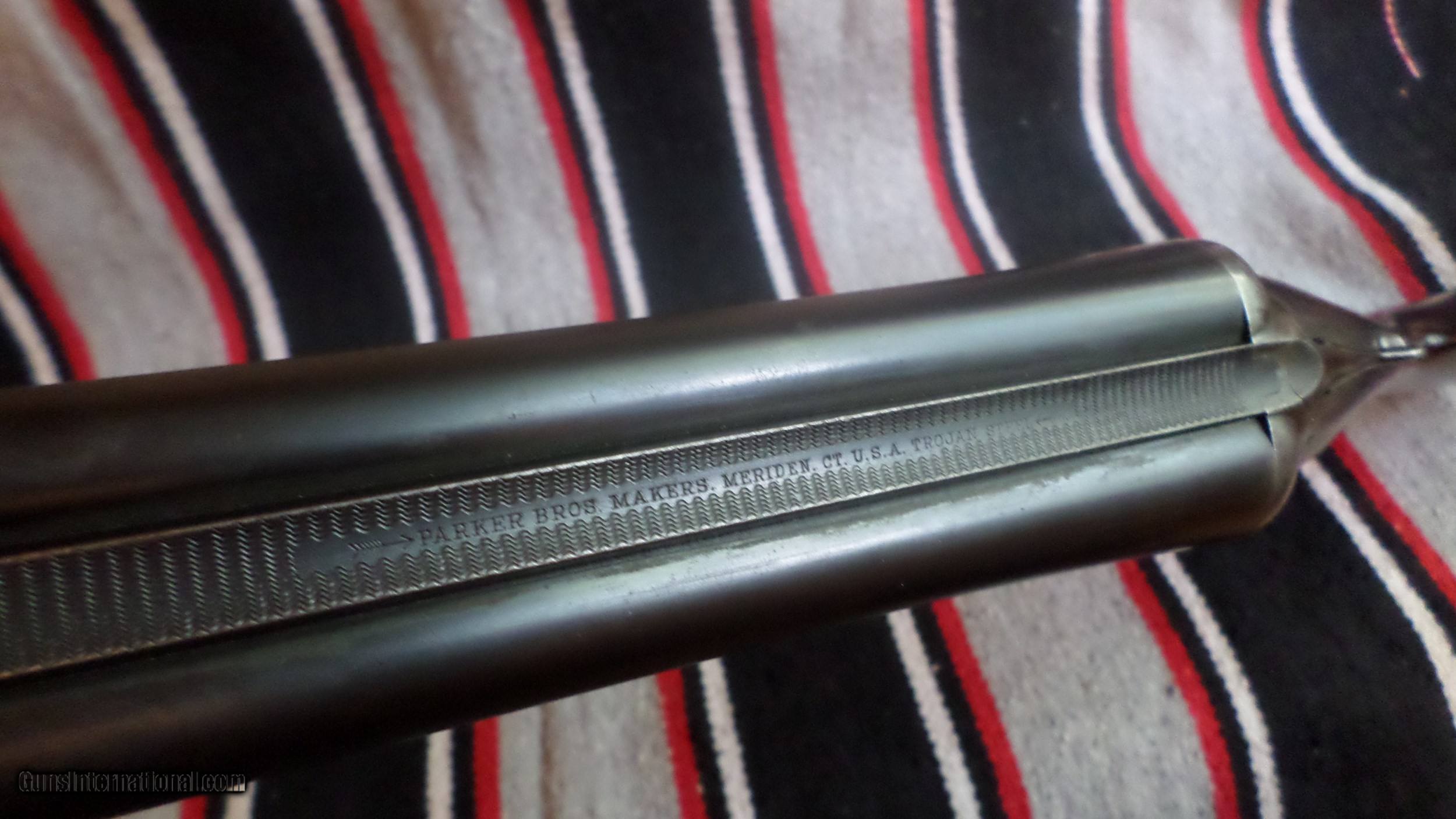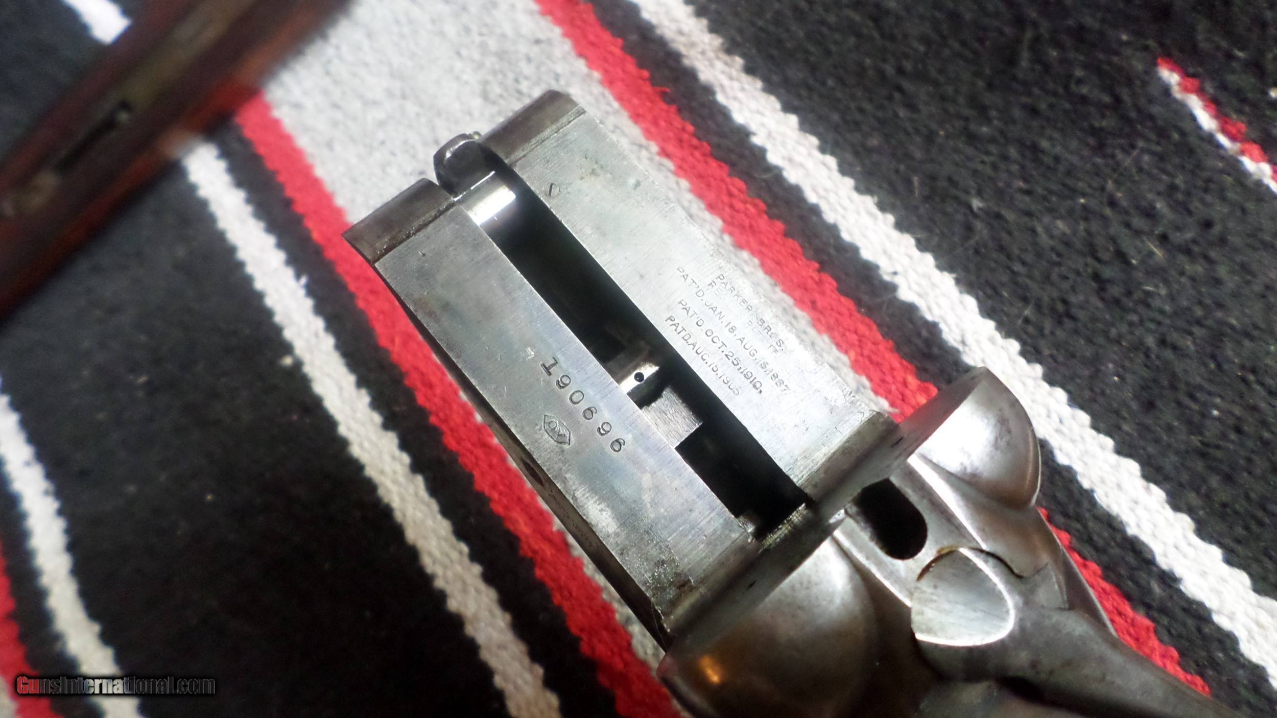 Description: Nice old parker double 12 gauge with 80% original blue and case color. Serial # 190696 circa 1920. An attractive and tight Parker, mechanically excellent. The barrel blue seems to be original and the case color has darkened but bright under the release lever. The wood is good with some dents but strong checkering. Important issues: The butt plate is broken and a chip off the stock at the butt. See pictures. Inside the right barrel, about half way out is a dimple that protrudes externally, about the size off a pencil erasure. In my opinion it is a factory (Trojan) defect and not SAFE to use. (see a qualified gunsmith on these issues) The left barrel is fine, both barrels are shiny, no pitting. These unfortunate issues on this fine gun are reflected in the price. Please ask questions. Buyer pays all shipping. $40 priority mail in the US. C&R OK. SOLD Curio/Relic: Yes |