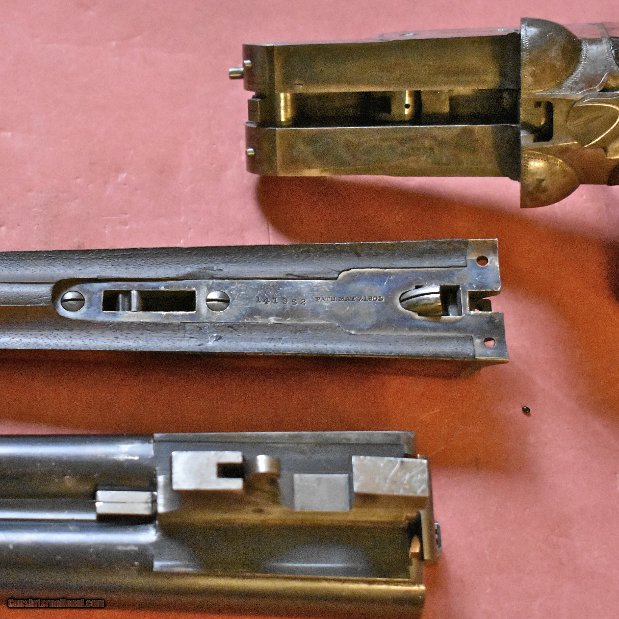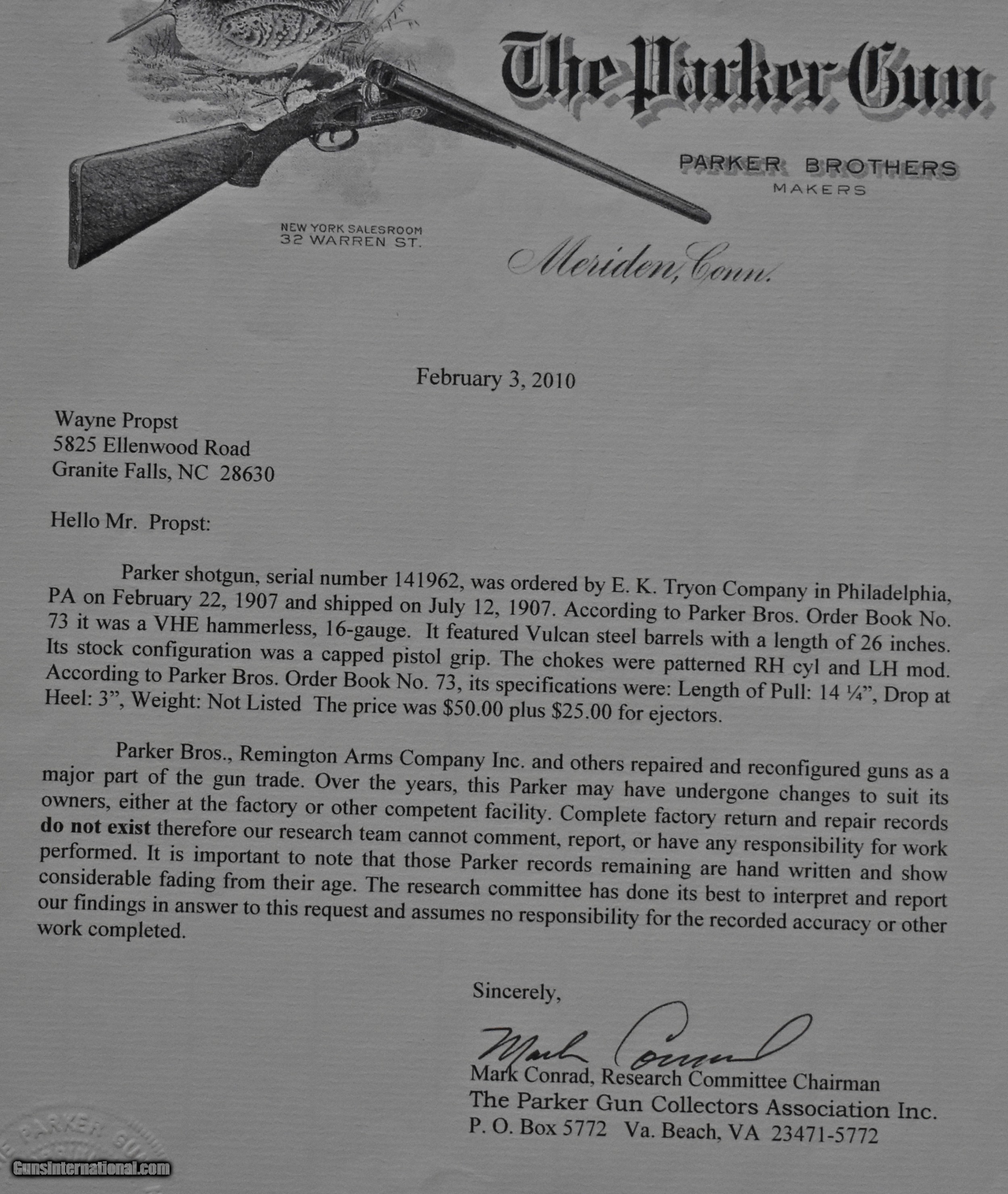 Description: Parker Bros.16 gauge VHE built on the light "O" frame.Built in 1907,this gun has 26"Vulcan steel barrels choked from the factory cylinder and modified.The factory letter says it was shipped to Pennsylvania so I imagine it was someone's grouse gun.It weighs 6-2 and is a very quick handling gun.The receiver retains traces of the original case color.The barrels retain 90% of the original blue and have mint bright bores.The barrels are on face and lock up tightly with no play.The ejcetors are in time and will ejecto emptys six feet from the gun.The stock and forend are sound with no cracks or damage.The stock still has the original dog's head buttplate.This is a great gun for quail,grouse,or pheasants.C&R eligilble SOLD Curio/Relic: Yes Shotgun Gauge: 16 Gauge Manufacturer: Parker Bros. Model: VHE Serial Number: 141962 Ejectors: yes Condition: excellent Metal Condition: very good Wood Condition: excellent Bore Condition: mint Barrel Type: Vulcan Steel Action: double barrel Triggers: double Fore End: splinter Butt Pad: factory buttplate Weight: 6-2 Manufacture Date: 1907 Choke Left: modified (.020") Choke Right: cylinder (.0) Extras: factory letter |