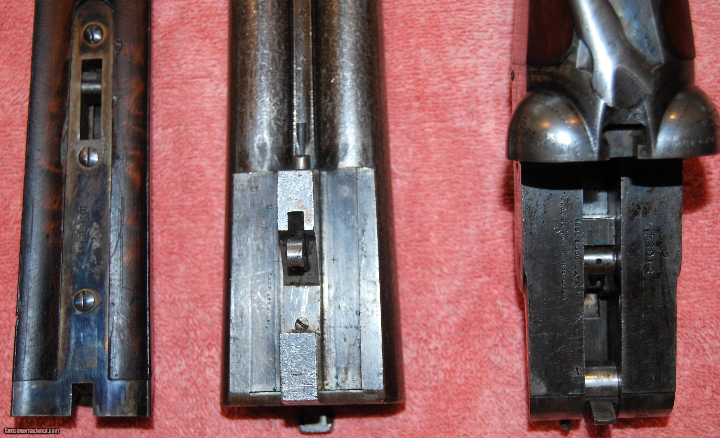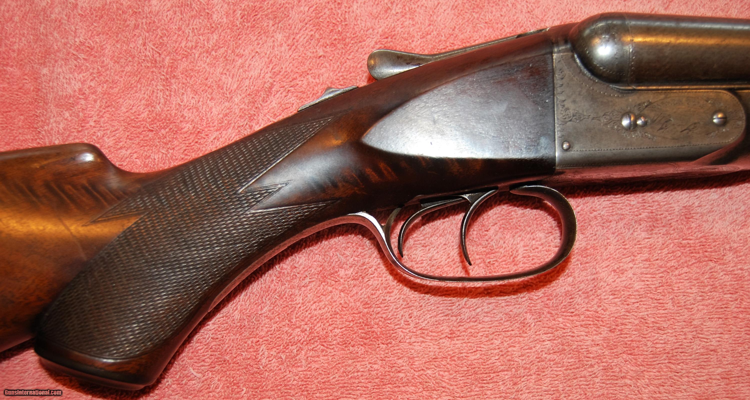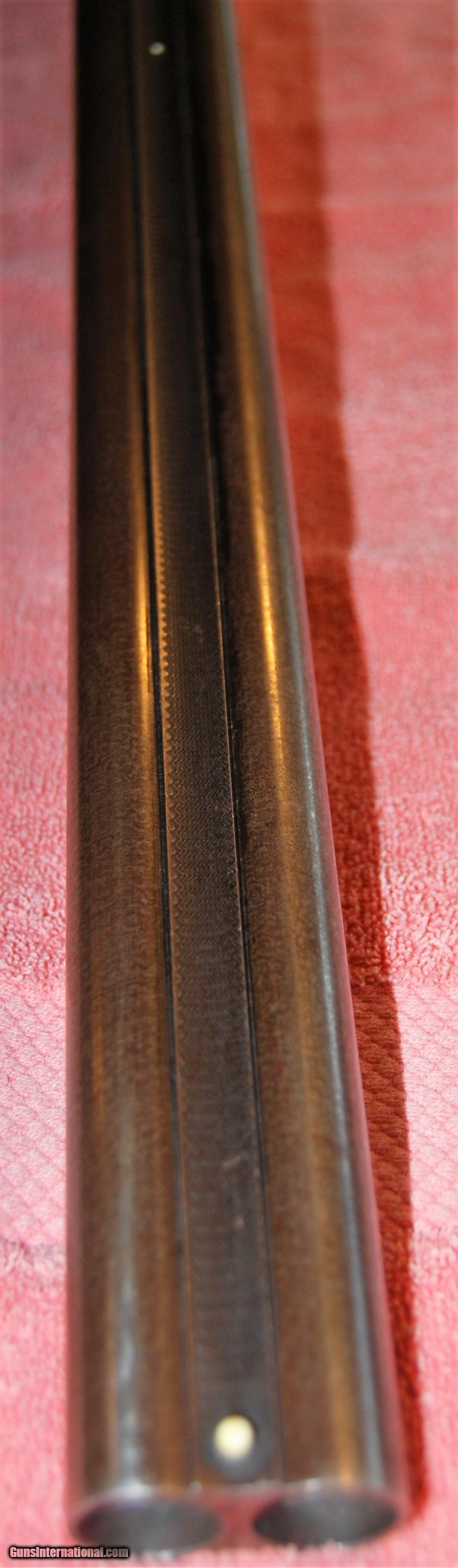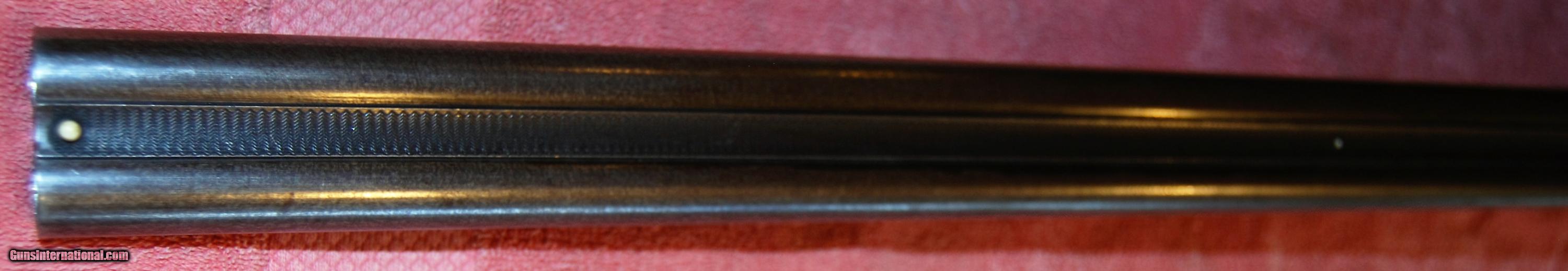 Description: Very nice Parker Brothers GH 12 gauge with 30" Damascus barrels. Barrels are in very good condition with bright shiny bores - no pitting and no delamination. Externally they have an even gray/brown patina. There are a couple of very minor dings in the barrels and a rough edge on the outside lower edge of the left muzzle, neither will effect its shootability. Barrels have white, double bead sights. The receiver features a bird scene on both sides and on the bottom and has even gray/brown patina. The stock is a beautiful, original piece of wood with great grain. It has an old chip out of it, to the lest of the safety and shows wear from use. There are no cracks, dings, dents or repairs. Pistol grip checkering is still crisp, fore end checkering is worn. The rubber butt pad is in need of removal or replacement. Serial number is 81684. Gun weighs in at 7.5 pounds and is built on a 1 frame. The unstruck barrel weight is;4.4 pounds. Front trigger LOP to the rear of the butt pad is 14 3/4 inches, rear trigger is 13 3/4. Drop at heel is 2 3/4 inches, drop at comb is 1 3/4 inches. This is a very nice, usable, damascus barreled Parker. Please email any questions, or call 772-559-8282. If I do not answer, please leave a message, I will return your call. SOLD Manufacturer: Parker Brothers Model: GH Serial Number: 81864 Caliber Info: 12 gauge Bore: Bright Condition: Very Good Metal Condition: Very Good Wood Condition: Very Good Bore Condition: Very Good Barrels: 30 Barrel Type: Damascus Steel Triggers: double Gauge Info: 12 Weight: 7.5 |