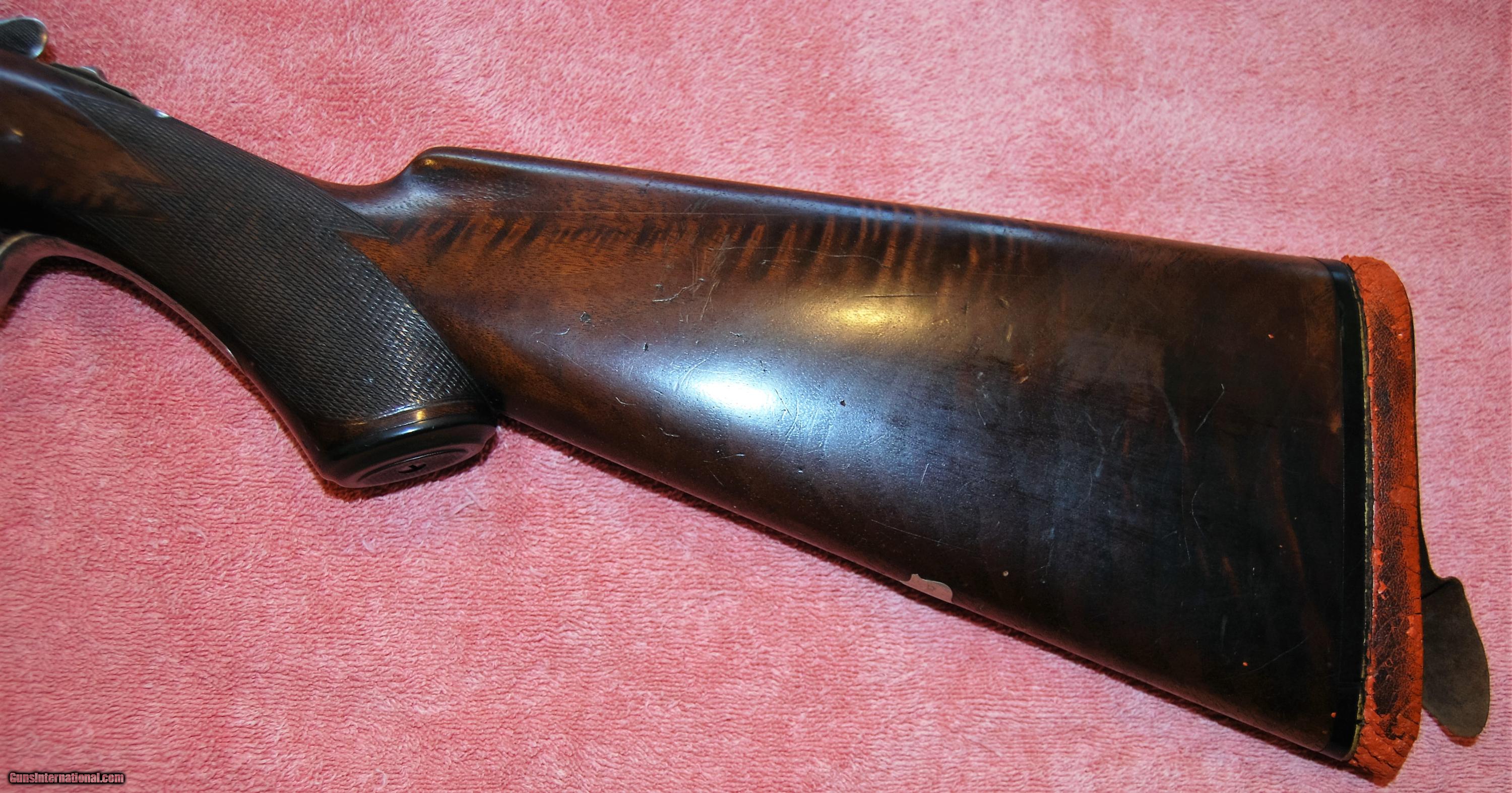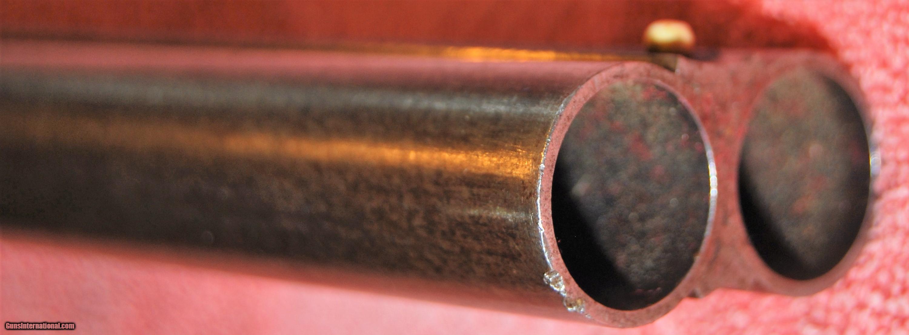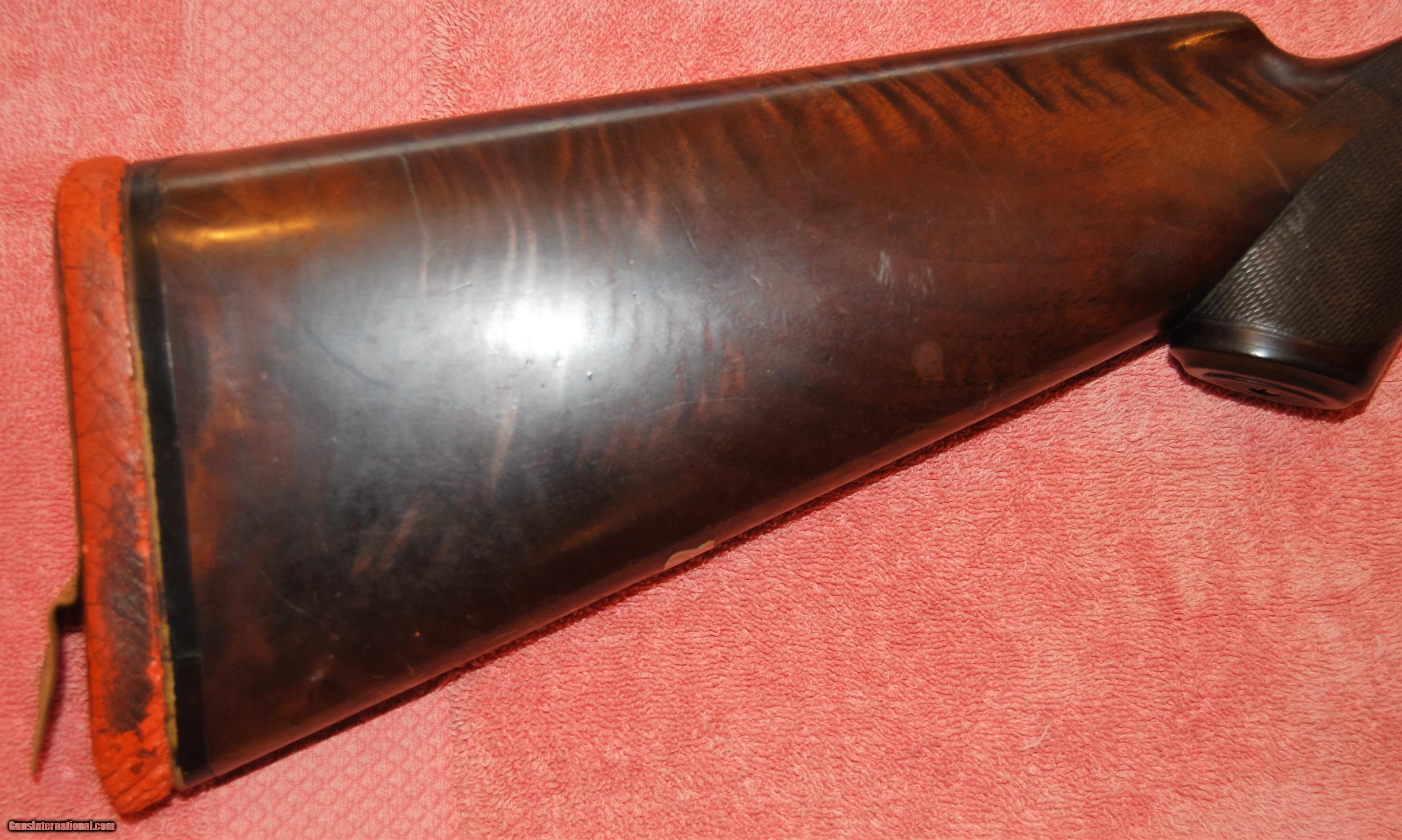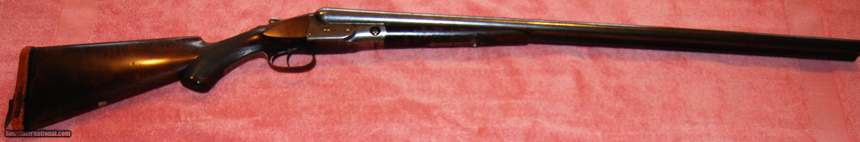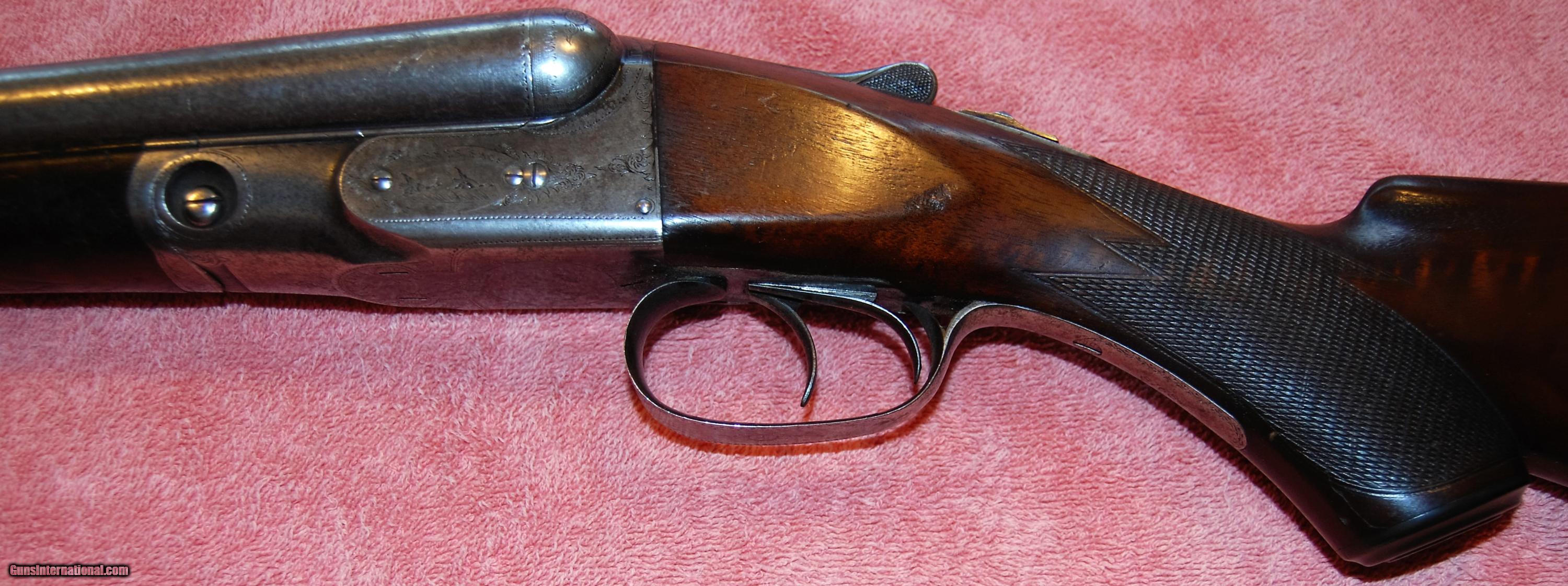Description: Very nice Parker Brothers GH 12 gauge with 30" Damascus barrels. Barrels are in very good condition with bright shiny bores - no pitting and no delamination. Externally they have an even gray/brown patina. There are a couple of very minor dings in the barrels and a rough edge on the outside lower edge of the left muzzle, neither will effect its shootability. Barrels have white, double bead sights. The receiver features a bird scene on both sides and on the bottom and has even gray/brown patina. The stock is a beautiful, original piece of wood with great grain. It has an old chip out of it, to the lest of the safety and shows wear from use. There are no cracks, dings, dents or repairs. Pistol grip checkering is still crisp, fore end checkering is worn. The rubber butt pad is in need of removal or replacement. Serial number is 81684. Gun weighs in at 7.5 pounds and is built on a 1 frame. The unstruck barrel weight is;4.4 pounds. Front trigger LOP to the rear of the butt pad is 14 3/4 inches, rear trigger is 13 3/4. Drop at heel is 2 3/4 inches, drop at comb is 1 3/4 inches. This is a very nice, usable, damascus barreled Parker. Please email any questions, or call 772-559-8282. If I do not answer, please leave a message, I will return your call. SOLD Manufacturer: Parker Brothers Model: GH Serial Number: 81864 Caliber Info: 12 gauge Bore: Bright Condition: Very Good Metal Condition: Very Good Wood Condition: Very Good Bore Condition: Very Good Barrels: 30 Barrel Type: Damascus Steel Triggers: double Gauge Info: 12 Weight: 7.5 |