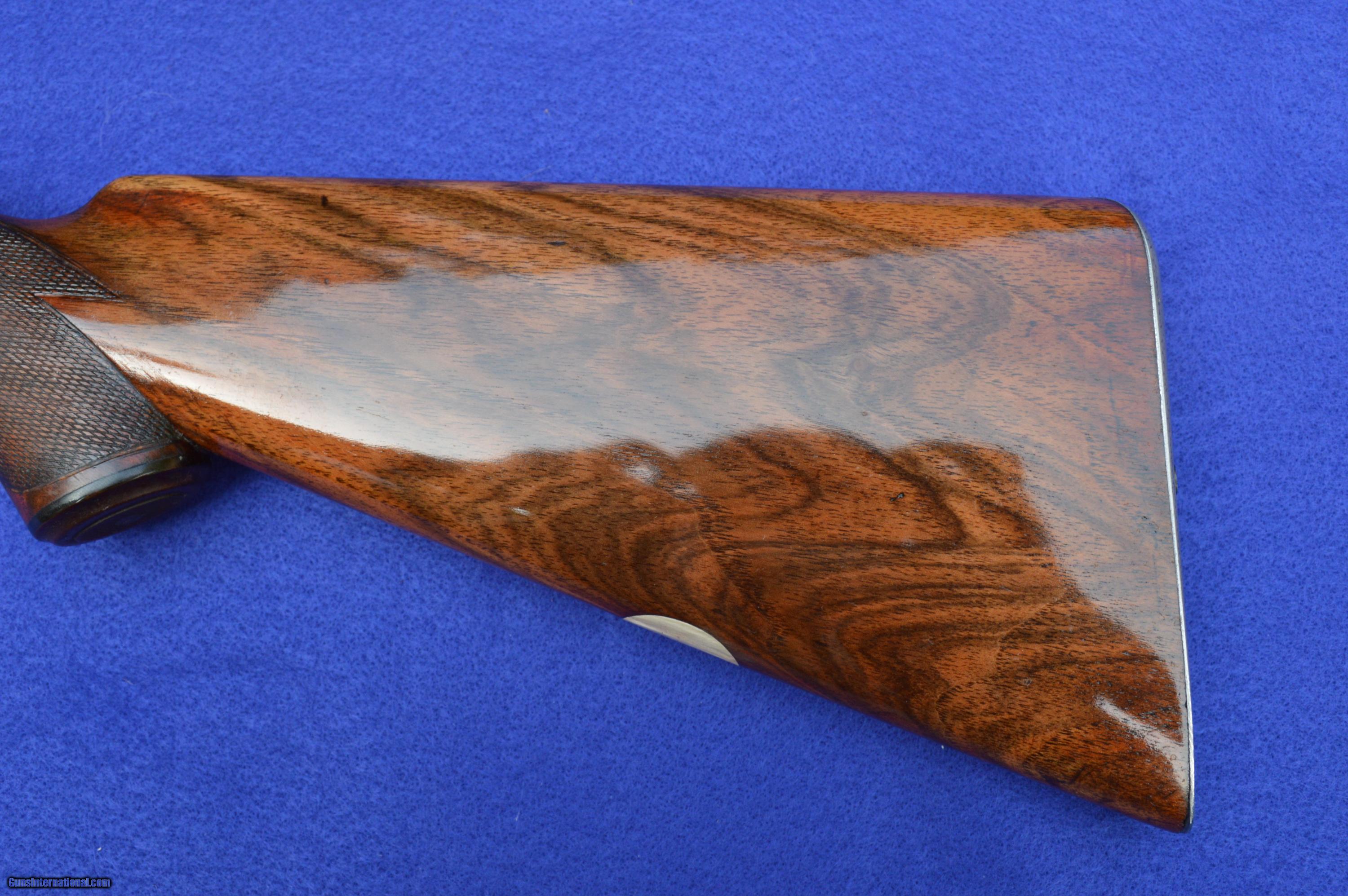 Description: Take a step back in time with this beautiful Parker Brothers D Grade 12 gauge with a set of two-barrels. Both barrels are serial numbered to the gun. The 28” barrels are choked Skeet (.005) and IC (.009). The 30”barrels are choked Full (.035) and Full (.035). The gun is on a number 1-1/2 frame. Manufactured in 1895, this gun is properly reconditioned to better preserve it for another century of use by shooters and hunters. The natural beauty of the well-figured walnut stock is restored by drawing out petroleum-based oils, which darken and damage wood, and replacing them with natural oils through the application of a hand rubbed stock oil finish. Dents and scratches are steamed and sanded out, as possible without changing the character of the gun, and the checking is re-cut. The fine Damascus steel barrels are refinished using the traditional process of slow-rust-bluing and etching. The engraving on the receiver and forearm metal is crisp, and the metal has an appropriate patina. The bores of both barrels are bright. The cast is neutral and length of pull is 14” to the skeleton buttplate and checkered butt. The trigger pull for both triggers is 6 lb. Drop at the comb is 1-7/8 inches and at the heel is 3 inches. Both the 28” and 30” barrels have 2-5/8” chambers. For the 28” barrels, the wall thicknesses for the right barrel at 9” from the muzzle are .032/.027/.032 (top/side/bottom) and at the middle of the barrel are .033/.030/.033. For the left barrel the wall thicknesses are .032/.031/.026 and .035/.035/.025, respectively. For the 30” barrels, the wall thicknesses for the right barrels at 9” from the muzzle are .033/.033/.030 and at the middle of the barrel are .038/.041/.035. For the left barrel the wall thicknesses are .035/.035/.032 and .037/.041/.035, respectively. The gun weighs 7 lb 6 oz. The gun locks up tight and all serial numbers, 84550, match. The price does not include shipping costs paid by buyer. The inspection period is 7 days from receipt. The shotgun has been fired using low pressure 2-1/2” shells produced for Damascus-barreled shotguns by RST Corporation. However, as for any antique or vintage shotgun, and especially one over a hundred and twenty years old, it is recommended that the new owner have it inspected by his or her gunsmith before firing and then only use shells that produce pressures for which the gun was designed. The gun carries a 30-day warrantee, during which Back in Time will have any mechanical problems documented by a professional gunsmith repaired or accept the return of the gun and refund the price of the gun and the return shipping cost. Please do not hesitate to call with questions Stephen Wesbrook, 703-625-4830; Back in Time, LLC -- Preserving late 19th and early 20th Century double shotguns. SOLD Antique: Yes |