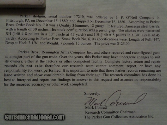 Description: For your consideration , Parker Brothers Grade 3 Under Lifter Serial # 17210 ordered on December 15 ,1880 ! It is a Grade 3 and very shootable as is using Vintagers / Low Compression Loads , Minimum Barrel Wall Thickness is 46 Thou. in the Left Barrel and 44 Thou. in the right measured on the Hosford Barrel Wall Thickness Gauge ! It is not without a few bumps and Bruises but overall for a 143 Year old gun it is very solid ! The Bores are very good with a lite hazing just ahead of the chambers and the Damascus Barrels are very nice and would be absolutely gorgeous with a refinish ! The wood has very minimal checkering left on the Stock and Forend as can be seen by the pictures and there is a very old repair as there is an old crack on the left side of the stock with a Dowel pin placed into the bottom of the stock at the center of the Ball Grip ! It appears very strong and the wood is tight to the action ! The gun locks up tight and remains tight with the forend on or off of the gun ,with the gun open there is slight left to right movement at the hinge ! This is a 12 Gauge built on a # 2 Frame with 30" Damascus Barrels and weighs in at 8LB. 1 Oz. ! The gun retains its original Skeleton Butt Plate with checkering and is almost exactly as the letter describes ,it is an ounce or so off in weight and the Stock measures 13 7/8 instead of 14" Other than that it is as it left the Factory on Dec. 16, 1880 according to the letter in my photos , the engraving has been buffed a little by a previous owner cleaning the gun ,I suppose but is still very visible and it has a Beautiful Woodcock engraved on the front half of the bottom of the receiver ! The shooting measurements for this gun are DAC 2 1/16 ,DAH 2 1/2 and LOP is 13 7/8 ! I am asking $1395.00 Plus $30.00 Shipping to your C&R or FFL , it can be shipped direct to the buyer as an Antique provided that is legal in the state you live in ! I will be happy to answer any questions you might have about this gun or send other pictures via Cell Phone should there be anything you would like to see ! Thank You for considering my Parker ! Grouse Flusher SOLD Antique: Yes Shotgun Gauge: 12 Gauge Manufacturer: Parker Brothers Model: Grade 3 Under Lifter Serial Number: 17210 Barrel Length: 30 Bore: Very Good Ejectors: None Condition: Good Metal Condition: Very Good Wood Condition: 143 Years Old Bore Condition: Very Good Barrels: Good Barrel Type: Side by Side Action: Under Lifter Triggers: Double Stock: Ball Grip Stock Comb: 2 1/16 Stock Heel: 2 1/2 Fore End: Splinter W/ Latch Butt Pad: Sleleton and checkered LOP: 13 7/8 Rib: Solid Weight: 8 Lb. 1 Oz. Sights: Front Bead Manufacture Date: 1880 Engraving: Dogs and Birds Item Location: Ligonier Pa Minimum Wall Thickness Left: 46 Thou Minimum Wall Thickness Right: 44 Thou. |