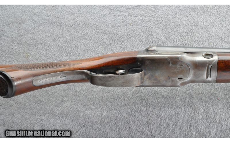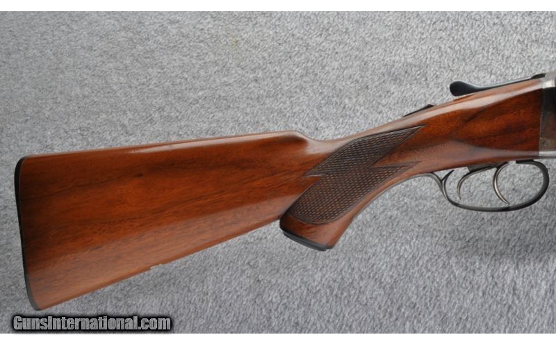 Description: A fine American Treasure, this Parker Brothers VH Grade gun had seen some use and has a repaired fore end. A No. 1 1/2 frame size with automatic ejectors, top lever is still just right of center, an overall solid gun. SOLD Curio/Relic: Yes Manufacturer: 1928 Caliber Info: 12 Gauge Chambers: 2 3/4 Metal Condition: Although showing some carry wear there are still good case colors on the frame. Barrels show a soft gray patina with scattered pin prick pitting. A few screw heads reveal slight marring however, overall very good contition Wood Condition: The stock appears to have been refinished at some point and shows normal field marks. There is a small surface crack at the top tang and near the fence on the left side. Another shows near the fore end iron right side. The fore end has been repaired forwa Bore Condition: Bores are bright with a very small wrinkle in the left barrel about six inches from the muzzle. Hardly perceptible from the outside Barrels: 30" Vulcan Steel Solid Rib, auto ejectors Triggers: Double Triggers Stock: Checkered walnut pistol grip with cap Stock Dimensions: 14 1/8" LOP, 1 3/4" DAC, 2 1/2" DAH, Neutural Cast Fore End: Checkered Splinter with Deeley style release. Butt Pad: Parker Brothers hard rubber with logo Weight: 7 lbs 8 oz Sights: Metallic front bead Chokes: Fixed Full & Modified Item Location: Grand Junction, CO |