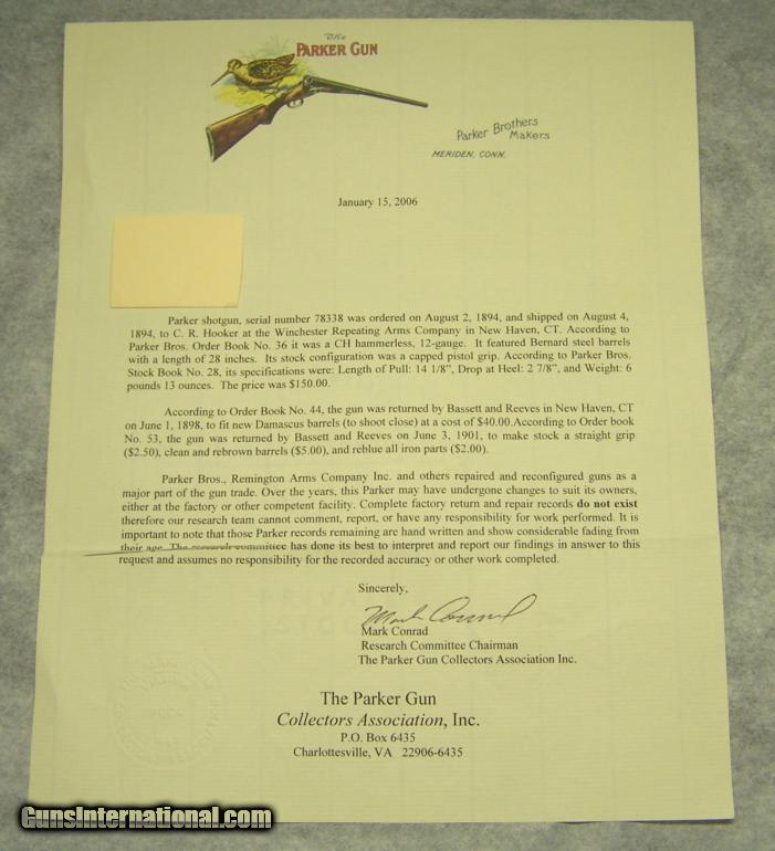 For sale we are offering a very scarce Parker CH Grade double barrel shotgun chambered in 12 gauge. This shotgun comes with original documentation from the PARKER COLLECTORS ASSOCIATION and two sets of barrels, one being BERNARD STEEL, the other being Damascus steel. Both barrels come with splinter fore-ends. This shotgun is in Very Good highly collectible condition. The gun was built on a No.1 frame with two sets of barrels. One set, the Bernard Steel barrels appear to have been cut to 26” with Improved chokes. These barrels were original to the gun. The second set of 28” Damascus steel barrels were added by the Parker factory in 1898. The Damascus barrels are Full chokes. Both barrels have tapered, concave, matted rib with two bead sights and doll’s head rib extension. Barrels are in Very Good condition with excellent muzzles and clean, bright bores. No visible flaws. The walnut stock is fantastic with light handling wear; absolutely no cracks, chips or other flaws. This shotgun was originally sold with a capped pistol grip, however was shipped to the Parker factory in 1901 to have the stock changed to a straight grip. Bottom of stock has blank silver oval with signs of patina. There is beautiful checkering on the straight grip. Both splinter fore-ends are matching and in wonderful condition; Again, no flaws to wood. Attractive checkering on both along with engraved steel parts. Stock is fit with an engraved metal butt plate. Receiver is beautifully engraved with vignettes of a Pointer on one side and a Setter on the other. The floor plate features a beautiful and unique vignette of what appear to be Grouse. The receiver shows light signs of case coloring which are somewhat faded with a beautiful silver patina. Trigger guard is similar with beautiful engravings. Double triggers. $75.00 Shipping charge for USPS Priority shipping with full insurance! We are new to Gunsinternational - We are listed on as Bay State Gun Buyers and have 100% feedback over 190 transactions **** PLEASE NOTE WE ONLY ACCEPT MASTERCARD AND VISA AS FORMS OF PAYMENT **** Make: Parker Model: CH Grade SxS shotgun Gauge: 12 Gauge SN#: 78338 (1894) Action Type: Break Action Barrel Length / Condition: Two Barrels:(1) Bernard Steel, 26” with nice patina (2) Damascus Steel, 28”, excellent condition Ribbing (Y/N): Concave matter rib on both sets of barrels Receiver Condition (ie. Bluing, Engraving, etc.): Very Good with engravings; nice patina Stock Condition (ie.Checkering, Wear, etc.): Very Good with light wear; checkering; no structural flaws Fore-end Condition (ie. Checkering, Wear, etc.): Very Good with light wear; nice checkering Kind of Sights (ie. Front, Rear): Front and mid bead sights Trigger/Grip: Very Good Recoil Pad: Metal butt plate with engravings L.O.P: 13 3/4” (from front trigger) Drop In heel: 3 3/4” Drop in Comb: 2” PLEASE LOOK AT ALL PHOTOGRAPHS FOR CONDITION Please know the legality of any weapon in your state before . If a gun can’t be transferred to you we will charge a 15% re-stocking fee. Also, we are a PART TIME business, Only in office on Saturdays 10am-4pm. If you make an offer on Sunday-friday we may not get back to you for 24+ hours, please send us an email with any questions, and we will do our best to get back in a timely manner. Thank You. We are not a shop open to the public, no private viewings. We stand behind our descriptions, and gladly take returns, however we know based on the descriptions given, you will not be disappointed. No Face To Face Transfers! Please note: Clicking "buy" does not guarantee that this gun is yours, However clicking “Buy” will reserve this gun for you, if it hasn’t been sold in store. We will try to do our best to remove the posts as efficiently as possible, but sometimes delays may ensue. “Buy” is your safest bet to reserve a gun. Also please add 6.25% MA state sales tax (if from MA) and 3% credit card shop courtesy fee. After Clicking “buy” we will need the following from you, via email before we ship. 1: A copy of your preferred FFL’s license via email () 2: Your preferred method of payment (If Credit card: 16 digit, MM/YY exp date, 3 digit code Plus billing address) 3: Your Shipping information/ Your preferred FFL’s Shipping information. You have 5 business days to arrange payments and ffl information to us. Any purchase not completed within this time frame will be cancelled, and the ad will be put back active online. Please before calling with concerns read these conditions and meet them accordingly.