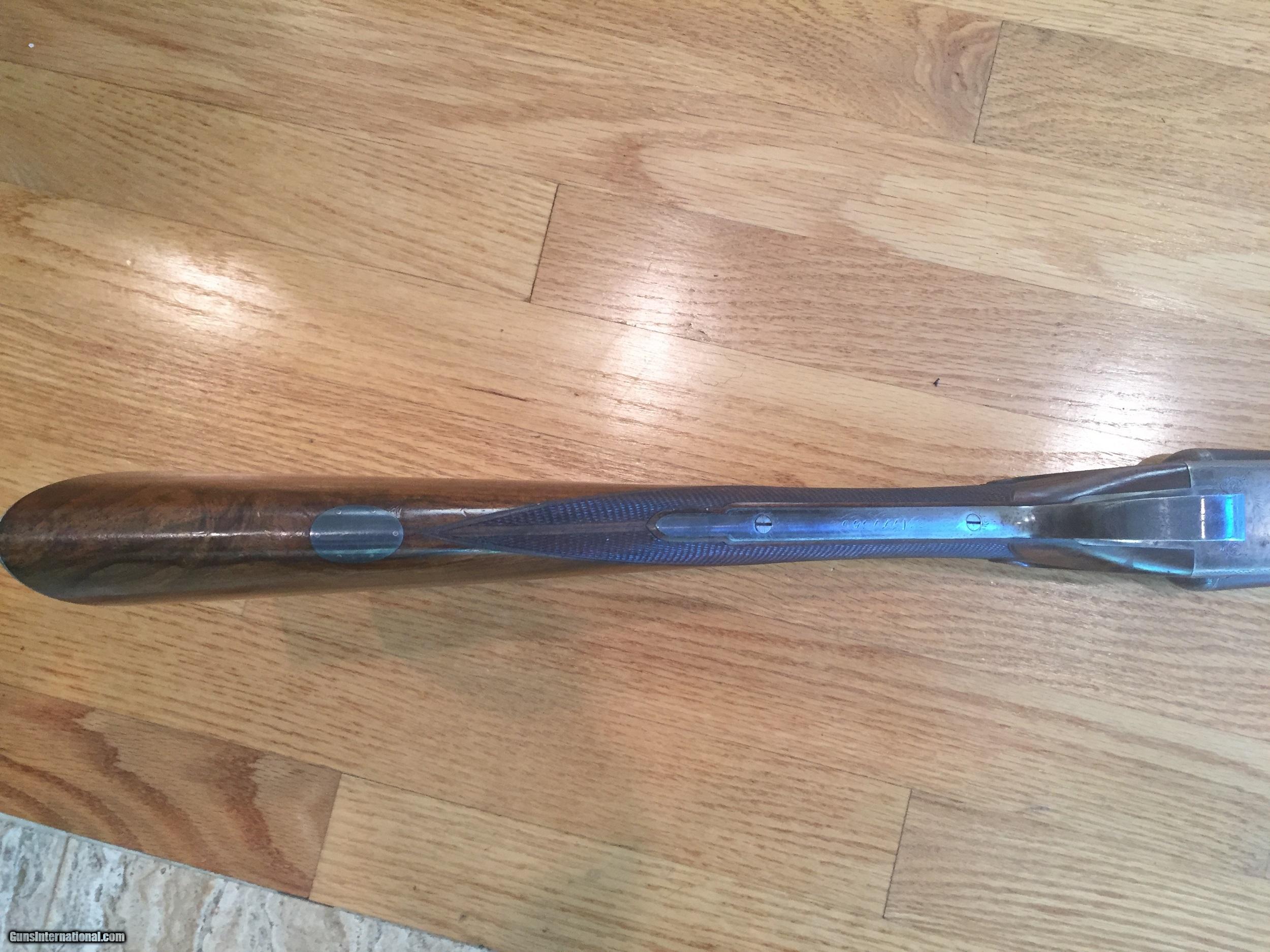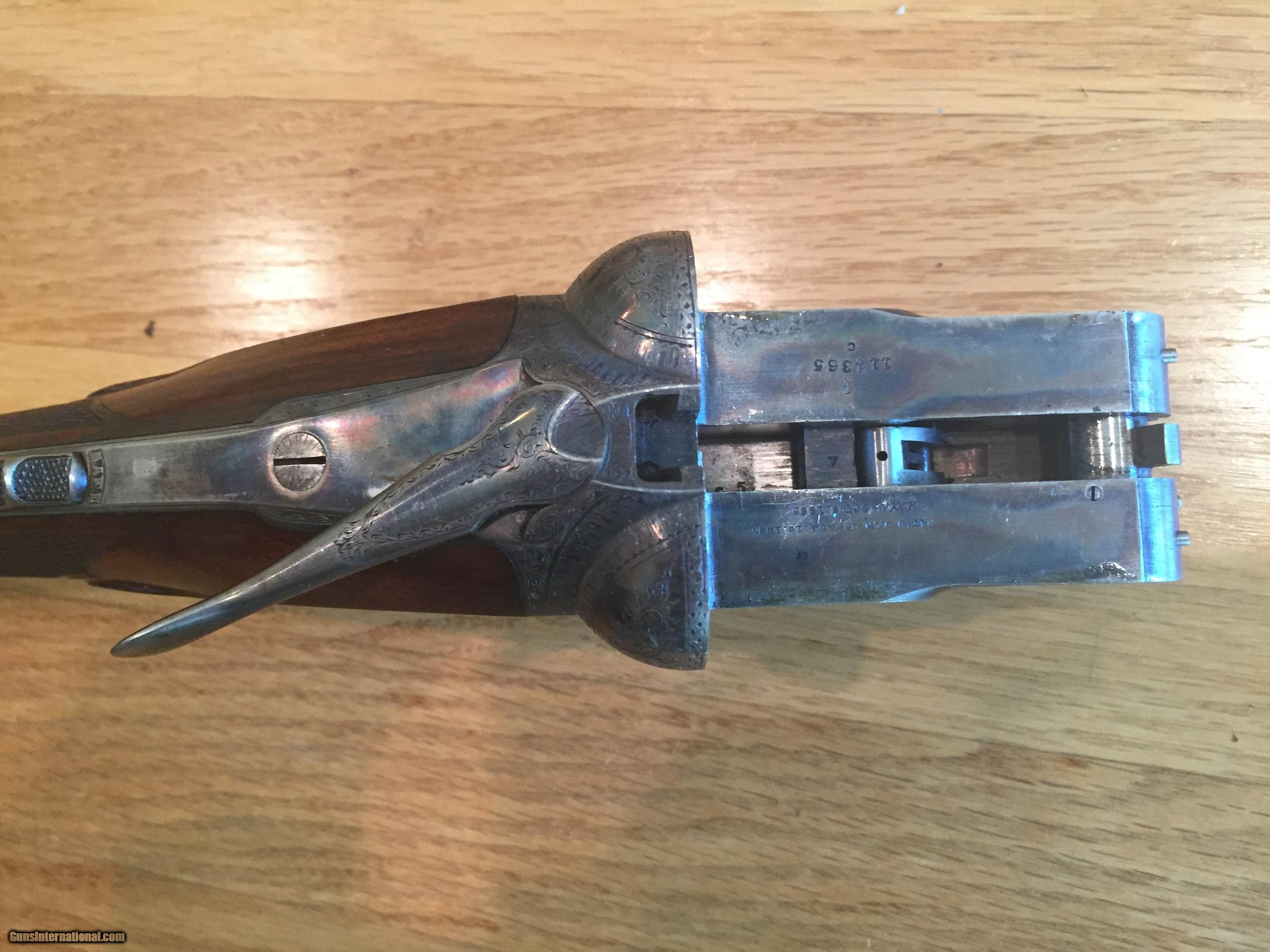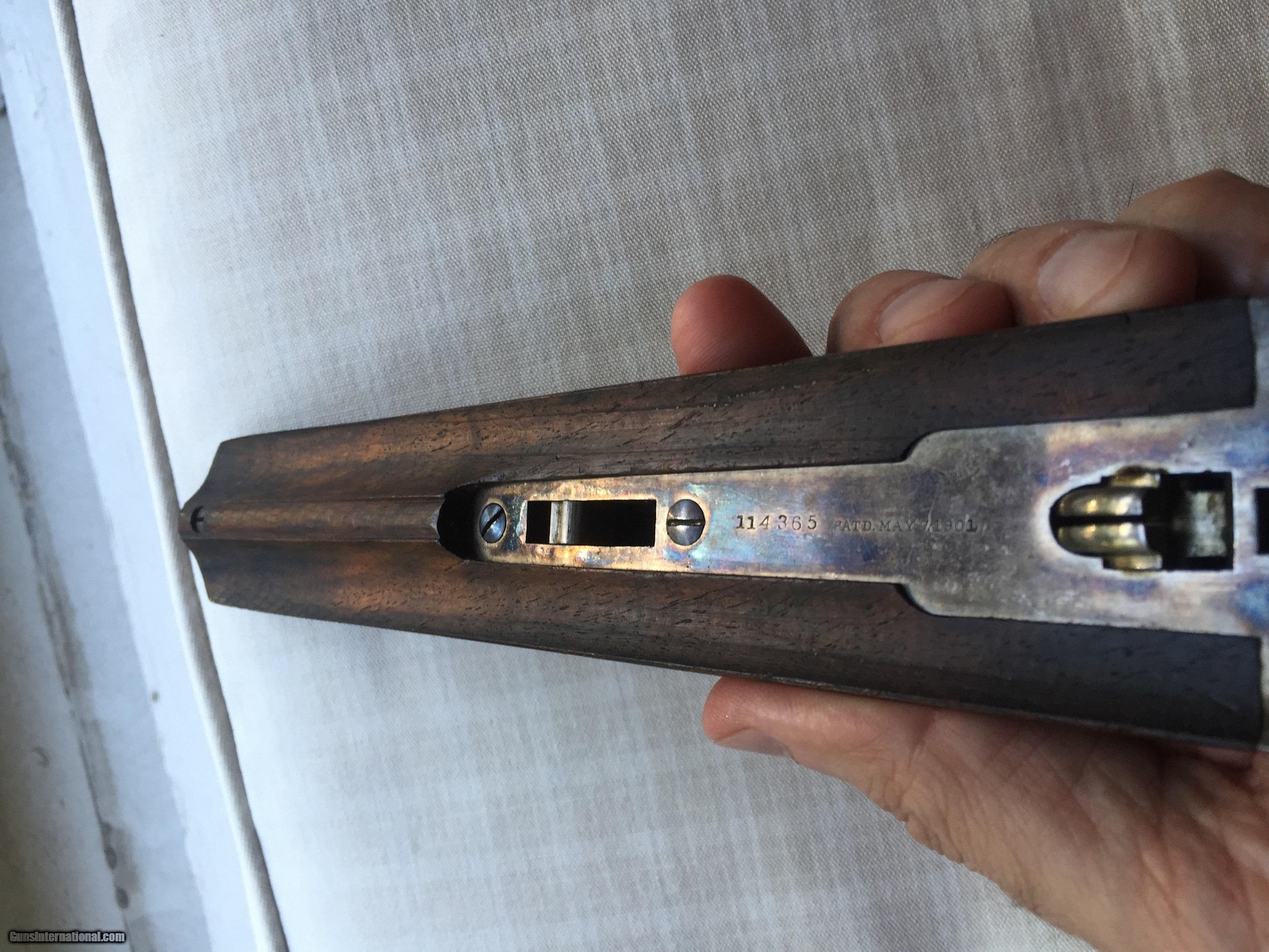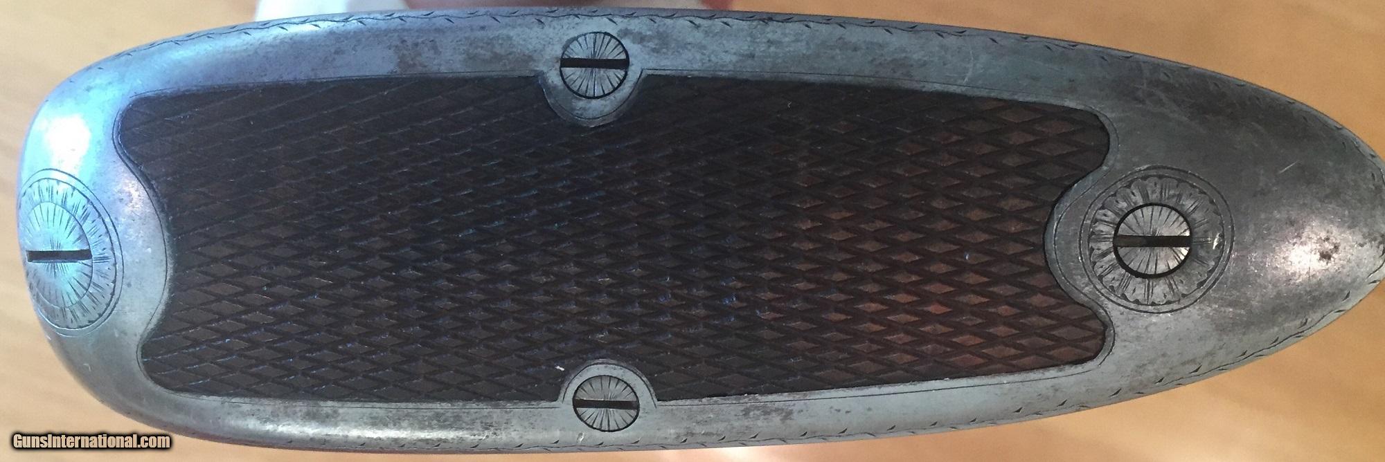 Description: All original non-molested Parker CHE side x side shotgun built in 1902 on a #2 frame with Titanic steel bbls and a single silver sighting bead. The receiver is engraved in a typical C pattern and foliate arabesque scroll. It is stocked with beutiful streaky walnut and a skeleton steel butt. The Parker Serialization Book identifies this gun as a grade 4 with Titanic steel barrels. Only 269 12 gauge Titanic Steel barreled guns were produced and only 150 of those were straight grip. This Parker is in very good condition. The barrels retain 85-90% original blue with slight muzzle wear, normal nicks and dings, and some thinning at the breach area where the gun was carried. The receiver and fore-end metal retain 35-45% case color, especially in protected areas (see photos). The trigger guard is "silver-gray" where the palm holds the grip, while all blue remains through the bow, along with case color darkening in guard. The wood is sound and beautiful with the usual light nicks and scratches. The fore-end and grip checkering can be felt easily. The fore-end metal is silver gray but case color darkening on underside (see photos). The mechanics are crisp. The bores are shiny and bright, but right barrel has one minor dent near muzzle (see photo). All serial numbers are matching. Price: $14,250.00 seller pays shipping and insurance Manufacturer: Parker Model: CHE Serial Number: 114XXX Ejectors: Yes Barrels: 30 in Barrel Type: Solid Rib Action: SxS Triggers: Double Triggers Gauge: 12 ga Stock: Nicely Figured Wood Stock Comb: 1 3/4 in Stock Heel: 2 7/16 in Fore End: Splinter Fore-end Butt: Skeleton Steel LOP: 14 1/4 in Weight: 8 lbs 3 ozs SOLD Curio/Relic: Yes Manufacturer: Parker Bros. Model: CHE Serial Number: 114XXX Ejectors: Yes Barrels: 30 Triggers: Double Gauge Info: 12 Stock: Straight Grip Stock Comb: 1 3/4 Stock Heel: 2 7/16 Fore End: Splinter Butt Pad: Skeleton Steel LOP: 14 1/4 Rib: Solid Manufacture Date: 1902 Engraving: C |