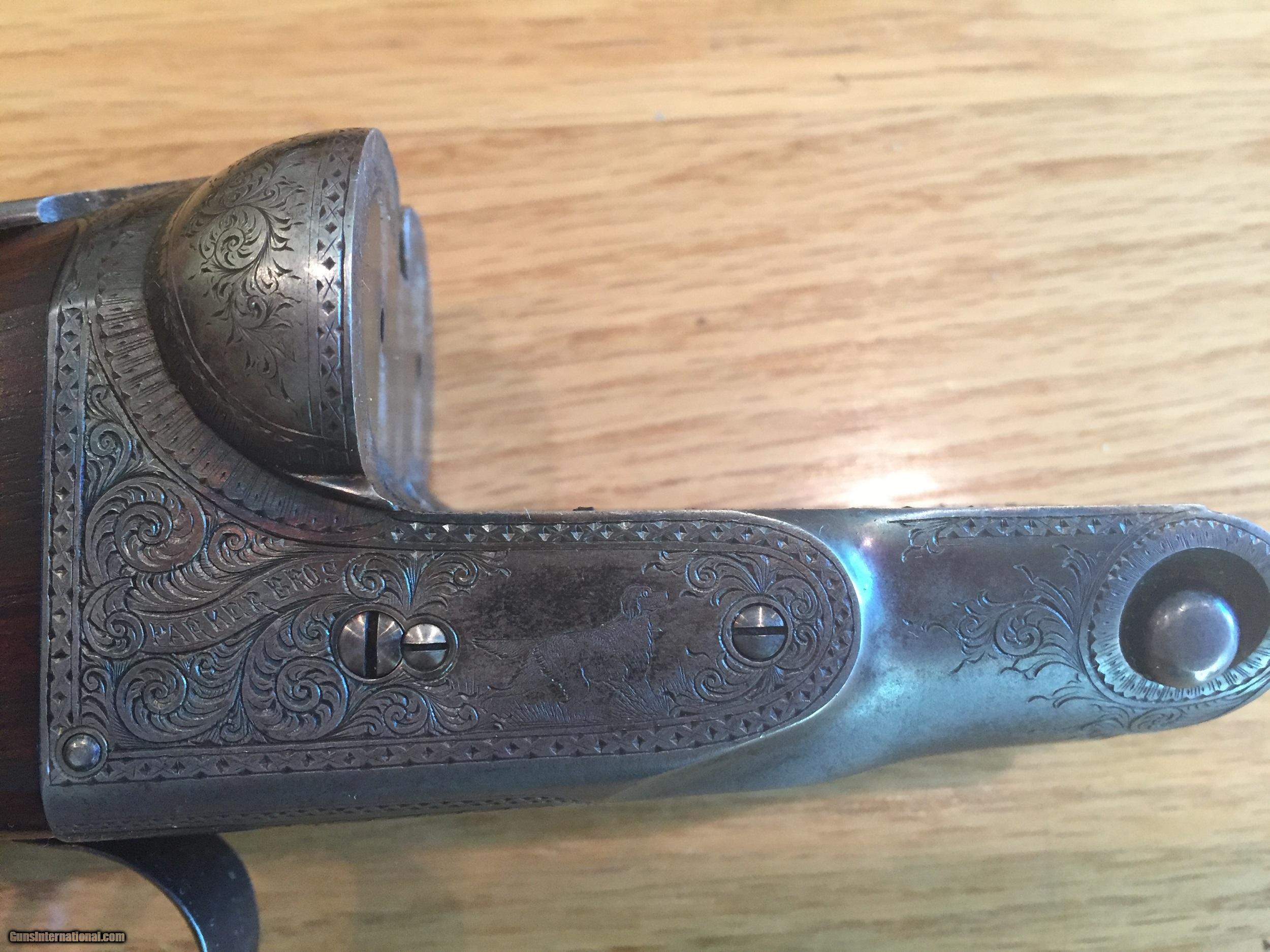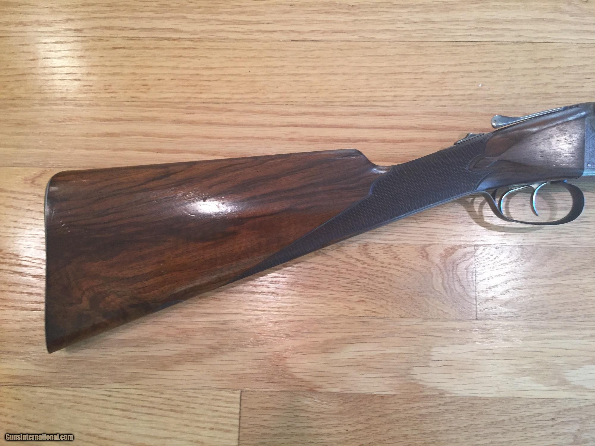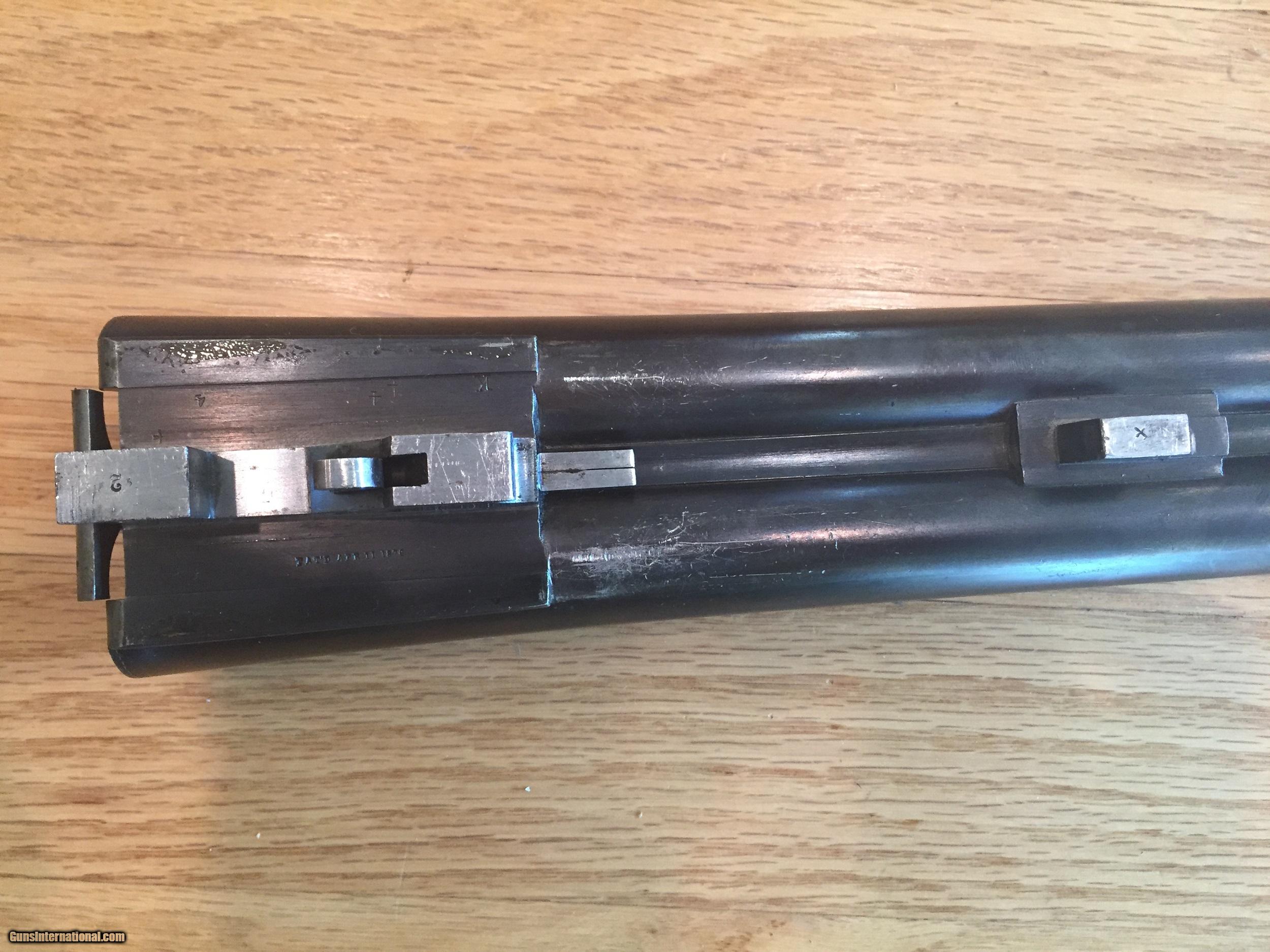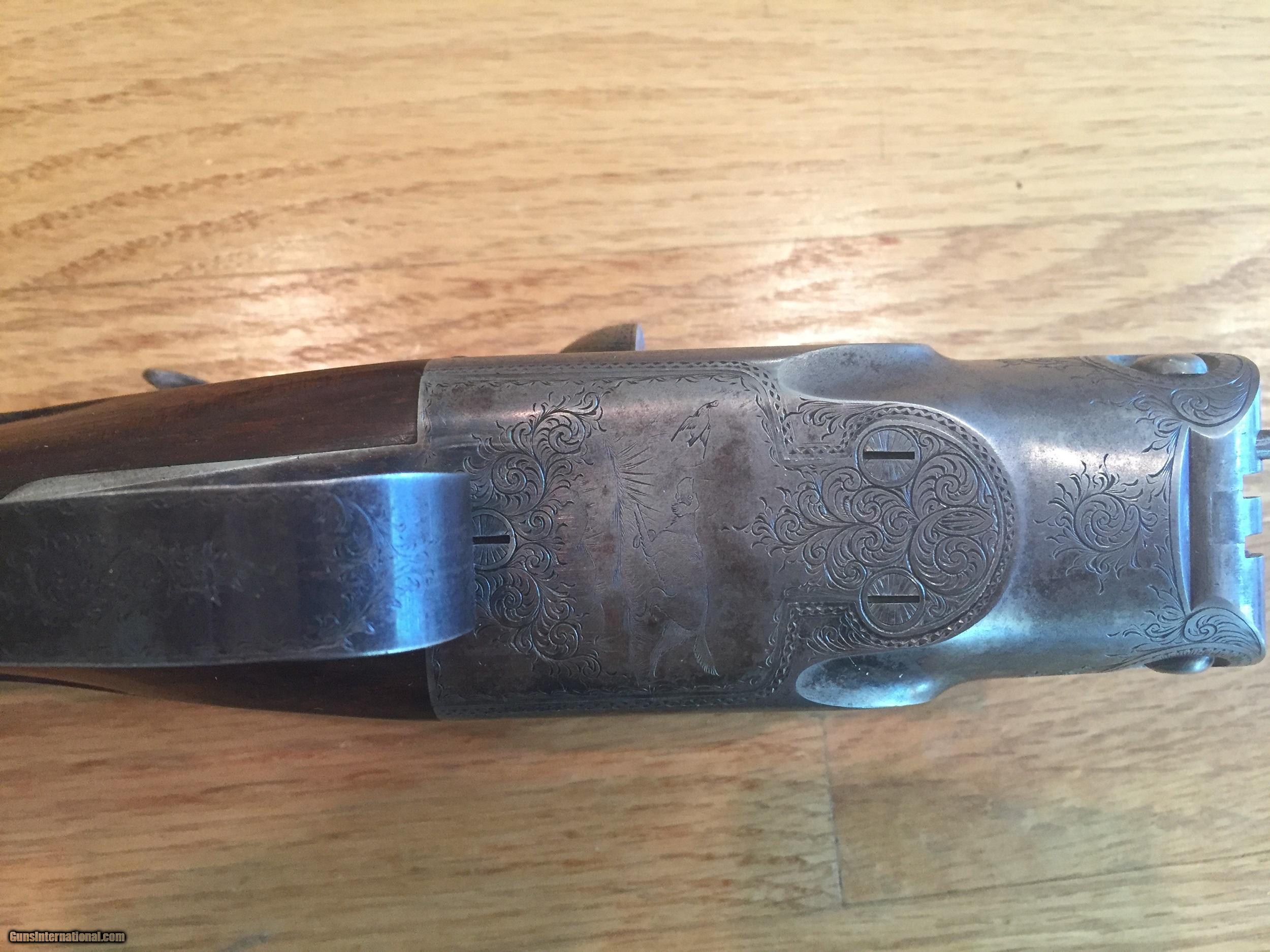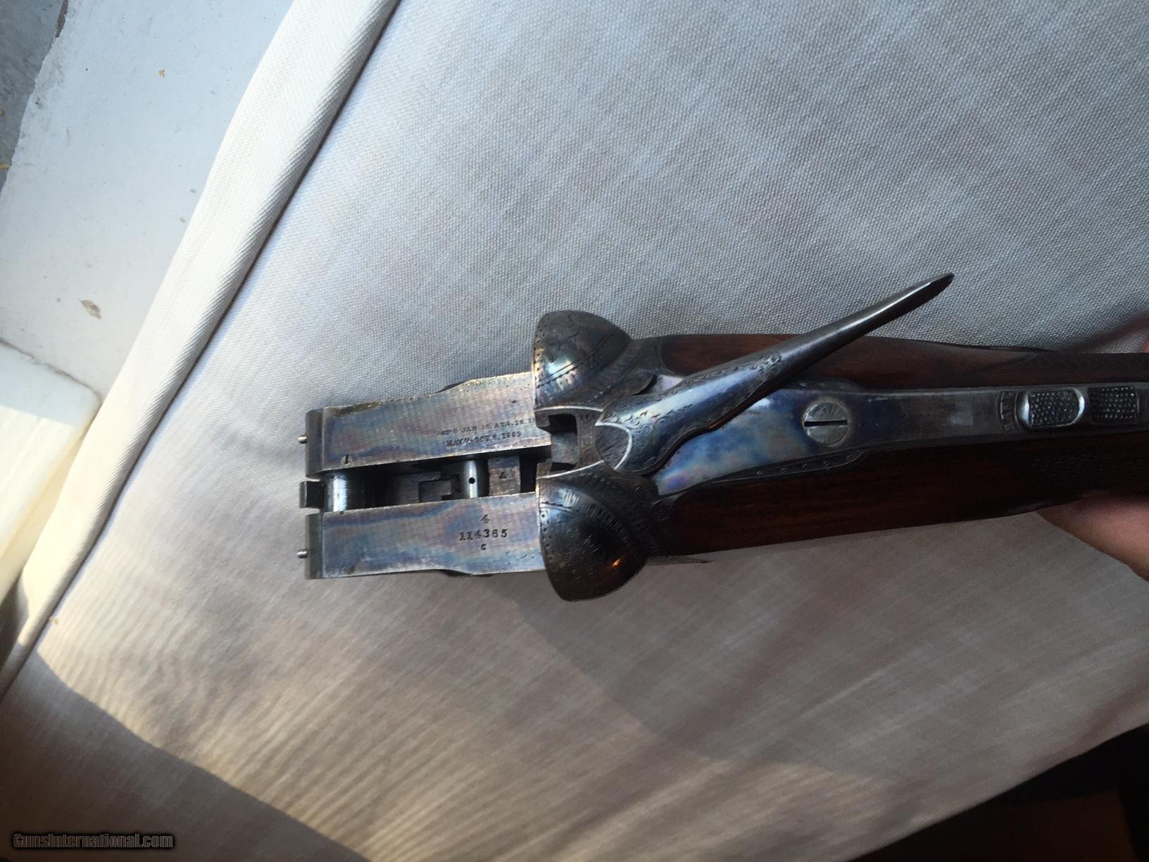 Description: All original non-molested Parker CHE side x side shotgun built in 1902 on a #2 frame with Titanic steel bbls and a single silver sighting bead. The receiver is engraved in a typical C pattern and foliate arabesque scroll. It is stocked with beutiful streaky walnut and a skeleton steel butt. The Parker Serialization Book identifies this gun as a grade 4 with Titanic steel barrels. Only 269 12 gauge Titanic Steel barreled guns were produced and only 150 of those were straight grip. This Parker is in very good condition. The barrels retain 85-90% original blue with slight muzzle wear, normal nicks and dings, and some thinning at the breach area where the gun was carried. The receiver and fore-end metal retain 35-45% case color, especially in protected areas (see photos). The trigger guard is "silver-gray" where the palm holds the grip, while all blue remains through the bow, along with case color darkening in guard. The wood is sound and beautiful with the usual light nicks and scratches. The fore-end and grip checkering can be felt easily. The fore-end metal is silver gray but case color darkening on underside (see photos). The mechanics are crisp. The bores are shiny and bright, but right barrel has one minor dent near muzzle (see photo). All serial numbers are matching. Price: $14,250.00 seller pays shipping and insurance Manufacturer: Parker Model: CHE Serial Number: 114XXX Ejectors: Yes Barrels: 30 in Barrel Type: Solid Rib Action: SxS Triggers: Double Triggers Gauge: 12 ga Stock: Nicely Figured Wood Stock Comb: 1 3/4 in Stock Heel: 2 7/16 in Fore End: Splinter Fore-end Butt: Skeleton Steel LOP: 14 1/4 in Weight: 8 lbs 3 ozs SOLD Curio/Relic: Yes Manufacturer: Parker Bros. Model: CHE Serial Number: 114XXX Ejectors: Yes Barrels: 30 Triggers: Double Gauge Info: 12 Stock: Straight Grip Stock Comb: 1 3/4 Stock Heel: 2 7/16 Fore End: Splinter Butt Pad: Skeleton Steel LOP: 14 1/4 Rib: Solid Manufacture Date: 1902 Engraving: C |
