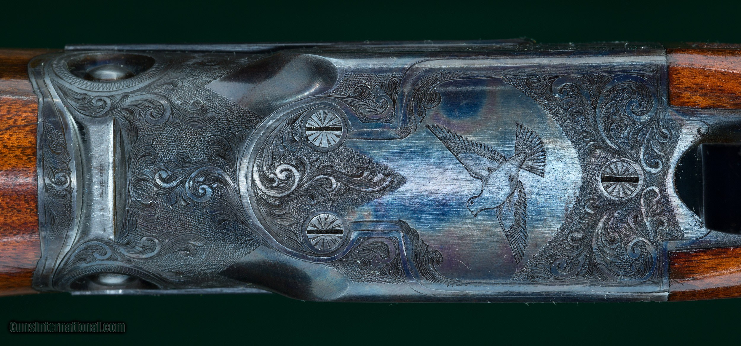 Description: 32" matted vent-rib barrel with ivory front bead choked full. 14 1/2"pull to solid black Kick-Eez recoil pad. 1 3/8" - 2" drop. No cast. Deluxe checkered, figured walnut stocks with Deeley-release beavertail forend, capped pistol grip, and vacant silver oval. Fine scroll engraved receiver with pigeon on the underside. Automatic ejector. No safety. Weight: 8lbs. Built 1928. Retaining 99% barrel blue, 97% case colors. SOLD Curio/Relic: Yes |