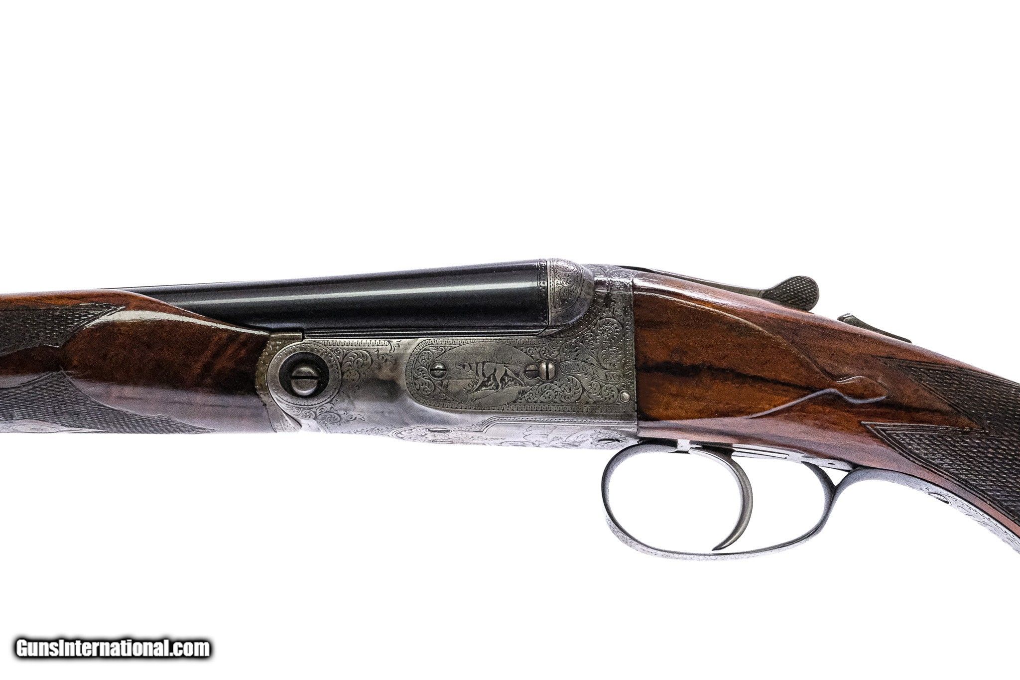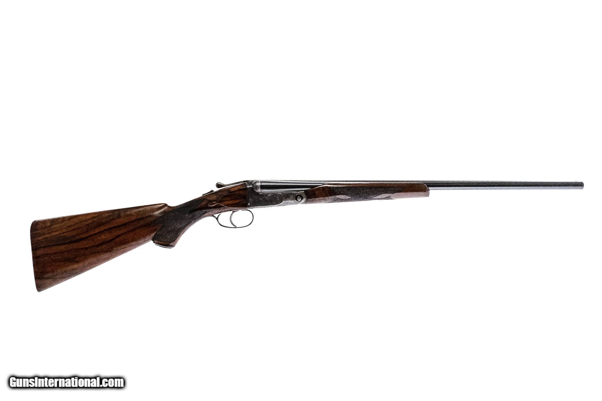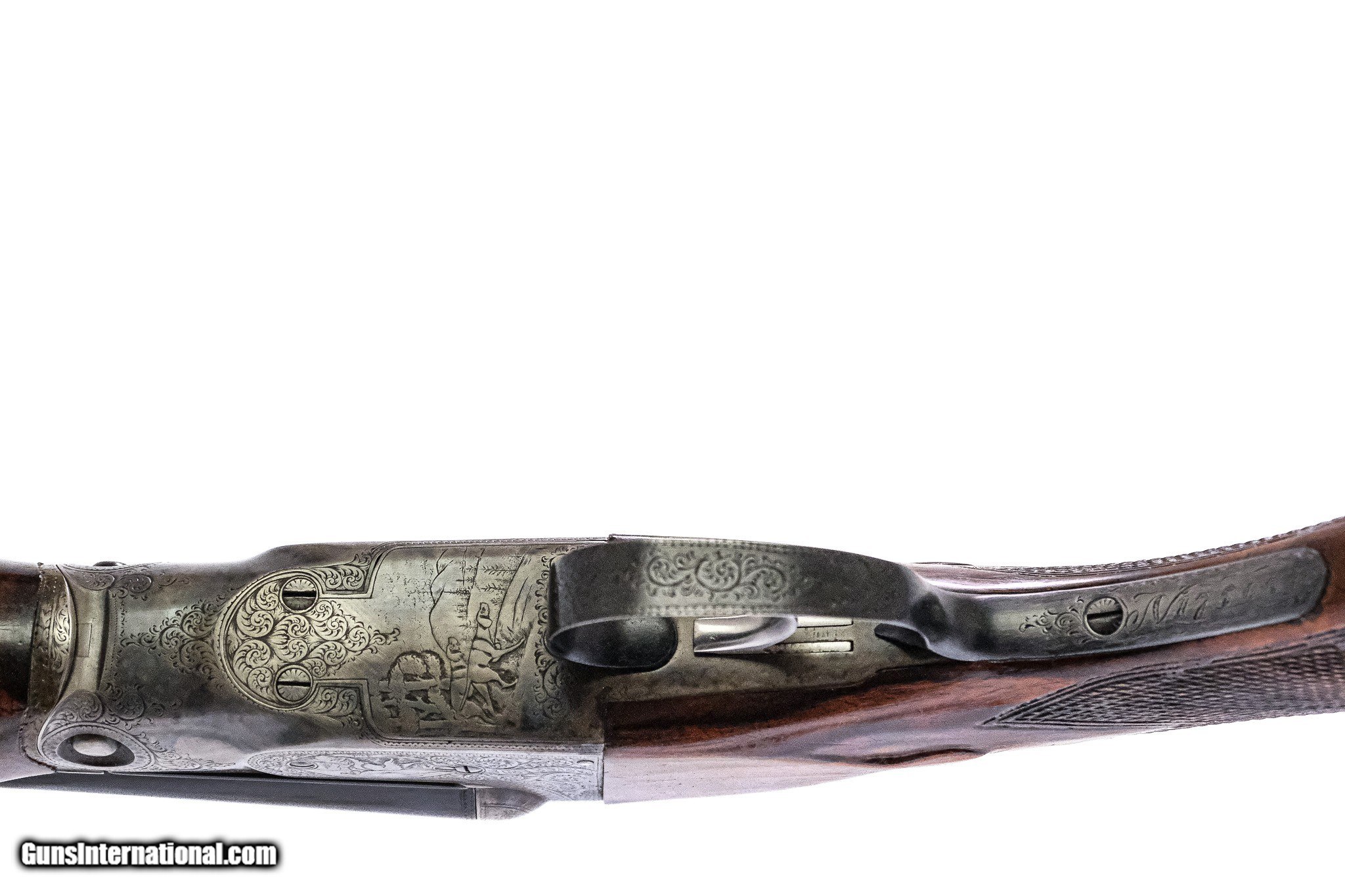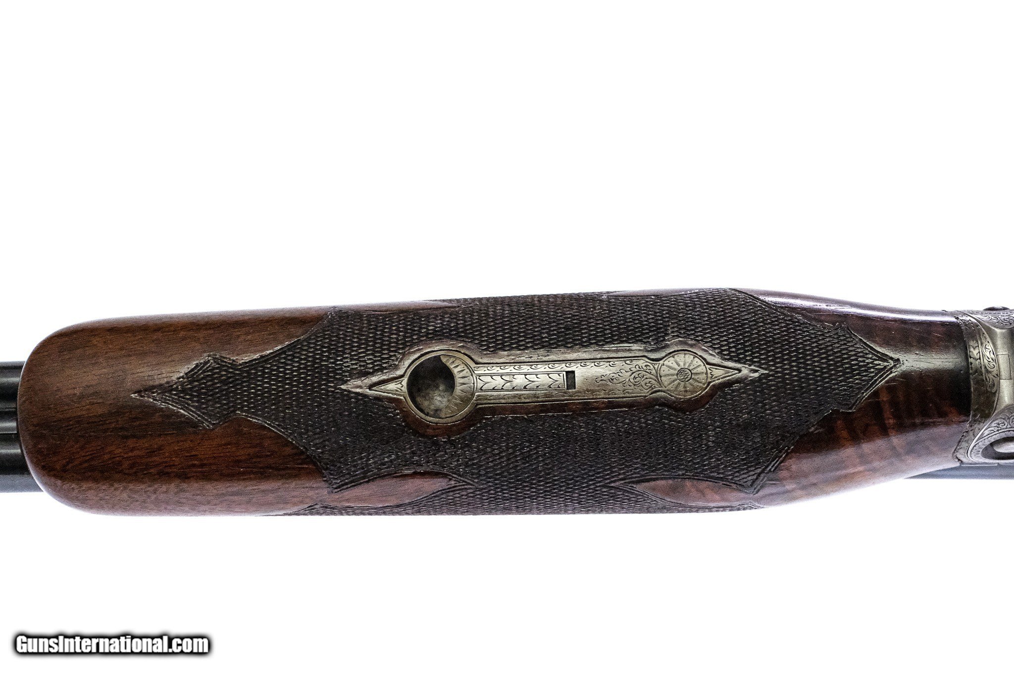 Description: Parker - CHE Grade, SxS, 00 Frame, 28ga. 24" Barrels Choked M/F. Very rare, factory original , factory letter, Acne steel barrels, matte rib, twin ivory sights, replacement beavertail forend, large percentage of case coloring, magnificent engraving of setters and pointers and scroll. This is a very detailed high-grade gun, small bore, single trigger, auto ejector, non-auto safety, checkered butt, French walnut, drop point, excellent screws, 98% Blue, very rare hard to find gun! That is a genuine CHE with 24 in barrels, light weight. The wood finish has crazed lightly with age. CAPPED pistol grip, Beautiful French Walnut! Just a gun that shows very well in a very rare configuration. Super high-grade small-bore parker. Inv: 70165 5 lbs. 10 oz. 13 7/8" x 1 ½" x 2 ¾" $32,500.00 SOLD |