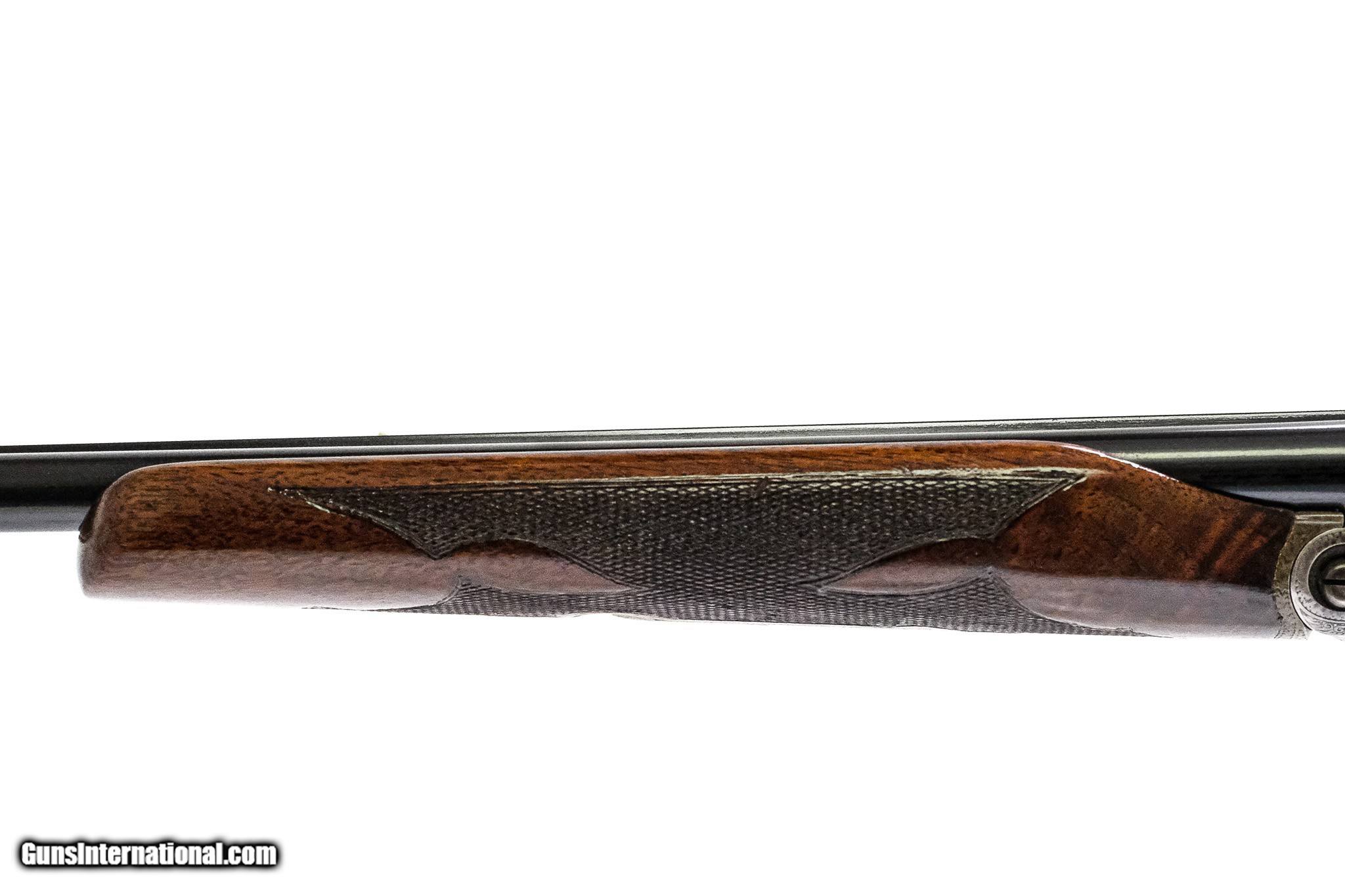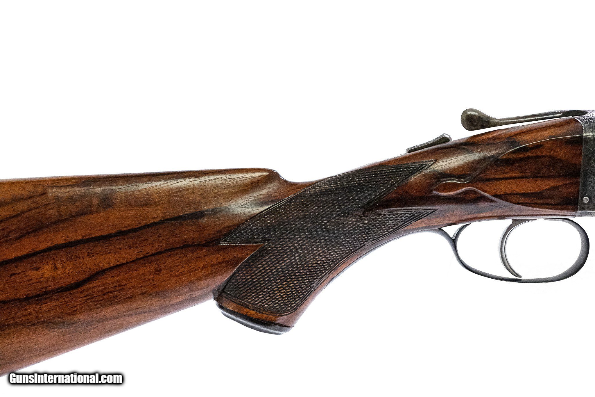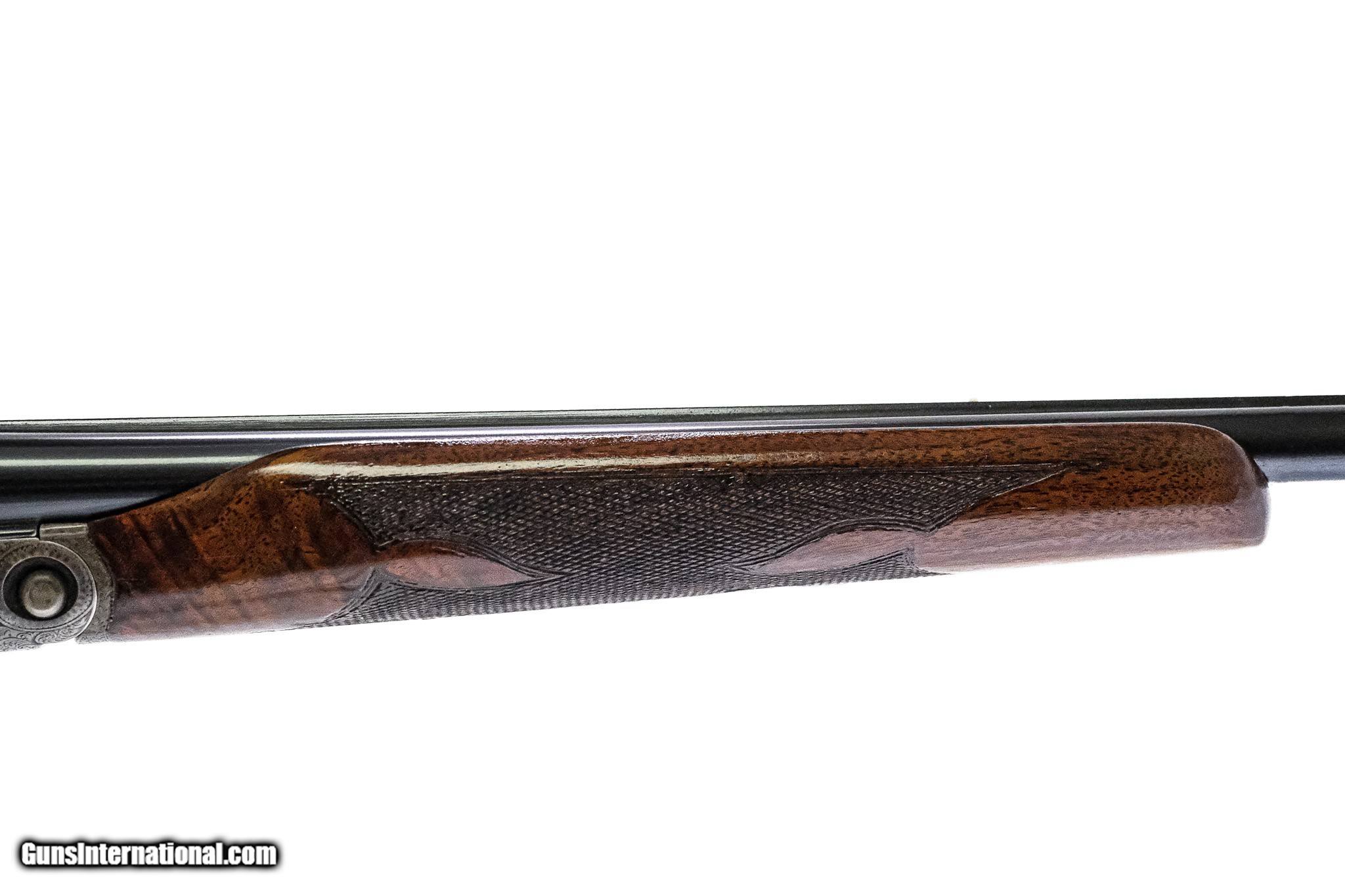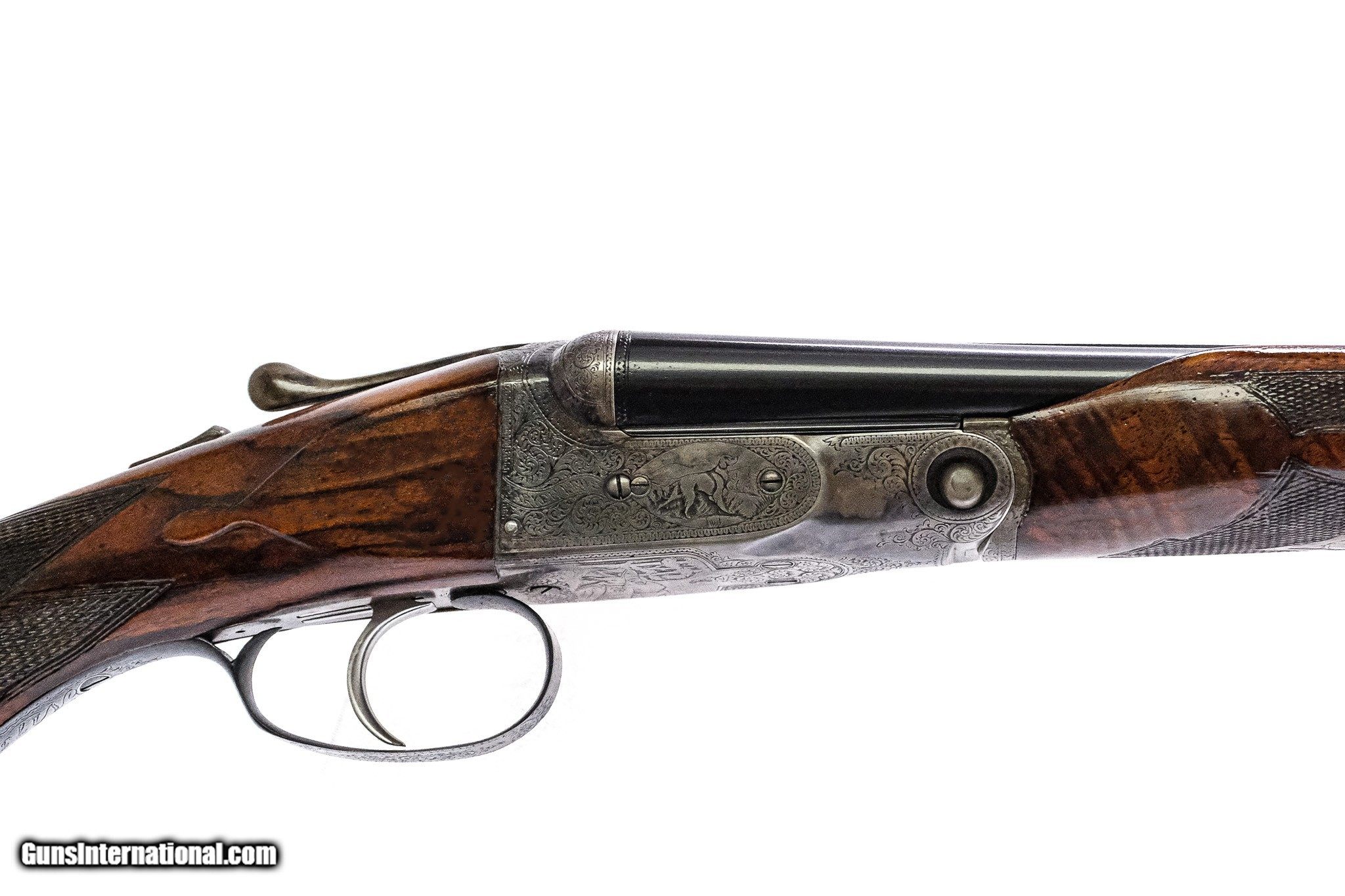 Description: Parker - CHE Grade, SxS, 00 Frame, 28ga. 24" Barrels Choked M/F. Very rare, factory original , factory letter, Acne steel barrels, matte rib, twin ivory sights, replacement beavertail forend, large percentage of case coloring, magnificent engraving of setters and pointers and scroll. This is a very detailed high-grade gun, small bore, single trigger, auto ejector, non-auto safety, checkered butt, French walnut, drop point, excellent screws, 98% Blue, very rare hard to find gun! That is a genuine CHE with 24 in barrels, light weight. The wood finish has crazed lightly with age. CAPPED pistol grip, Beautiful French Walnut! Just a gun that shows very well in a very rare configuration. Super high-grade small-bore parker. Inv: 70165 5 lbs. 10 oz. 13 7/8" x 1 ½" x 2 ¾" $32,500.00 SOLD |