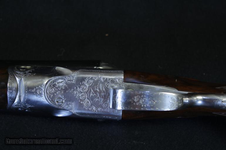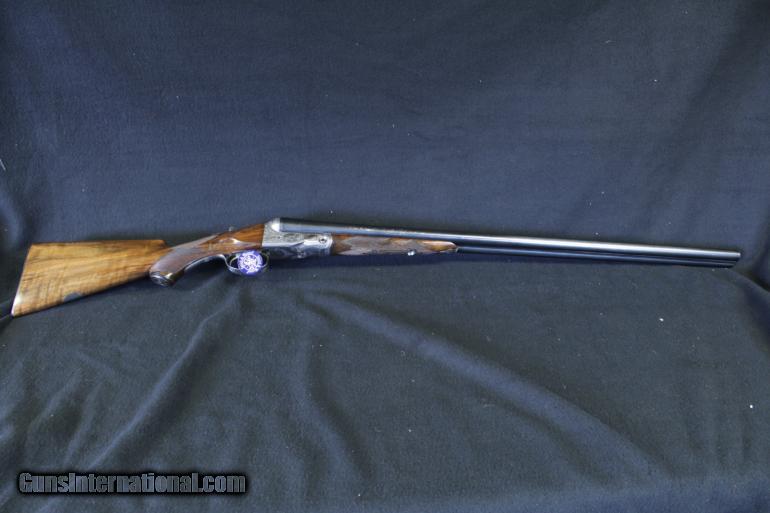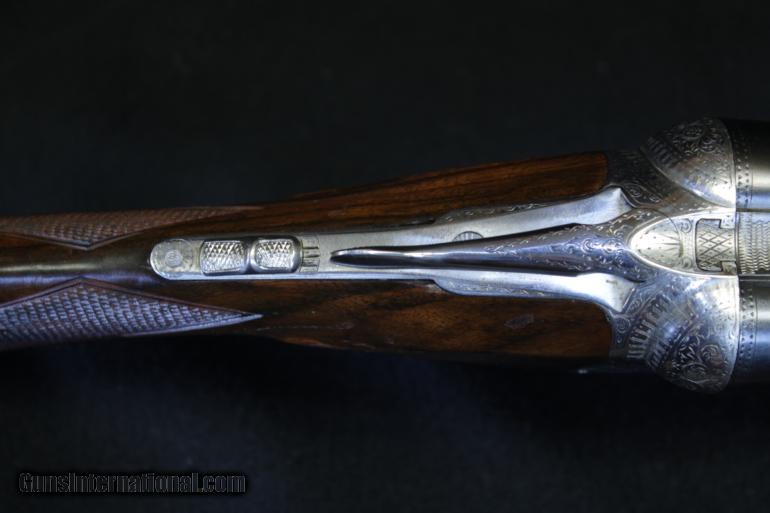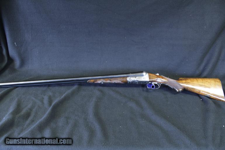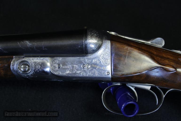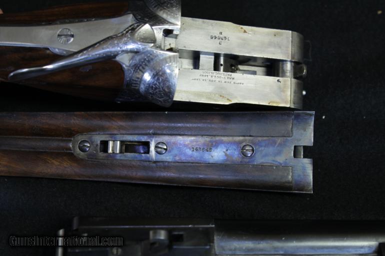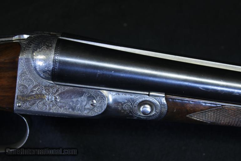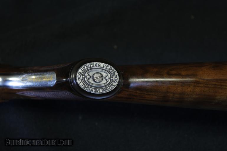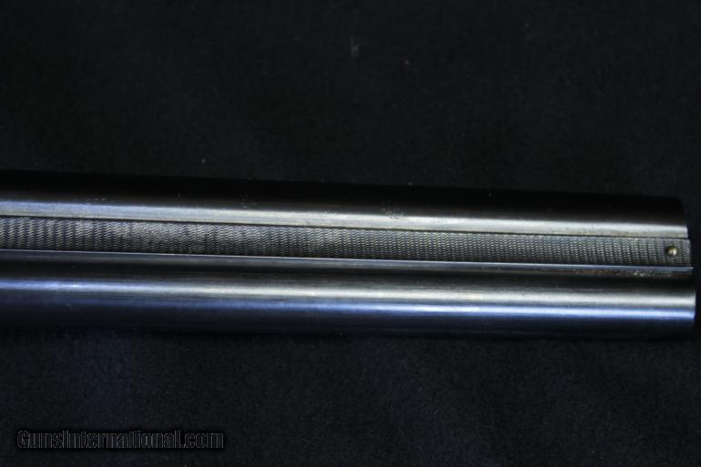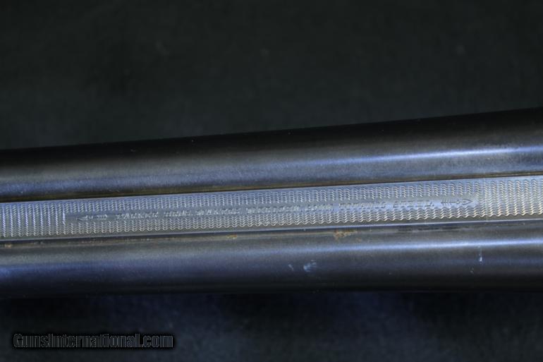 Description: Parker D grade #2 frame 12 ga. 30” mod x full, extractor double triggers, Titanic Barrels. S/N 143646 Gun has had the receiver, forend latch and tip, trigger guard, triggers polished bright while the interior of the frame and back of forend iron show original case color. The engraving is still strong and hasn’t been polished away, screw heads are not pristine. Stock has been shortened to 13 ½” lop with 1 ½” D.A.C and 2 3/6” D.A.H. It has initial shield and grip cap, The skeleton butt plate was refit the wood was refinished and the checkering was recut and all look very good. The barrels show light scratching above the for end almost like rub marks, I believe they were re blued with some light surface rust having been on the top rib about 5” back from muzzle. The Parker name and serial number are done in gold. Bores are bright and barrels ring true, The lock up is tight even with the forend off, the lever is right of center. SOLD Curio/Relic: Yes |