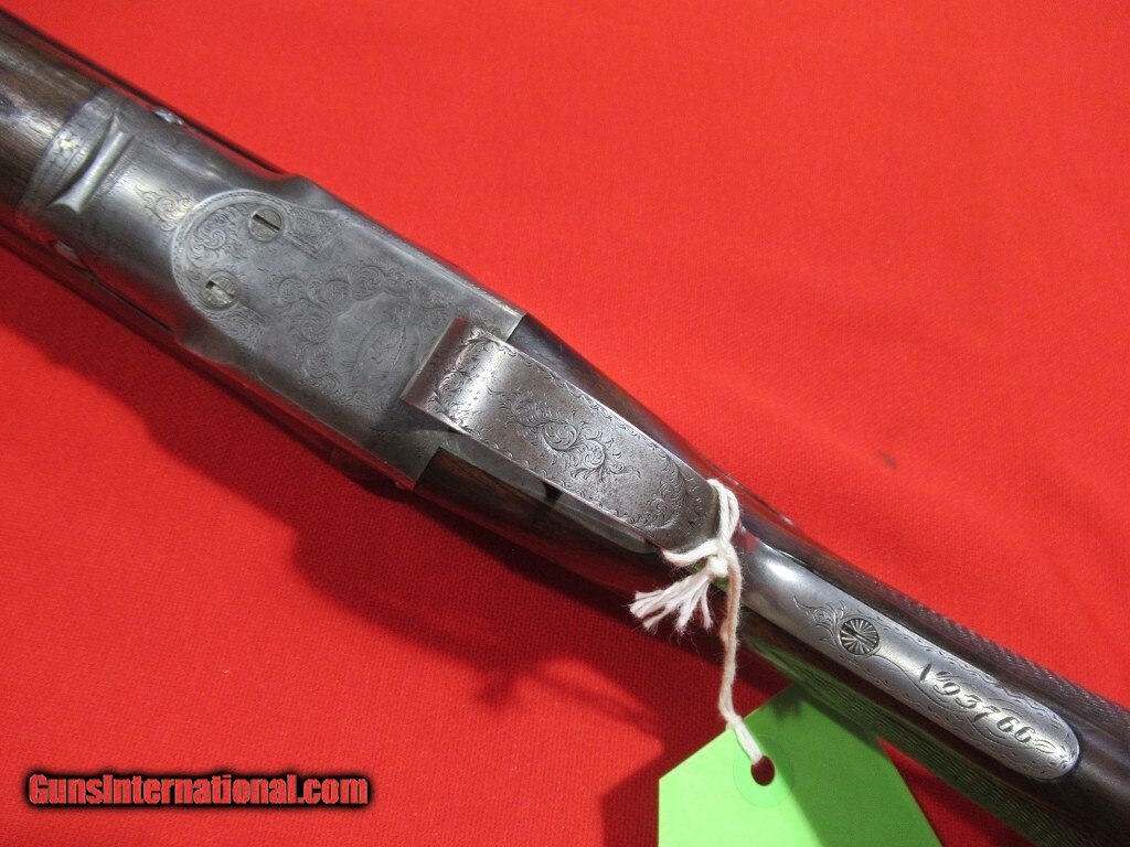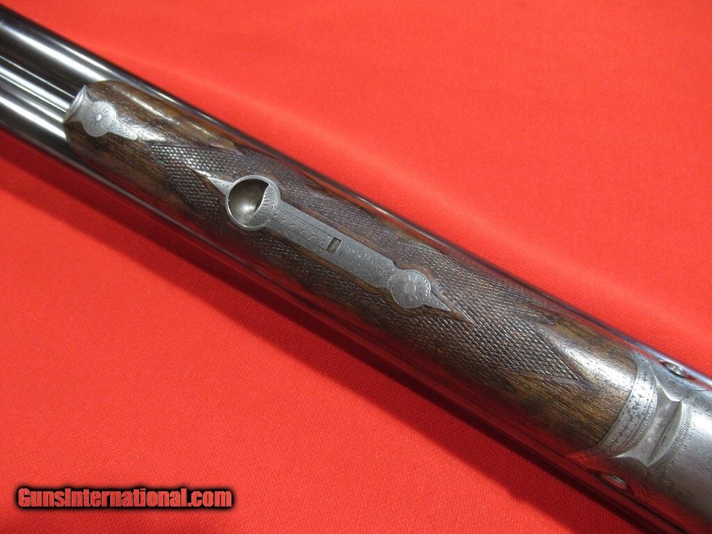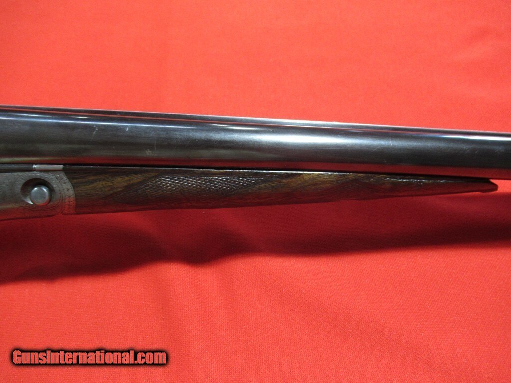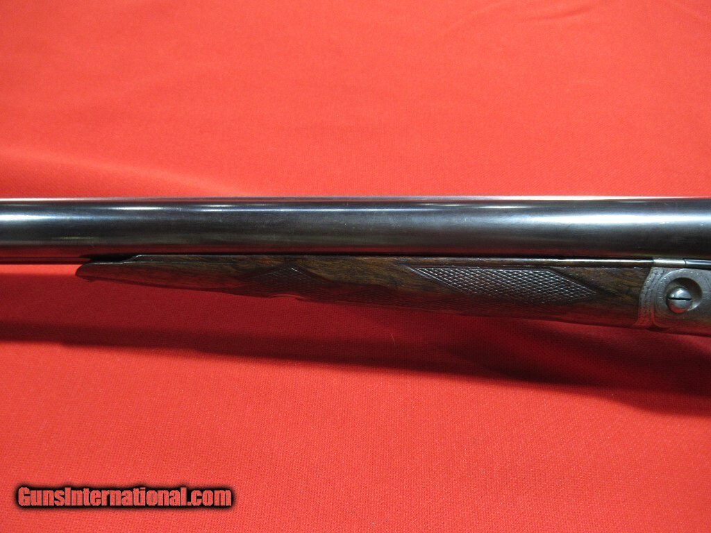 Description: 93xxx serial number range DH manufactured in 1899: Titanic steel barrels, capped pistol grip, double trigger, splinter forearm, twin ivory beads, automatic safety. The barrels have been reblued and the stock refinished. The right side features a setter flushing an upland bird, a pointer on the left side, and a fox stalking two pheasants on the bottom. The stock measures 1 1/2" x 2" x 13 5/8" with 12 5/8" of wood and weighs 7 pounds 8 ounces. The barrels measure .732" on the bores with .022" of choke in the right barrel and .037" of choke in the left. Price: $3,500.00 Contact Seller |