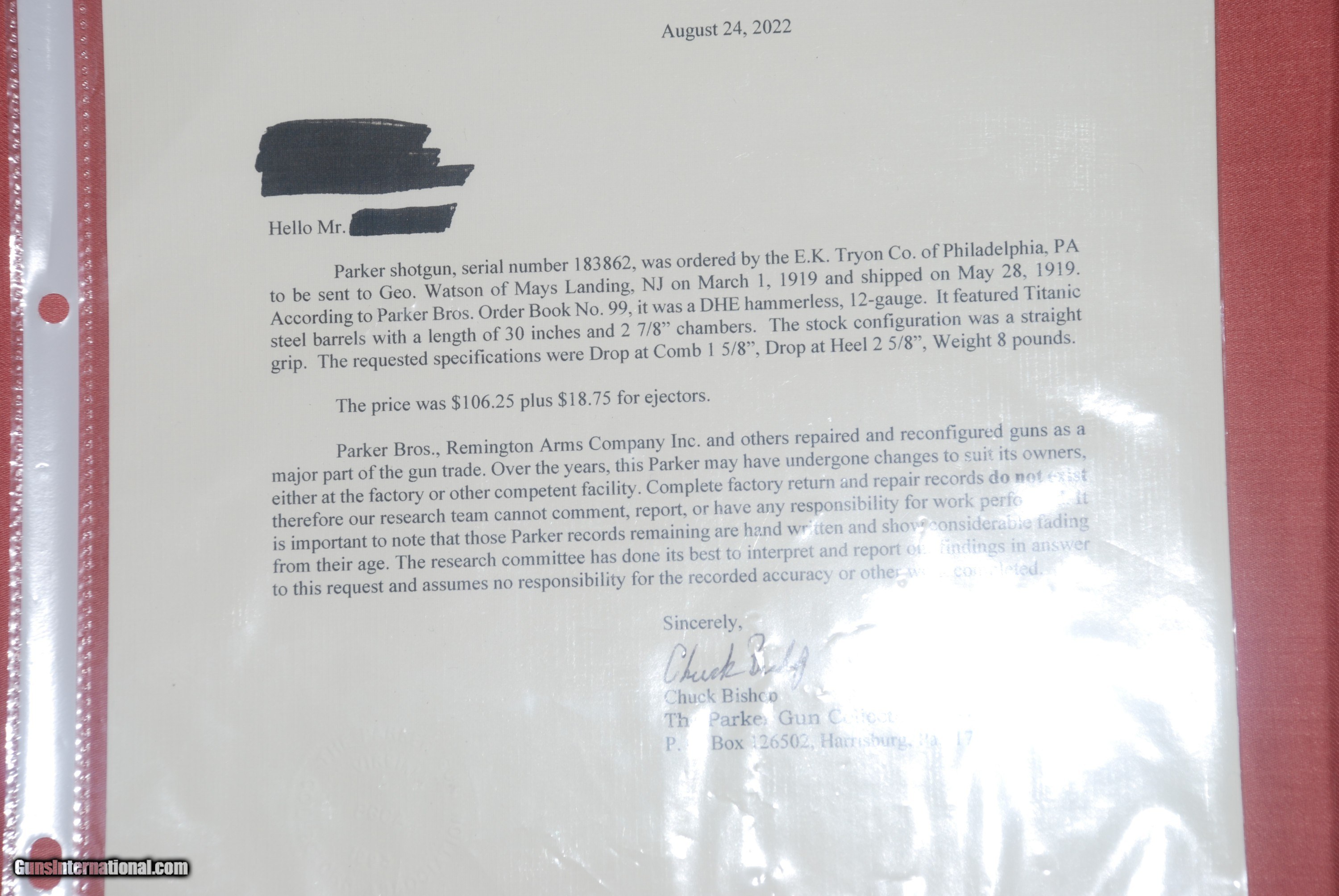 Description: This is a beautiful restored straight grip 12ga on a number 2 frame. The barrels are 30 inch, choke modified and improved cylinder with mirror bores The lop is 14" the dah is 2 5/8' and the dac is 1 5/8' The barrels are Titanic Steel and 2 3/4 inch chambers. The gun has a Miller trigger and it comes with a Parker Club Letter. I am not a dealer so please make sure your dealer will accept a copy of my driver's license. Shipping to the lower 48 is $100.00 SOLD Curio/Relic: Yes |