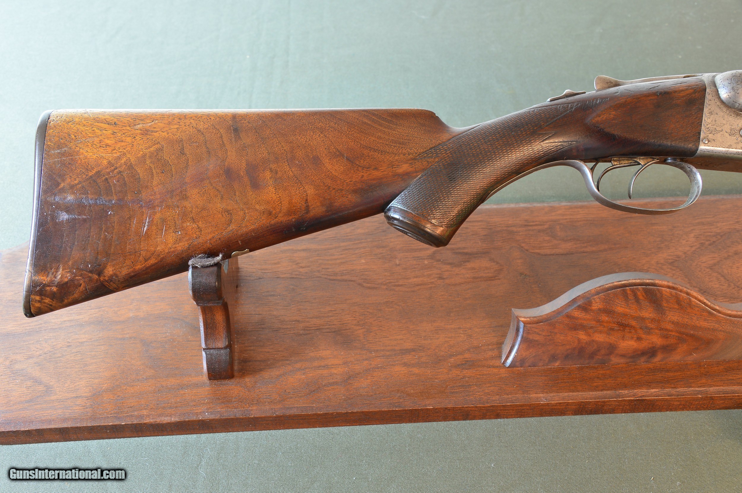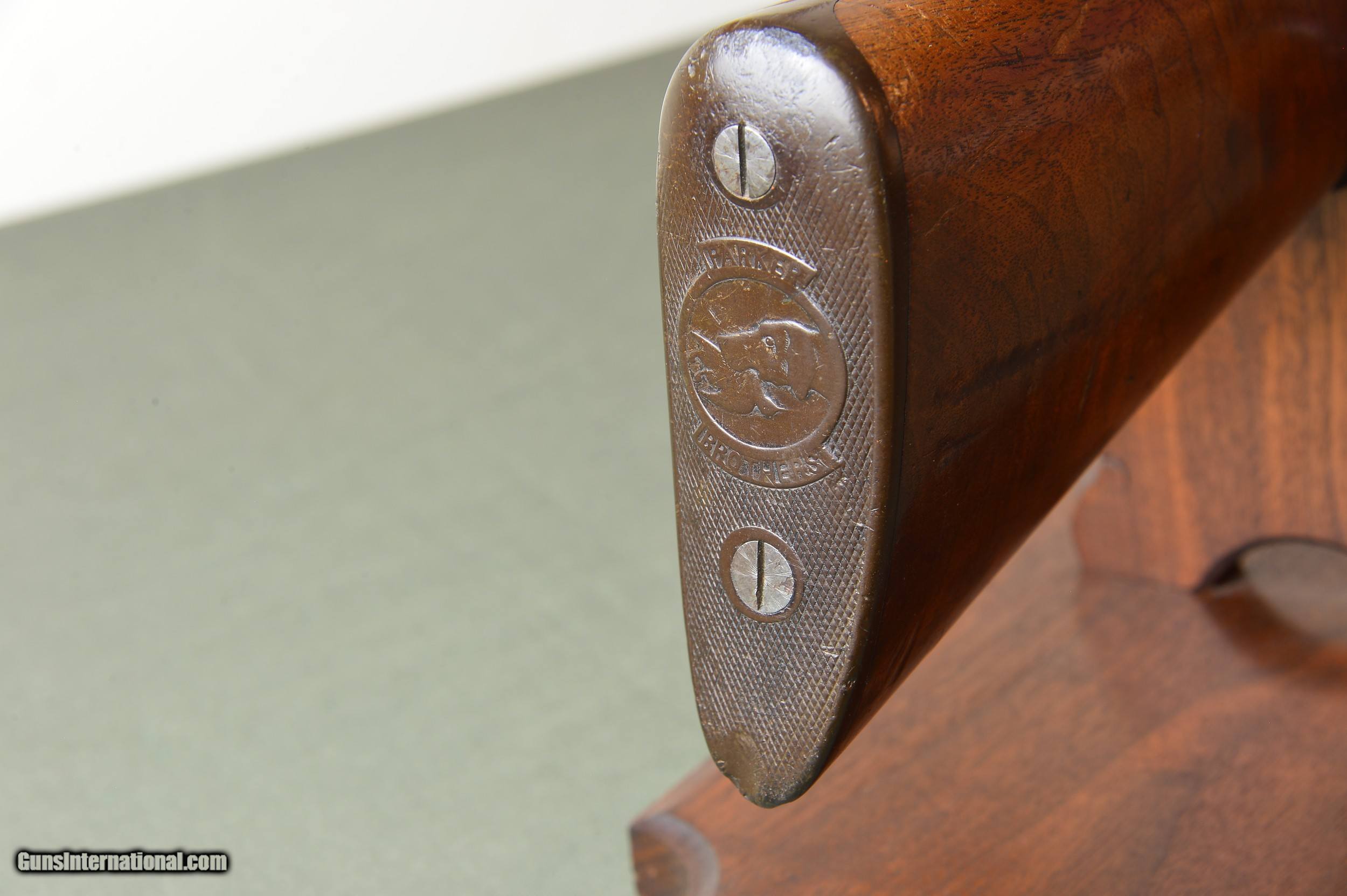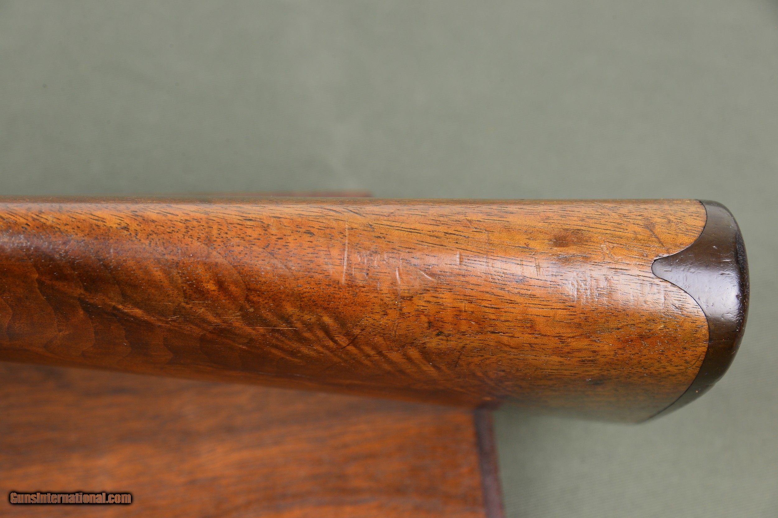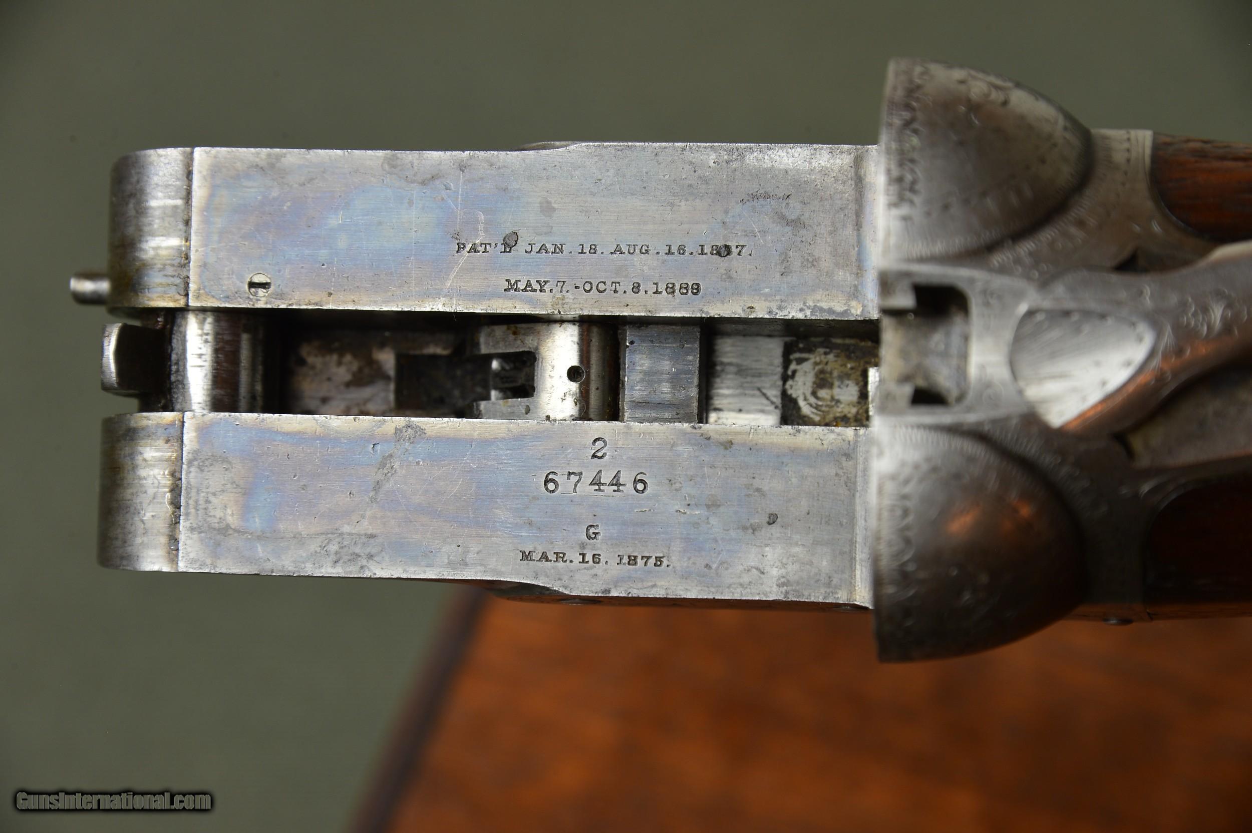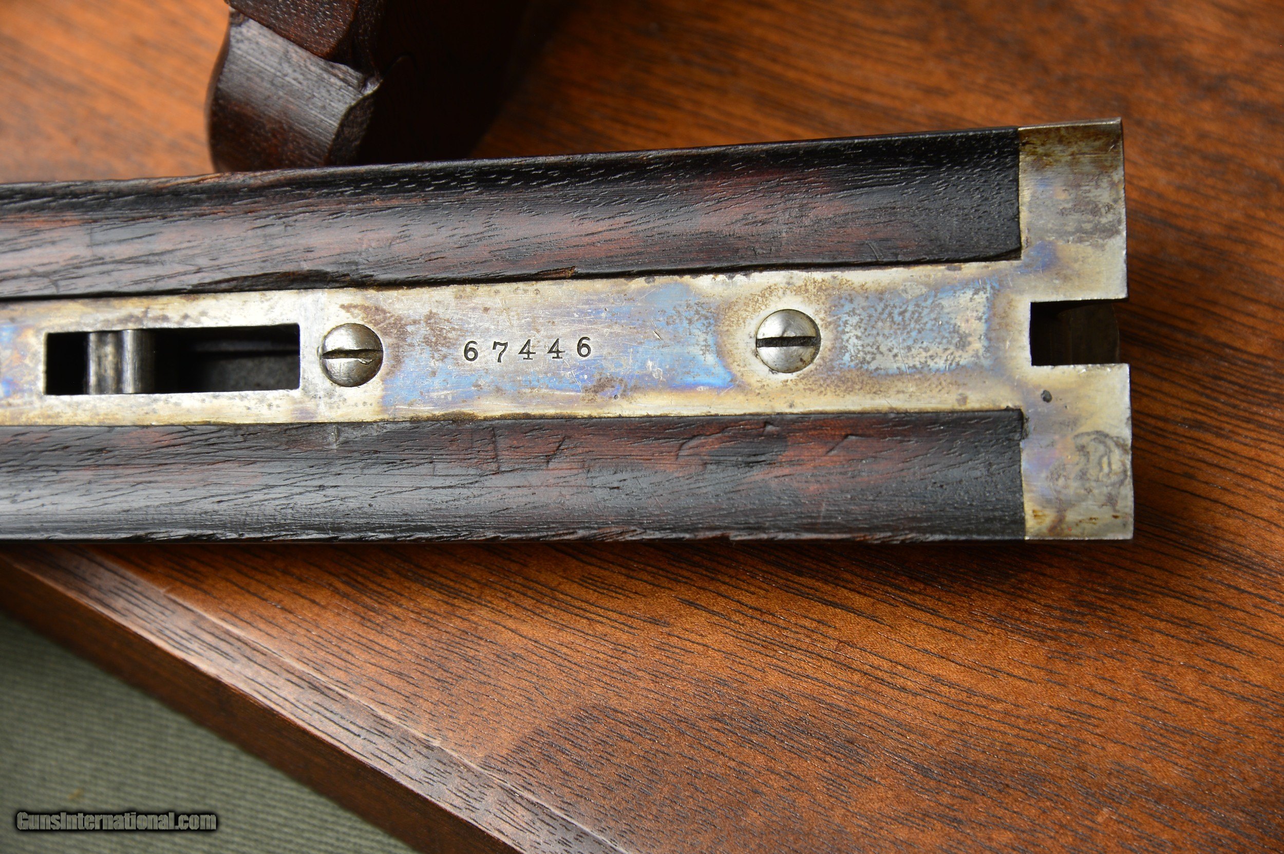 Description: *** SOLD *** A handsome Parker GH in good shootable condition. Appears to be unaltered with the possible exception of the chokes. Parker number 67446 was made in 1891 and has its original 2-5/8” chambers. It is a Number 2 grade built on the Number 1 frame. It has extractors, double triggers, auto safety and the neat fishtail toplever. There is residual case coloring on the inside of the forearm iron and the action water table and breech face. Overall weight is 7lb 9oz so it handles very nicely. *** The 30” barrels are made of Damascus steel. The bores are in fairly good shape with only a few mild pits and some staining. The barrels are topped by a raised solid concave Damascus rib. The right barrel is bored 0.754 with a constriction of 0.014 for an Improved Cylinder choke. The left barrel is bored 0.755 with a constriction of 0.044 for Full choke. *** The pistol grip stock sports the factory grip and the factory buttplate. The wood is nicely figured but shows normal wear for its age as does the checkering. A little TLC would go a long way with this stock as it is a very nicely figured piece of American walnut. Length of Pull is 14” including the thin factor buttplate. *** Nice Parker ready to be put back to work. *** The photographs are part of the description. Not for sale where prohibited by state or local laws. Buyer is responsible for all shipping, insurance, and any other related charges. I give a 3-day non-firing inspection period and will only accept returns at buyer’s expense SOLD Antique: Yes |