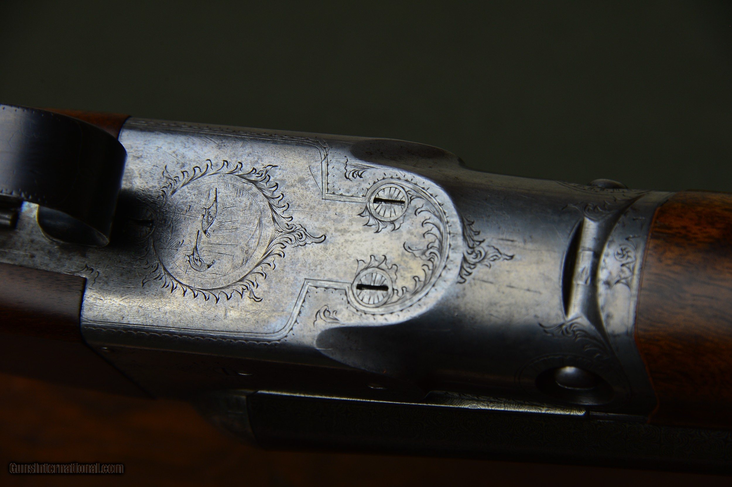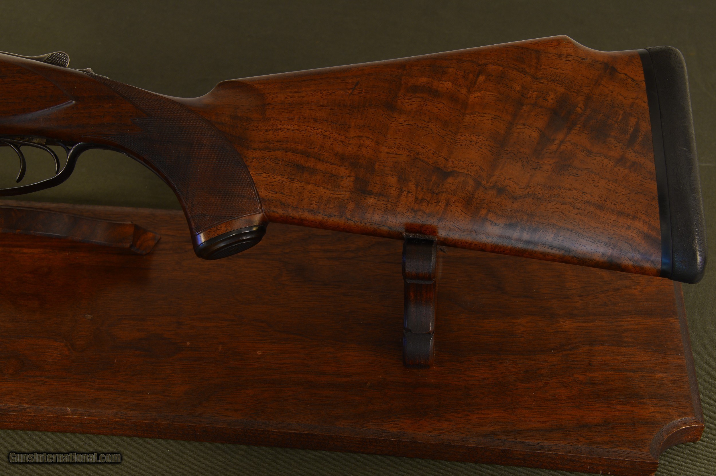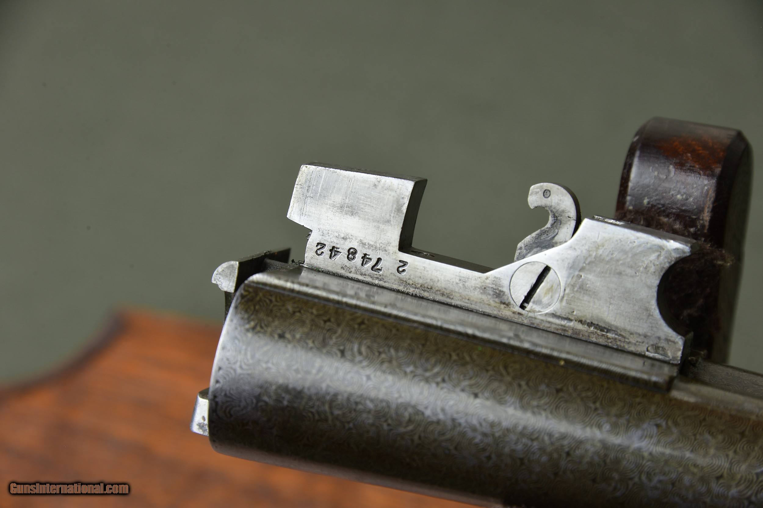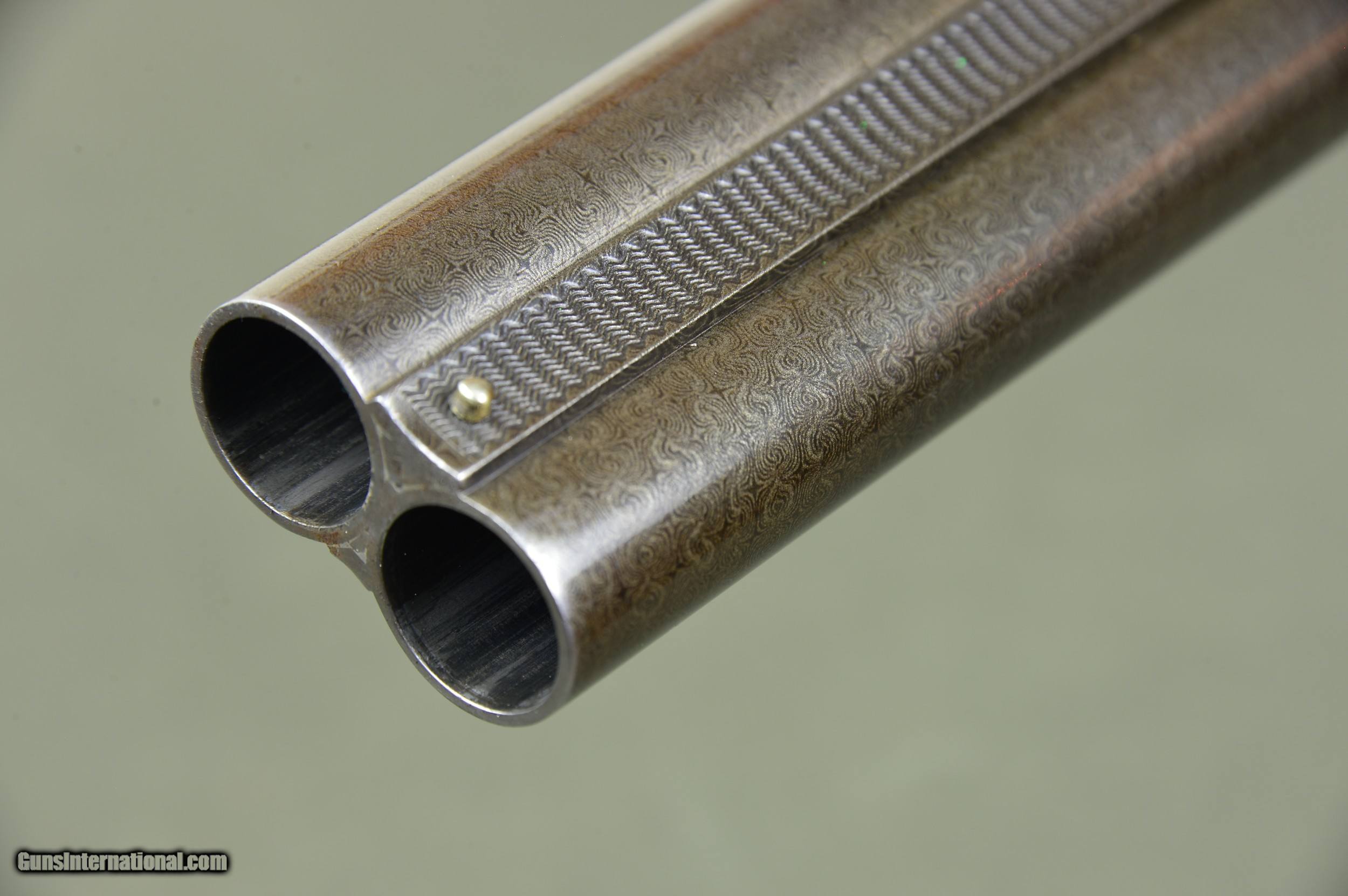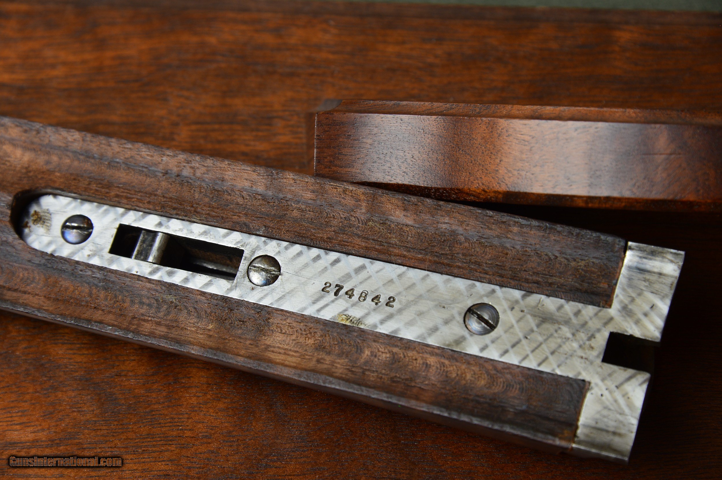 Description: *** SOLD *** A handsome Parker GH in very good shootable and cosmetic condition. Tight on face. Parker number 74842 has 32” highly figured Damascus barrels. It is a Number 2 grade built on the Number 2 frame. It has extractors, double triggers, and auto safety. *** The 32” barrels are made of Damascus steel. The chambers have been lengthened to 2-3/4”. The bores are shiny with only a little mild pitting. The barrels are topped by a raised solid concave crosshatched Damascus rib which has silver mid and front beads. The right barrel is bored 0.733 with a constriction of 0.033 for an Full choke. The left barrel is is also bored 0.733 with a constriction of 0.033 for Full choke. *** The pistol grip stock has a right hand palm swell for a firm grip and the factory pistol grip cap has been retained. The wood is highly figured American walnut from a recent professional restocking by Wenig. Checkering is crisp. The original stock and forearm are included. Length of Pull is 15-1/8” including a 1” recoil pad by 1-5/8” Drop at Comb by 1-5/8” Drop at Monte Carlo by 2-1/4” Drop at Heel. Cast off for the righthanded shooter. *** Now to Mystery Theater – This gun in in really great condition but someone in the past has added the number “2” to the front of the serial number so that it now reads 274842 . It is visible in the photos of the water table, barrel lug, and forearm iron but was not changed on the trigger guard. Parker people know that 274842 is outside of the serial number range of production. Is it a lunch box gun? Who knows? We can only guess. They also changed the rib label from “Damascus Steel” to “Titanic Steel”. To what end? It is important to note that the professional restocking was done recently by Wenig and was not part of the above changes. *** At the end of the day what we have is a very nice condition Parker GH ready for lots of shooting. It is a very handsome double with shootable dimensions set up for competition. *** Note that the photographs are part of the description. Not for sale where prohibited by state or local laws. Buyer is responsible for all shipping, insurance, and any other related charges. I give a 3-day non-firing inspection period and will only accept returns at buyer’s expense SOLD |