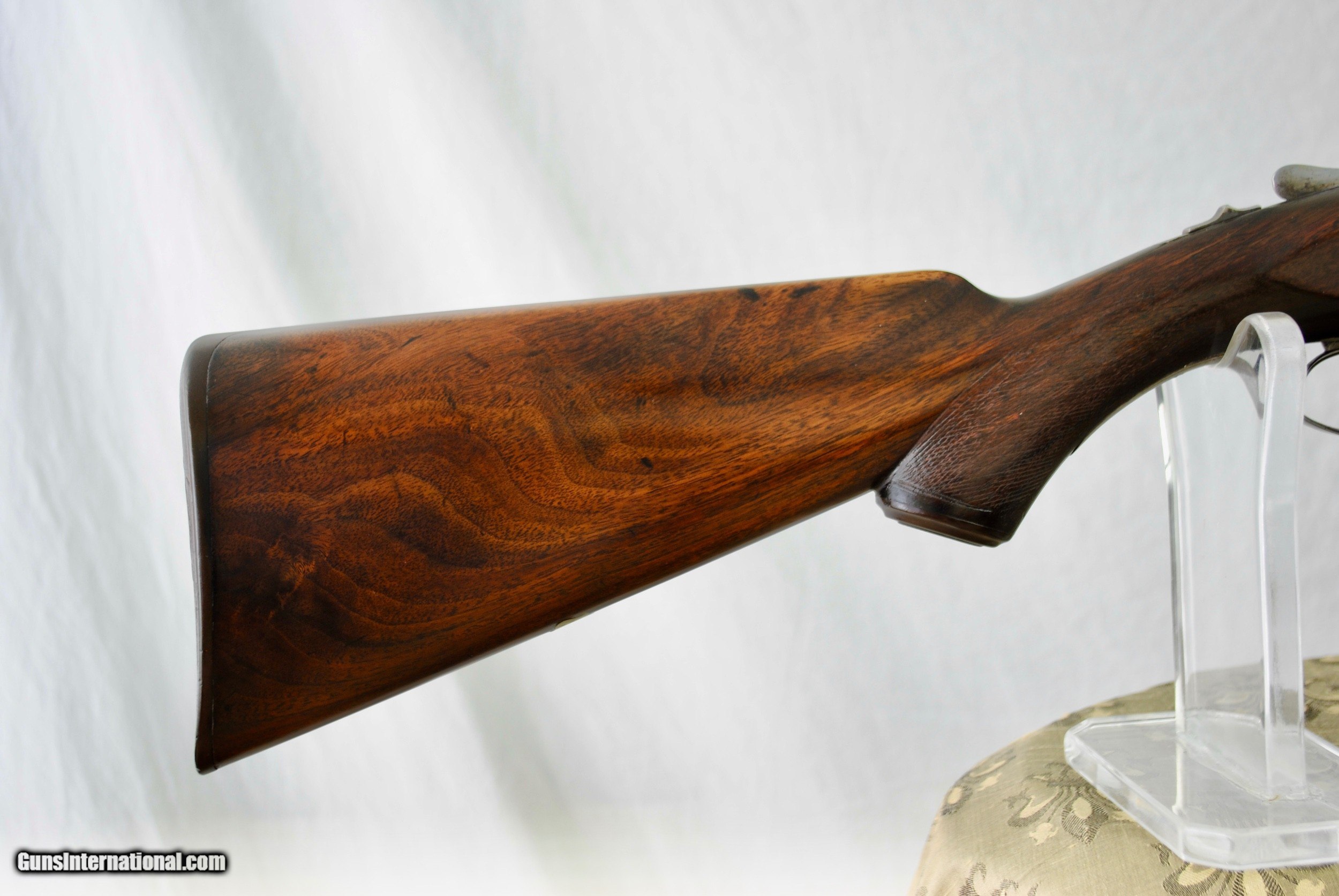 Description: Parker GH 12 gauge with heavy #2 frame / 32" barrels. Barrels still have some nice damascus pattern. Bores are exceptional for a gun that age (1899), some light crazing but mostly mirror like interiors. I would rate them 8 on a 10 scale. One small dent on left barrel (coulld not get it to show up in a photo). Barrels alone weight 4 LBS 10 3/8 OZ! Chambers measure 2 7/8". Right barrel measures .755 with 25/1000 (Imp Mod) choke while left is also .755 with 30/1000 (Full) choke. Early Parker Shotguns tend to be overbored. No loose ribs / tight on face / no cracks to wood. All matching serial numbers. Original Parker Dogs Head Buttplate. Auto safety is functional but stiff. Wood has been nicely refinished showing nice figure but not recheckered. A good recheckering job would do a lot to improve this gun. Weight of the gun is a stout 8 LBS 14 3/4 OZ. Mostly likely a waterfowl gun, it could live on as a great sporting clay gun. LOP is 14". Drop at comb is 1 11/16". Drop at heel is 3". Shipping is $50 SOLD Curio/Relic: Yes Shotgun Gauge: 12 Gauge |