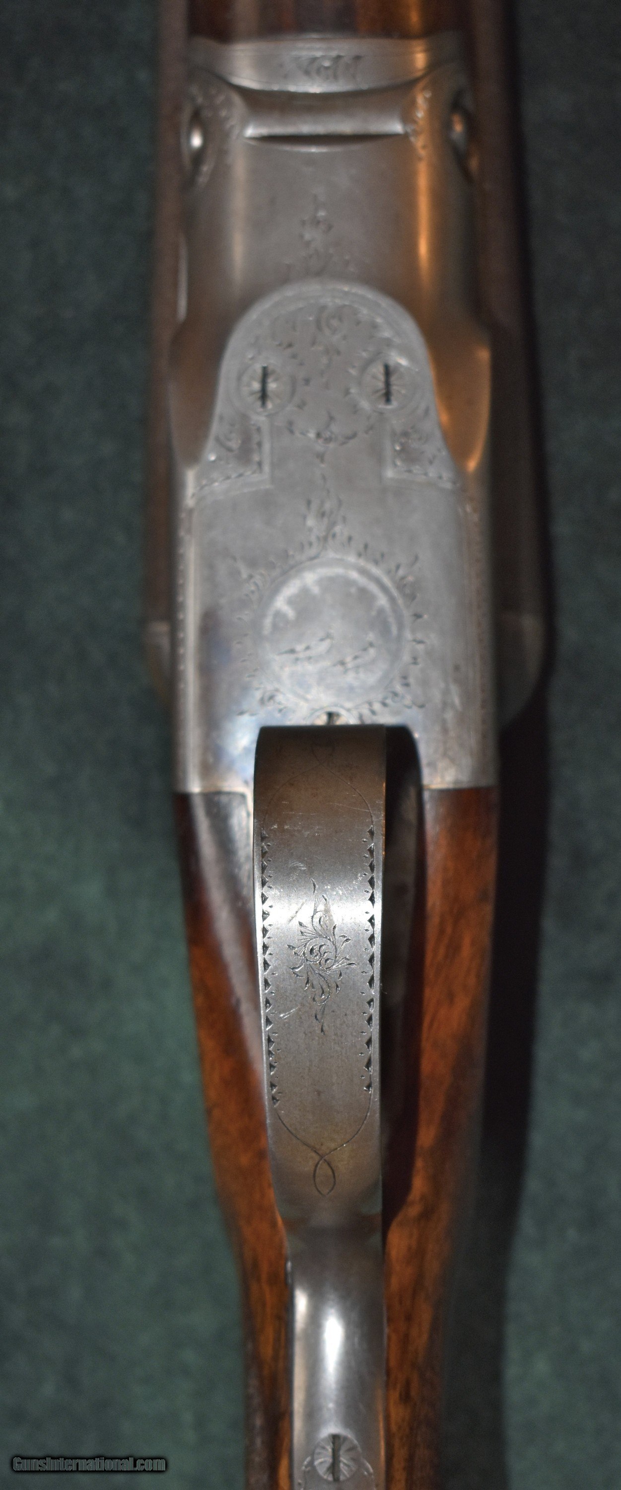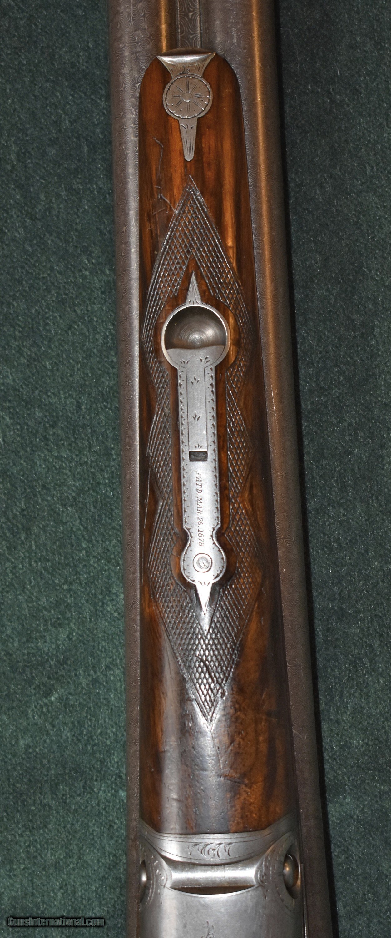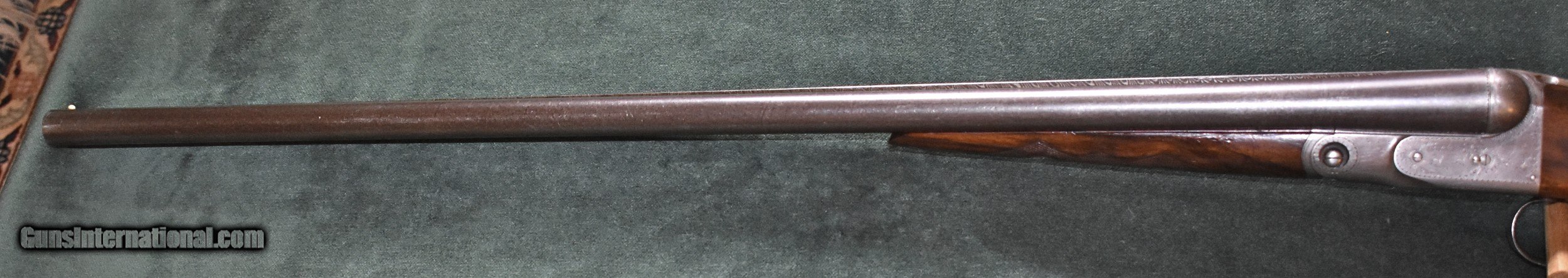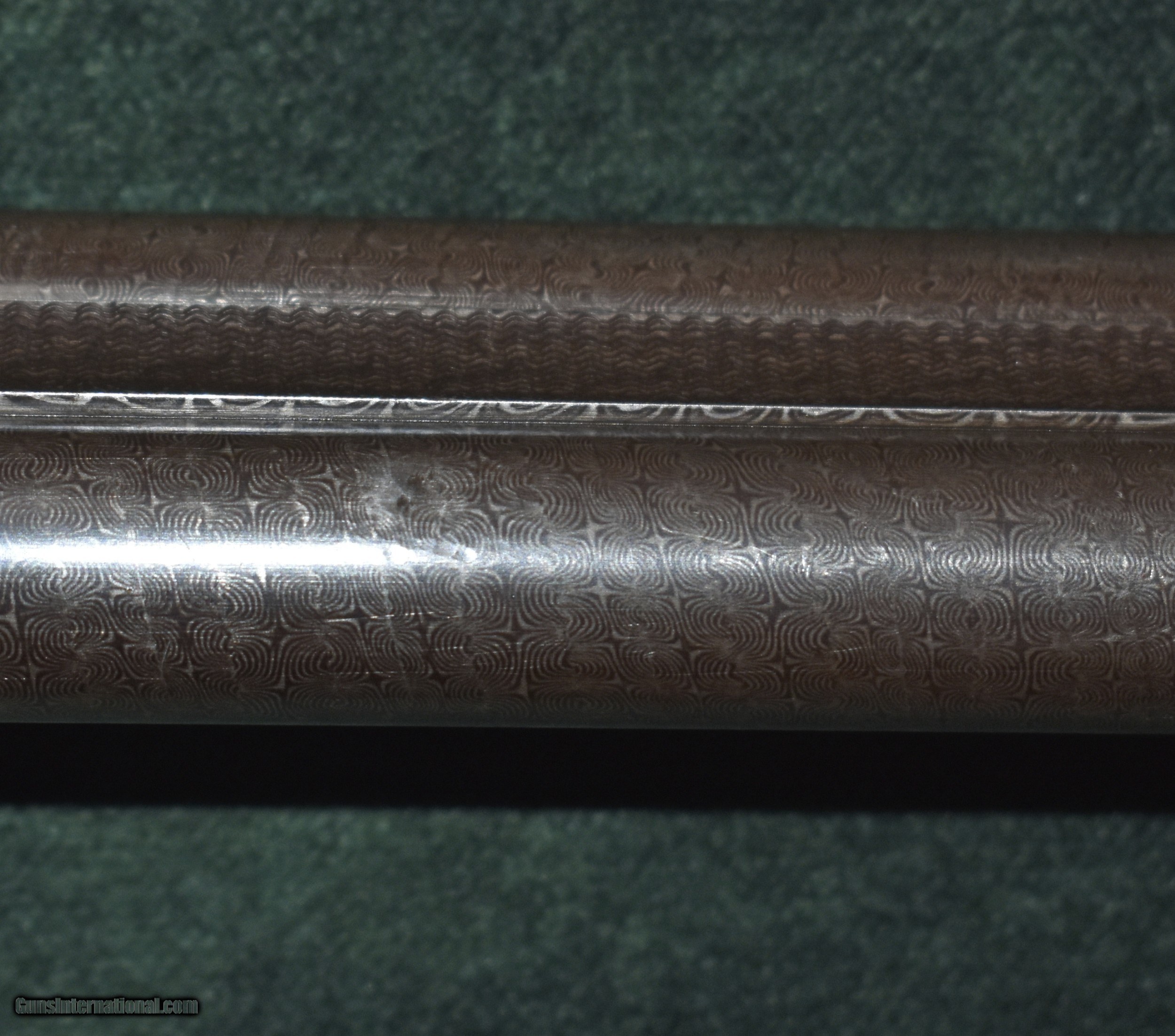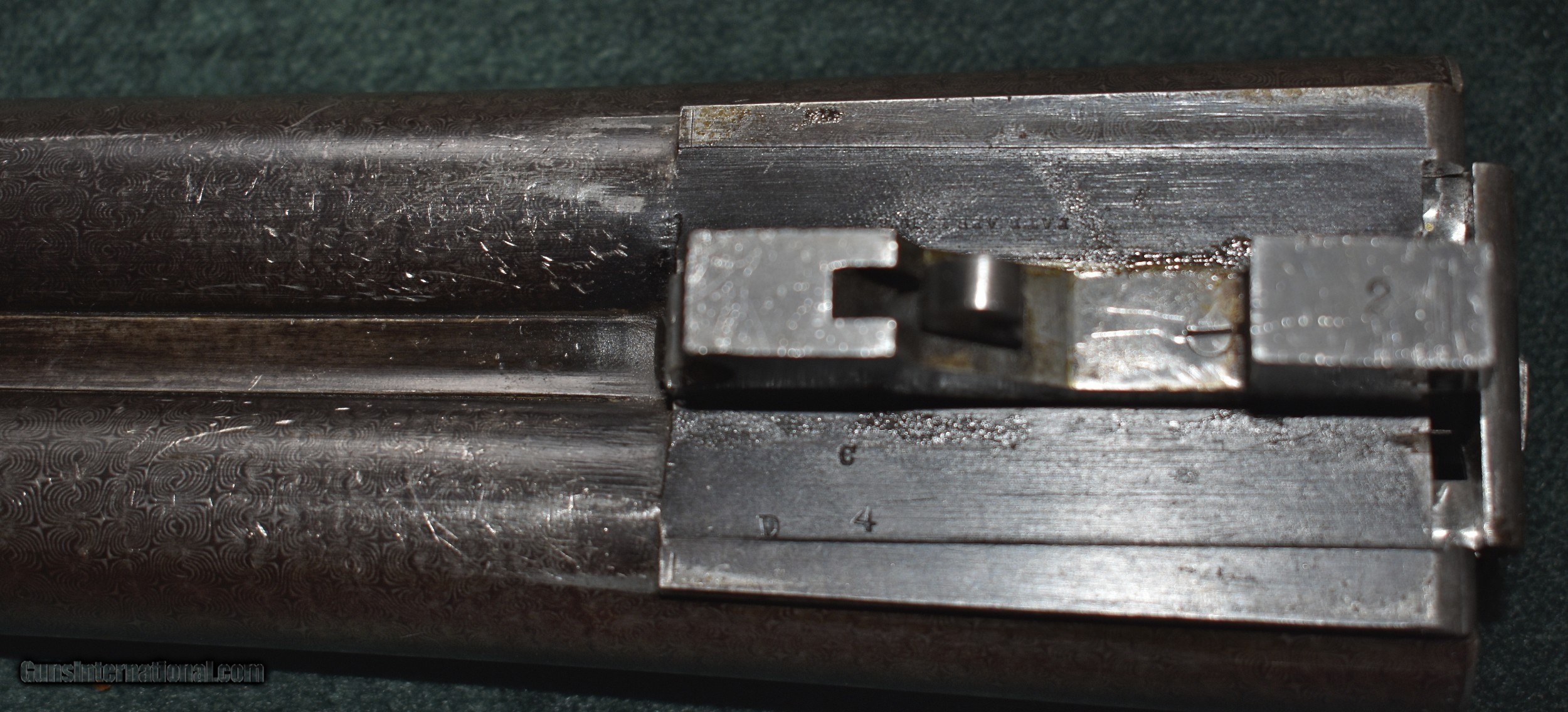 Description: An unusaul Parker GH grade 12 gauge with full length Briley 20 gauge insert tubes. Built in 1906 according to the factory letter, this gun has 30" damascus barrels choked improved cylinder (.005") and improved cylinder (.005"). In addition, it has been fitted with 20 gauge full length Briley titanium insert tubes with screw in chokes.The gun is in excellent condition retaining 25% of the original case colors and 90% of the original damascus pattern. The bores are excellent with no rust,or pitting. The barrels are on face and lock up tightly to the action with no play and have excellent wall thickness. The is one minor dent in the right barrel near the muzzle that does not show in the bore.(shown in photos).The stock is sound with no cracks or damage other than light handling marks. The stock retains the oiriginal dogs head buttplate with widows peak. Built on a #2 frame,the gun weighs 8-0 with the tubes in and 7-9 without the tubes. The stock dimensions are 143/8"x11/2"x21/2". I have shot the gun with 12 gauge 1oz loads.and 20 gauge 1 oz. loads and it performs well with either. The Briley tubes have and improved cylinder and a modified choke tube in the tube now. Others can be easily ordered from Briley if needed. A great Parker for all types of shooting. C&R eligible. SOLD Curio/Relic: Yes Shotgun Gauge: 12 Gauge, 20 Gauge Manufacturer: Parker Bros. Model: GH Serial Number: 124817 Barrel Length: 30 Chambers: 23/4 Ejectors: extractors Condition: excellent Metal Condition: excellent Wood Condition: excellent Bore Condition: excellent Barrel Type: damascus steel Action: double barrel Triggers: double Stock Dimensions: 143/8"x11/2"x21/2 Butt Pad: Factory Dog's Head Buttplate Manufacture Date: 1906 Extras: factory letter Minimum Wall Thickness Left: .035 Minimum Wall Thickness Right: .033 |